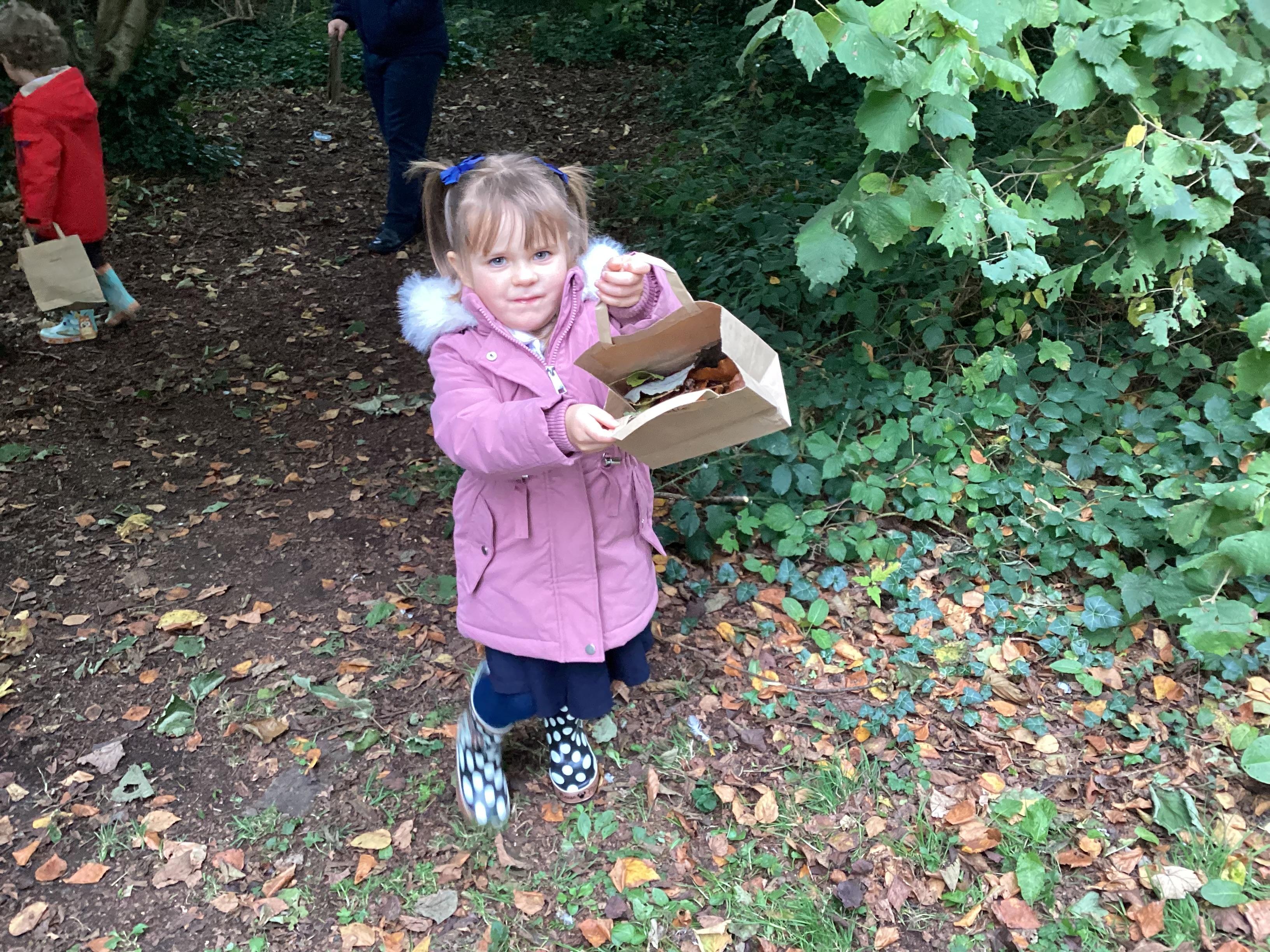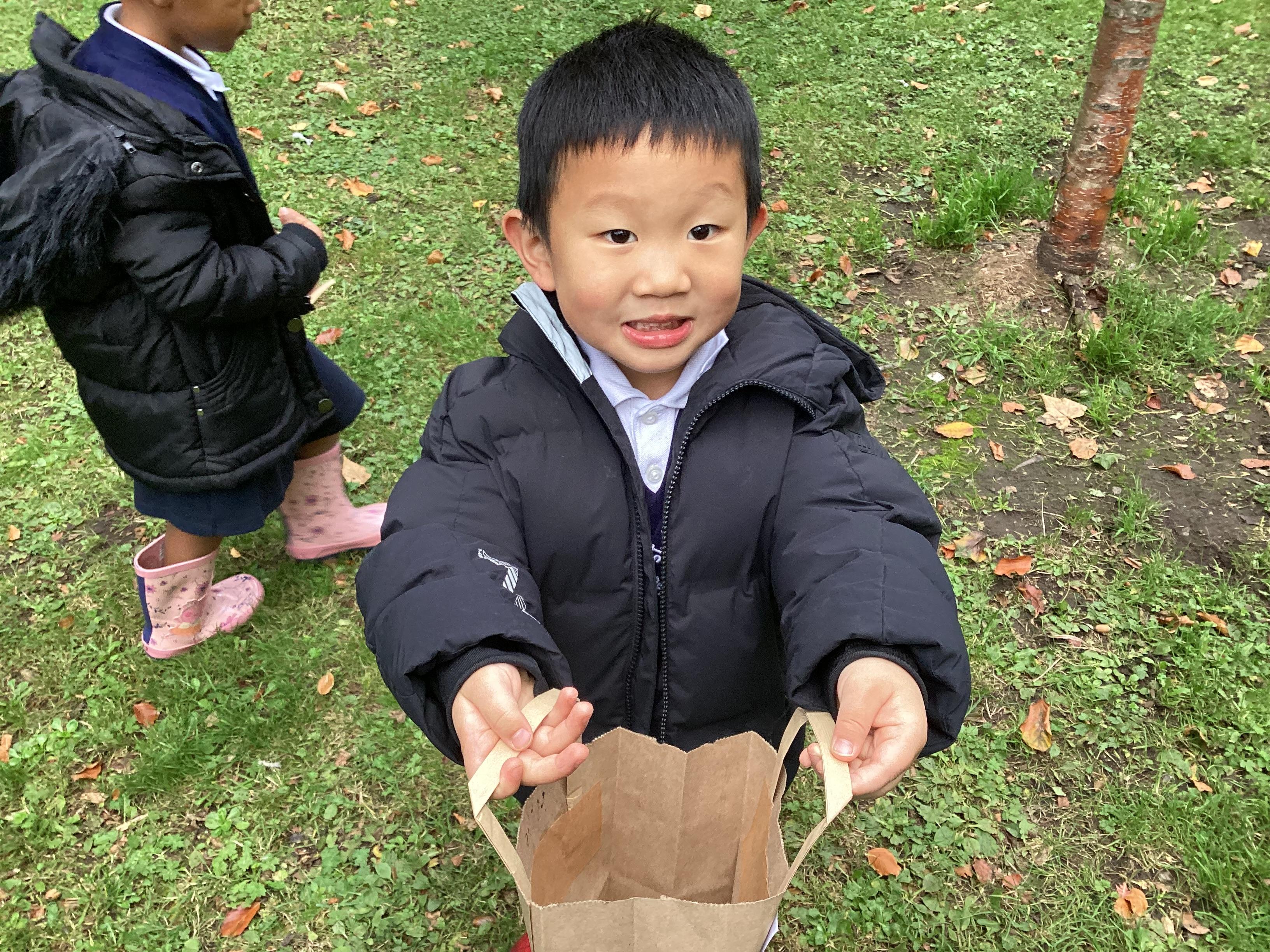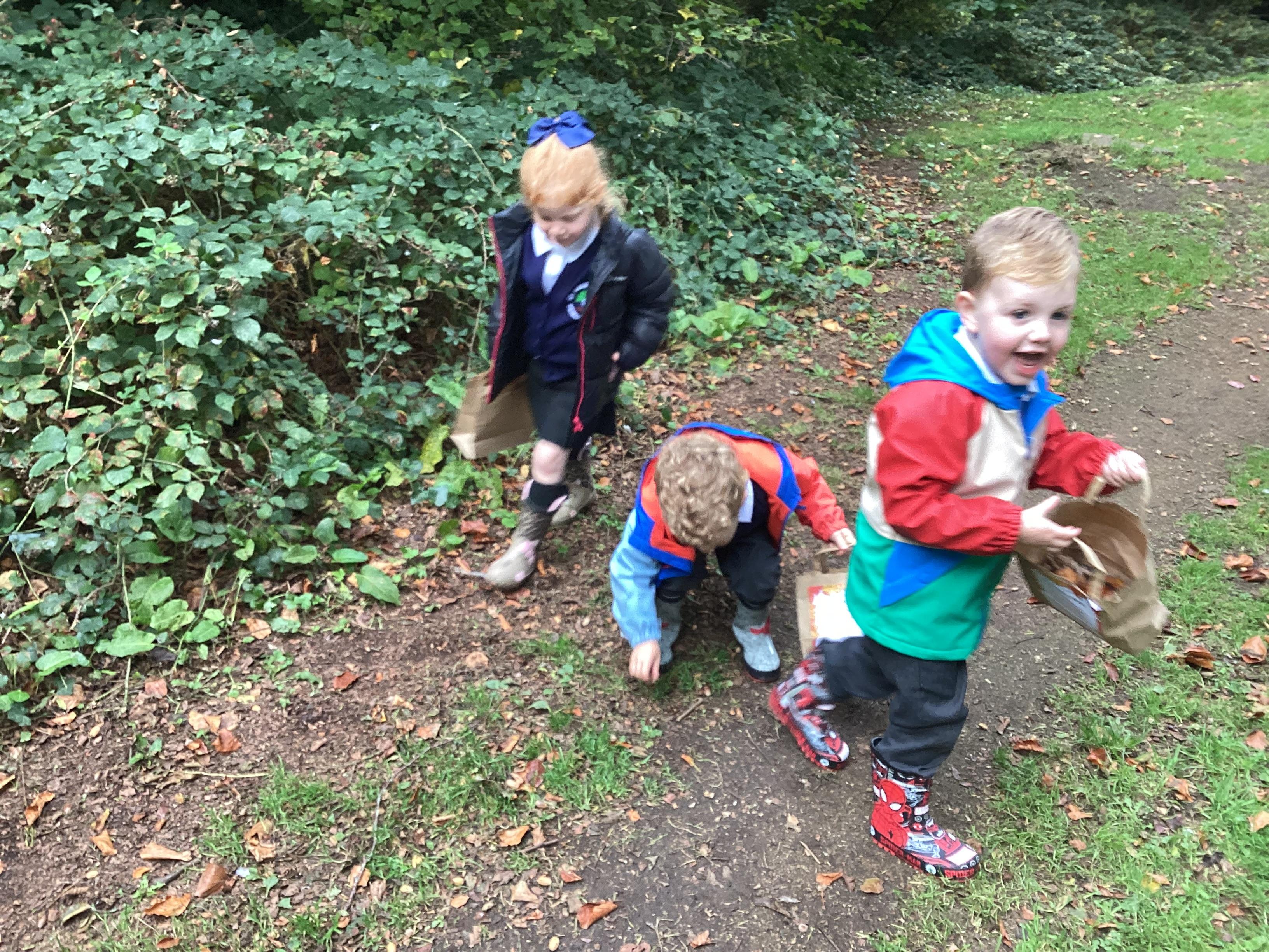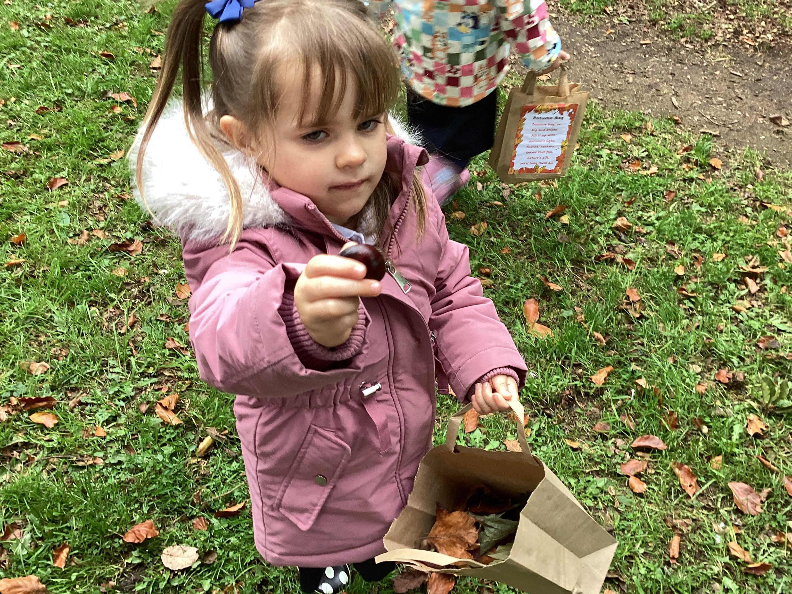 On Thursday 16th October, we went on an adventure outside of school!  We wrapped up warm and put on our wellington boots to go on an Autumn walk to look for signs of Autumn. We all had our own collecting bags and searched for conkers, pine cones, acorns, leaves and sticks to put inside our bags. We also had a checklist and ticked off any Autumn items we found. We were all very excited to find lots of conkers and some huge pine cones!