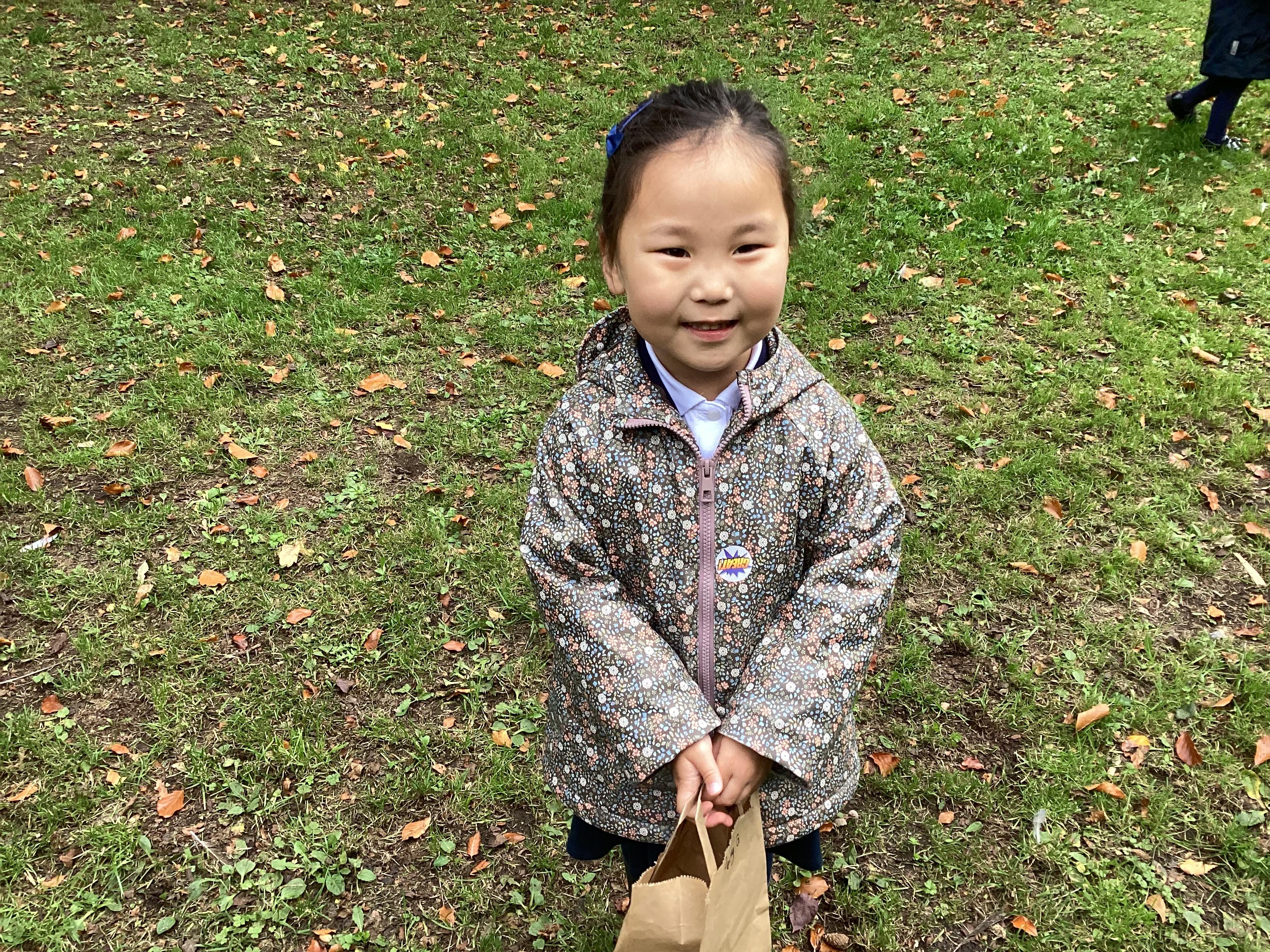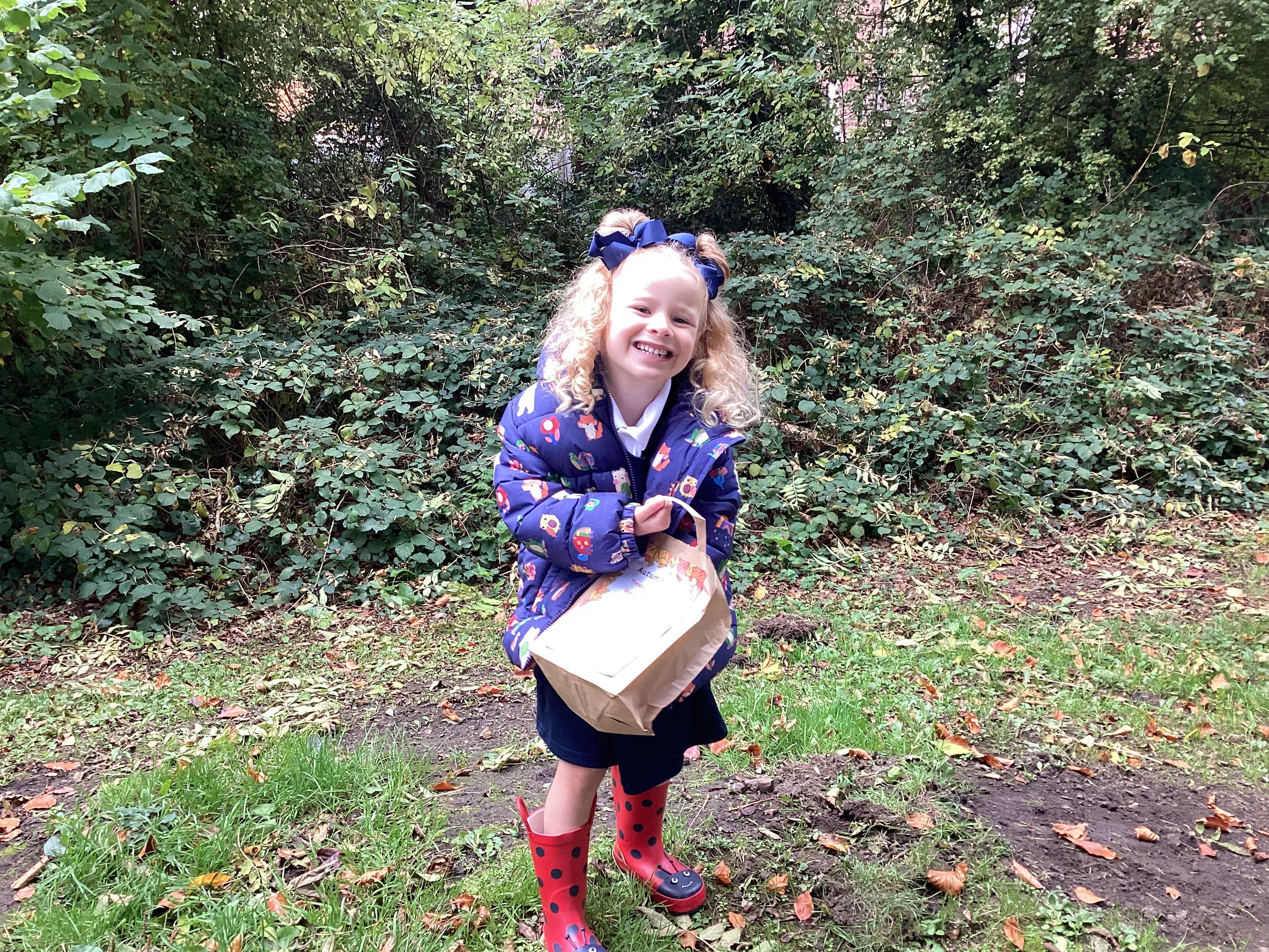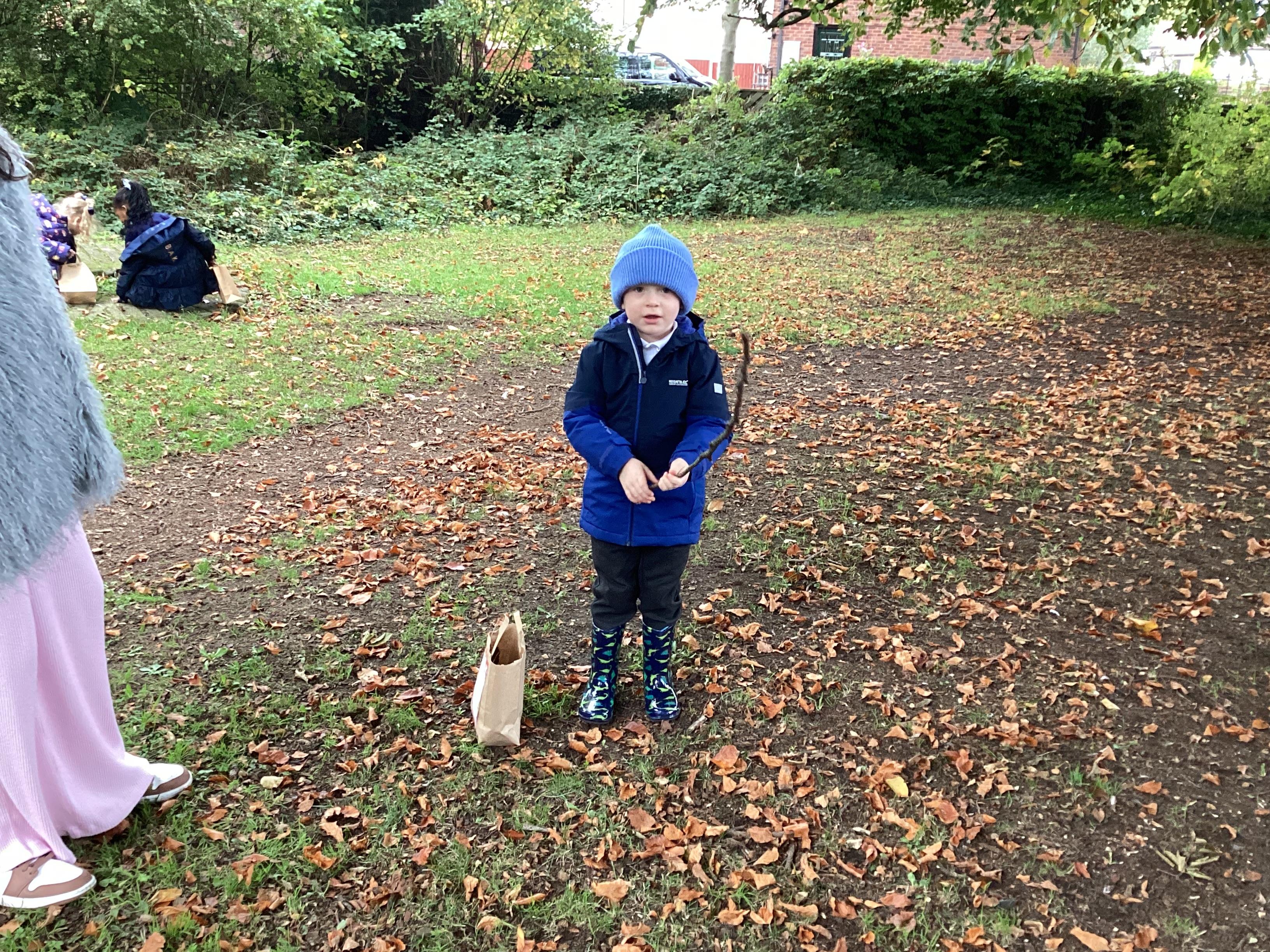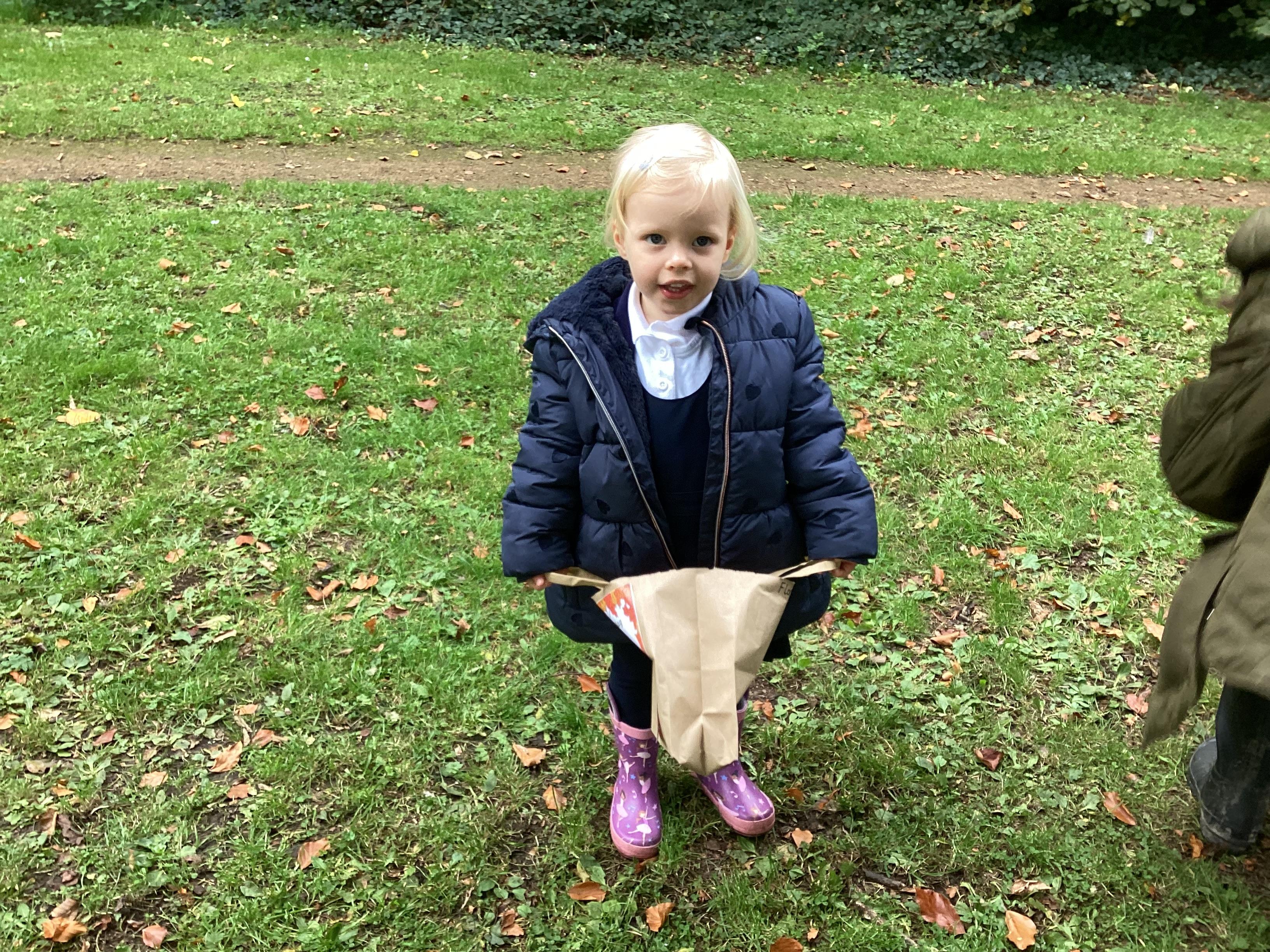 On Thursday 16th October, we went on an adventure outside of school!  We wrapped up warm and put on our wellington boots to go on an Autumn walk to look for signs of Autumn. We all had our own collecting bags and searched for conkers, pine cones, acorns, leaves and sticks to put inside our bags. We also had a checklist and ticked off any Autumn items we found. We were all very excited to find lots of conkers and some huge pine cones!