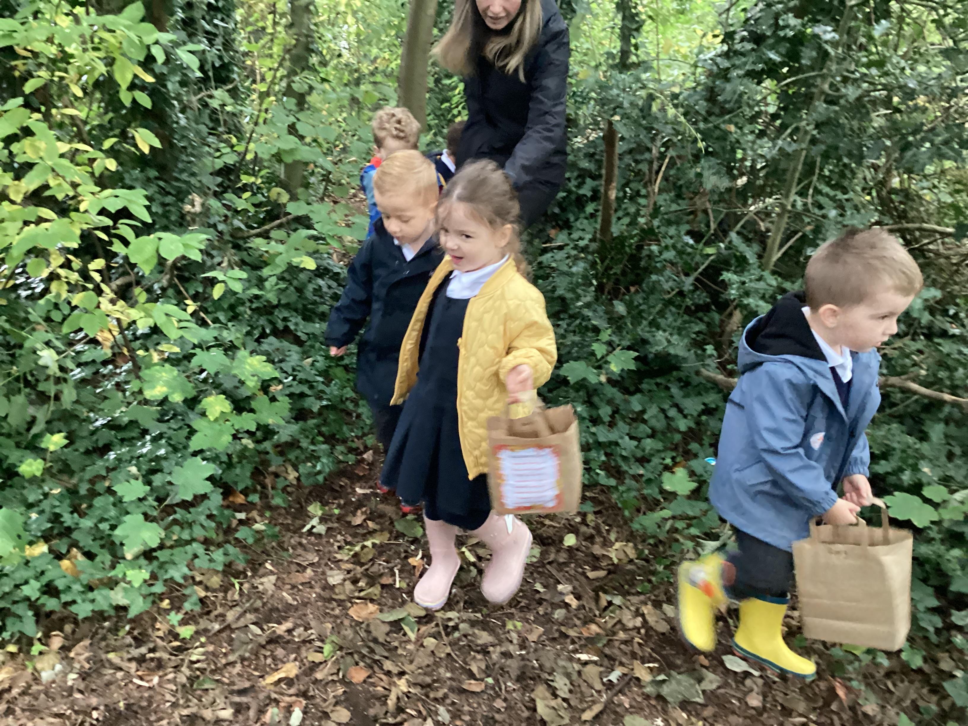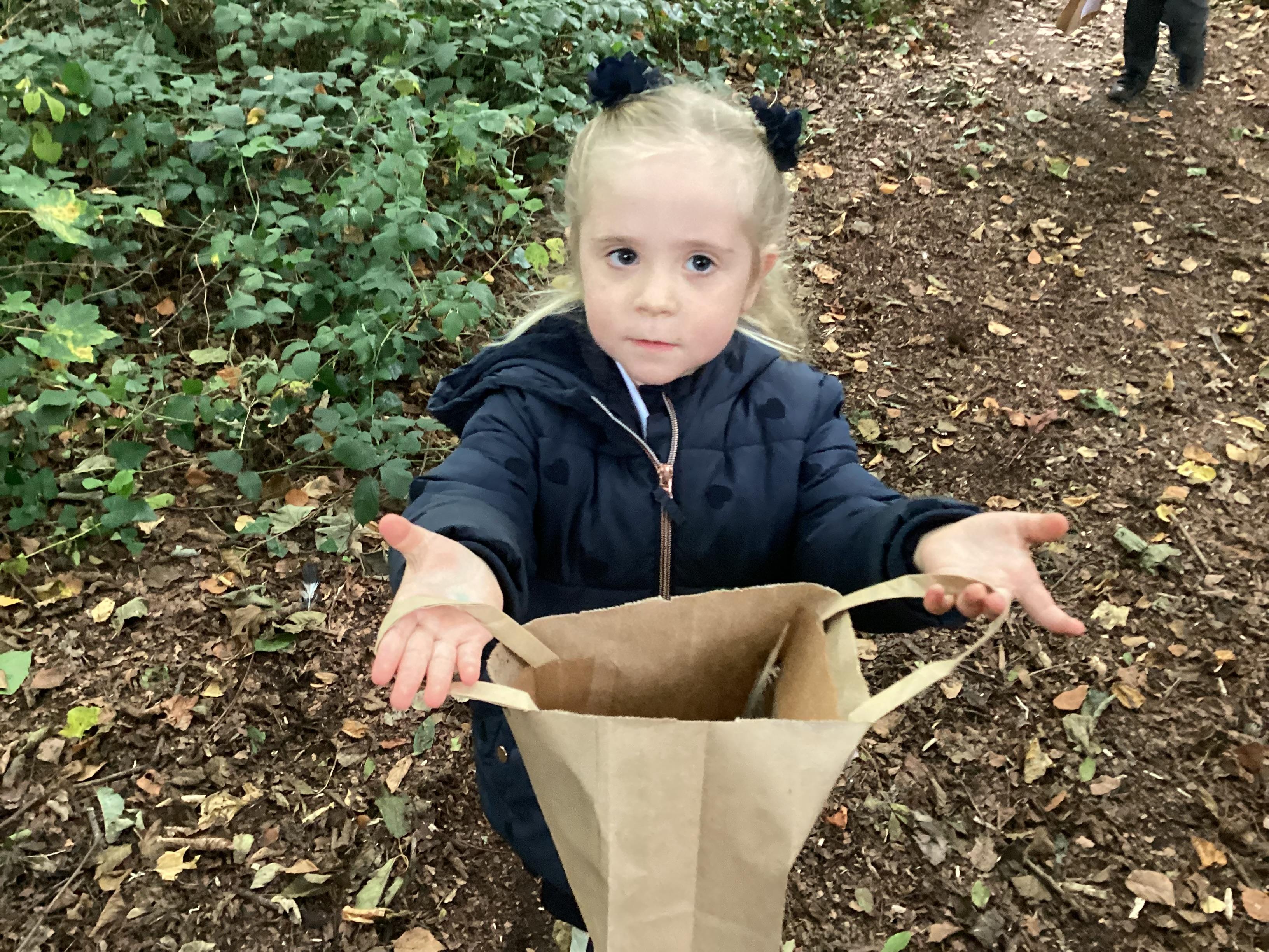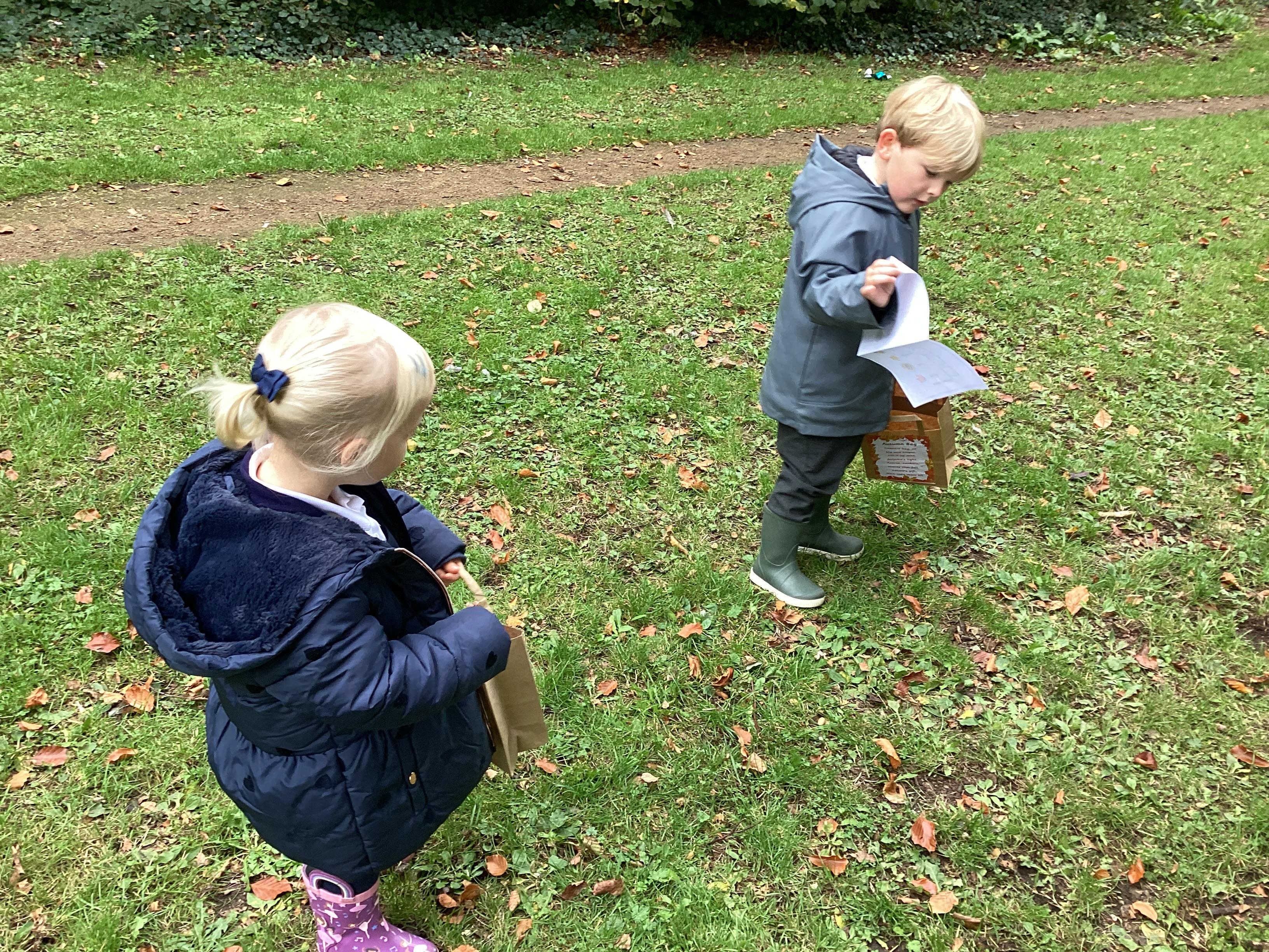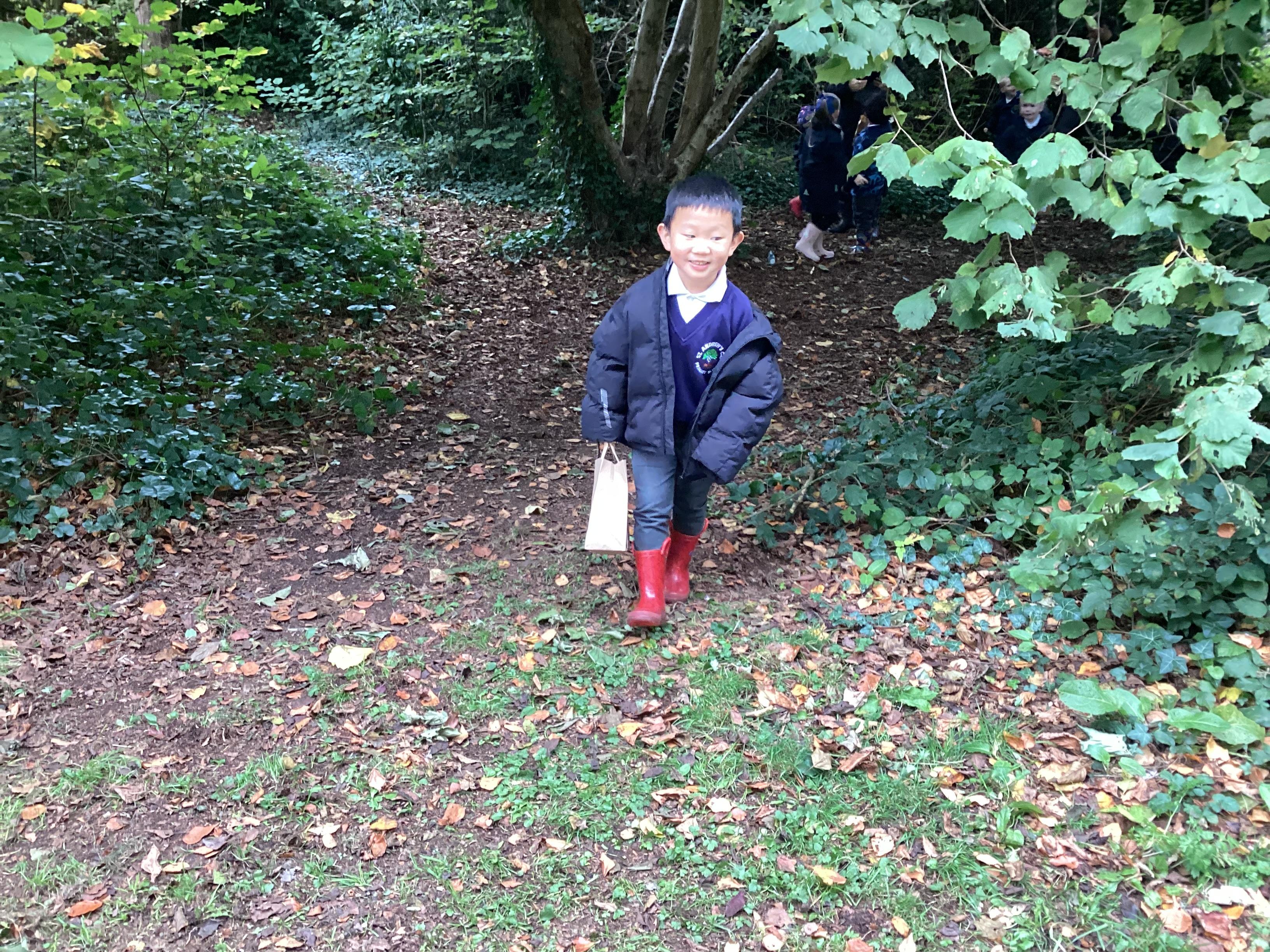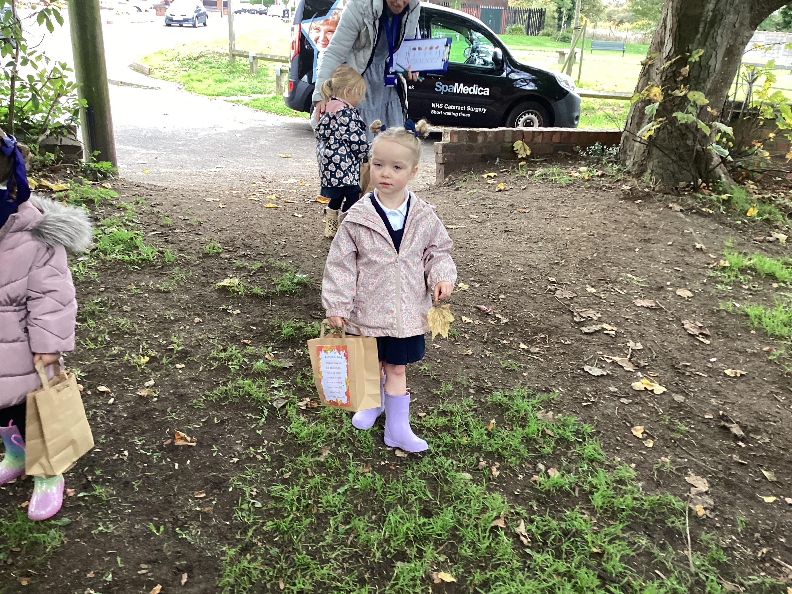 On Thursday 16th October, we went on an adventure outside of school!  We wrapped up warm and put on our wellington boots to go on an Autumn walk to look for signs of Autumn. We all had our own collecting bags and searched for conkers, pine cones, acorns, leaves and sticks to put inside our bags. We also had a checklist and ticked off any Autumn items we found. We were all very excited to find lots of conkers and some huge pine cones!