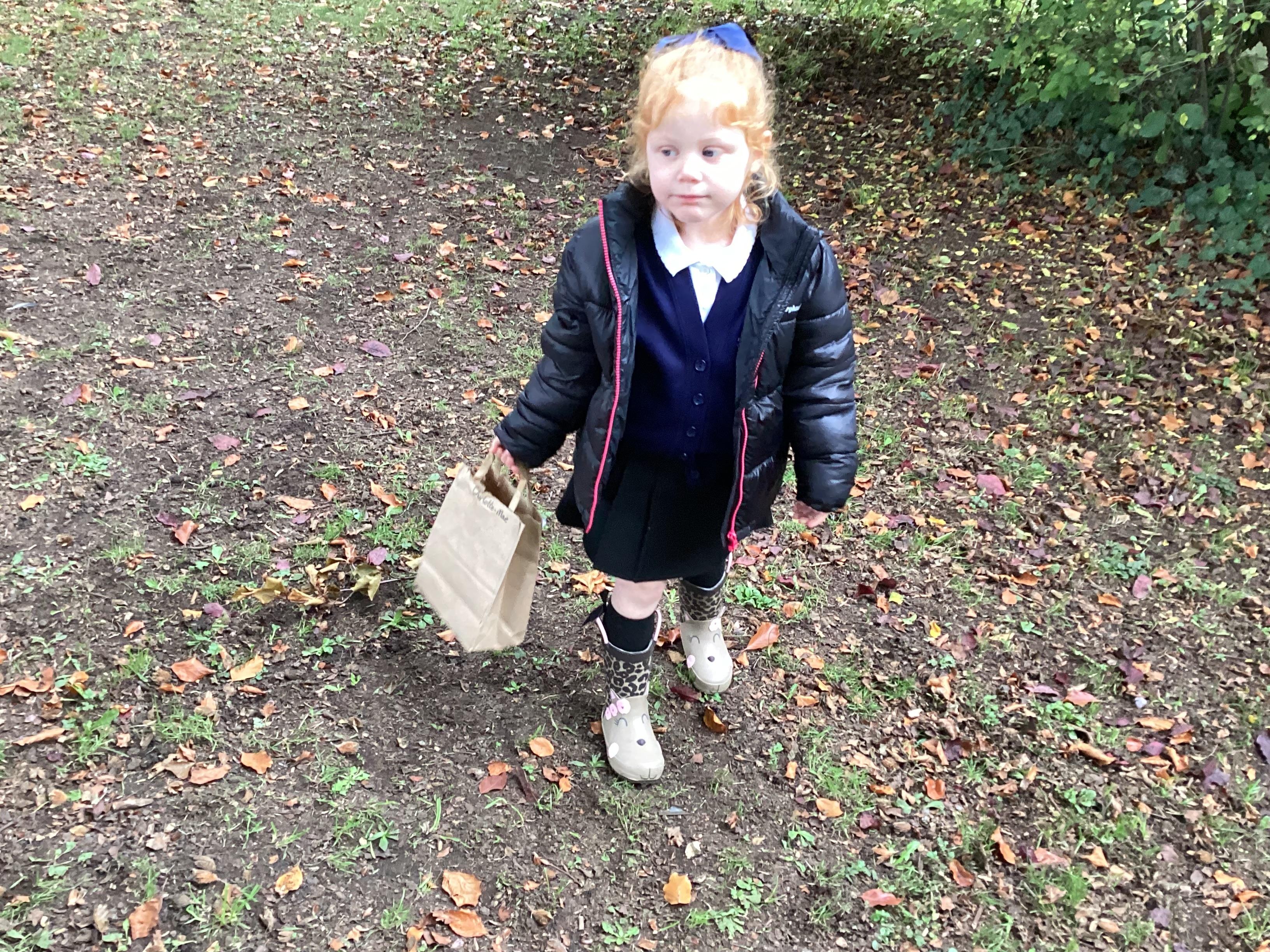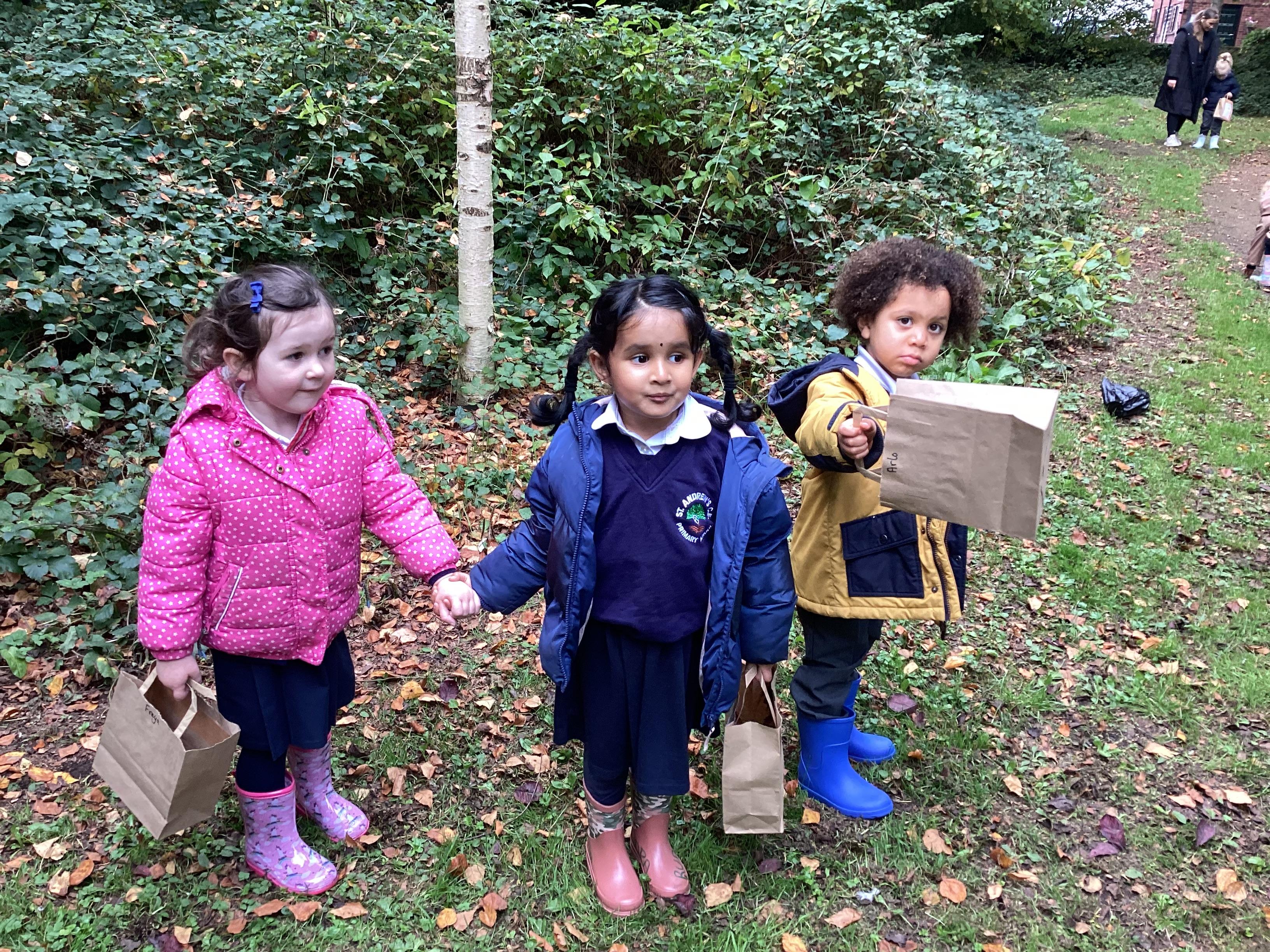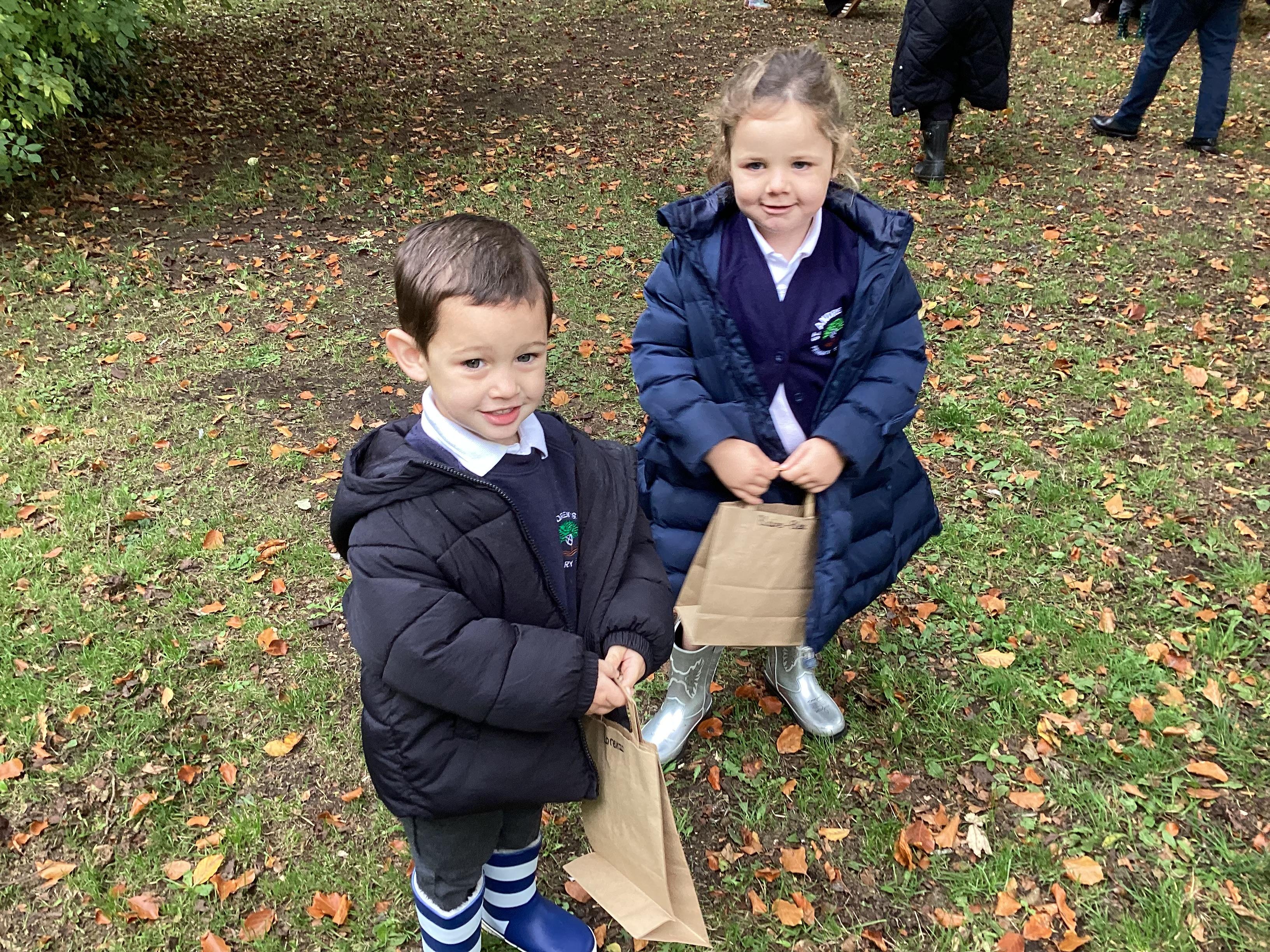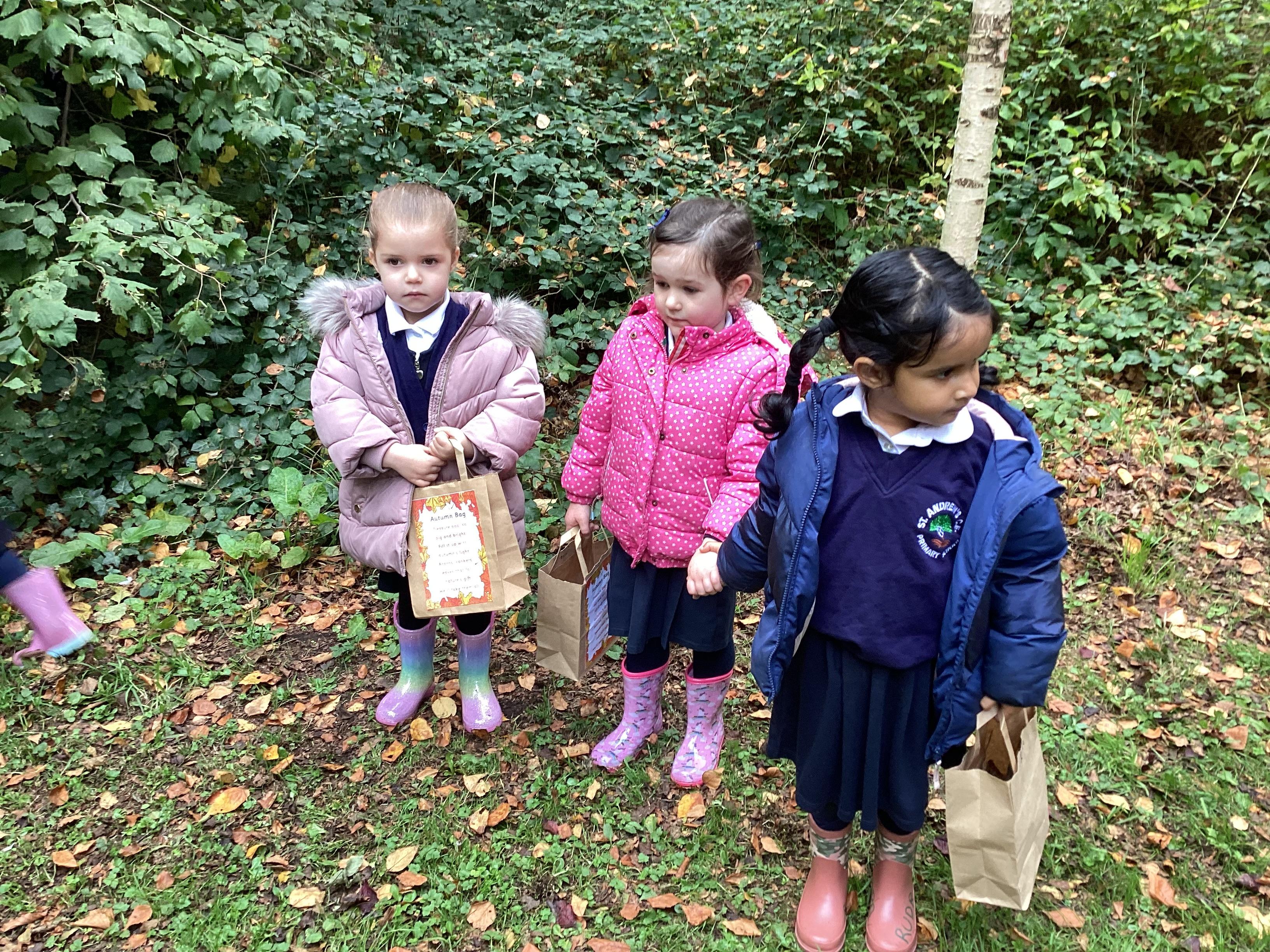 On Thursday 16th October, we went on an adventure outside of school!  We wrapped up warm and put on our wellington boots to go on an Autumn walk to look for signs of Autumn. We all had our own collecting bags and searched for conkers, pine cones, acorns, leaves and sticks to put inside our bags. We also had a checklist and ticked off any Autumn items we found. We were all very excited to find lots of conkers and some huge pine cones!