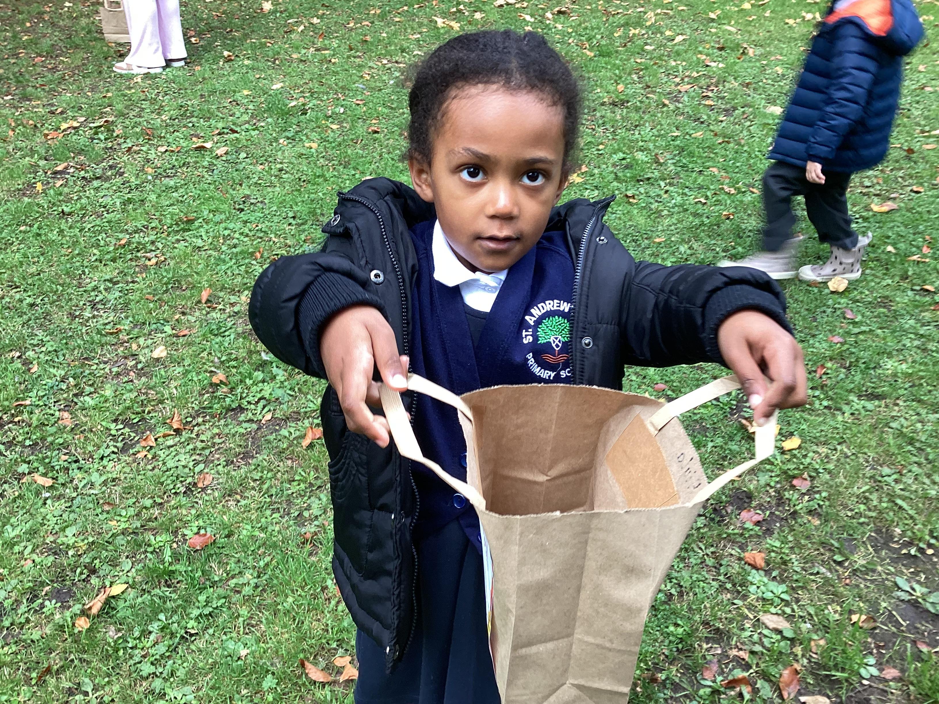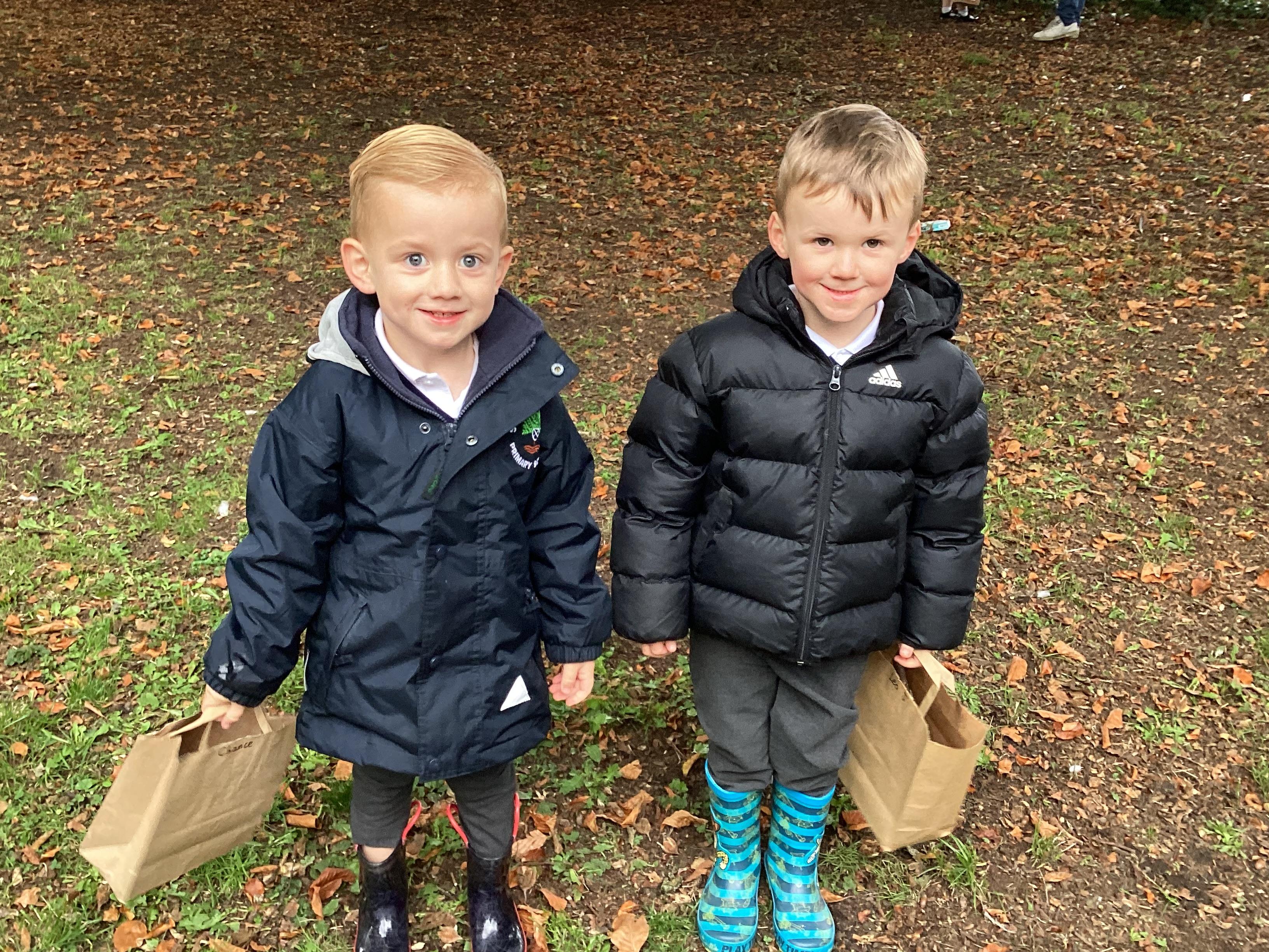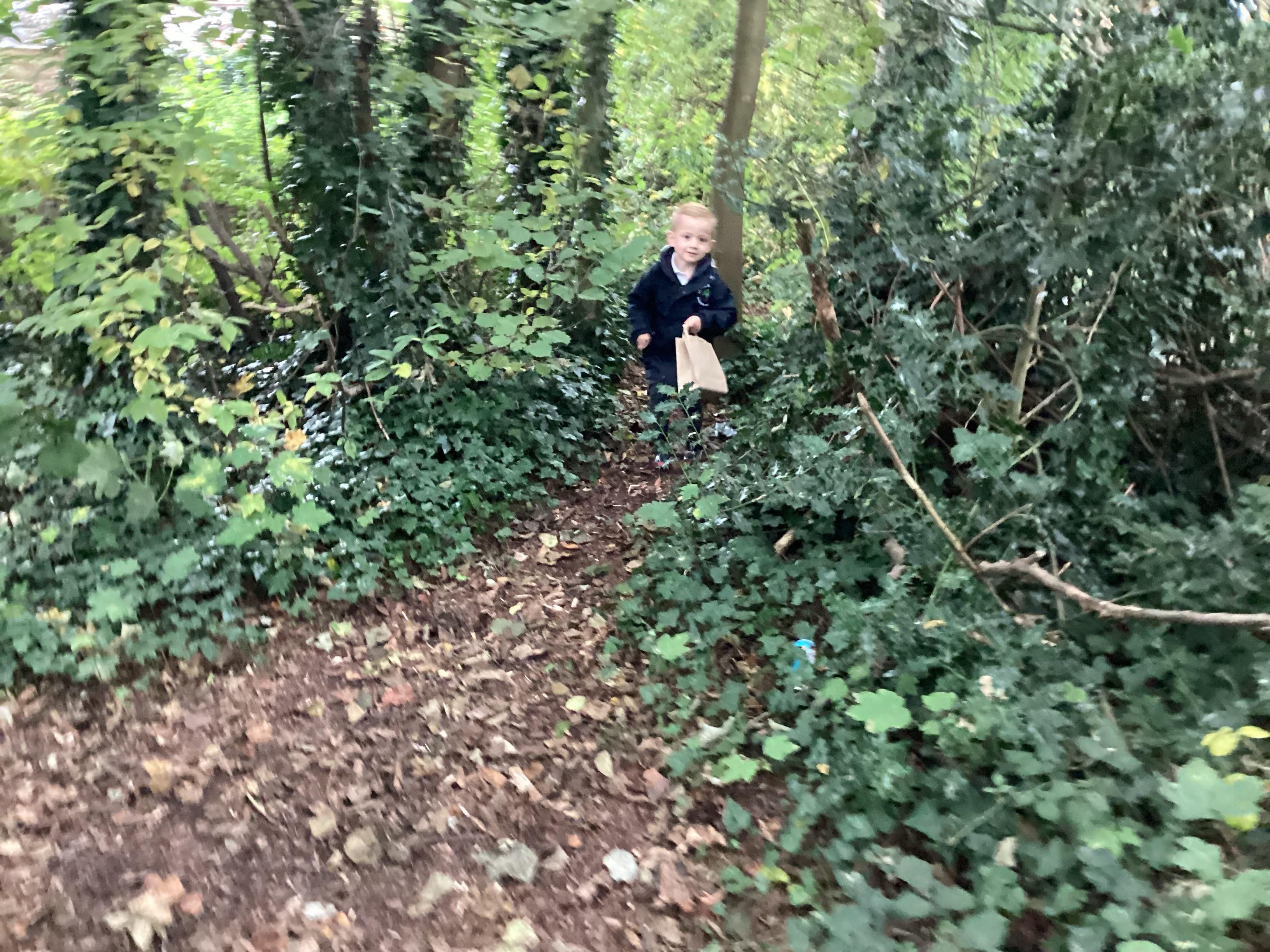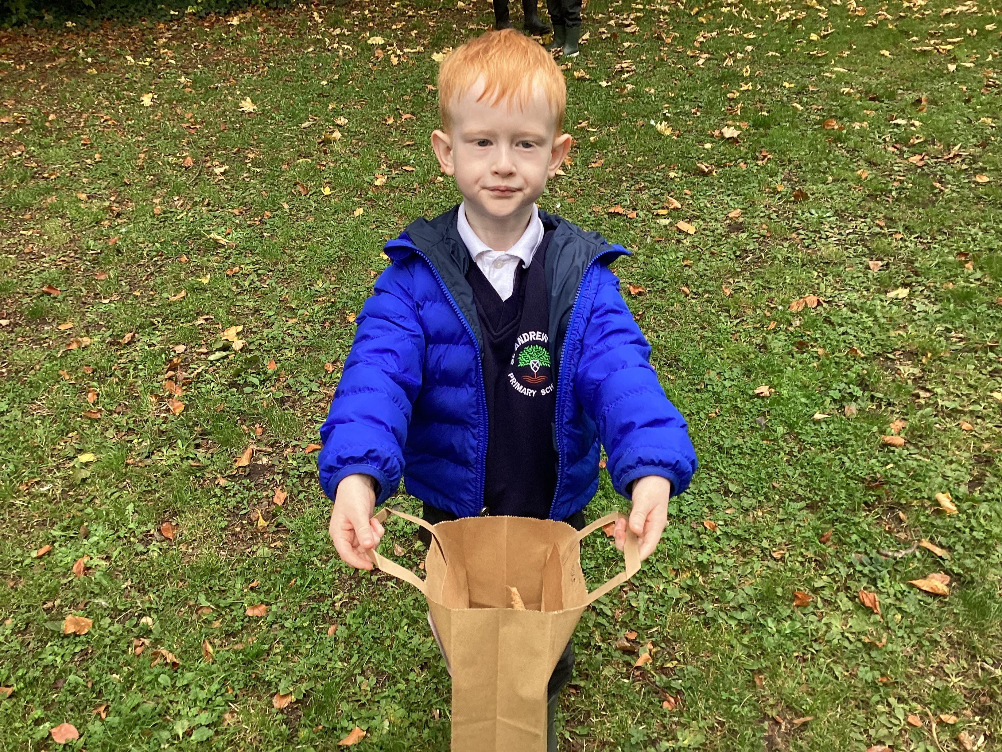 On Thursday 16th October, we went on an adventure outside of school!  We wrapped up warm and put on our wellington boots to go on an Autumn walk to look for signs of Autumn. We all had our own collecting bags and searched for conkers, pine cones, acorns, leaves and sticks to put inside our bags. We also had a checklist and ticked off any Autumn items we found. We were all very excited to find lots of conkers and some huge pine cones!