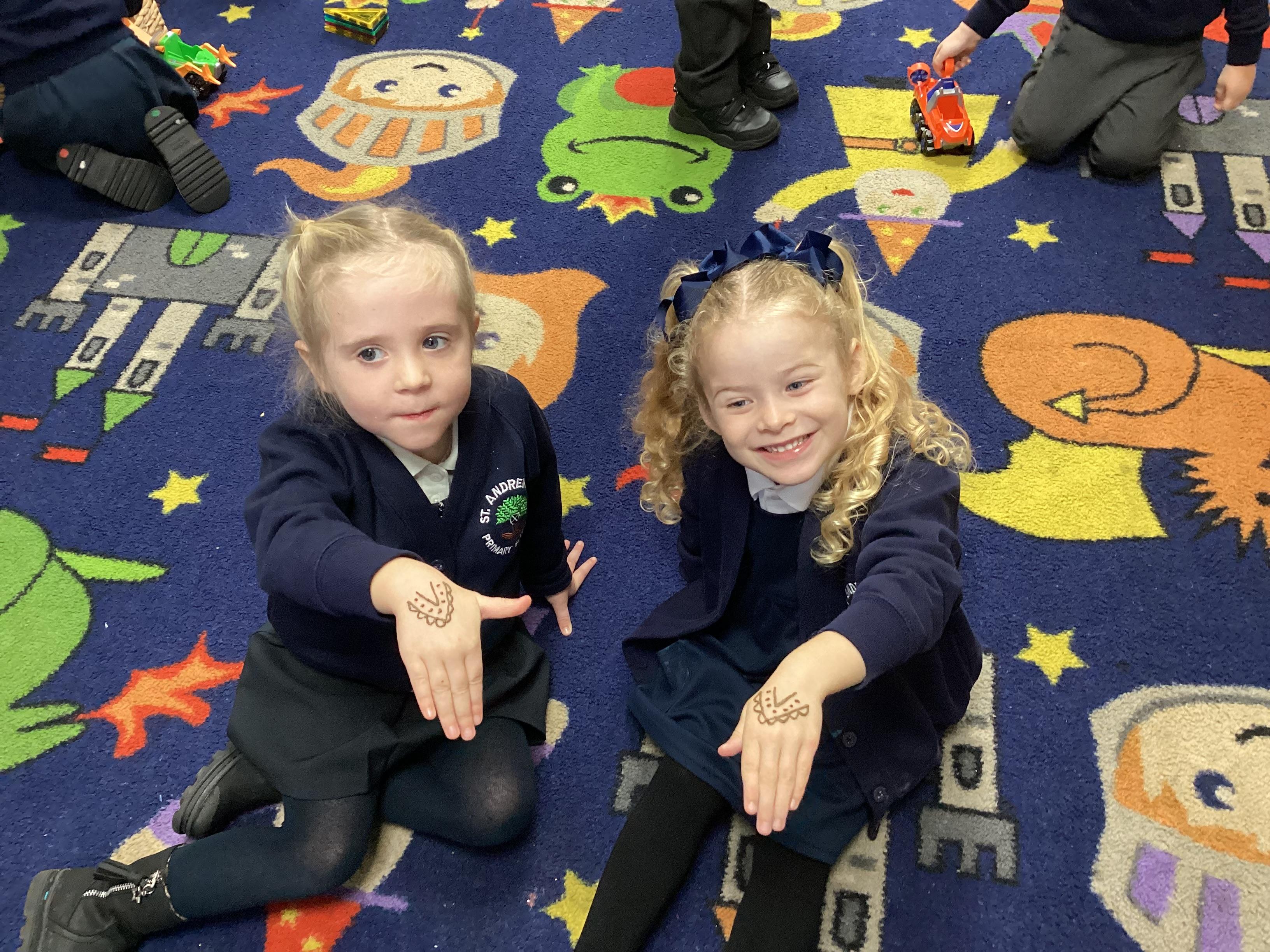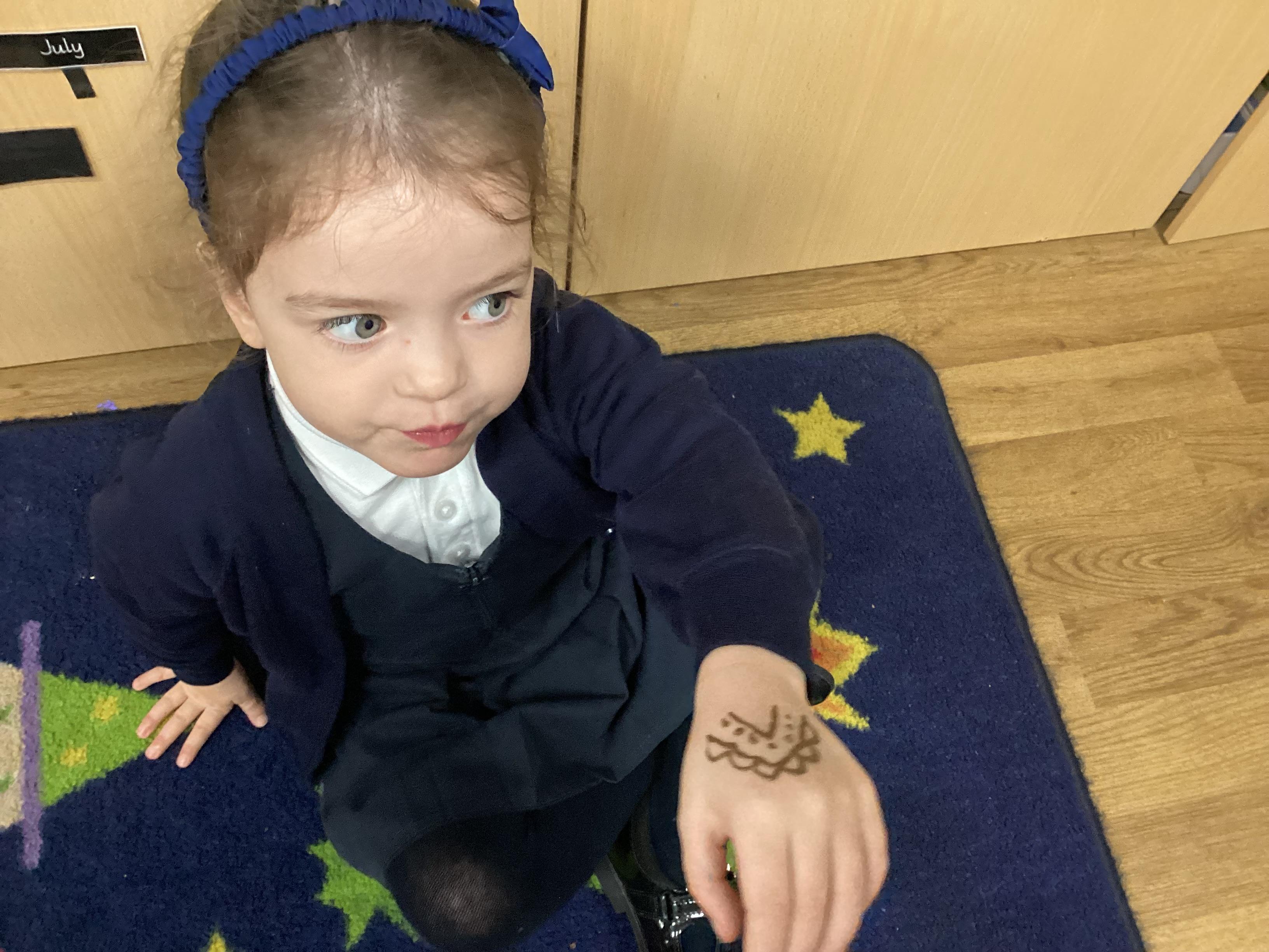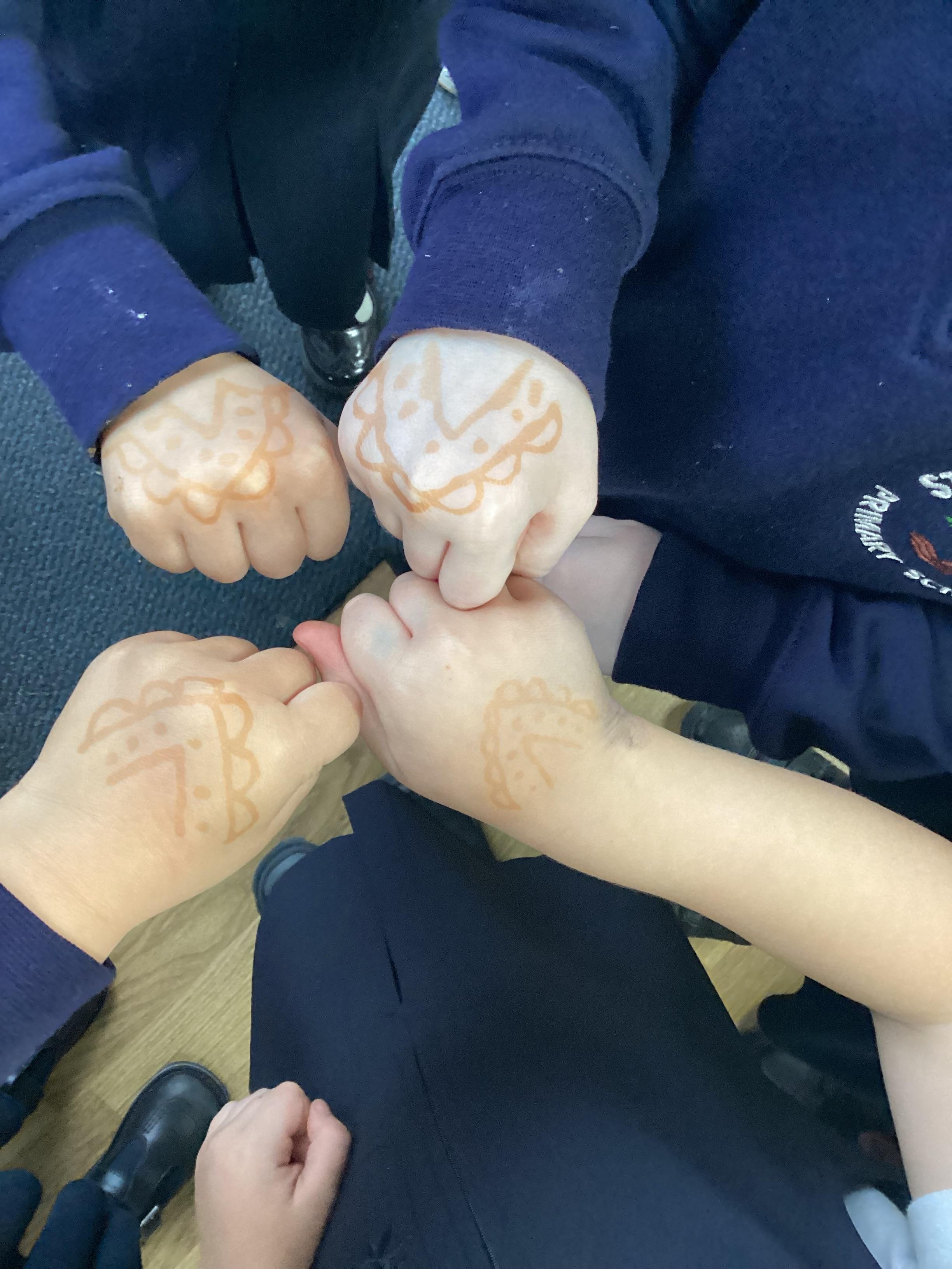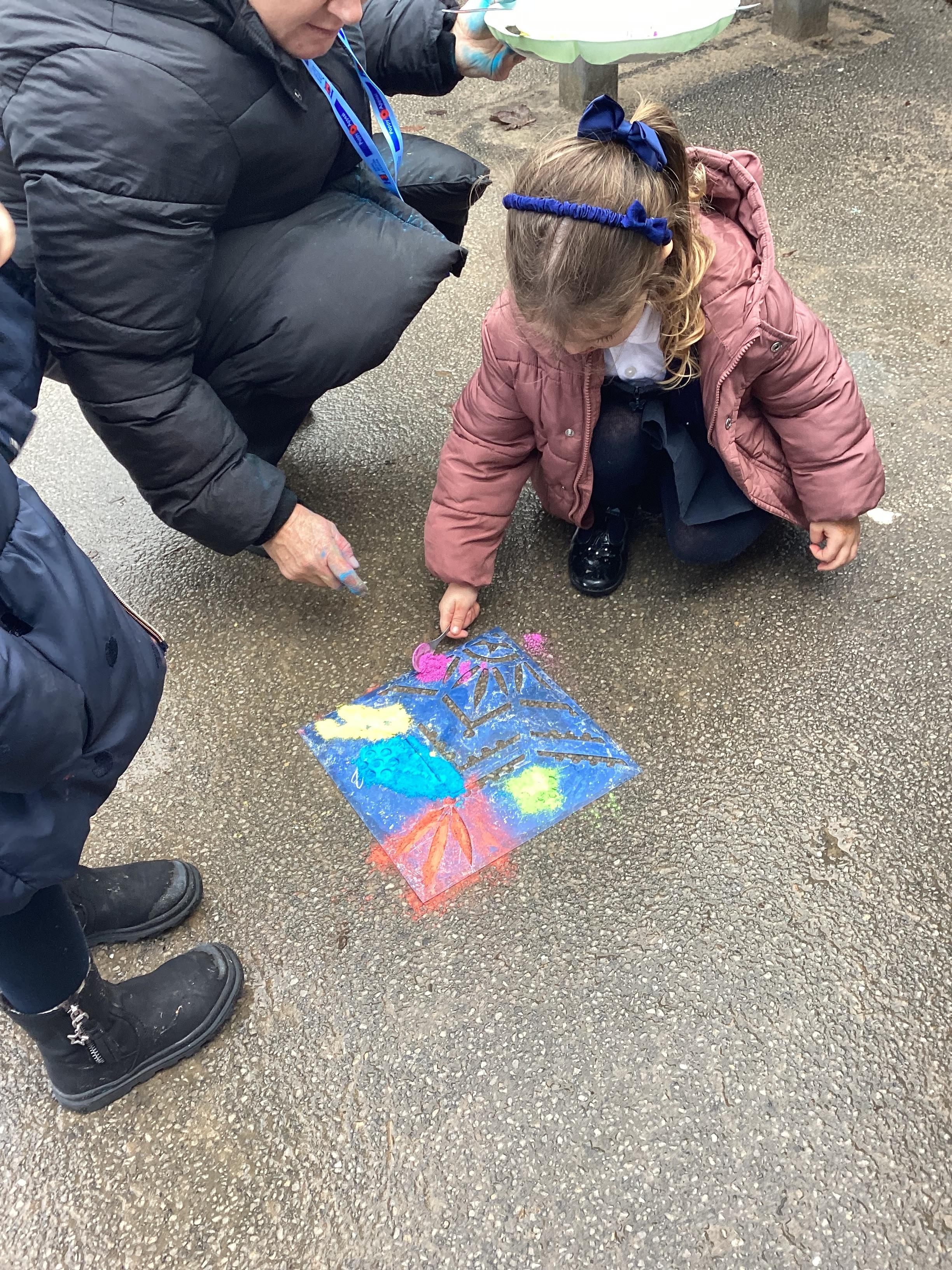 We have been learning all about Diwali, which is the festival of light. We have drawn and painted rangoli patterns and made our own patterns outside using powder paints. We had mendhi henna tattoos painted on our hands, we've dressed up in traditional Indian clothes and have made our very own clay diva lamps to take home. We even took part in an Indian dance workshop which was great fun.