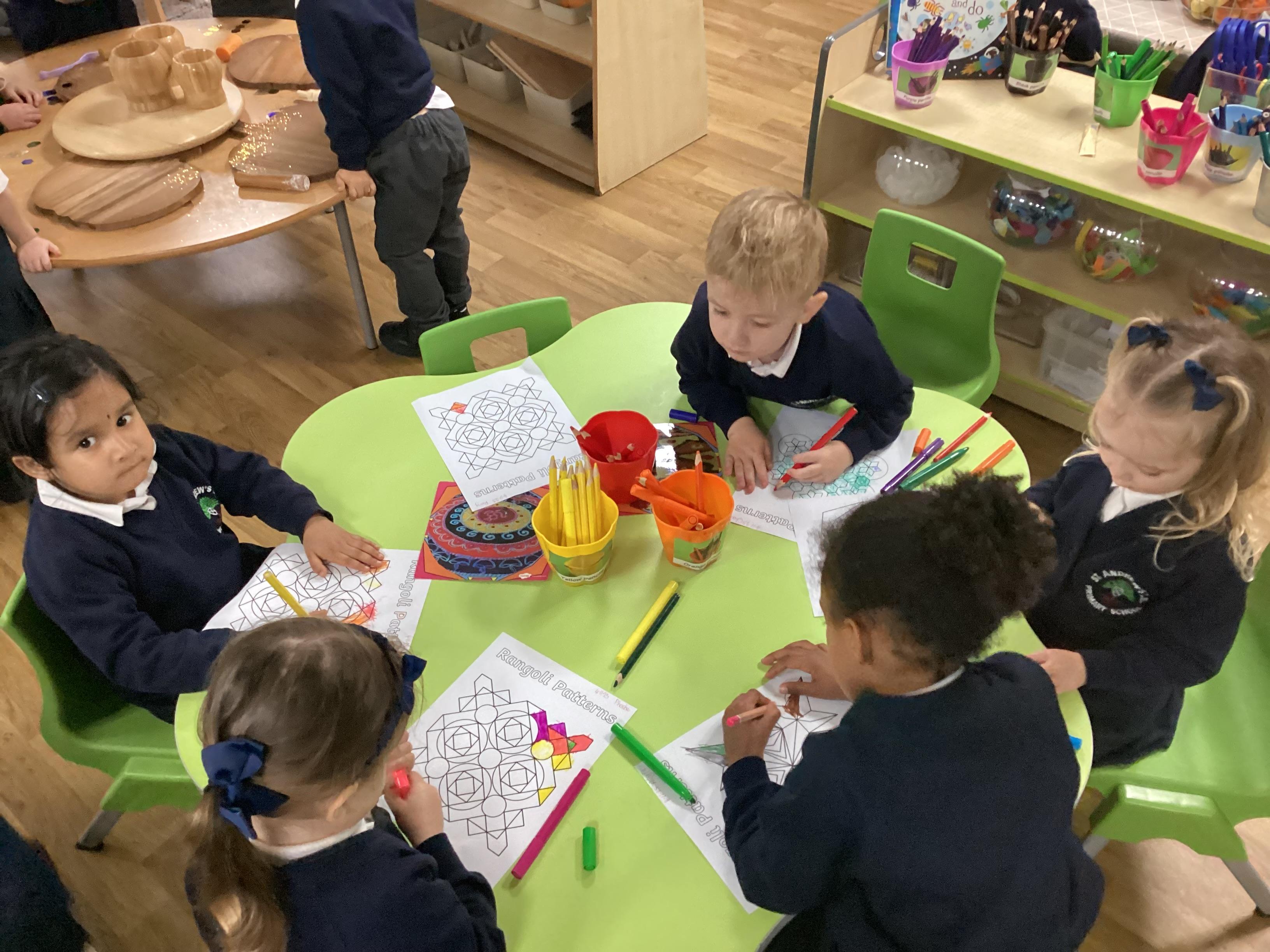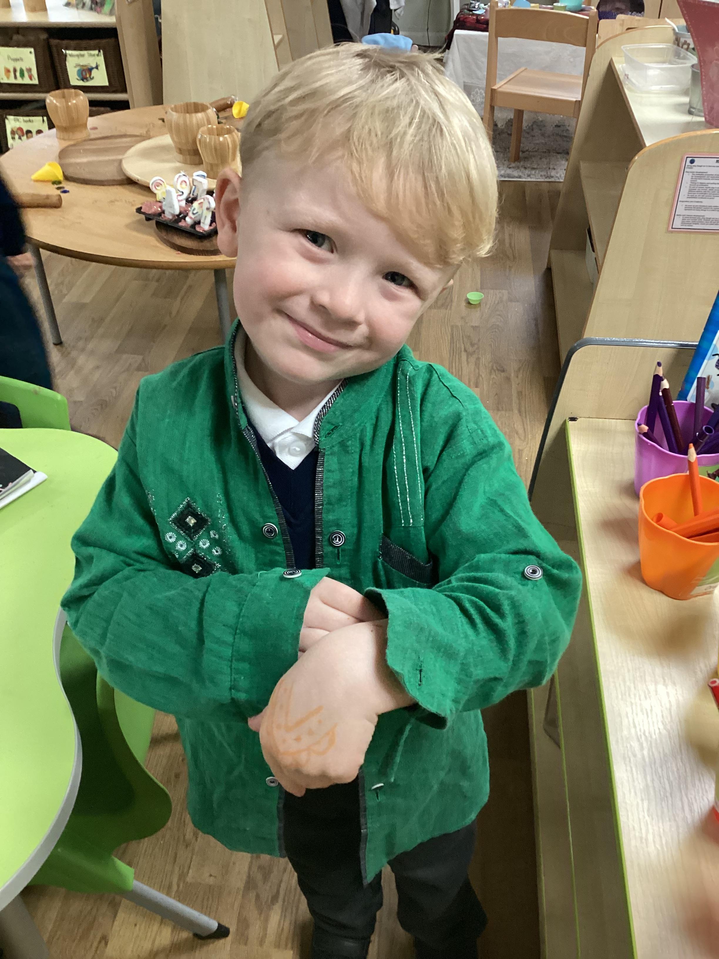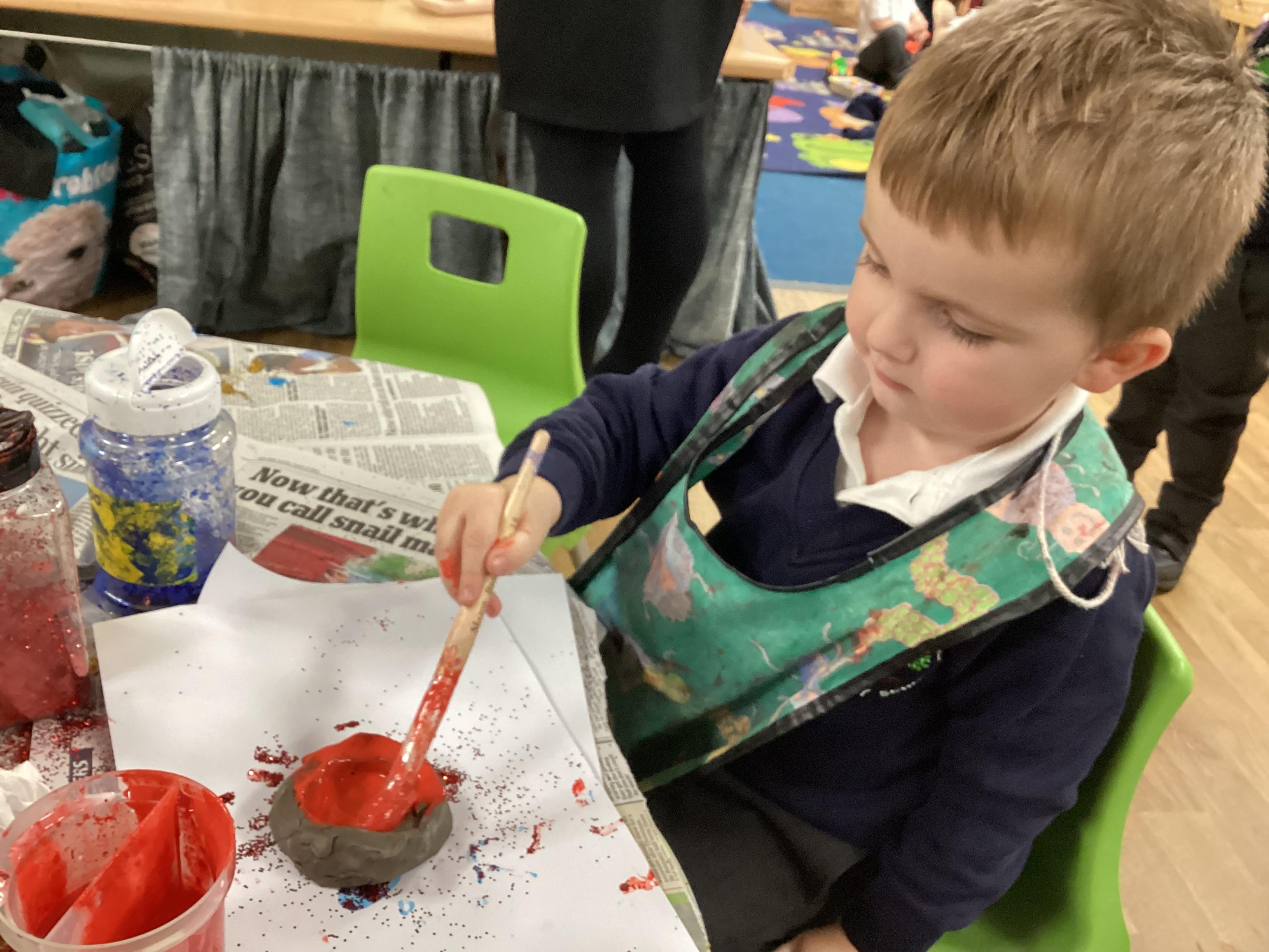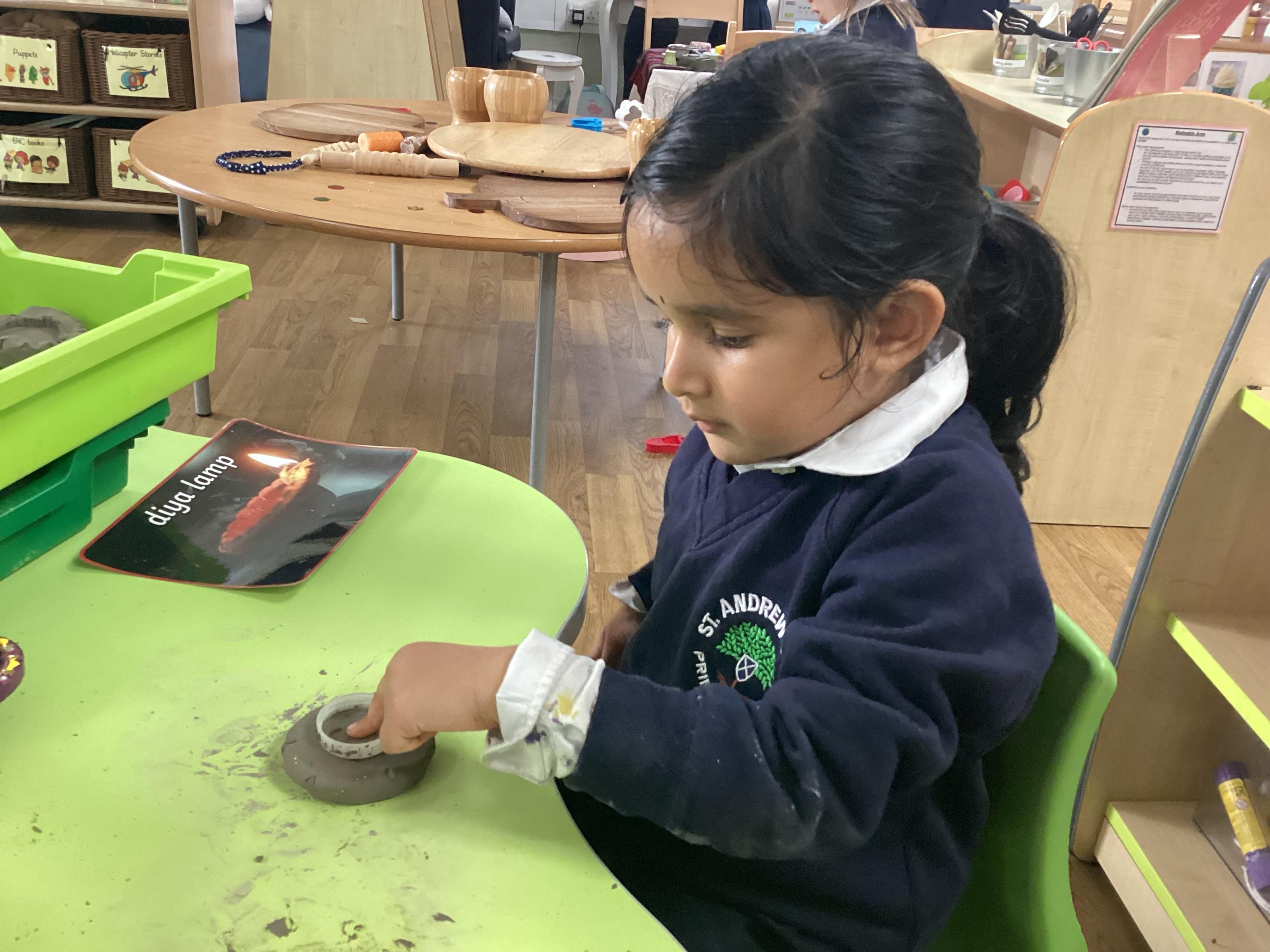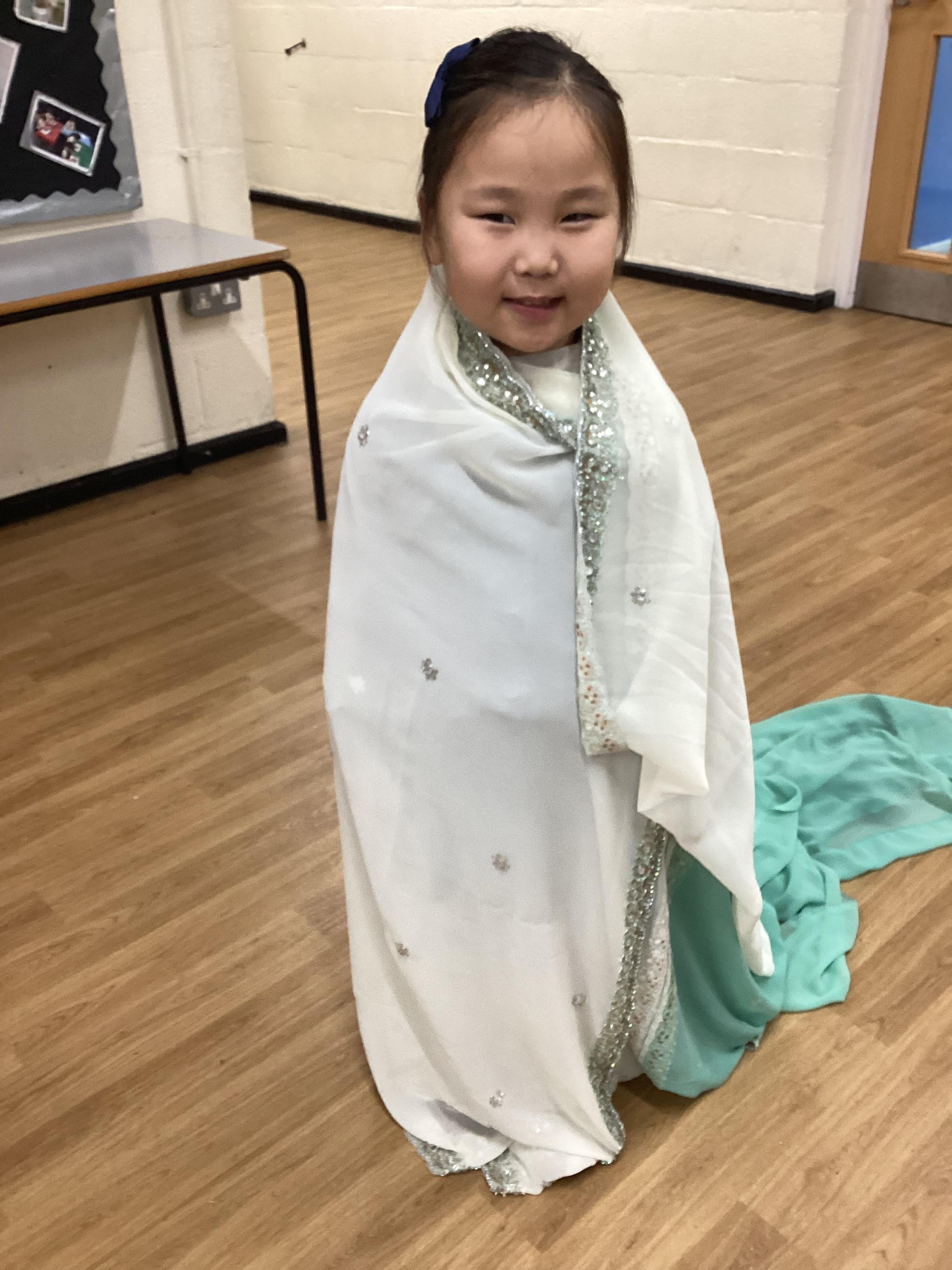 We have been learning all about Diwali, which is the festival of light. We have drawn and painted rangoli patterns and made our own patterns outside using powder paints. We had mendhi henna tattoos painted on our hands, we've dressed up in traditional Indian clothes and have made our very own clay diva lamps to take home. We even took part in an Indian dance workshop which was great fun.