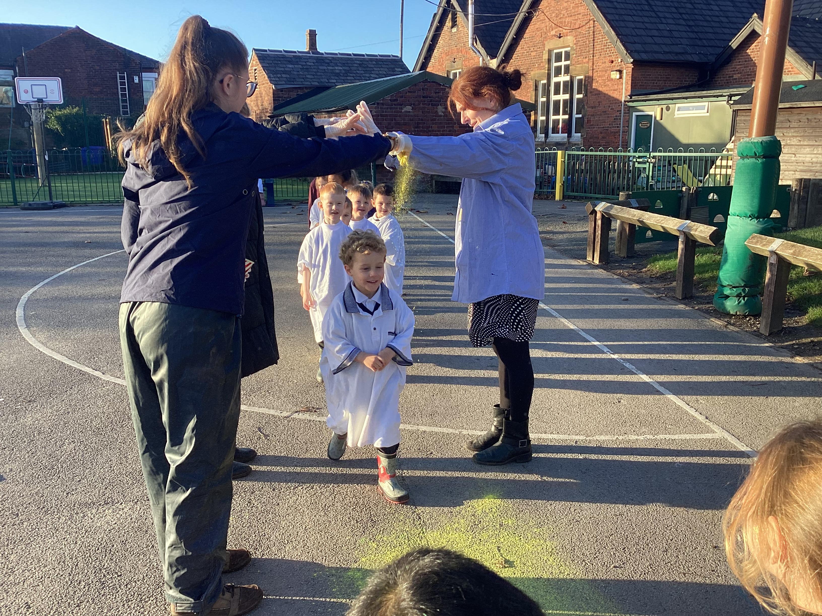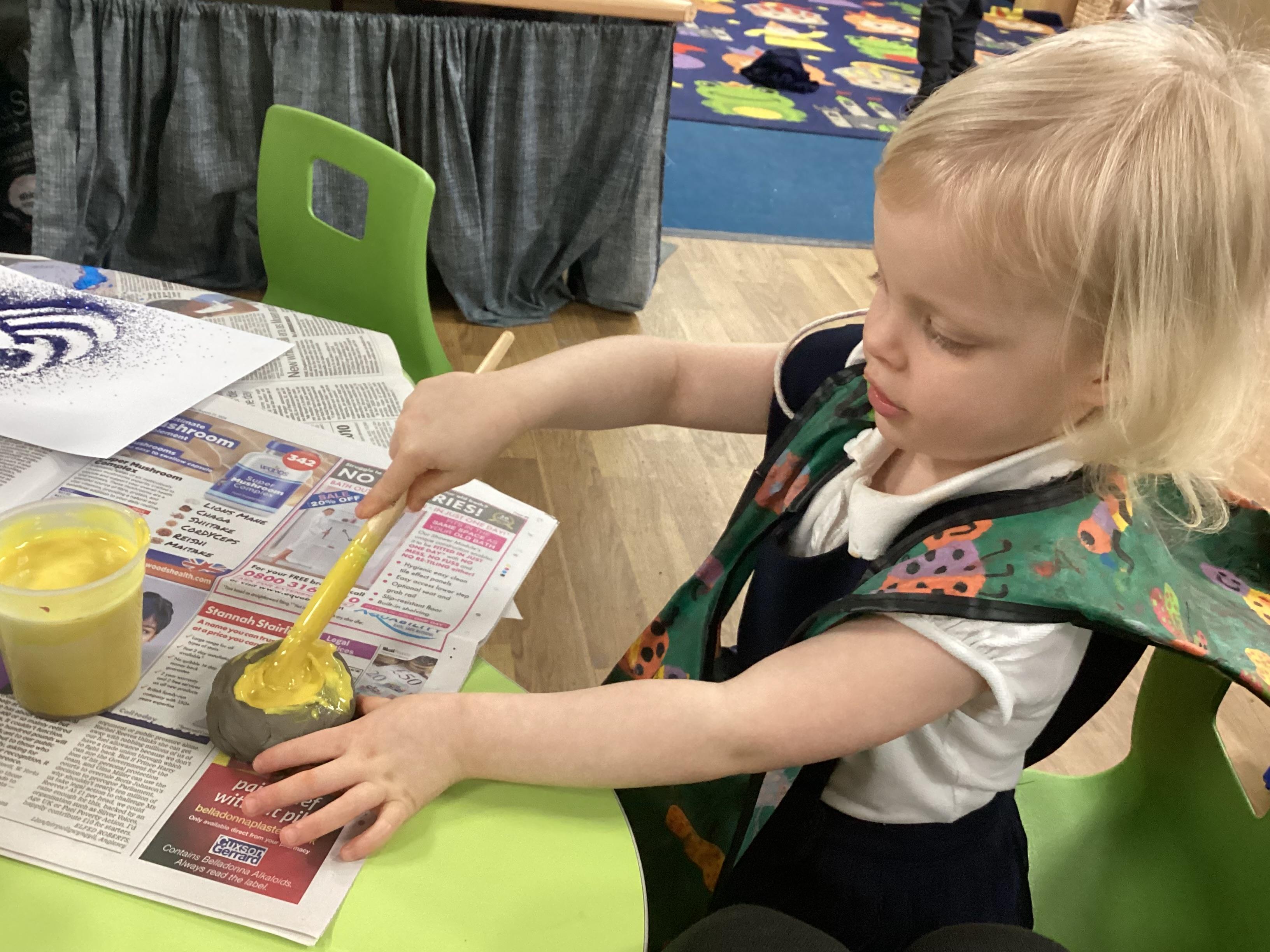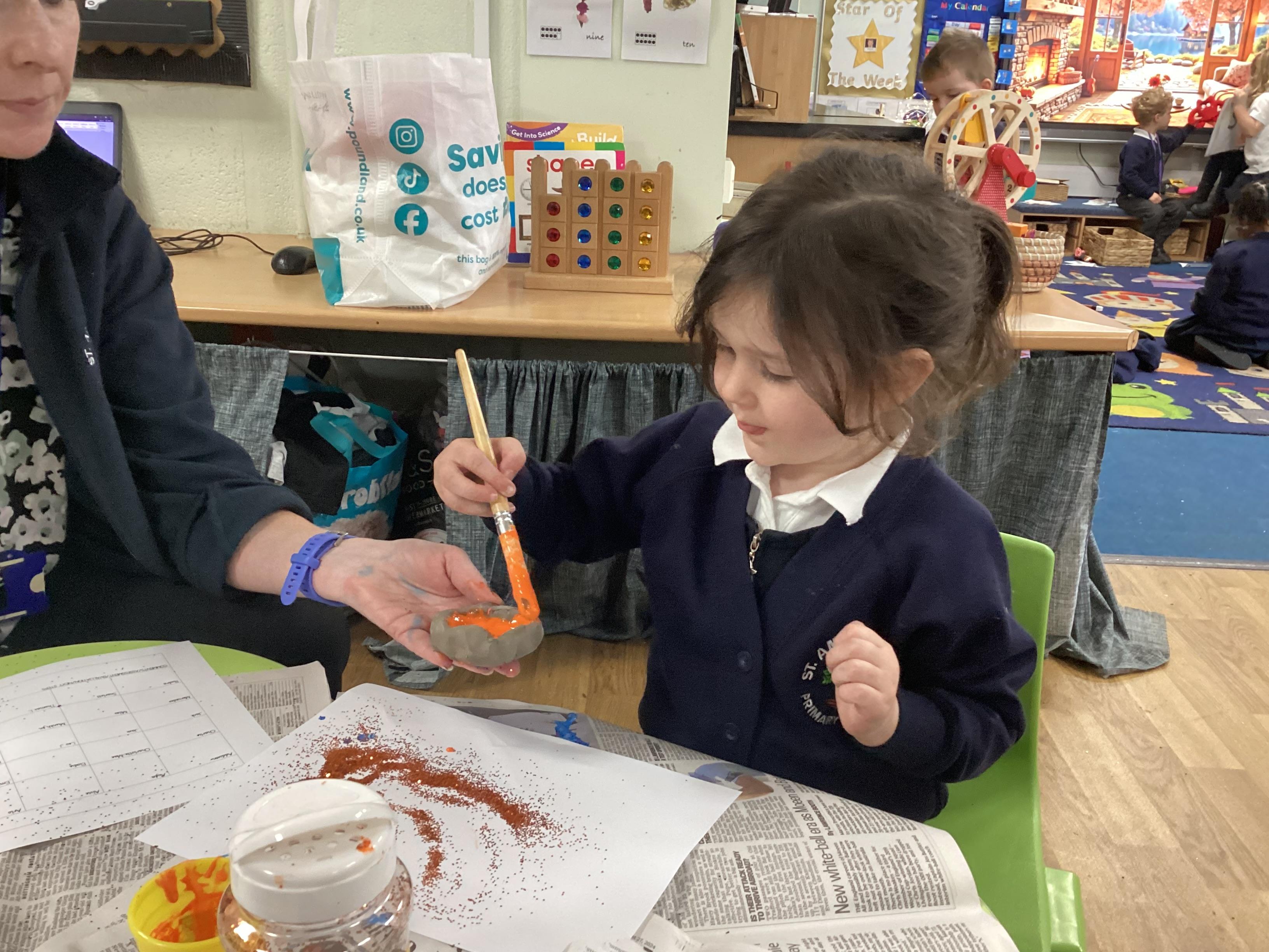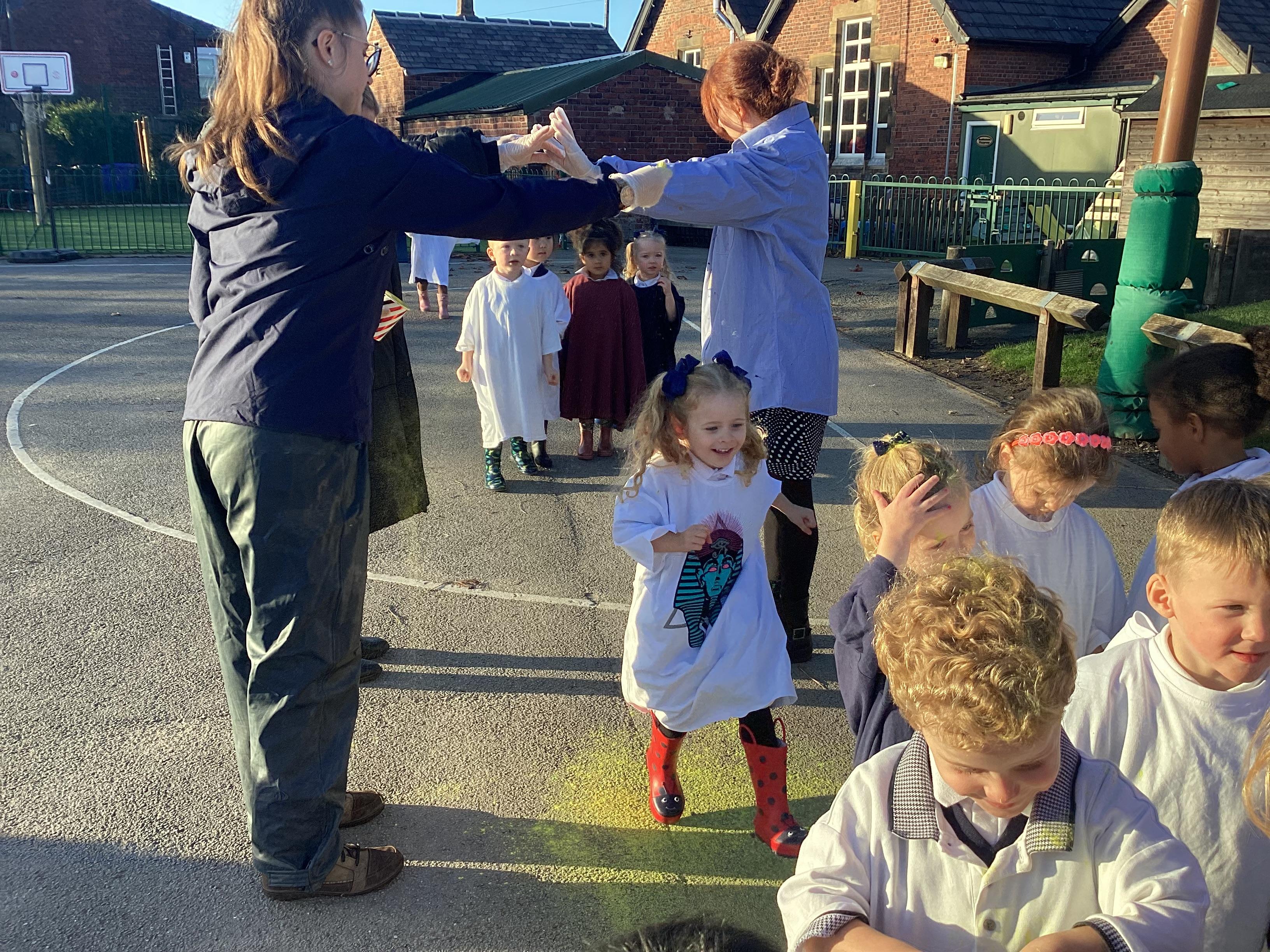 We have been learning all about Diwali, which is the festival of light. We have drawn and painted rangoli patterns and made our own patterns outside using powder paints. We had mendhi henna tattoos painted on our hands, we've dressed up in traditional Indian clothes and have made our very own clay diva lamps to take home. We even took part in an Indian dance workshop which was great fun.