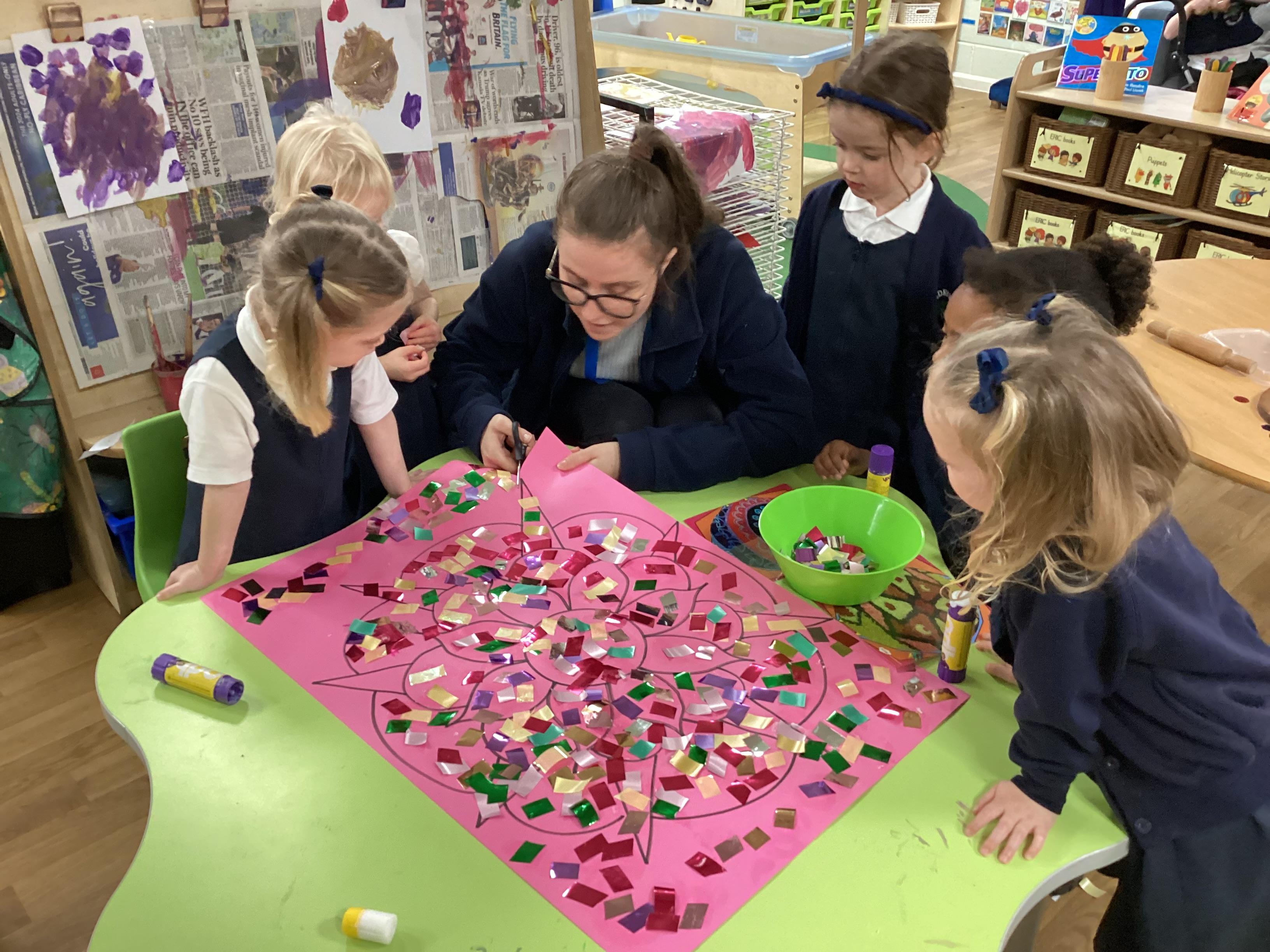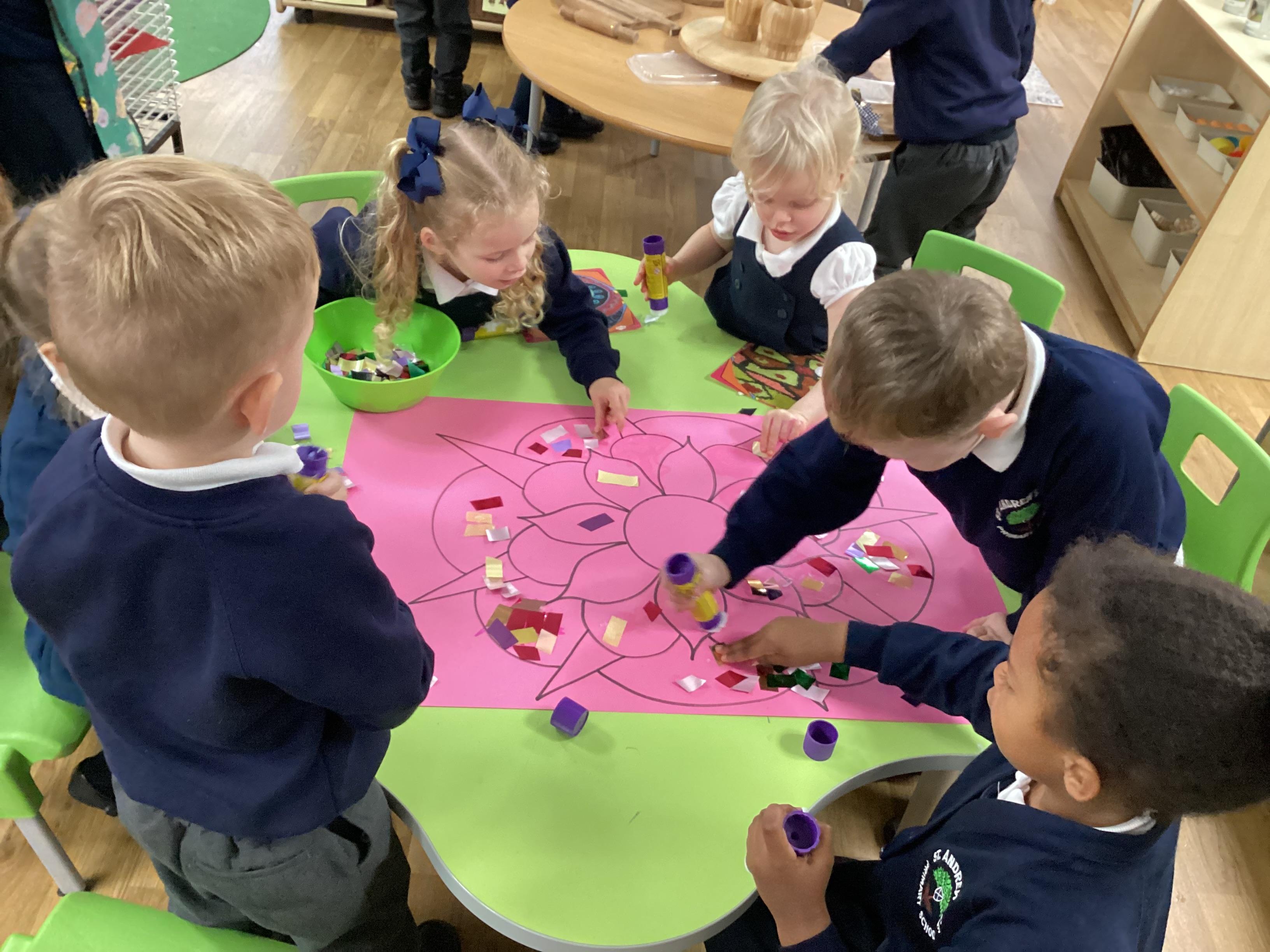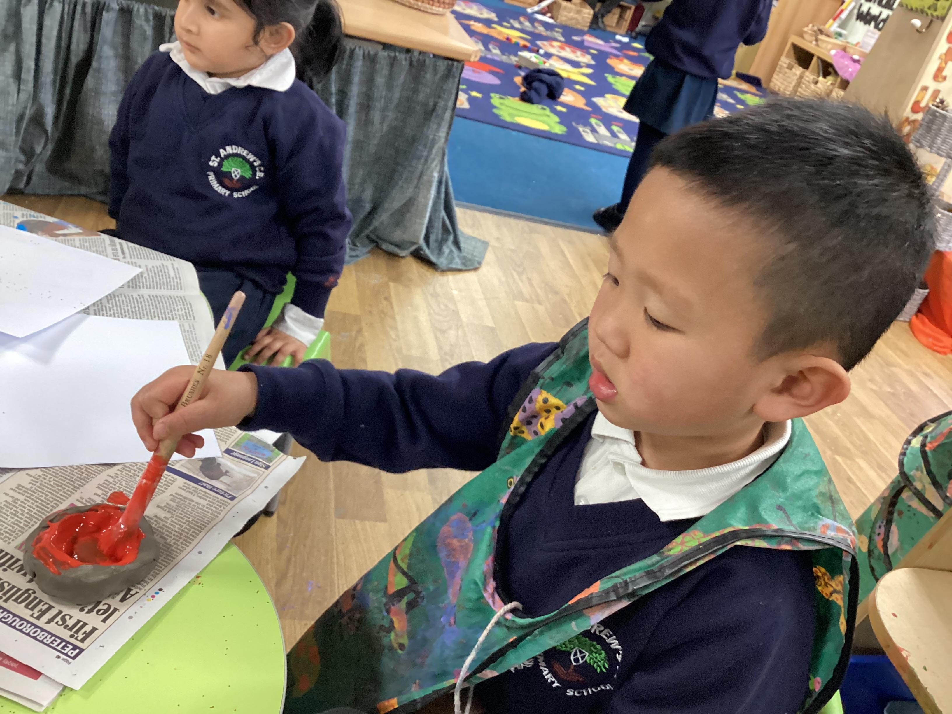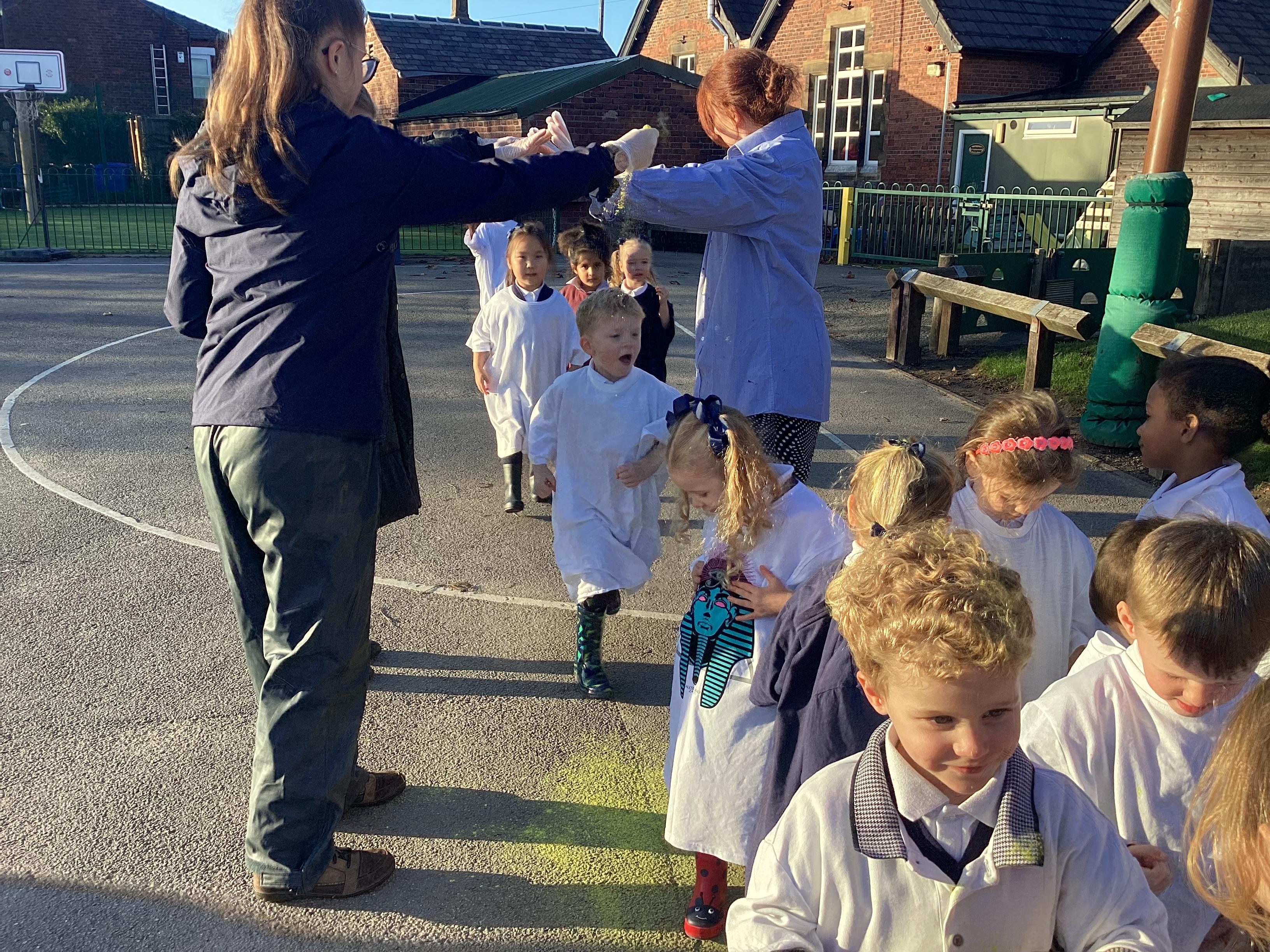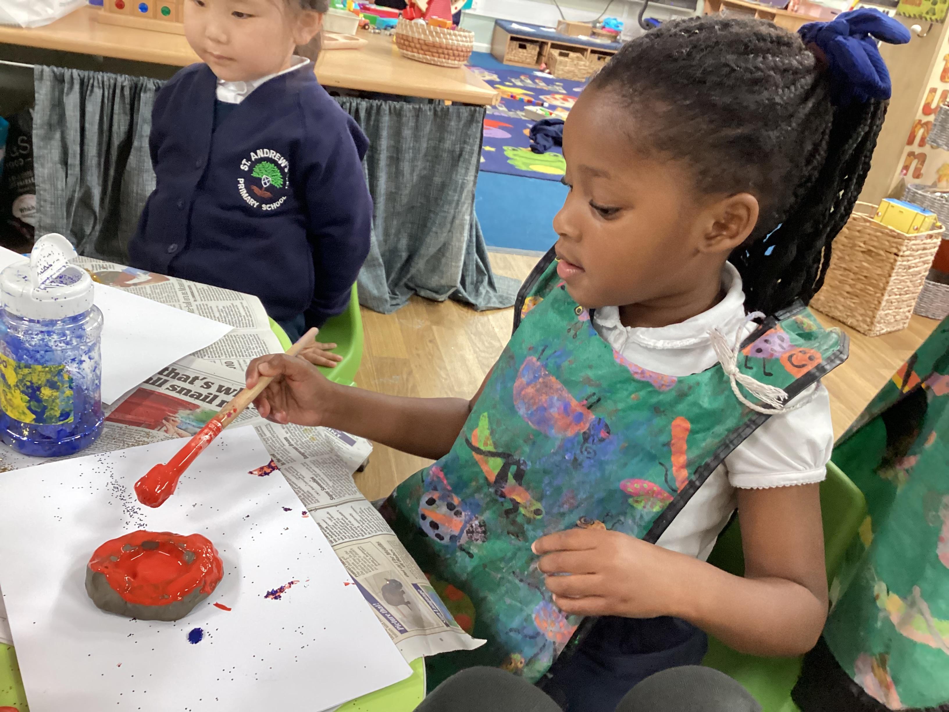 We have been learning all about Diwali, which is the festival of light. We have drawn and painted rangoli patterns and made our own patterns outside using powder paints. We had mendhi henna tattoos painted on our hands, we've dressed up in traditional Indian clothes and have made our very own clay diva lamps to take home. We even took part in an Indian dance workshop which was great fun.