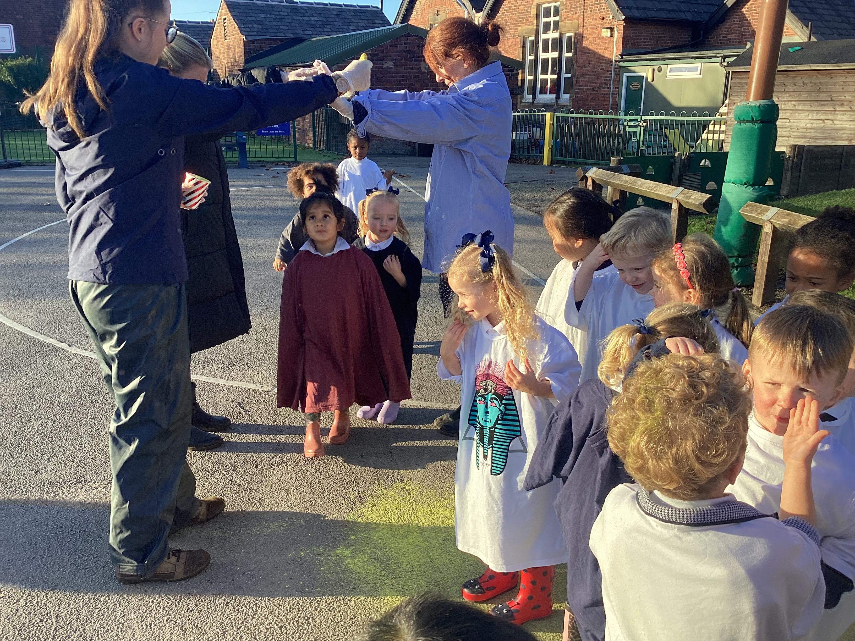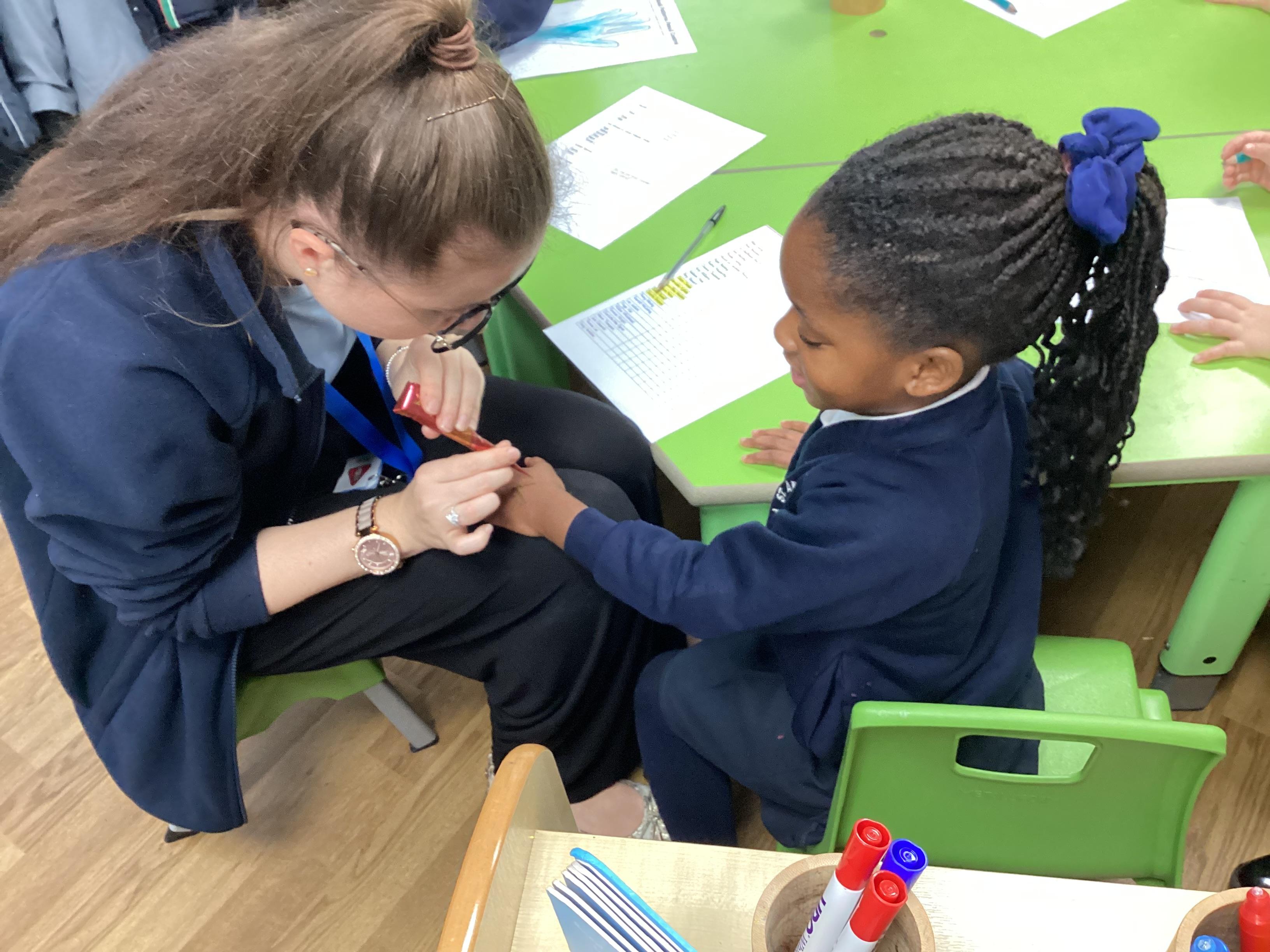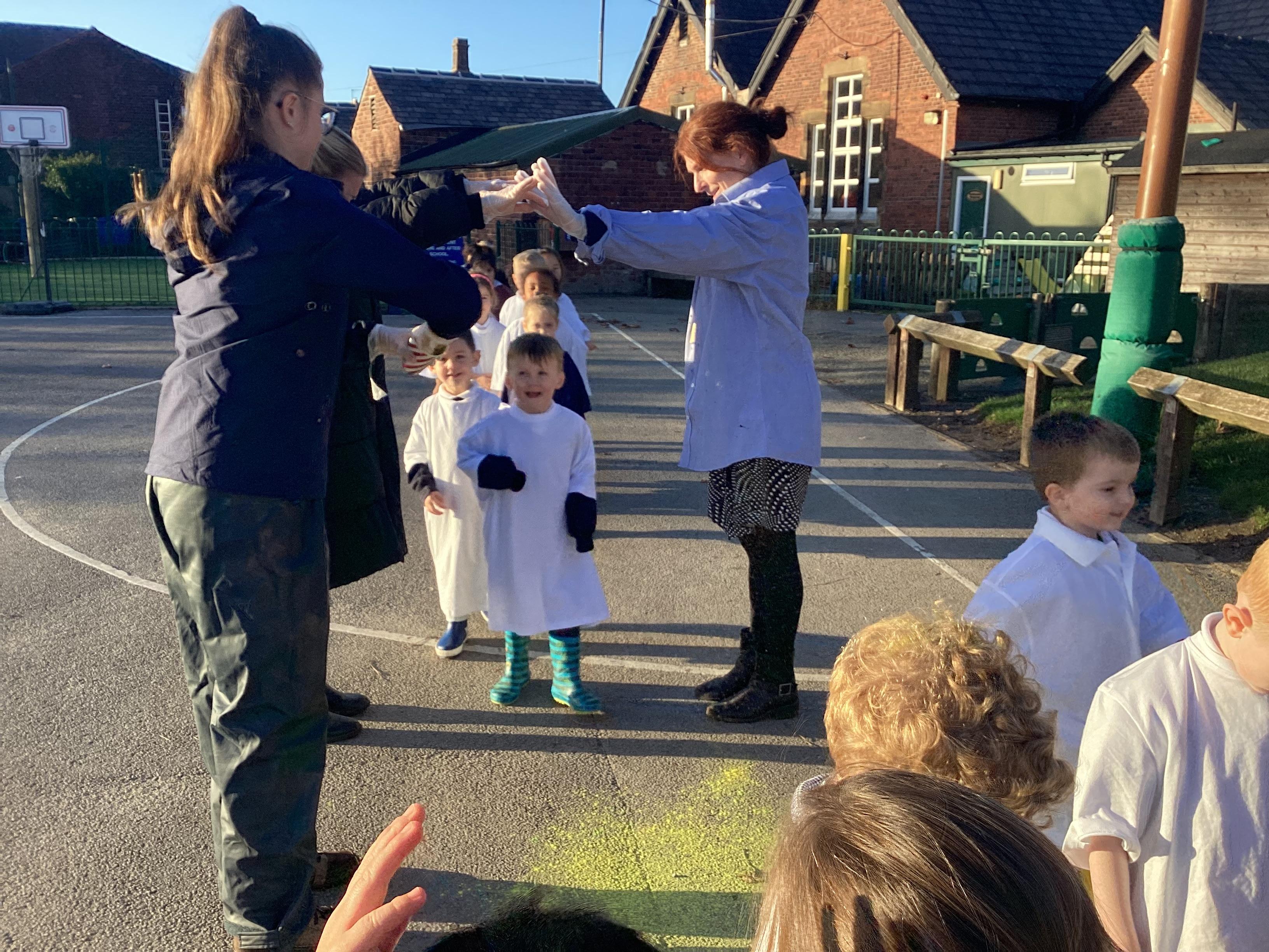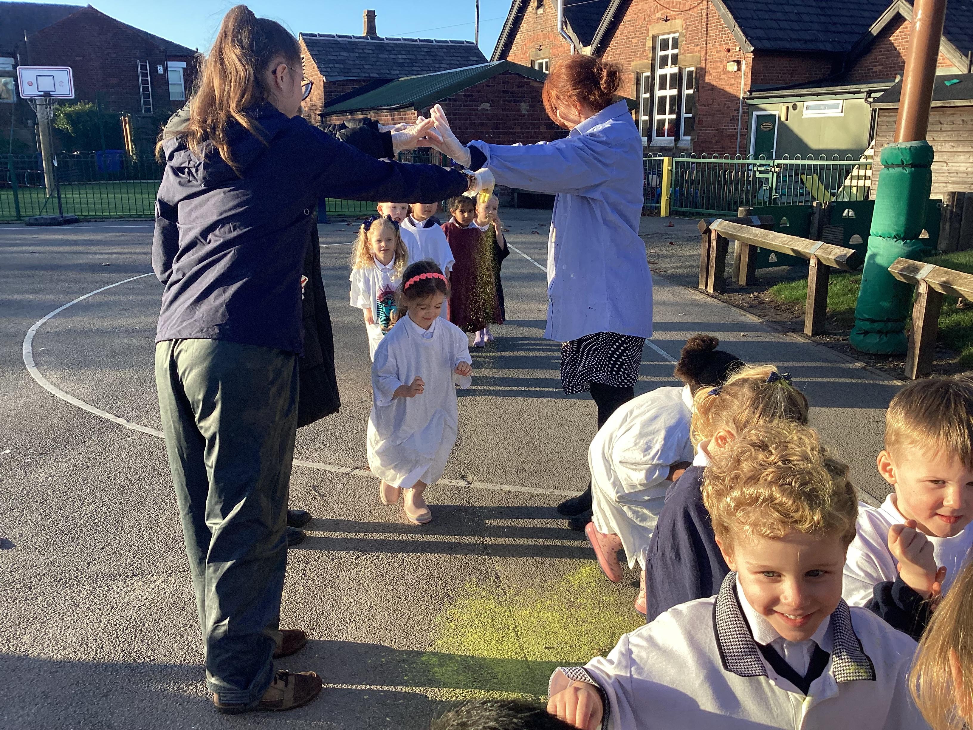 We have been learning all about Diwali, which is the festival of light. We have drawn and painted rangoli patterns and made our own patterns outside using powder paints. We had mendhi henna tattoos painted on our hands, we've dressed up in traditional Indian clothes and have made our very own clay diva lamps to take home. We even took part in an Indian dance workshop which was great fun.
