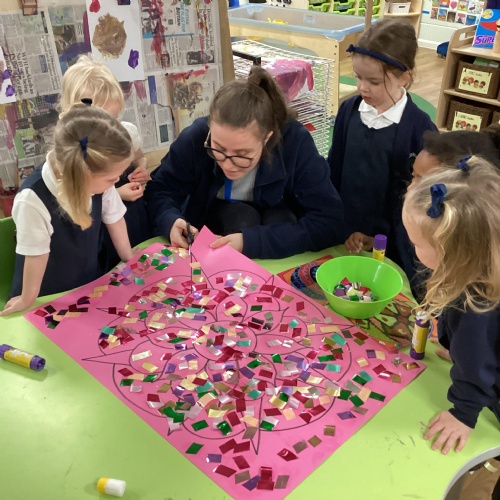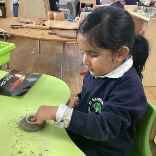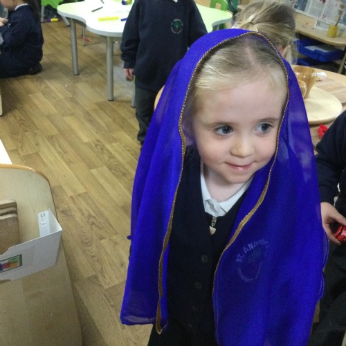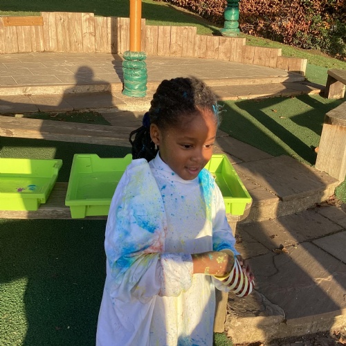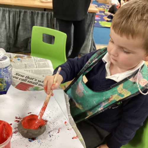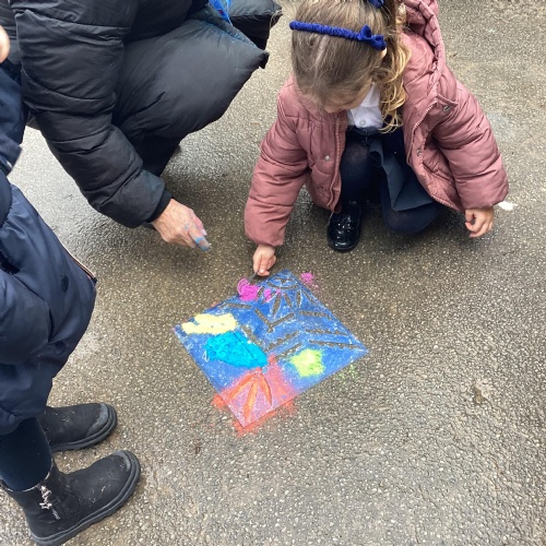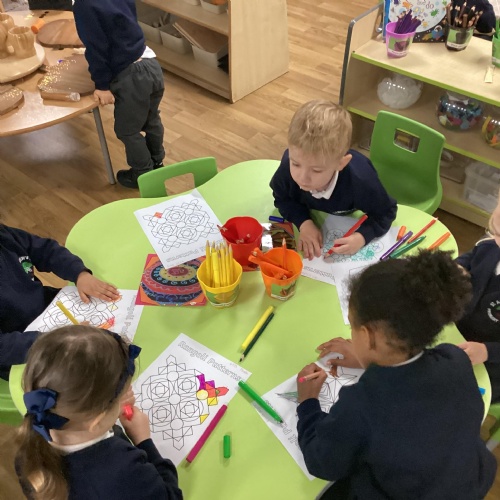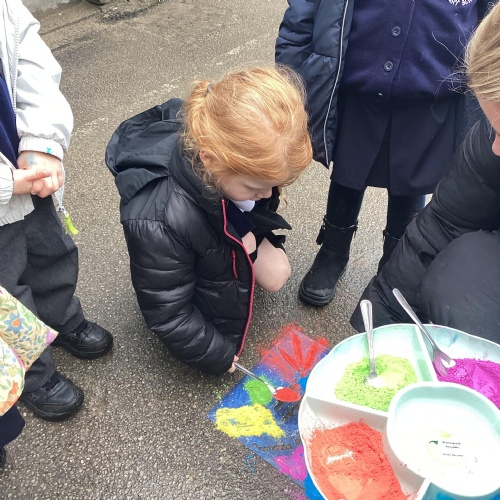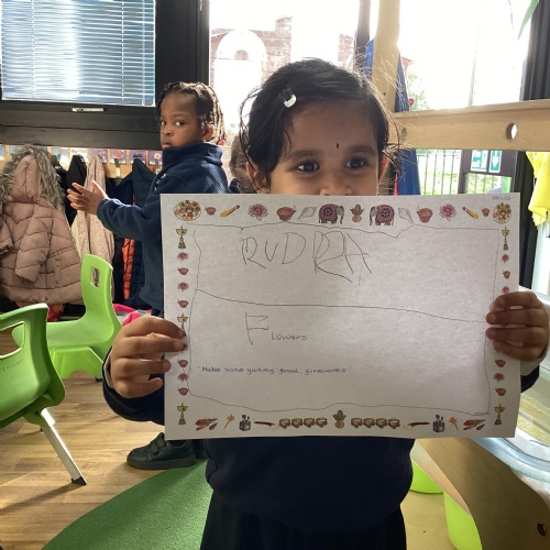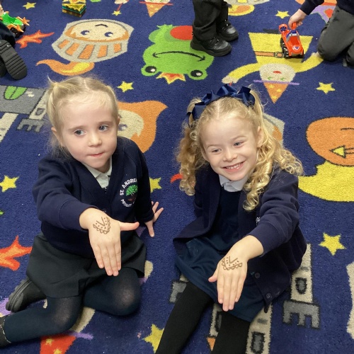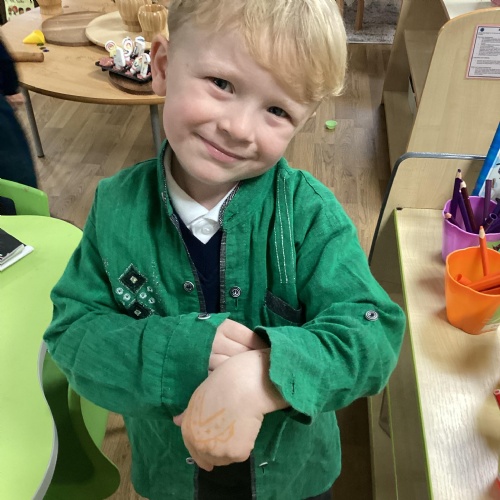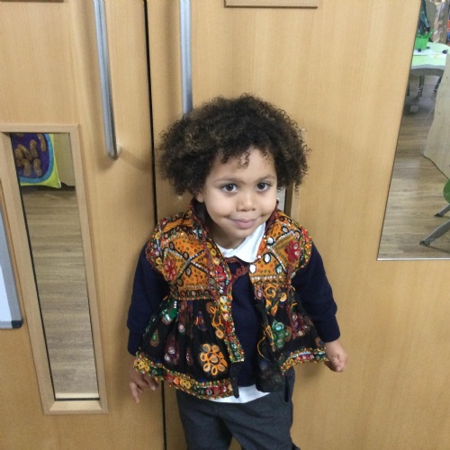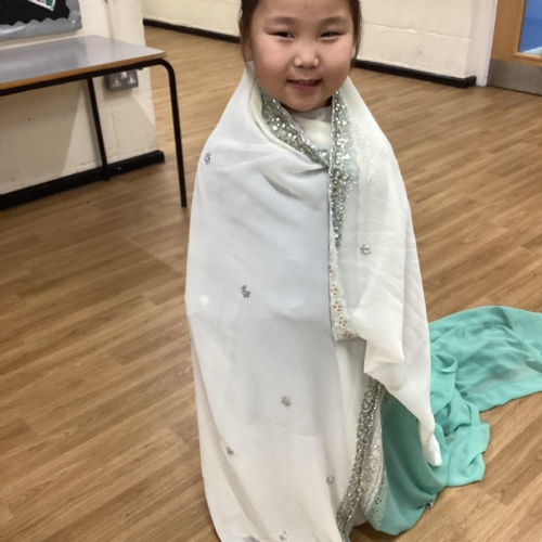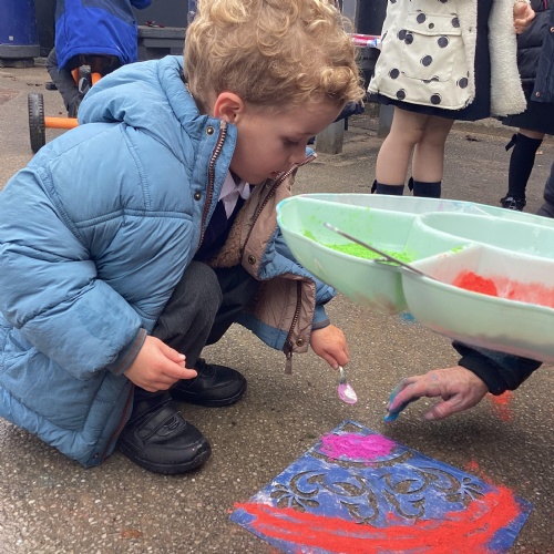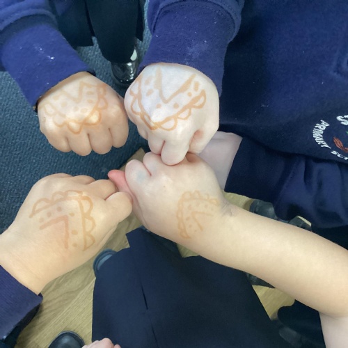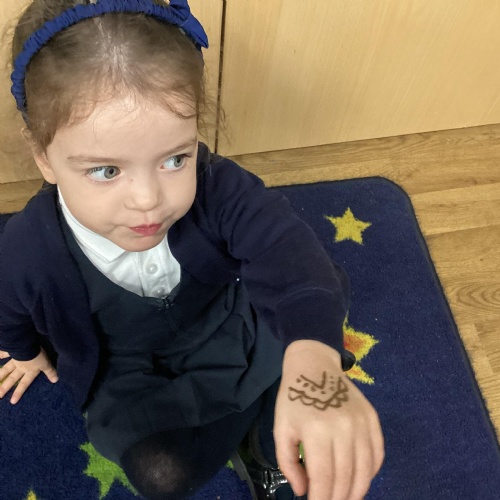 We have been learning all about Diwali, which is the festival of light. We have drawn and painted rangoli patterns and made our own patterns outside using powder paints. We had mendhi henna tattoos painted on our hands, we've dressed up in traditional Indian clothes and have made our very own clay diva lamps to take home. We even took part in an Indian dance workshop which was great fun.