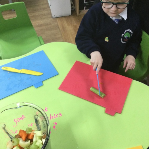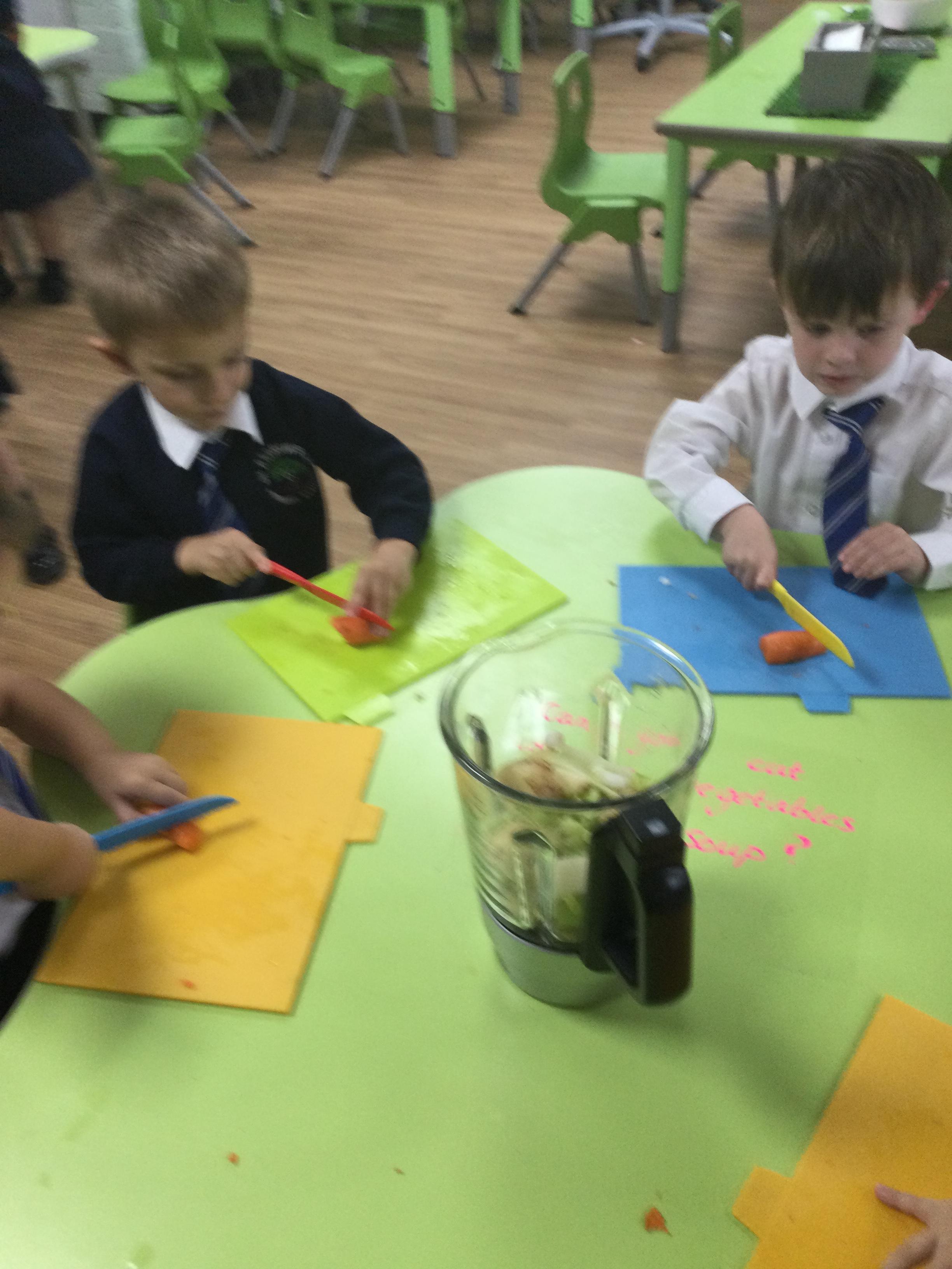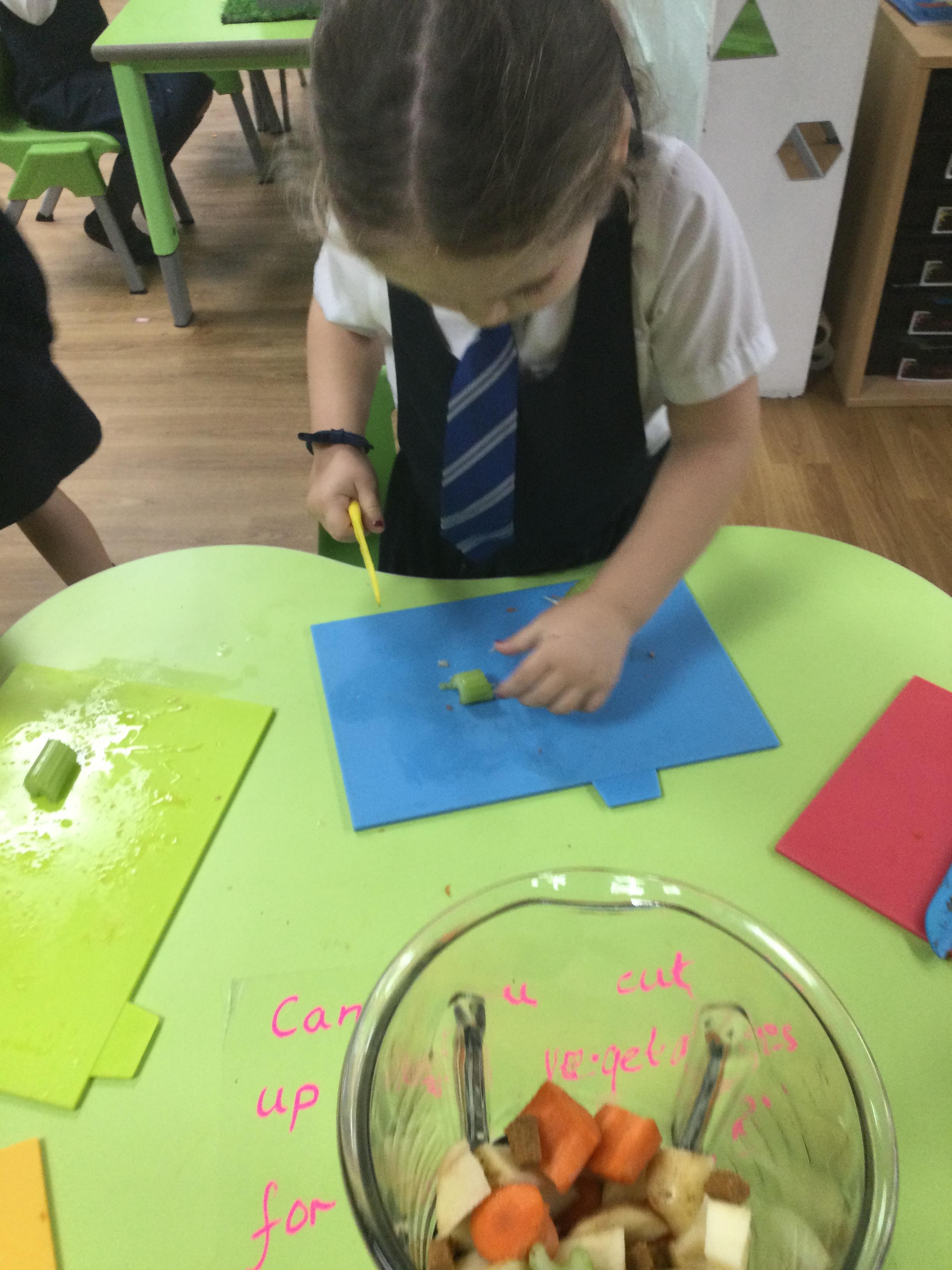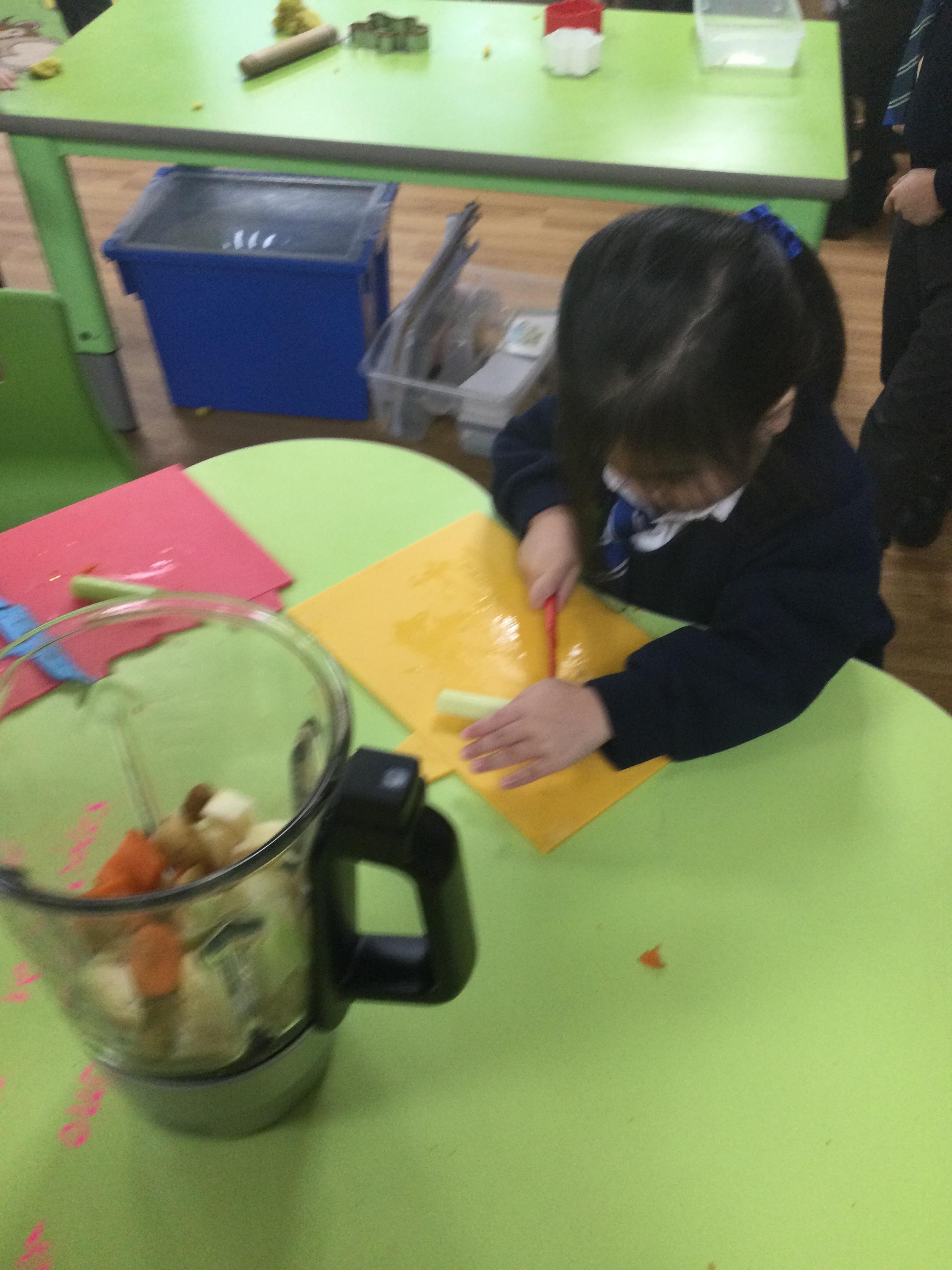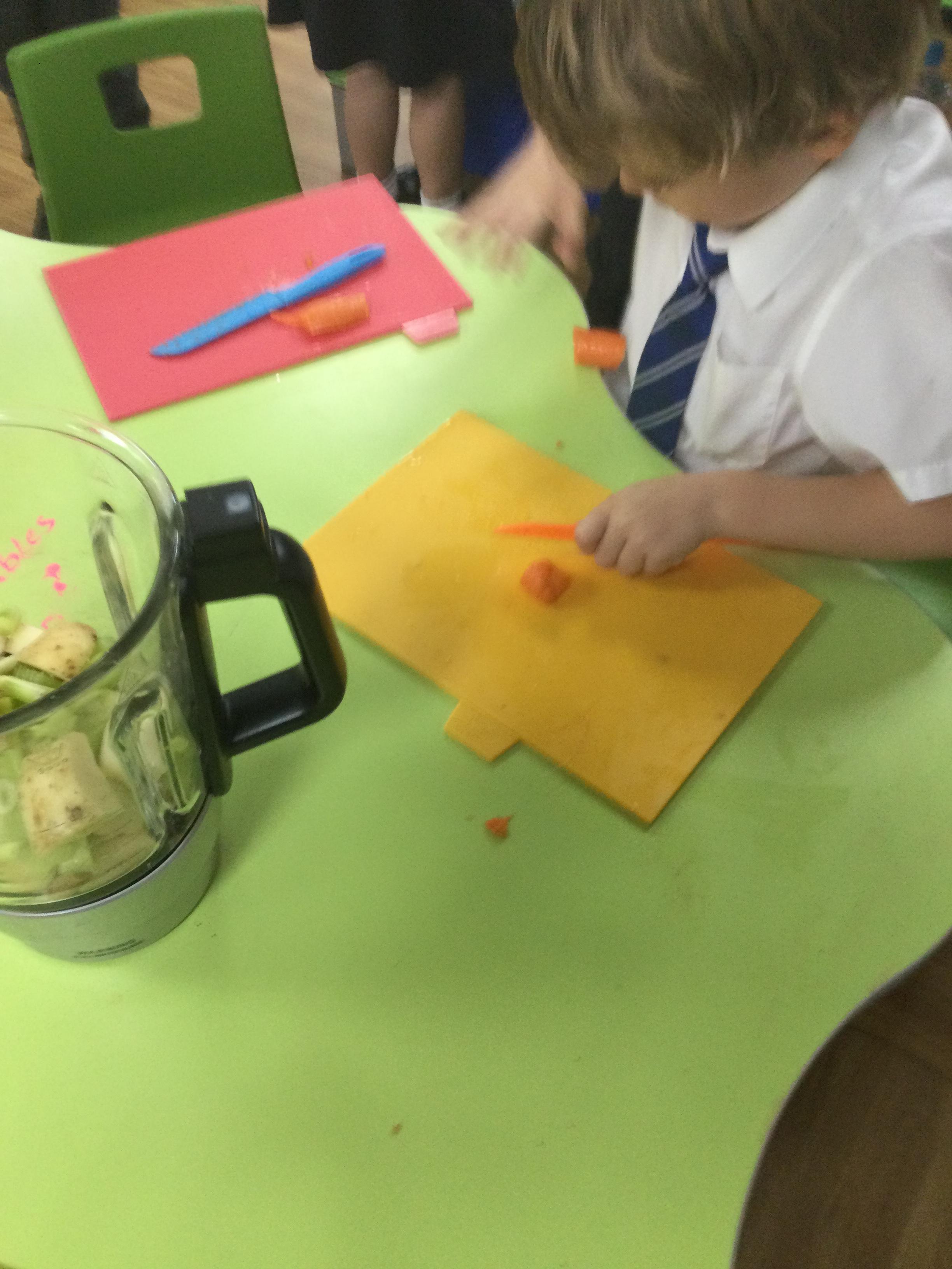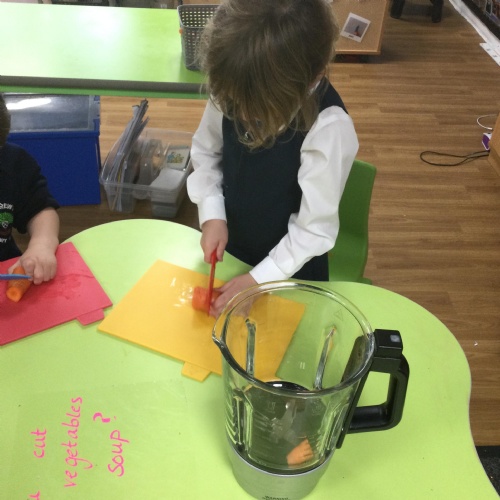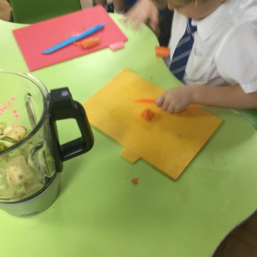 Then we talked about how we could make vegetable soup and decided to make some. We knew it was important to wash our hands before we started and then we began cutting the vegetables, very carefully, and placing them in the soup maker. Miss Bailey then put the soup maker on in the staff room and waited for our soup to cool down before we tried it.