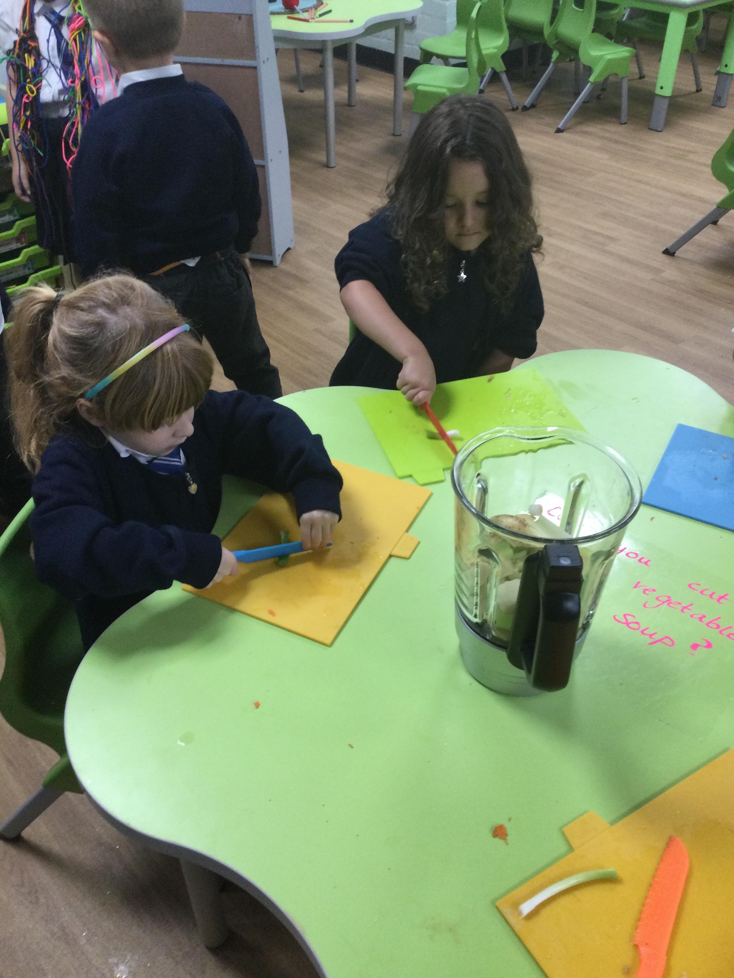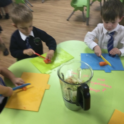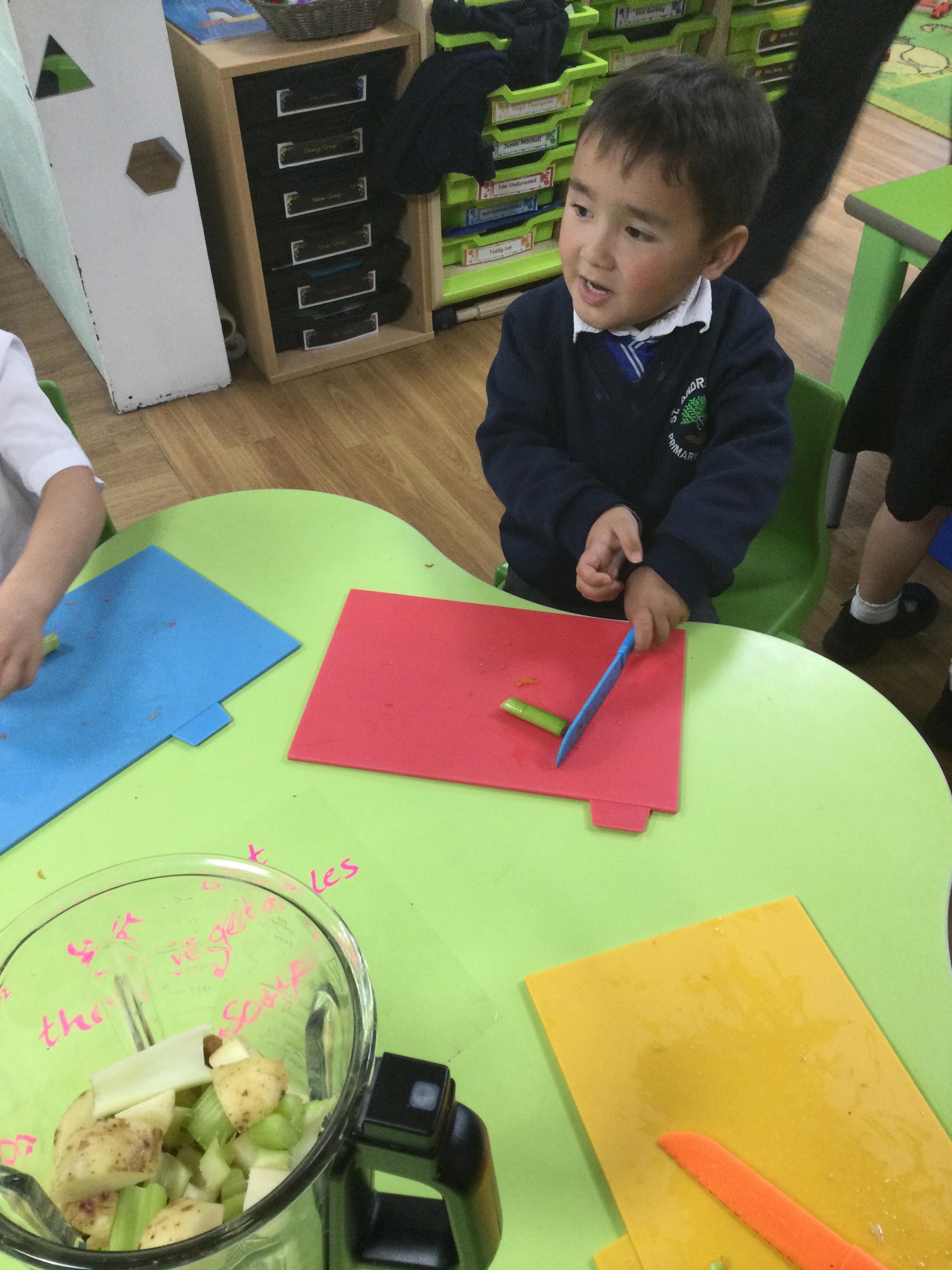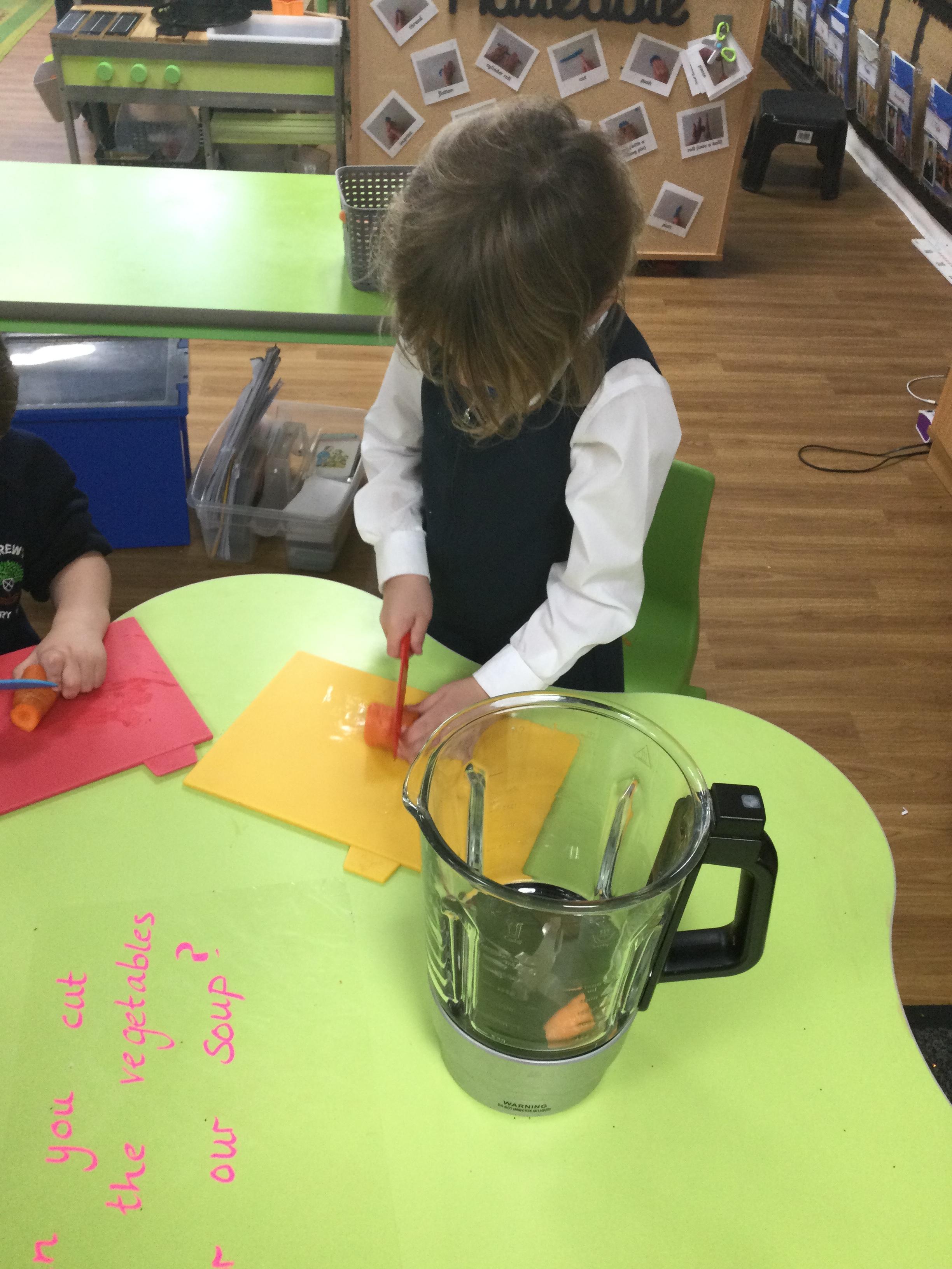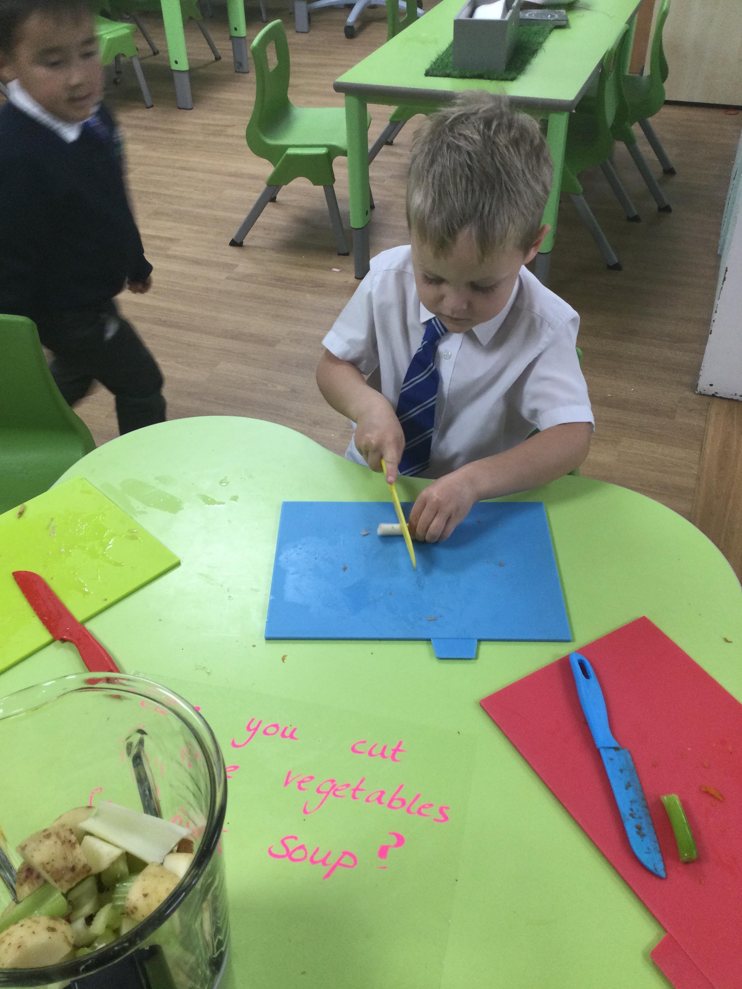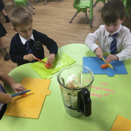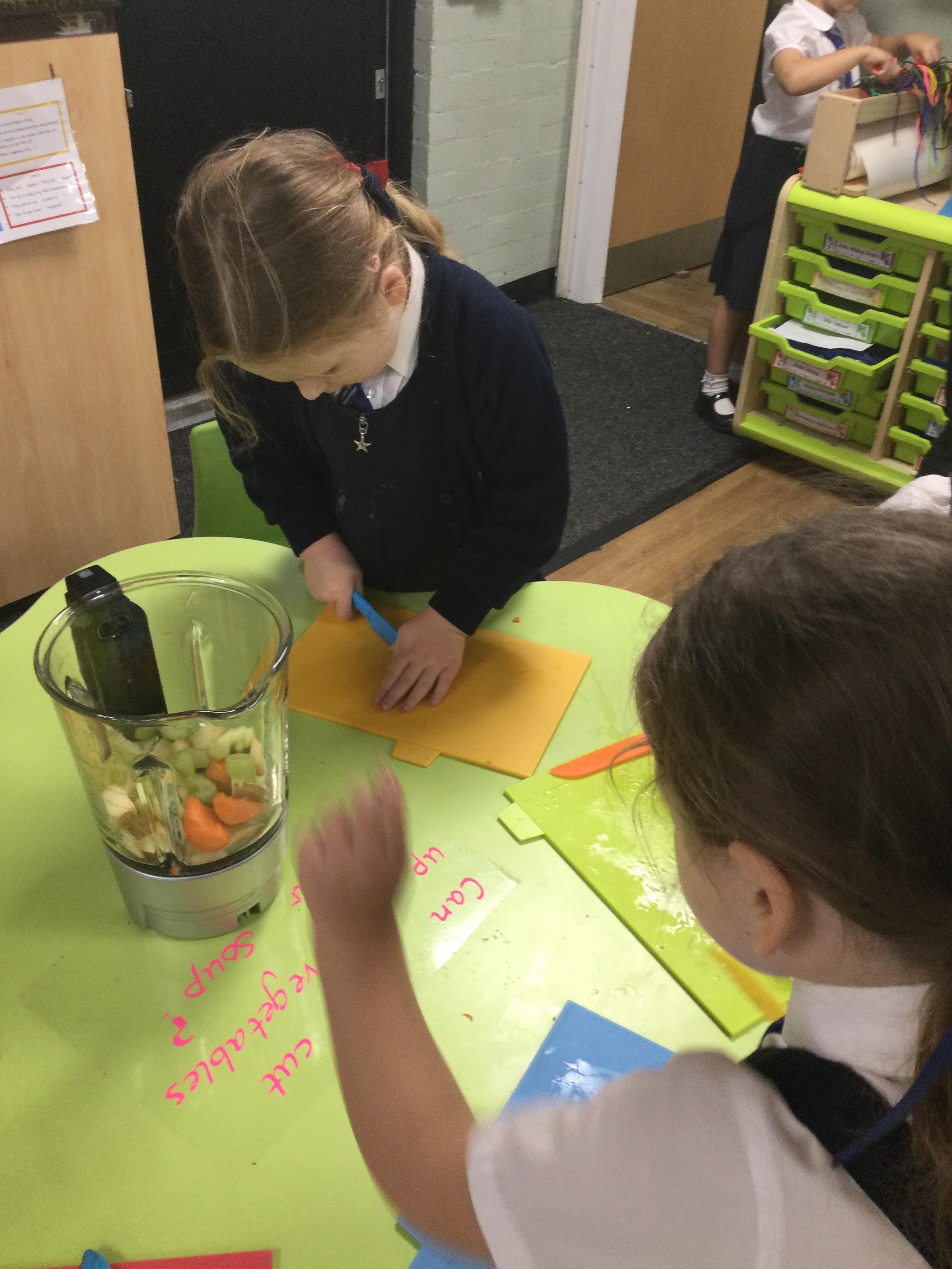 Then we talked about how we could make vegetable soup and decided to make some. We knew it was important to wash our hands before we started and then we began cutting the vegetables, very carefully, and placing them in the soup maker. Miss Bailey then put the soup maker on in the staff room and waited for our soup to cool down before we tried it.