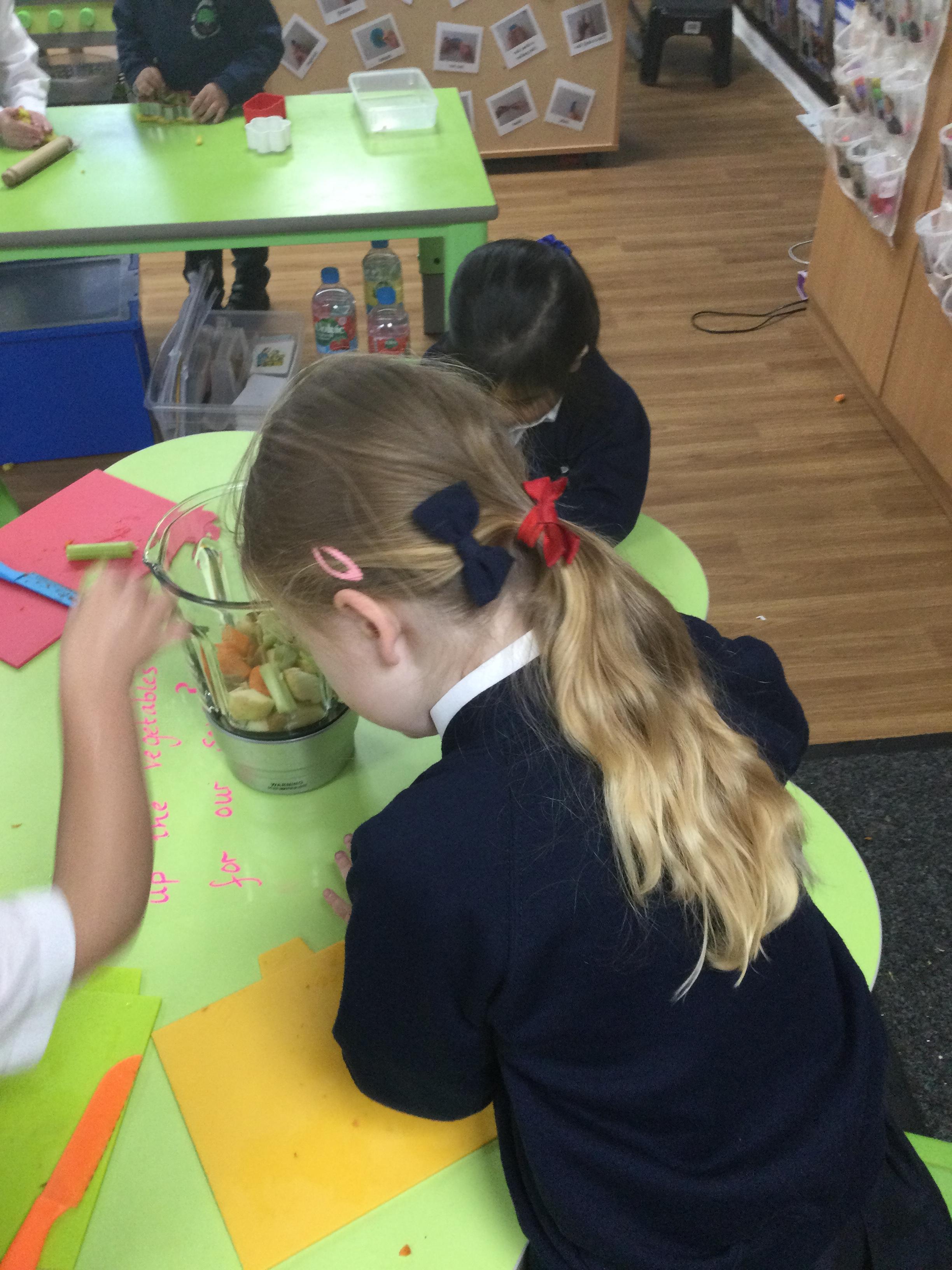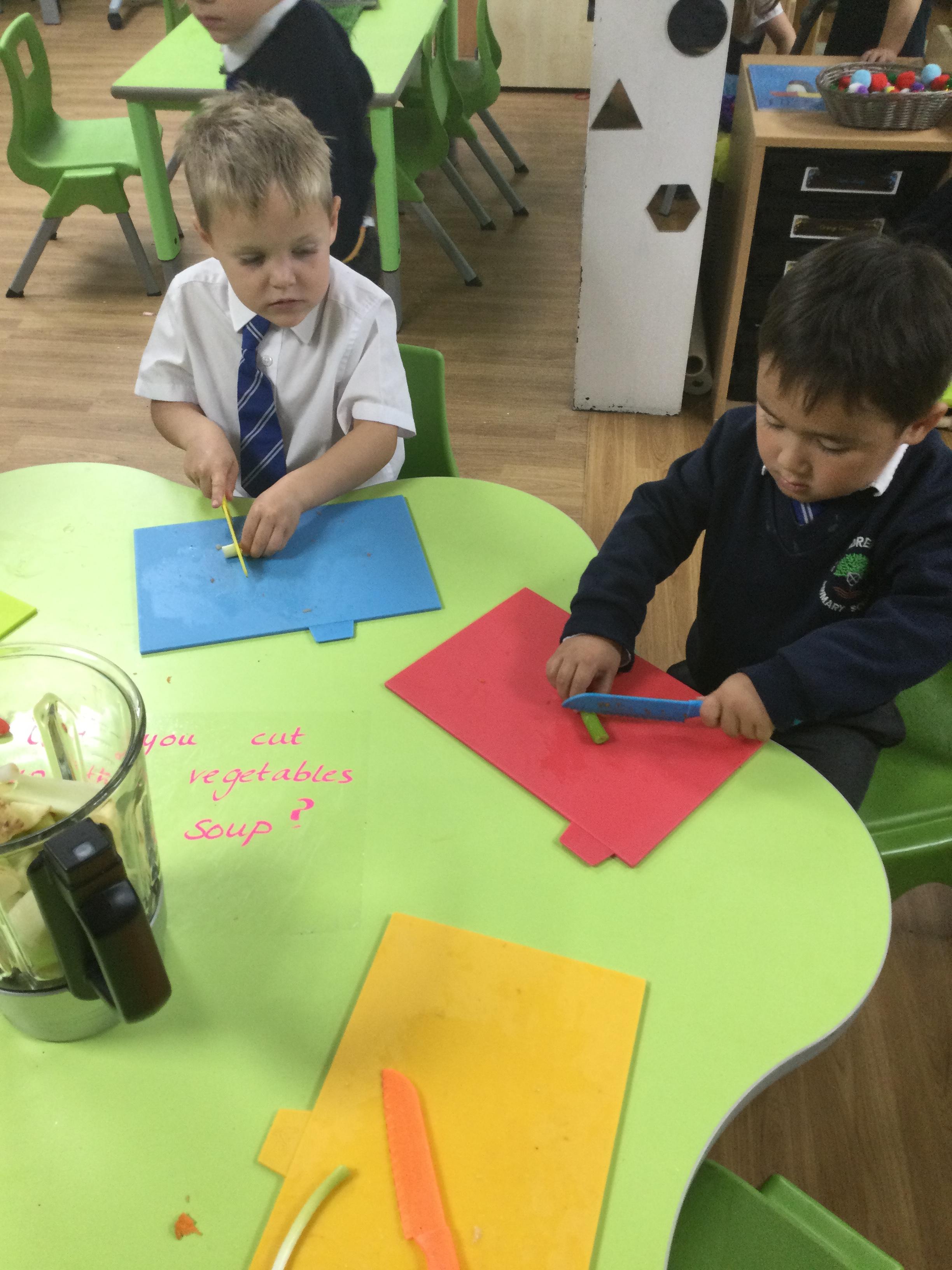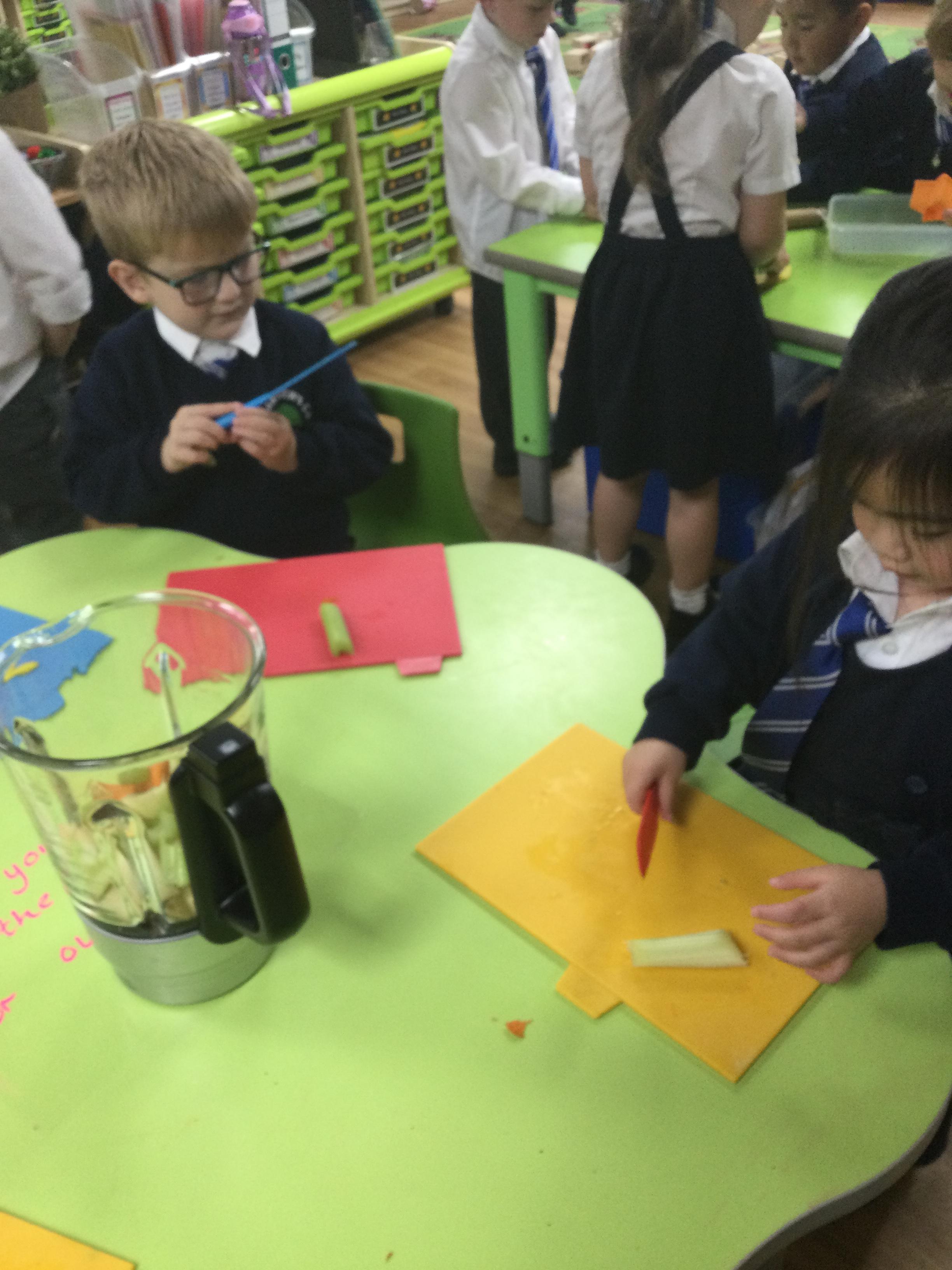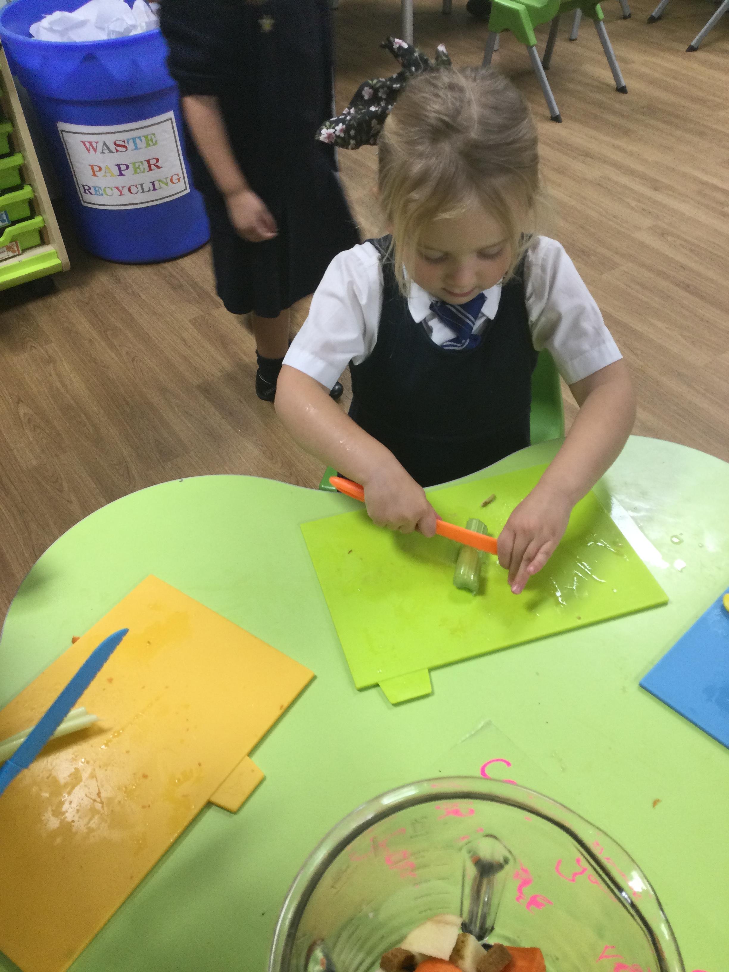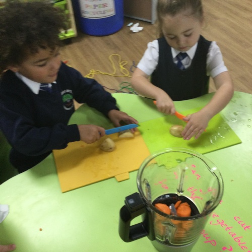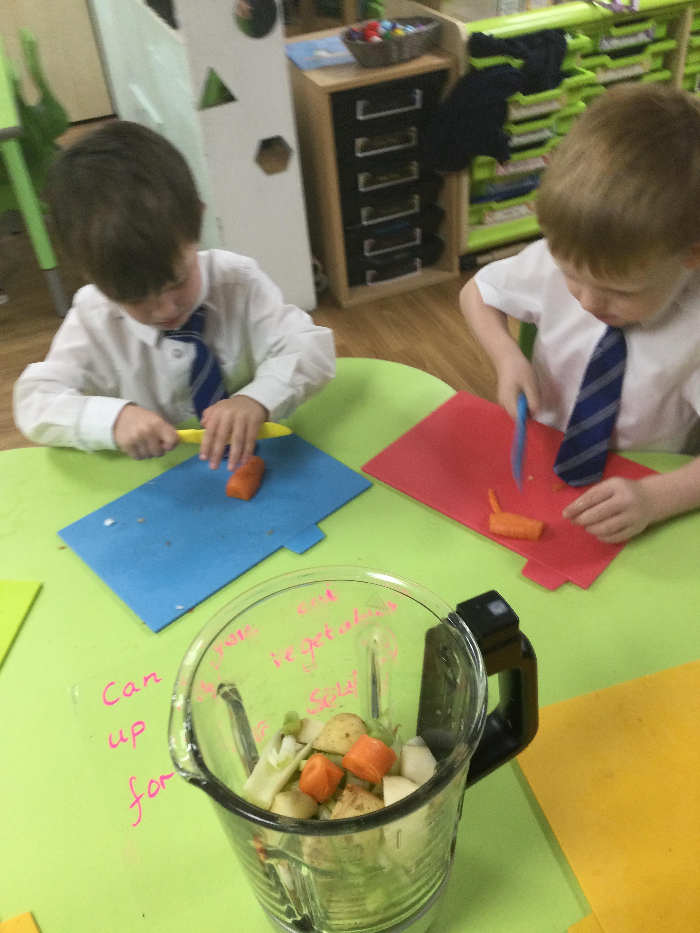 Then we talked about how we could make vegetable soup and decided to make some. We knew it was important to wash our hands before we started and then we began cutting the vegetables, very carefully, and placing them in the soup maker. Miss Bailey then put the soup maker on in the staff room and waited for our soup to cool down before we tried it.