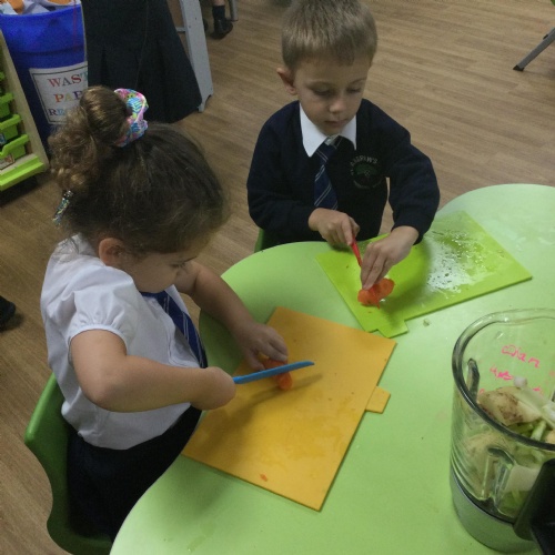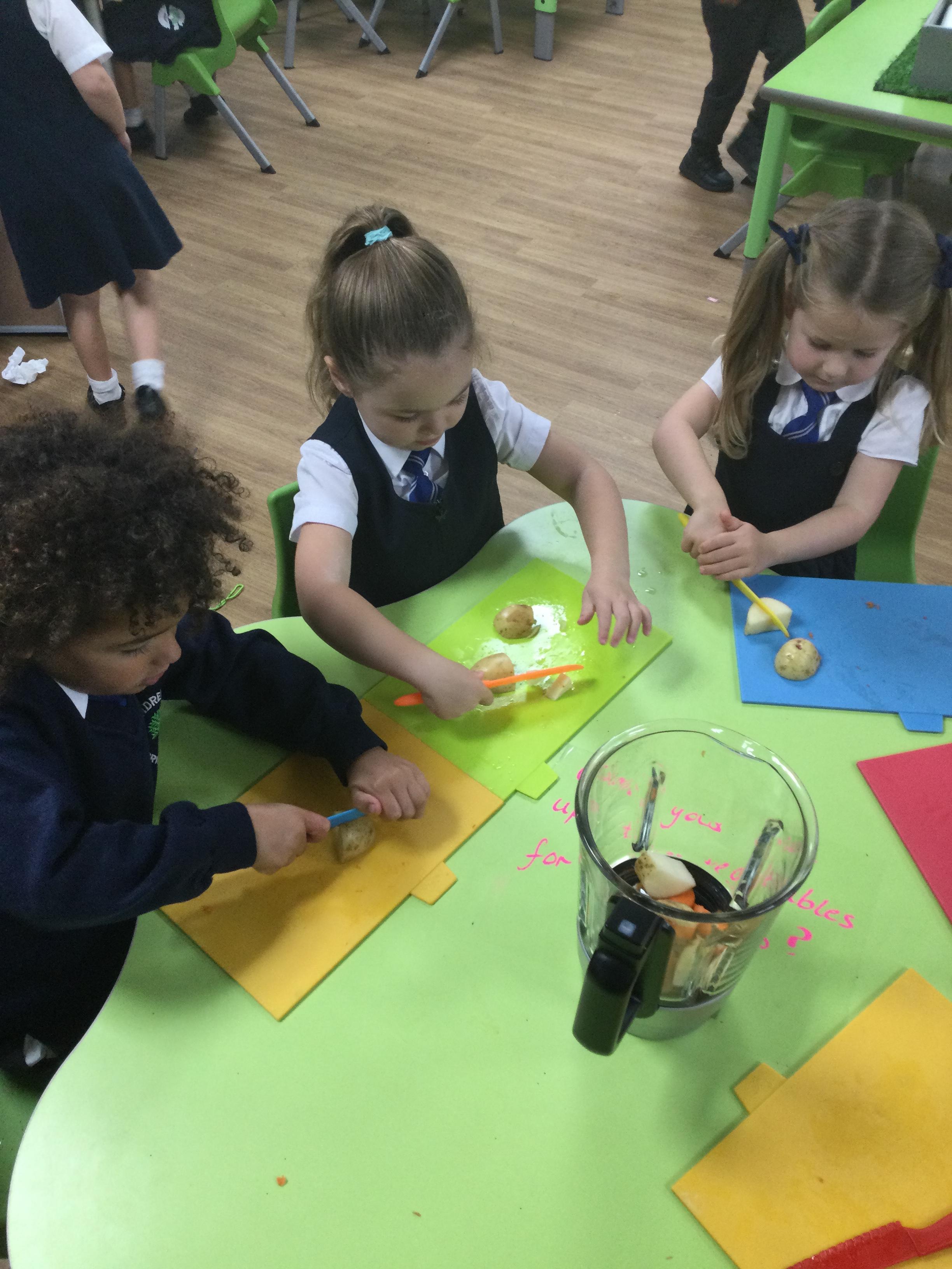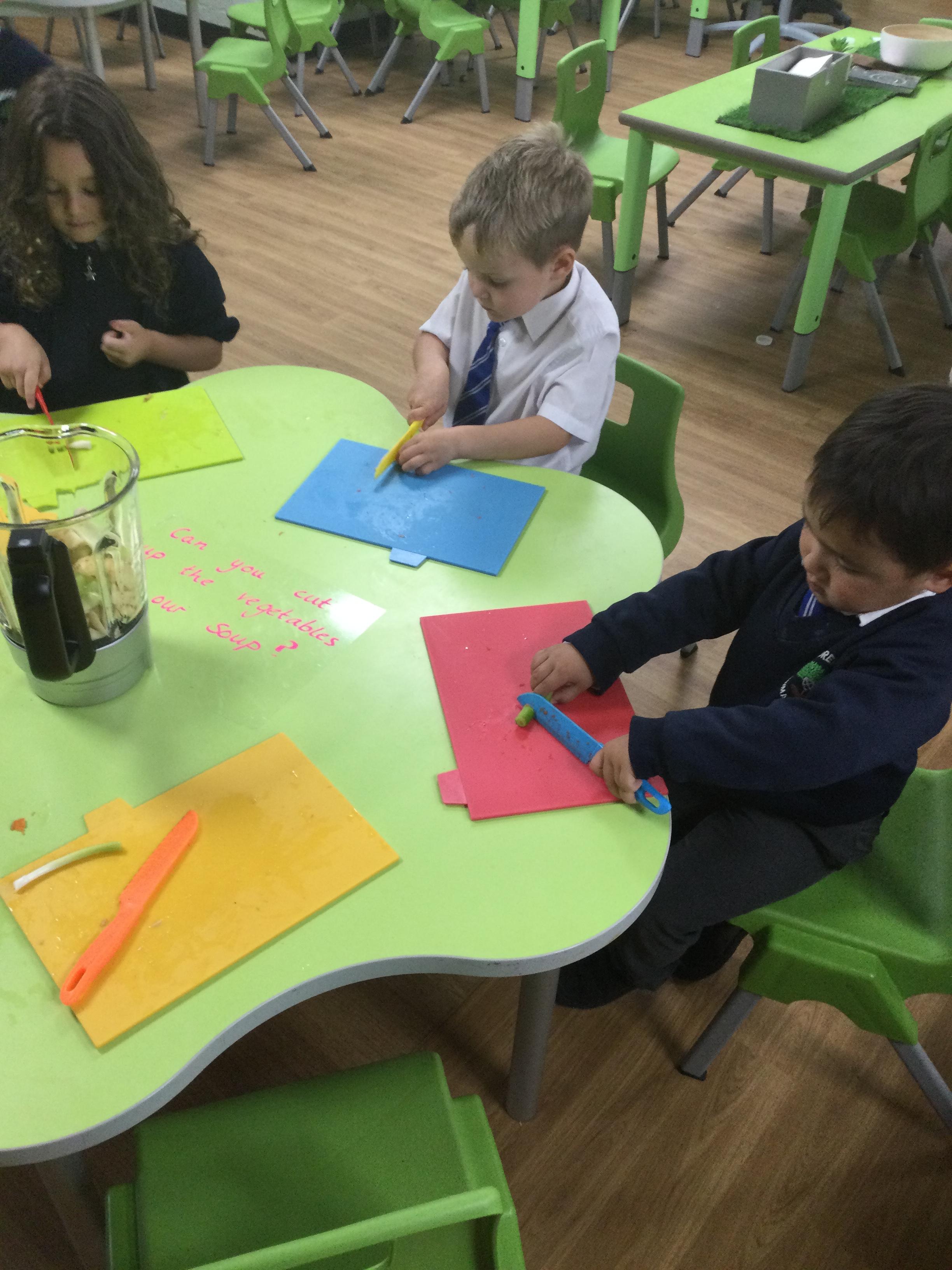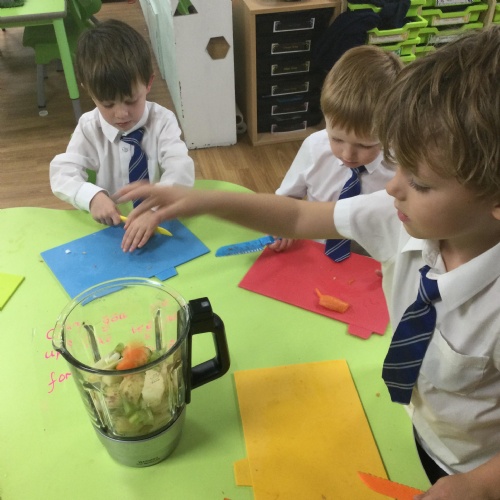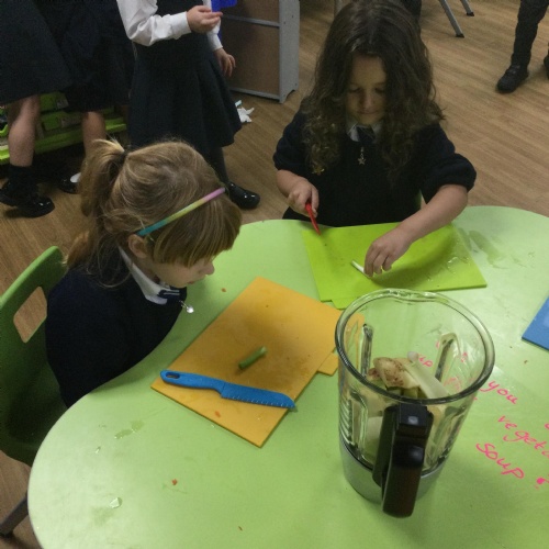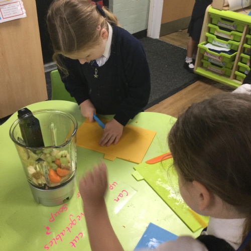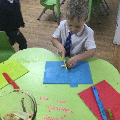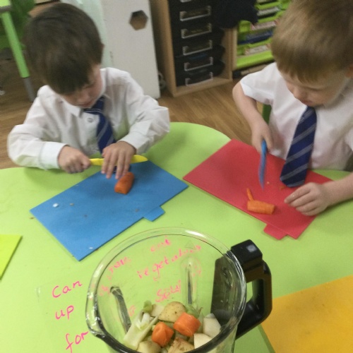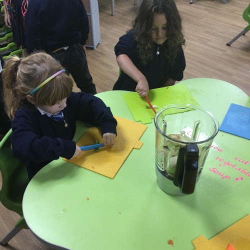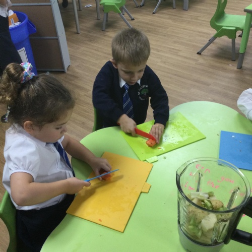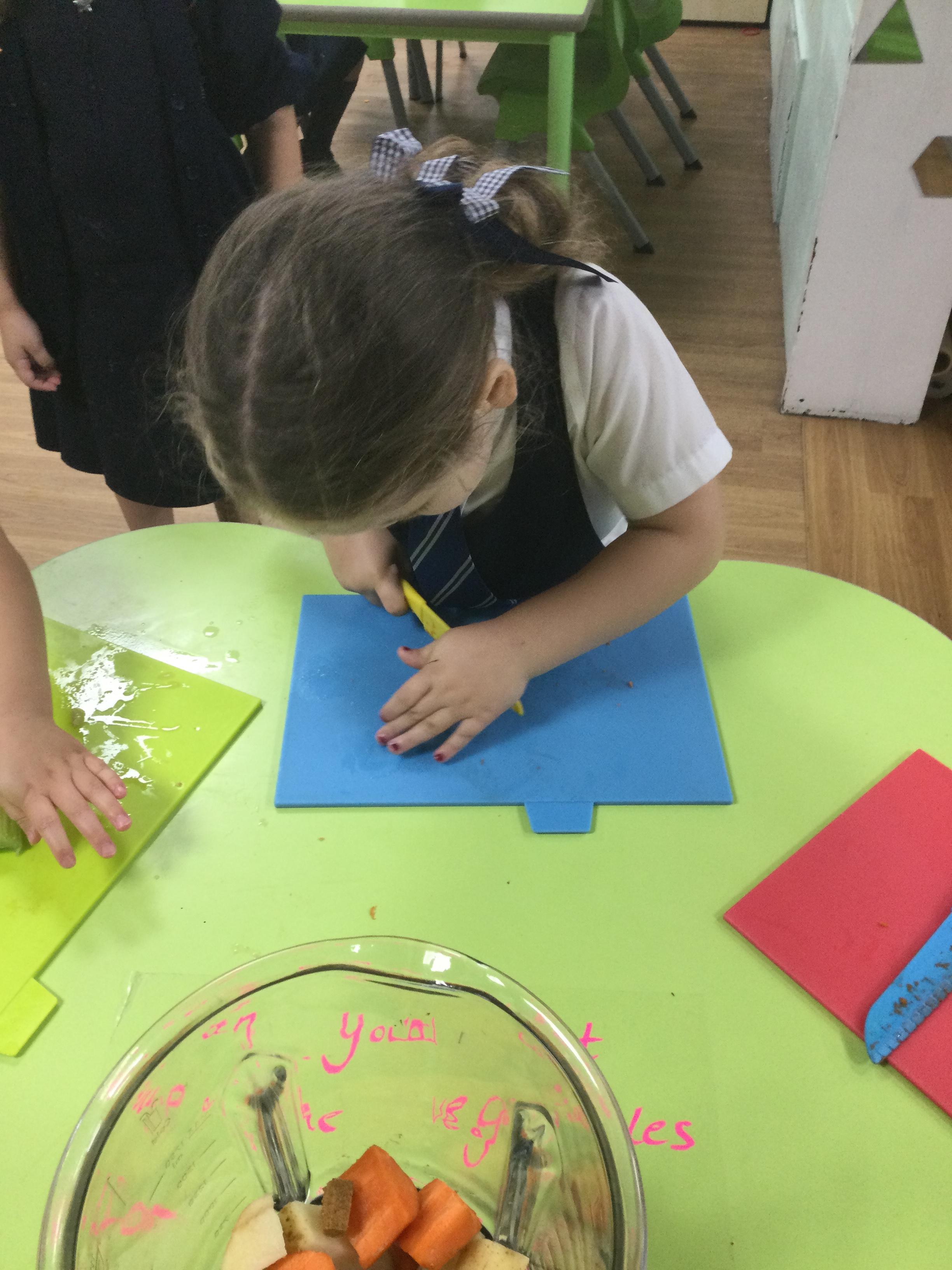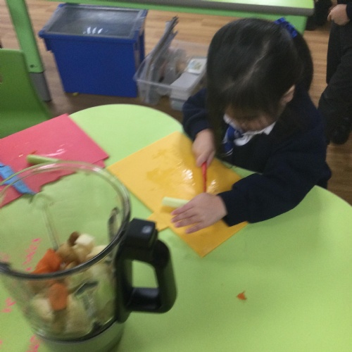 Then we talked about how we could make vegetable soup and decided to make some. We knew it was important to wash our hands before we started and then we began cutting the vegetables, very carefully, and placing them in the soup maker. Miss Bailey then put the soup maker on in the staff room and waited for our soup to cool down before we tried it.
