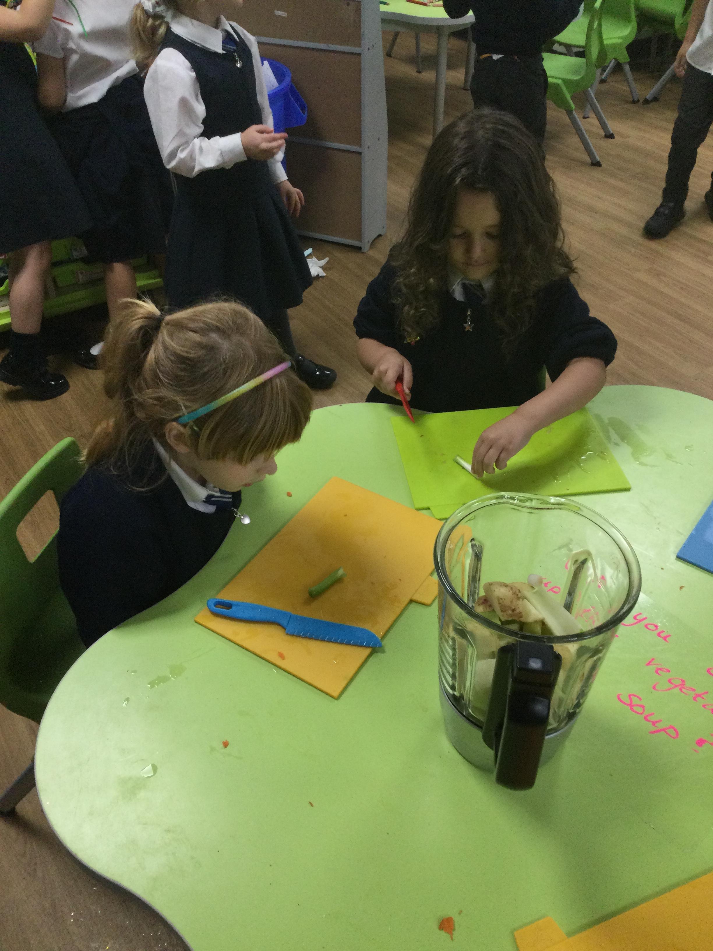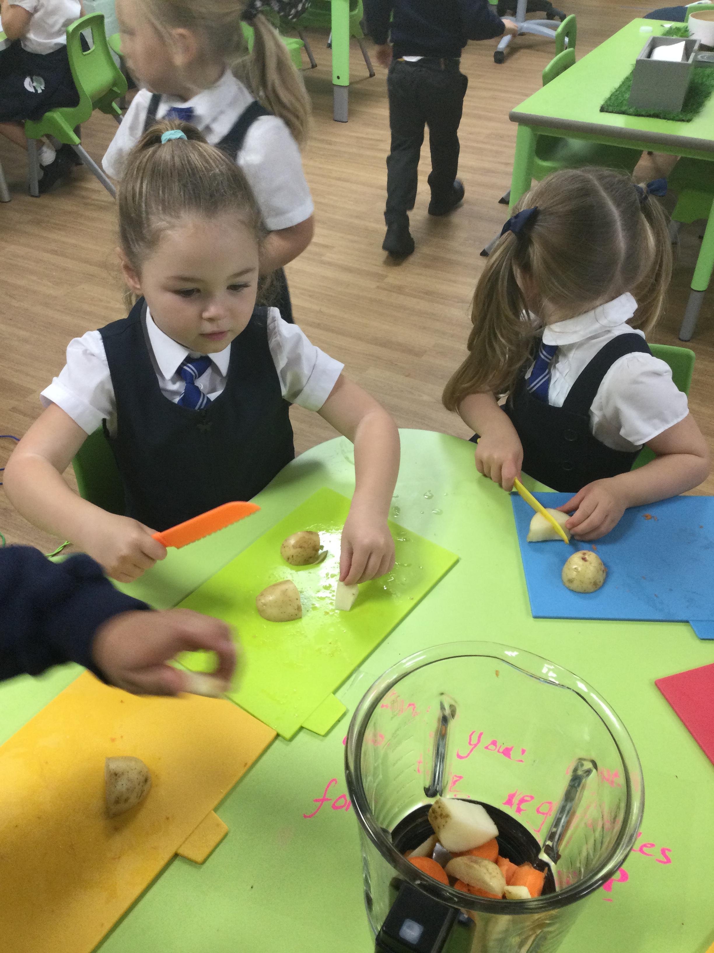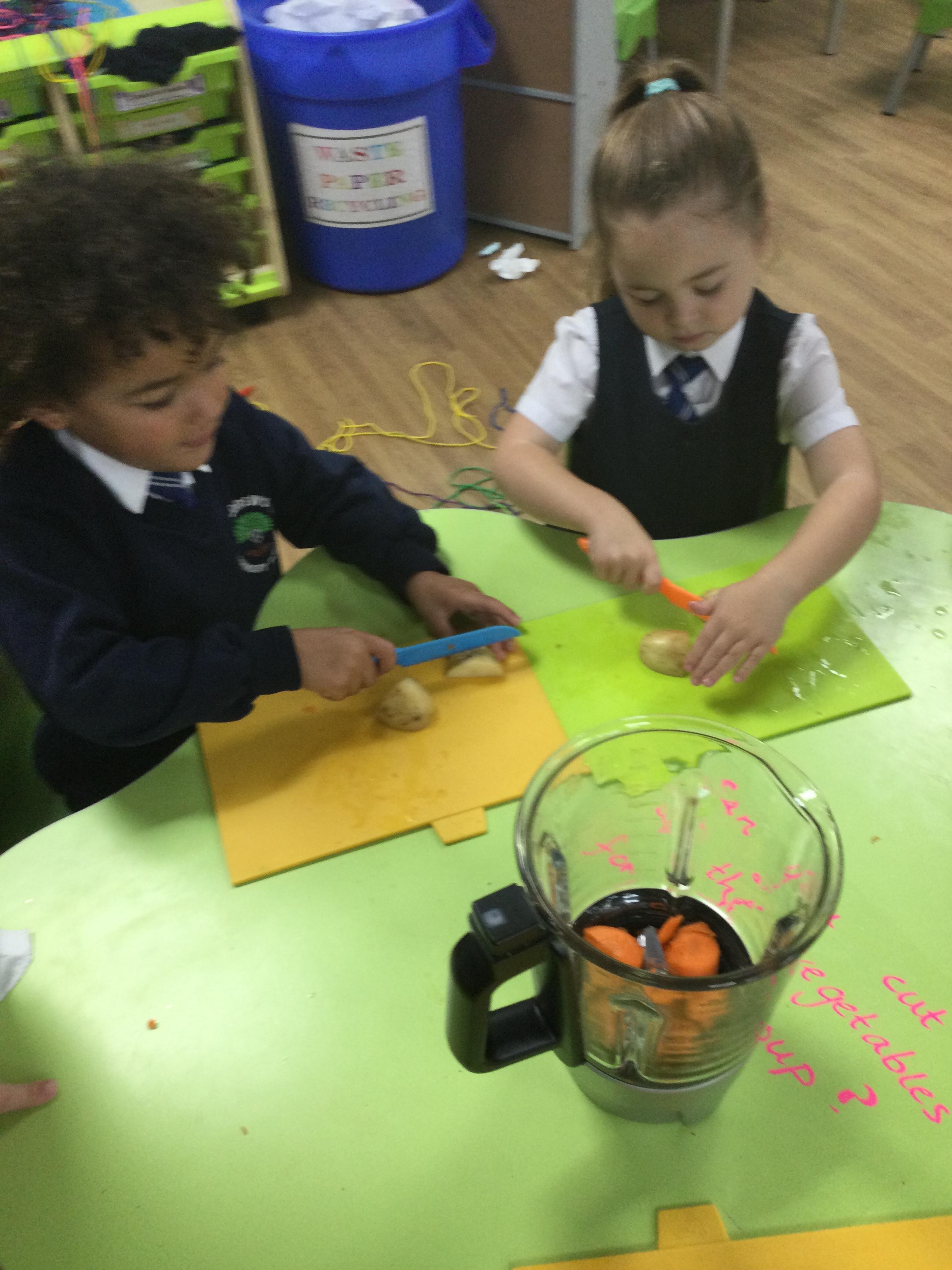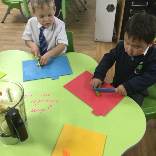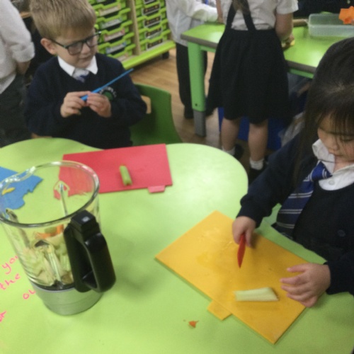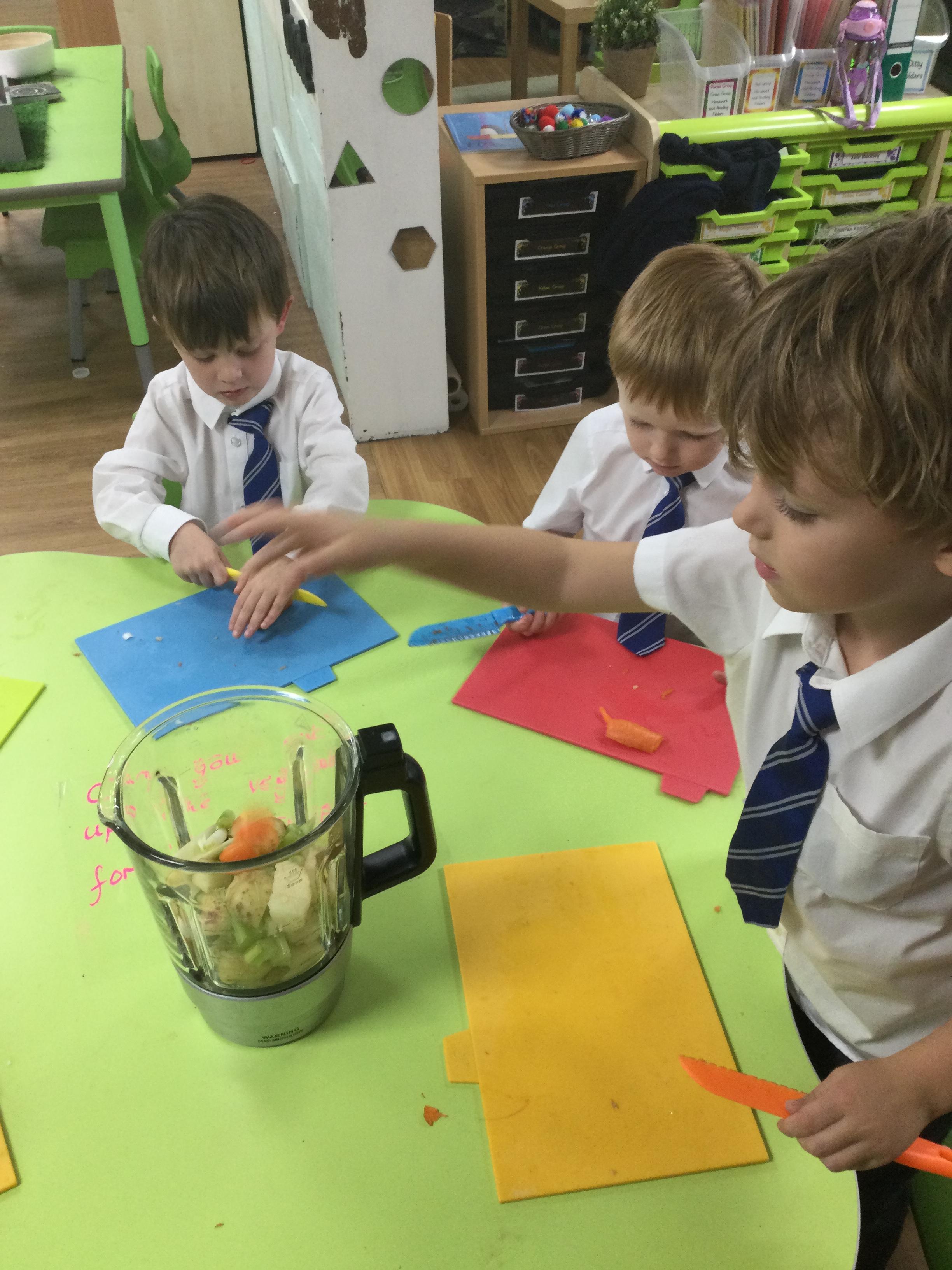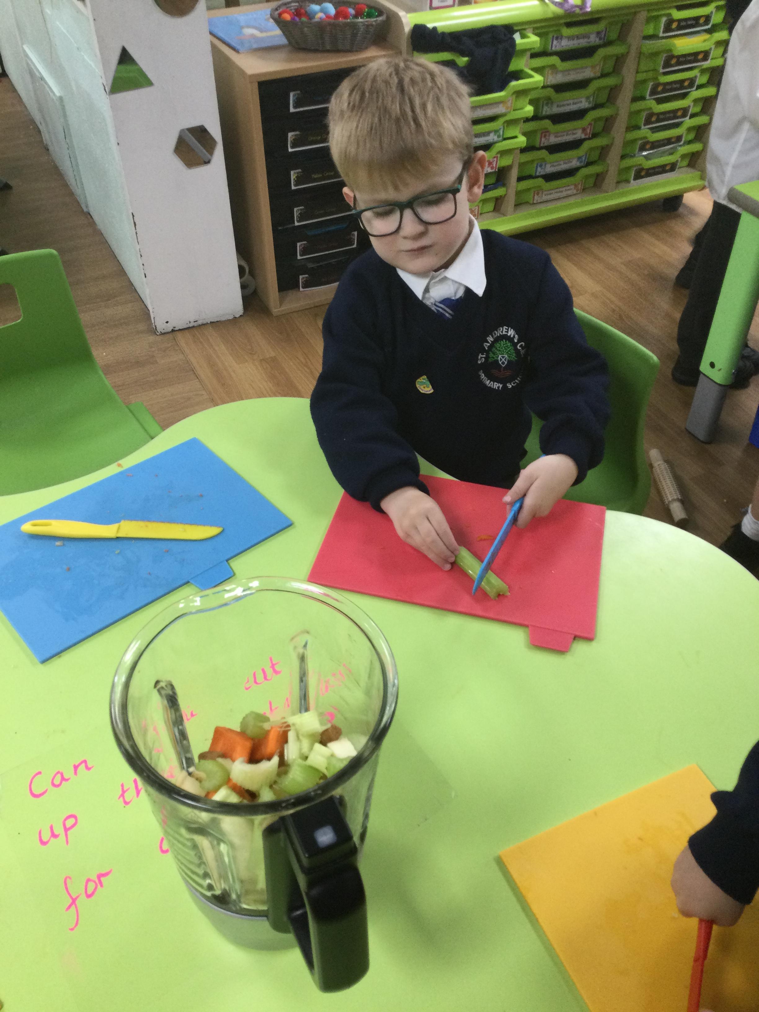 Then we talked about how we could make vegetable soup and decided to make some. We knew it was important to wash our hands before we started and then we began cutting the vegetables, very carefully, and placing them in the soup maker. Miss Bailey then put the soup maker on in the staff room and waited for our soup to cool down before we tried it.