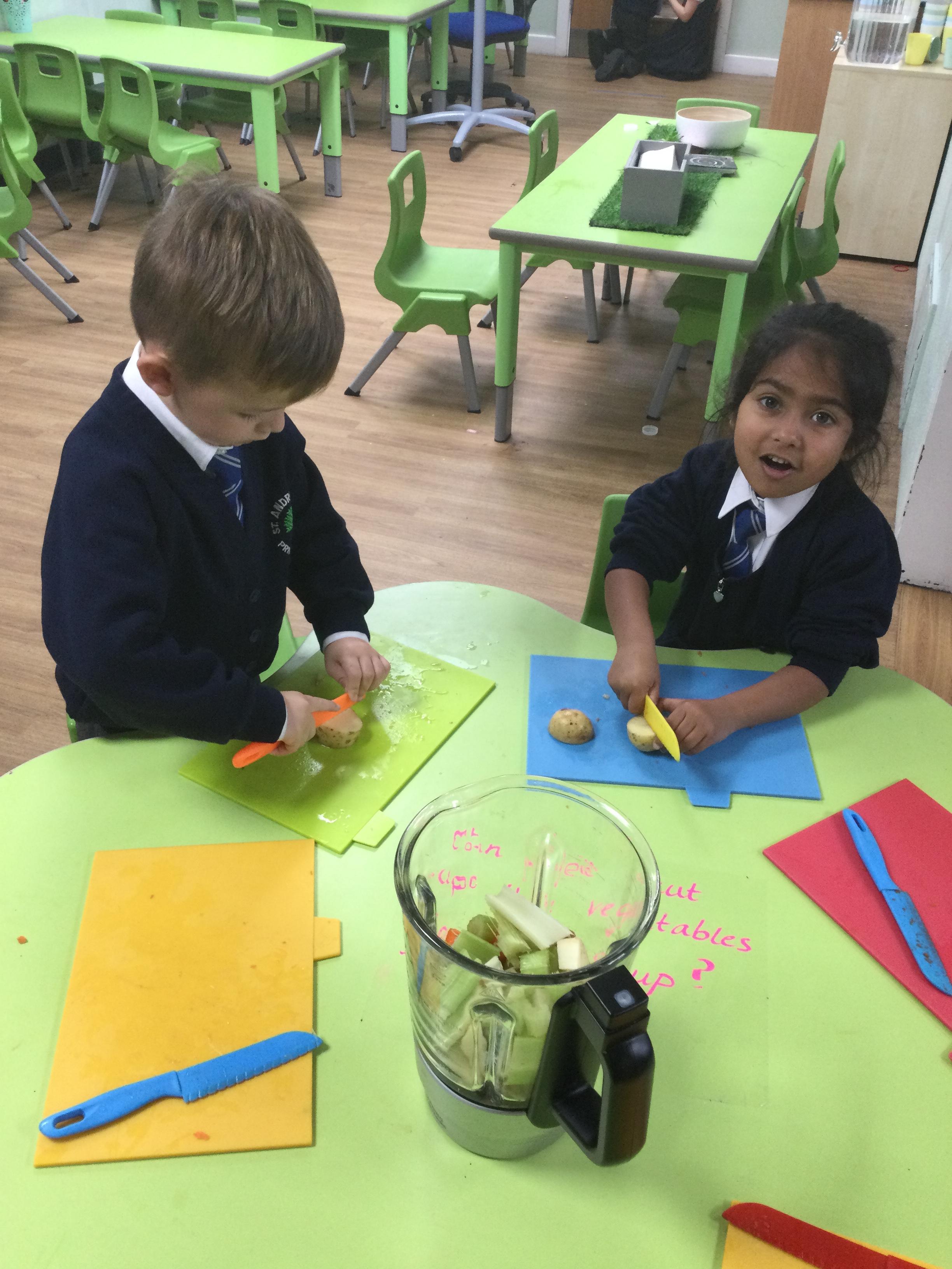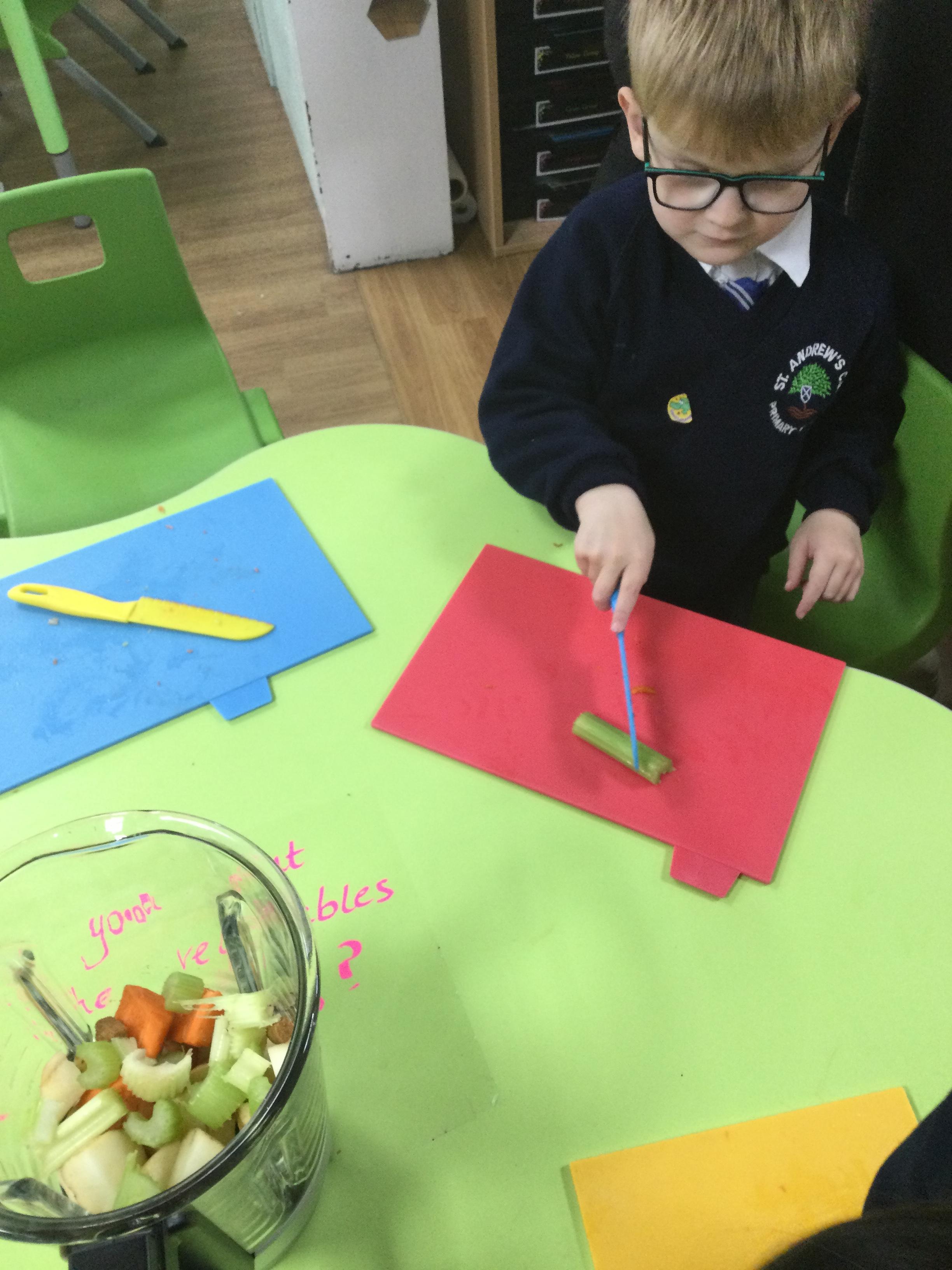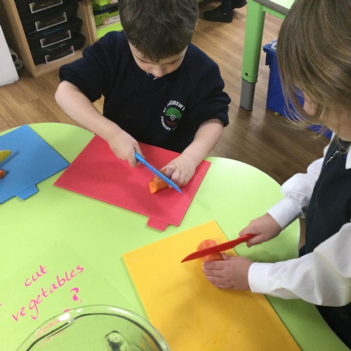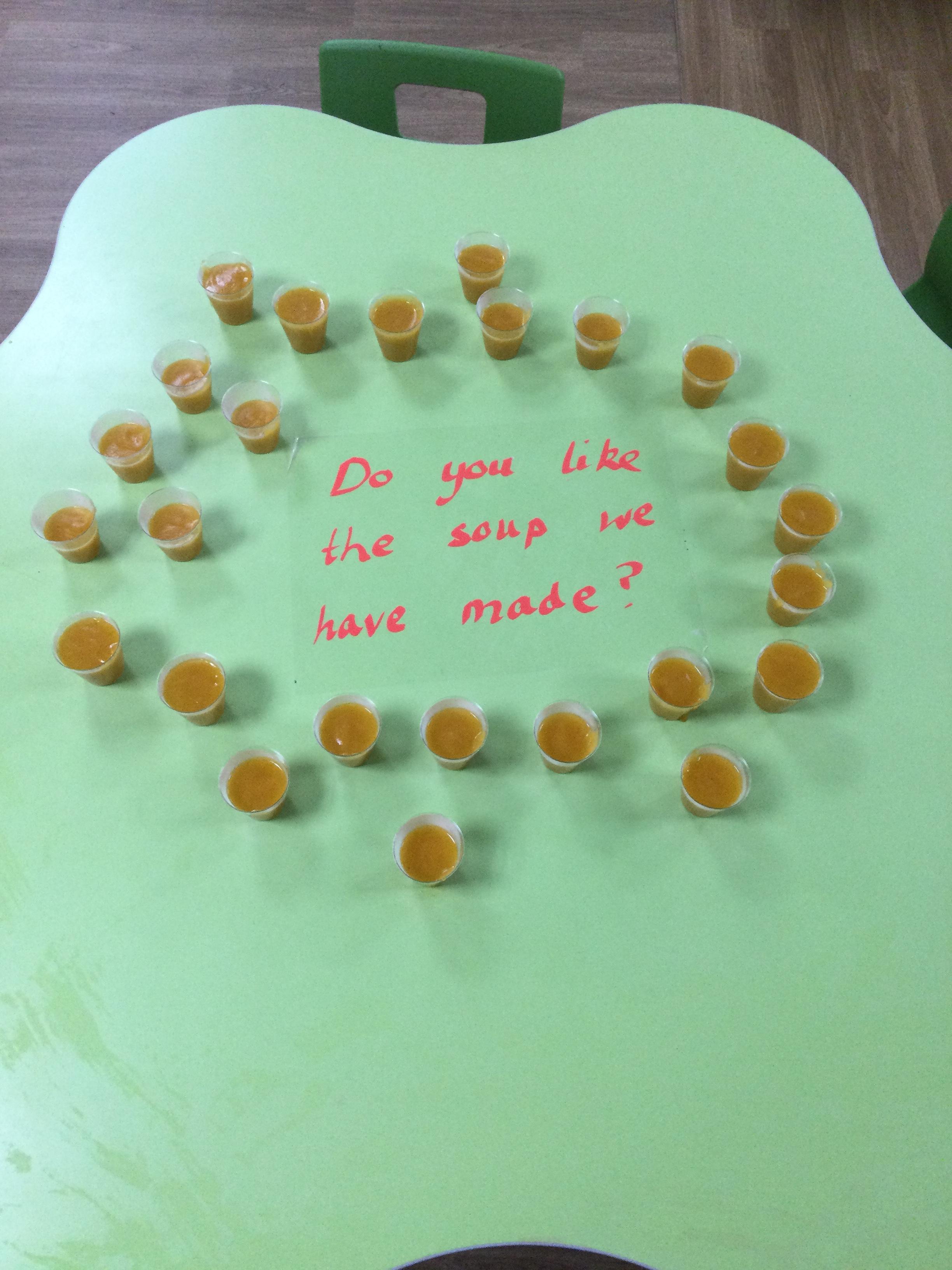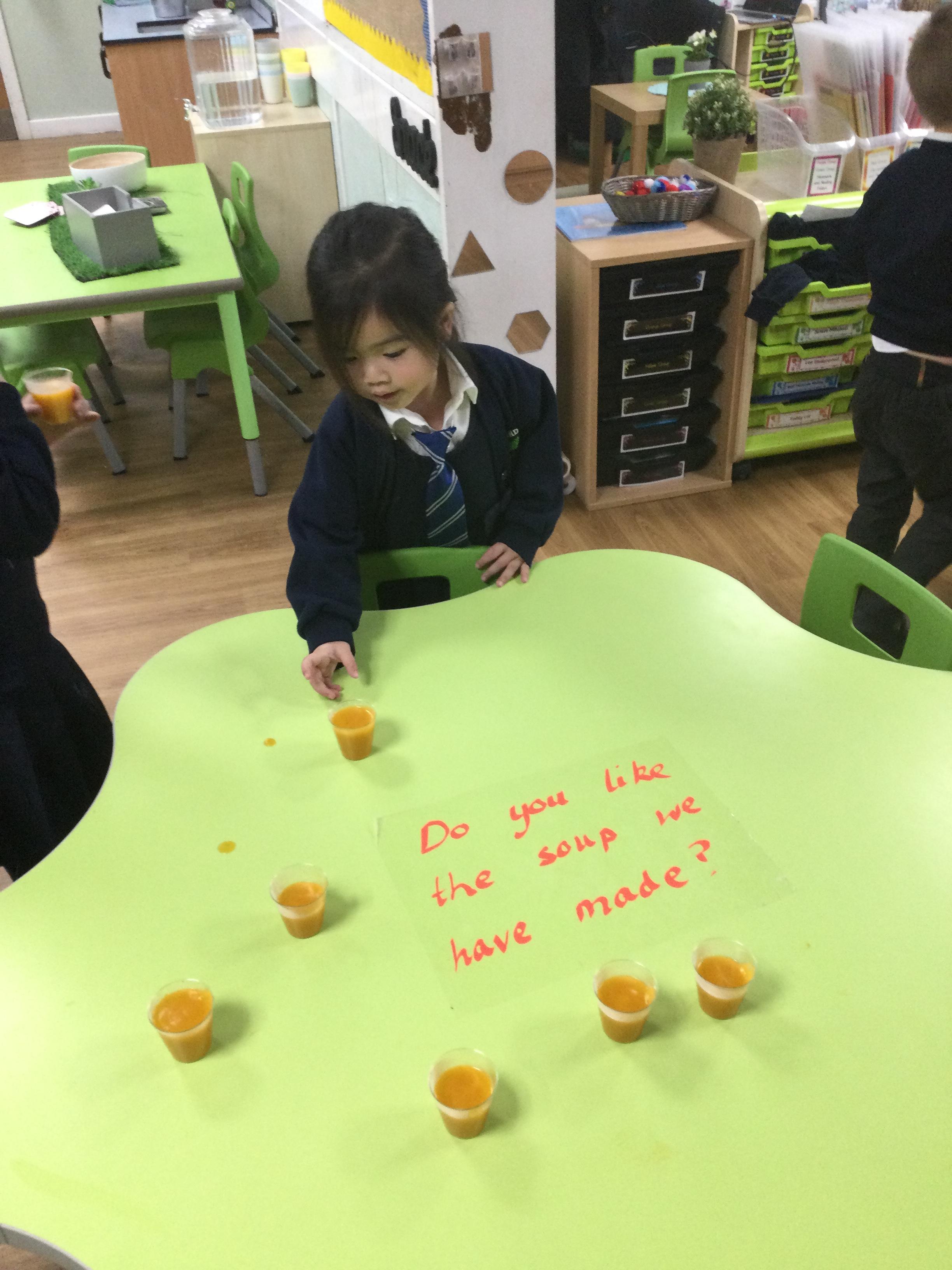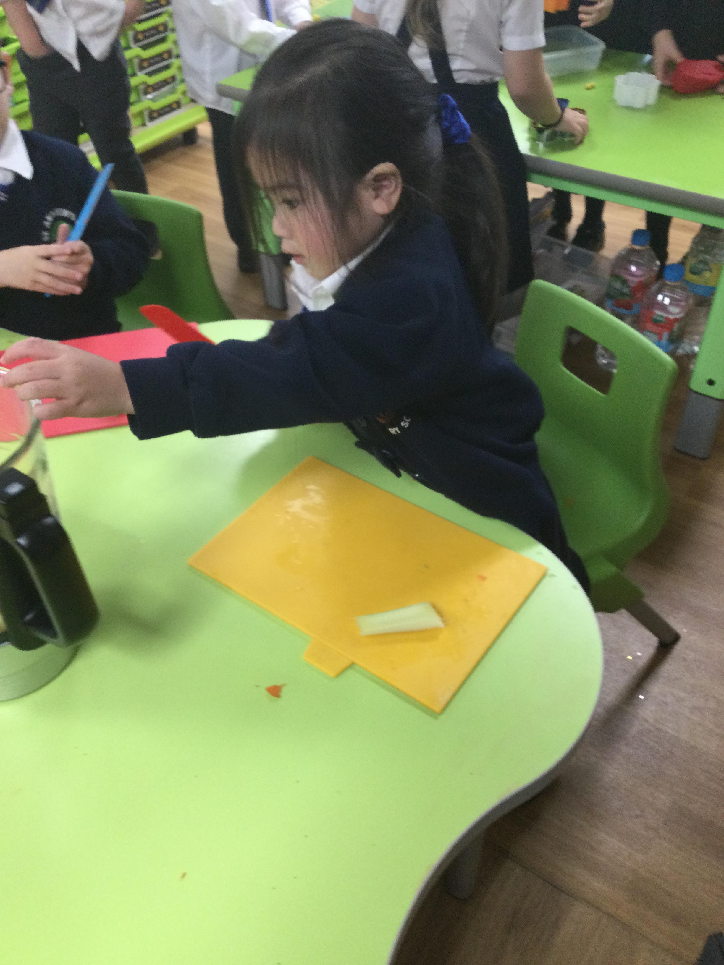 Then we talked about how we could make vegetable soup and decided to make some. We knew it was important to wash our hands before we started and then we began cutting the vegetables, very carefully, and placing them in the soup maker. Miss Bailey then put the soup maker on in the staff room and waited for our soup to cool down before we tried it.