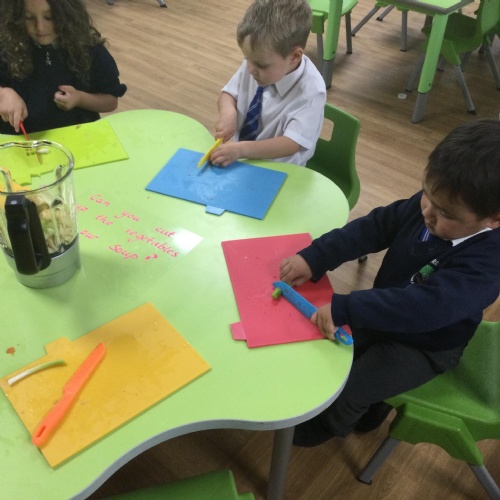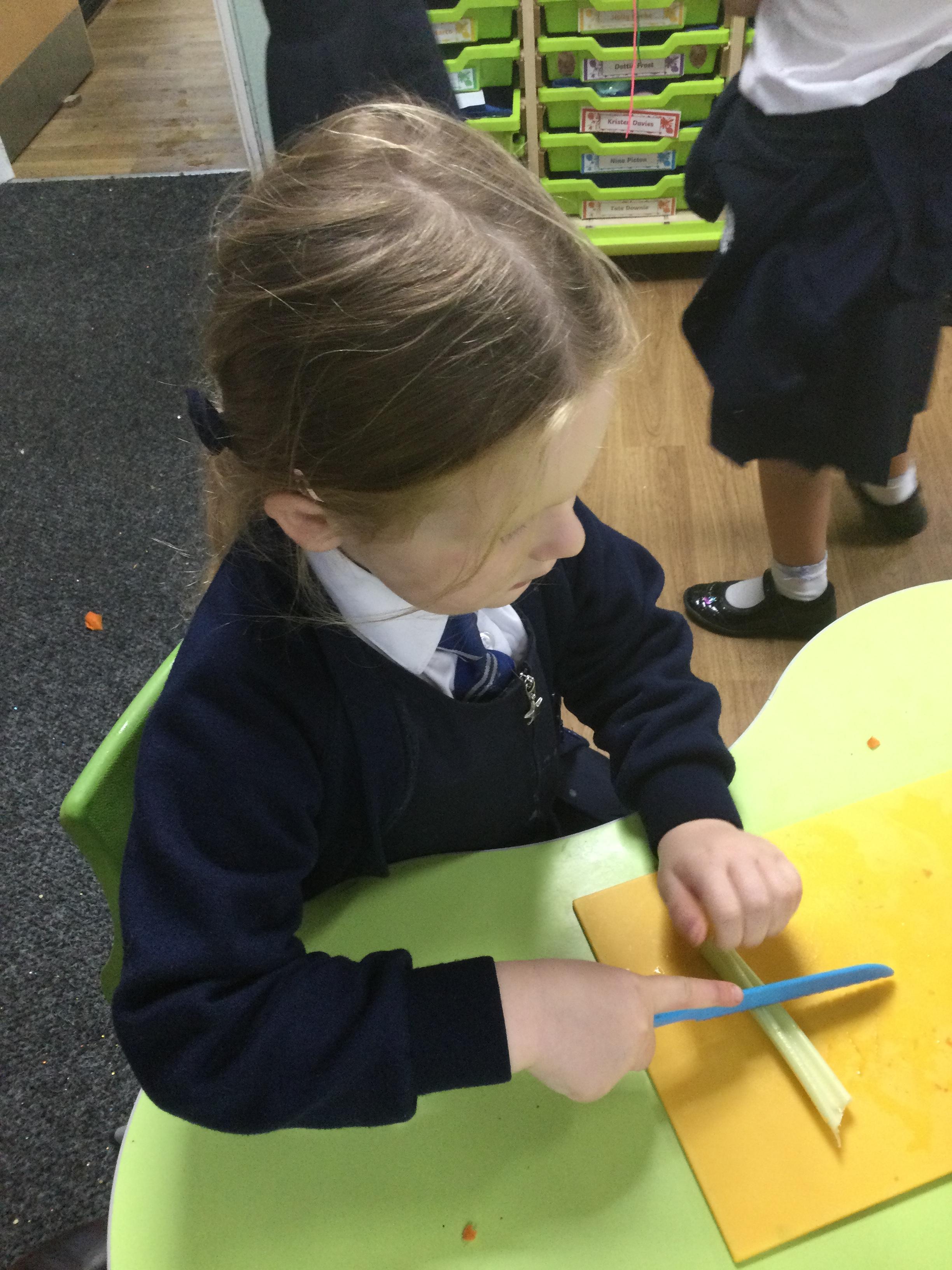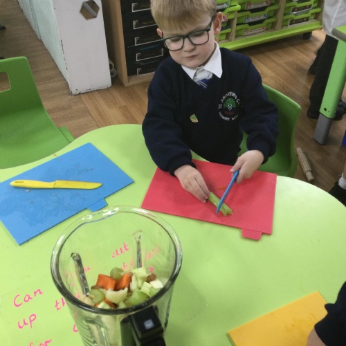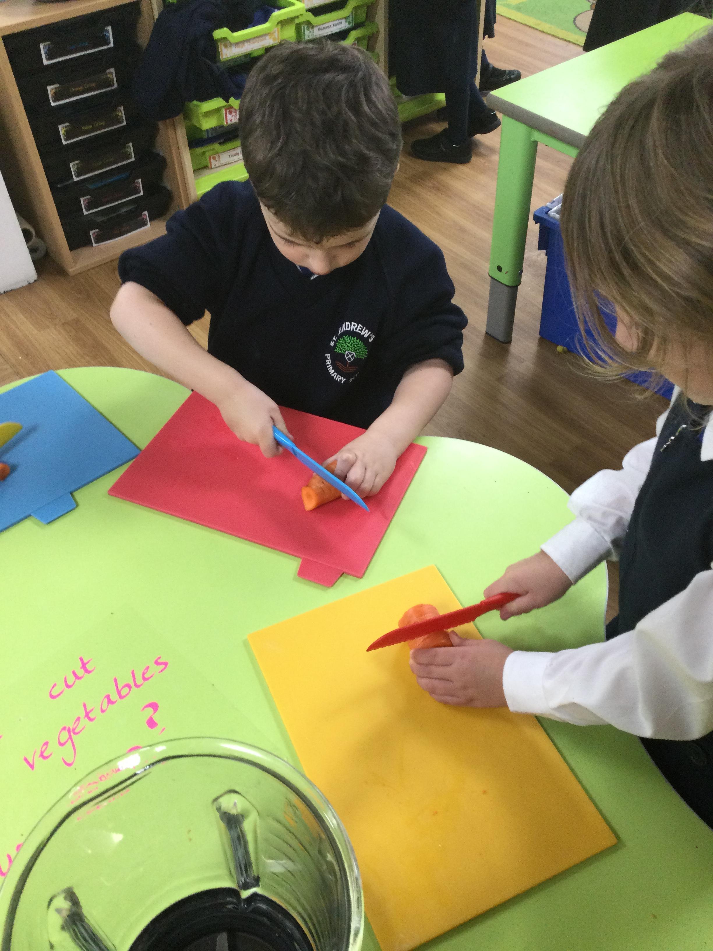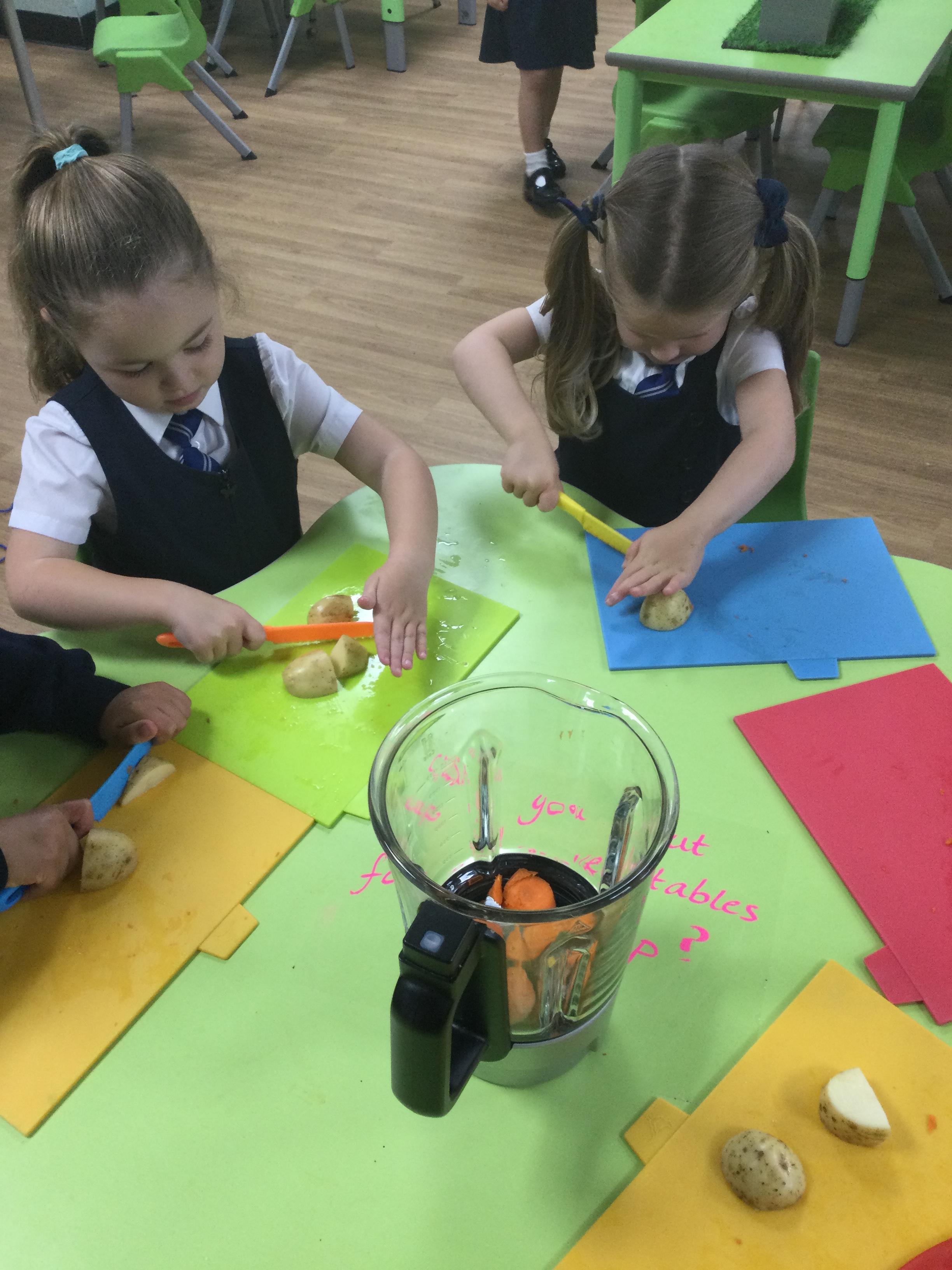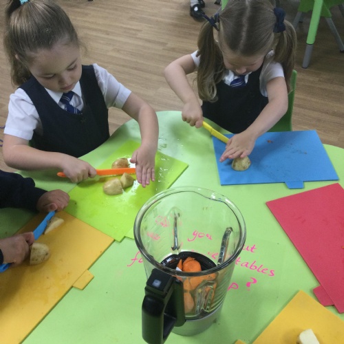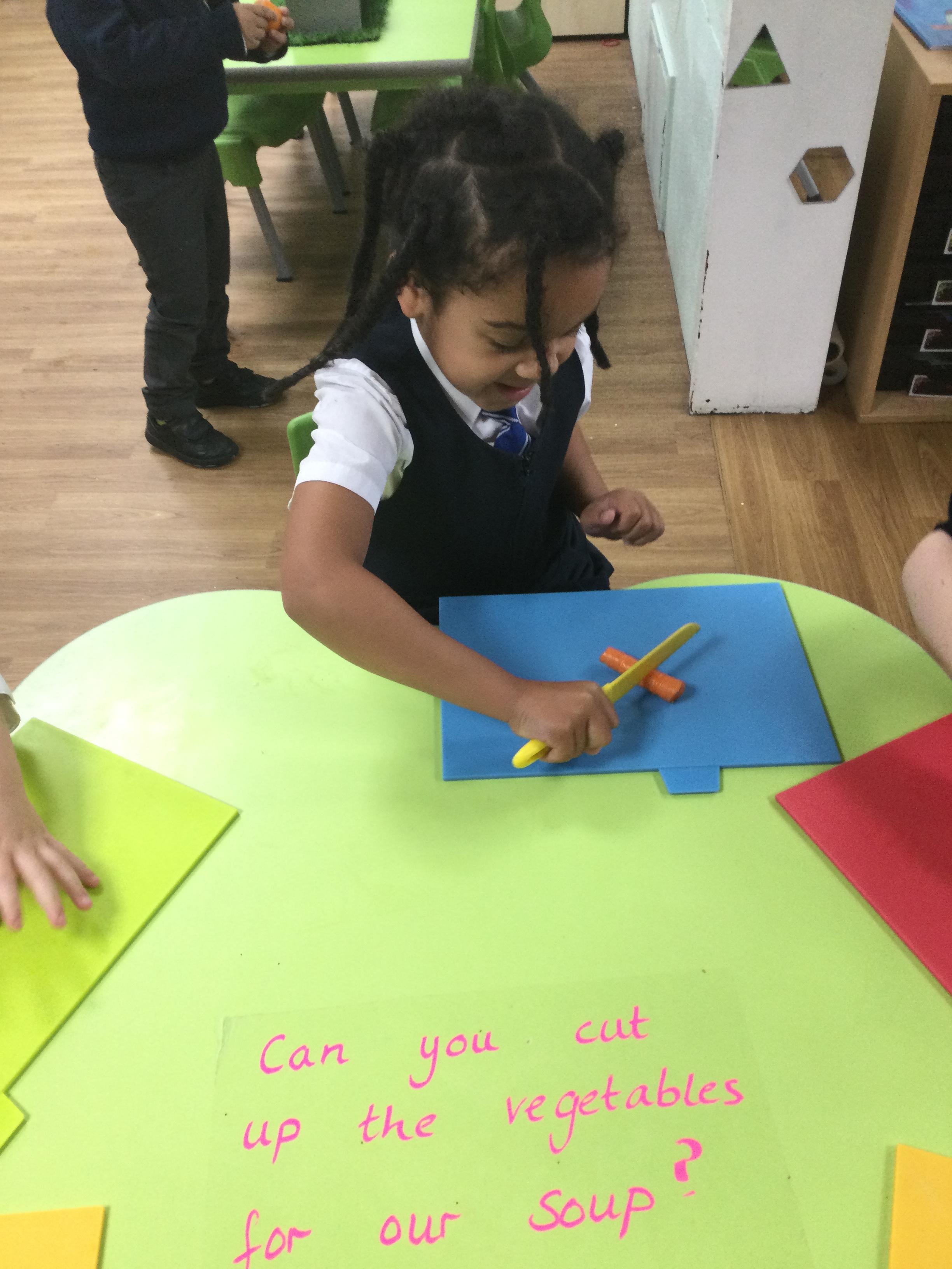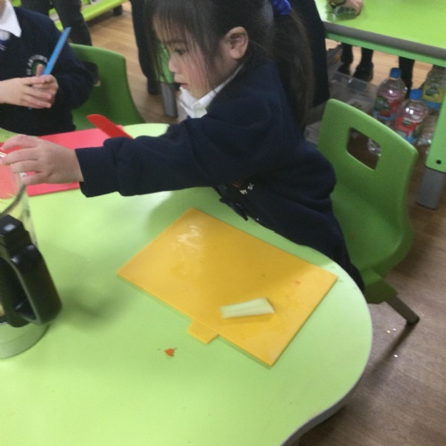 Then we talked about how we could make vegetable soup and decided to make some. We knew it was important to wash our hands before we started and then we began cutting the vegetables, very carefully, and placing them in the soup maker. Miss Bailey then put the soup maker on in the staff room and waited for our soup to cool down before we tried it.