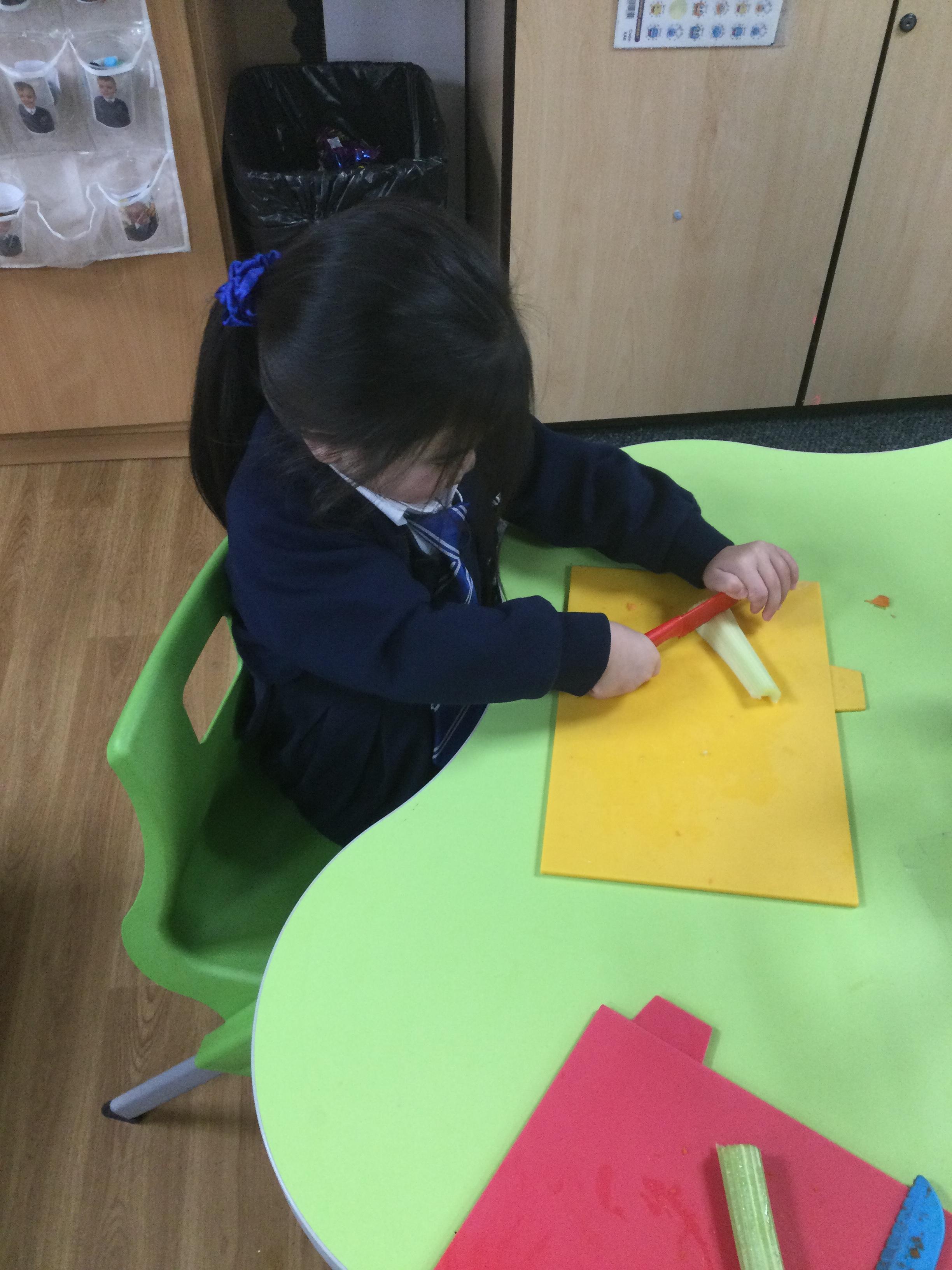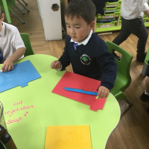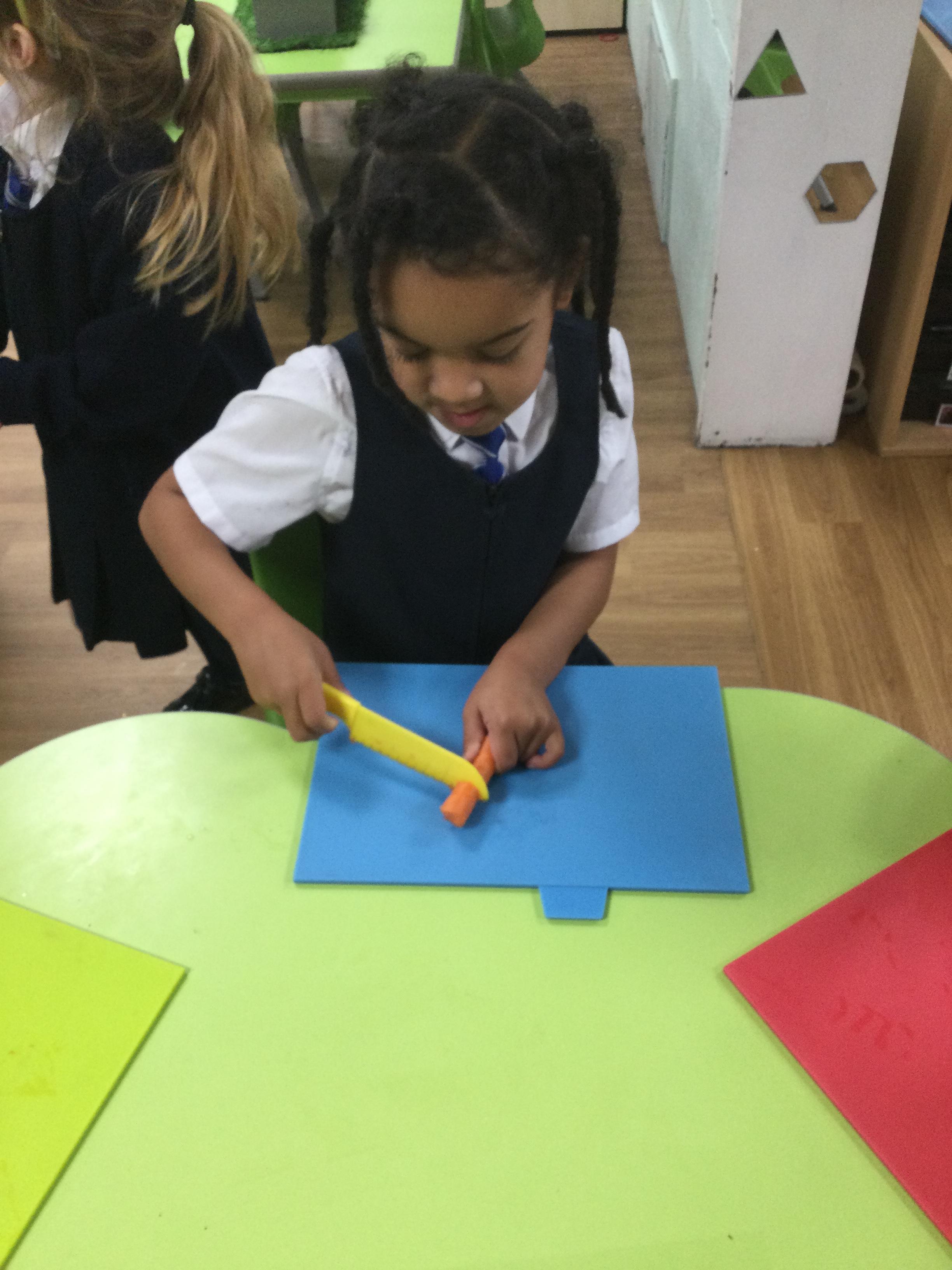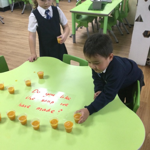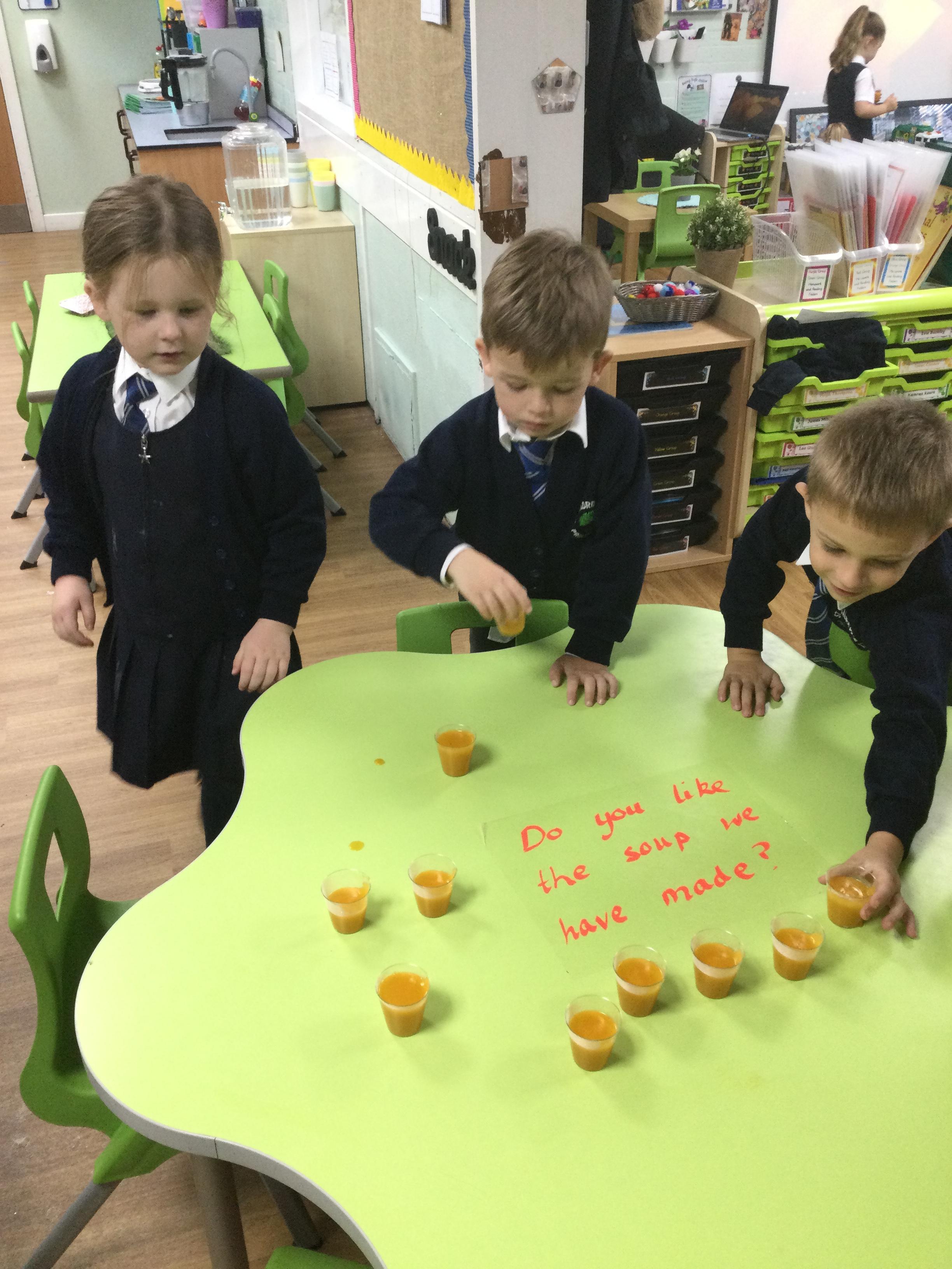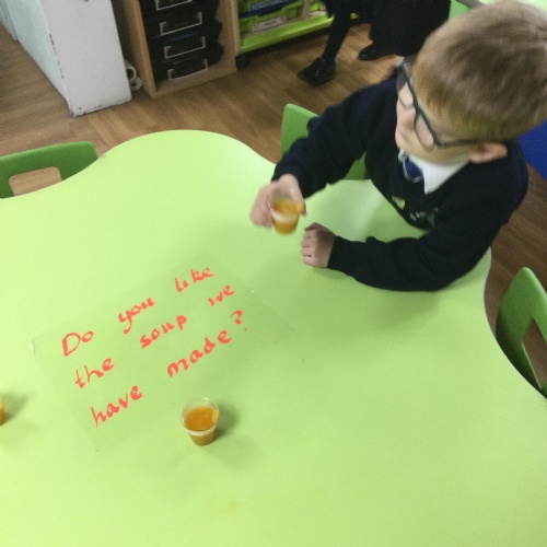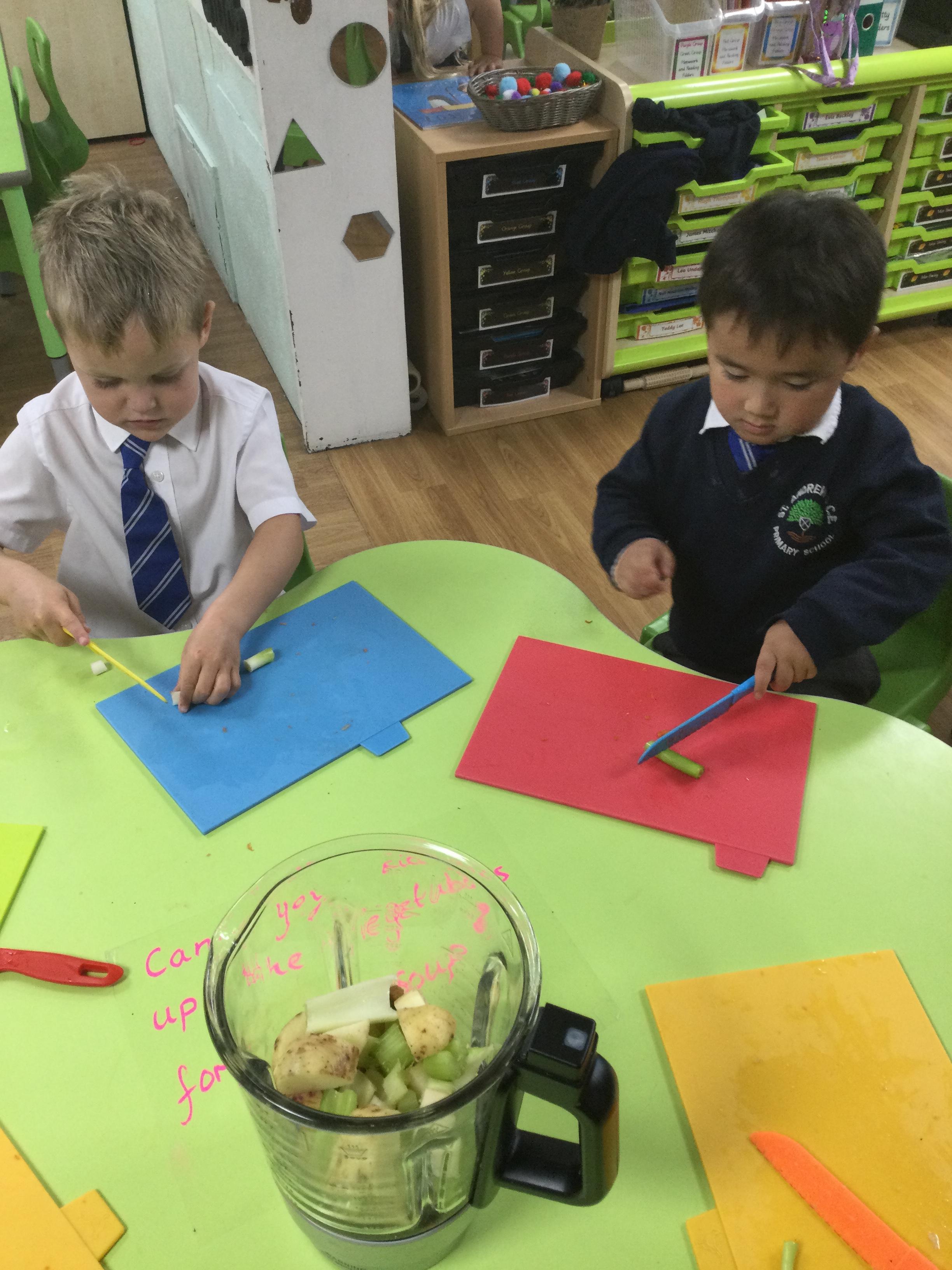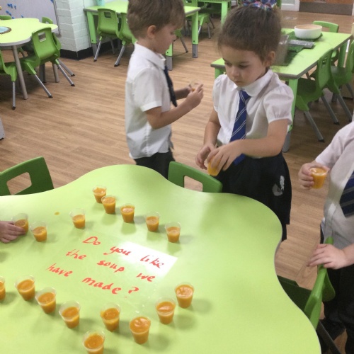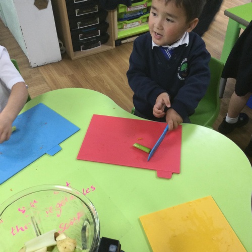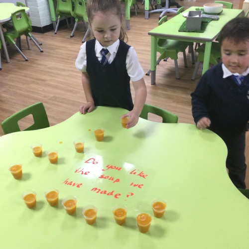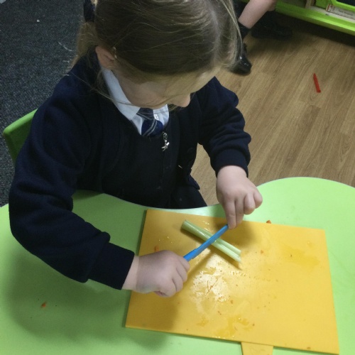 Then we talked about how we could make vegetable soup and decided to make some. We knew it was important to wash our hands before we started and then we began cutting the vegetables, very carefully, and placing them in the soup maker. Miss Bailey then put the soup maker on in the staff room and waited for our soup to cool down before we tried it.