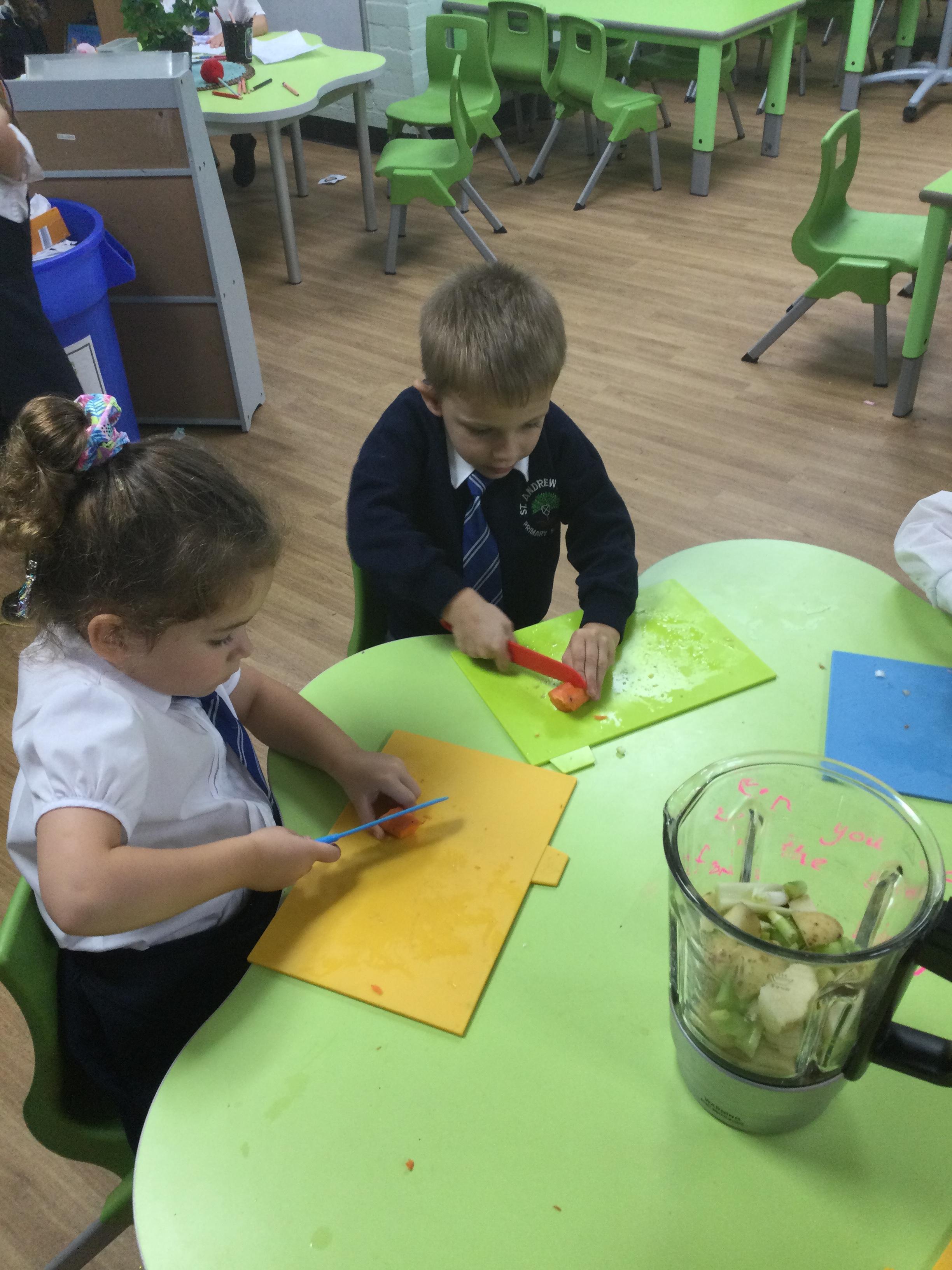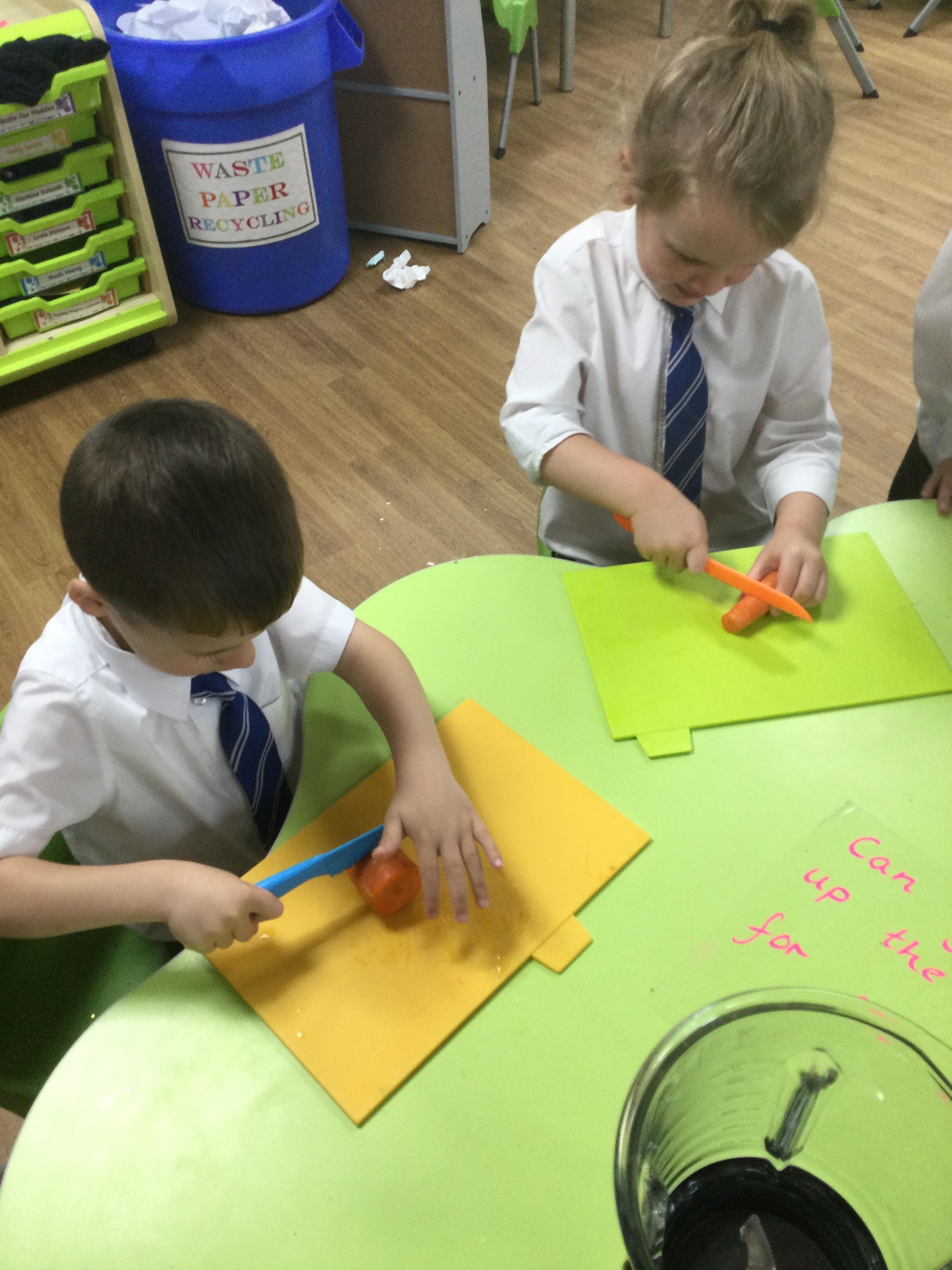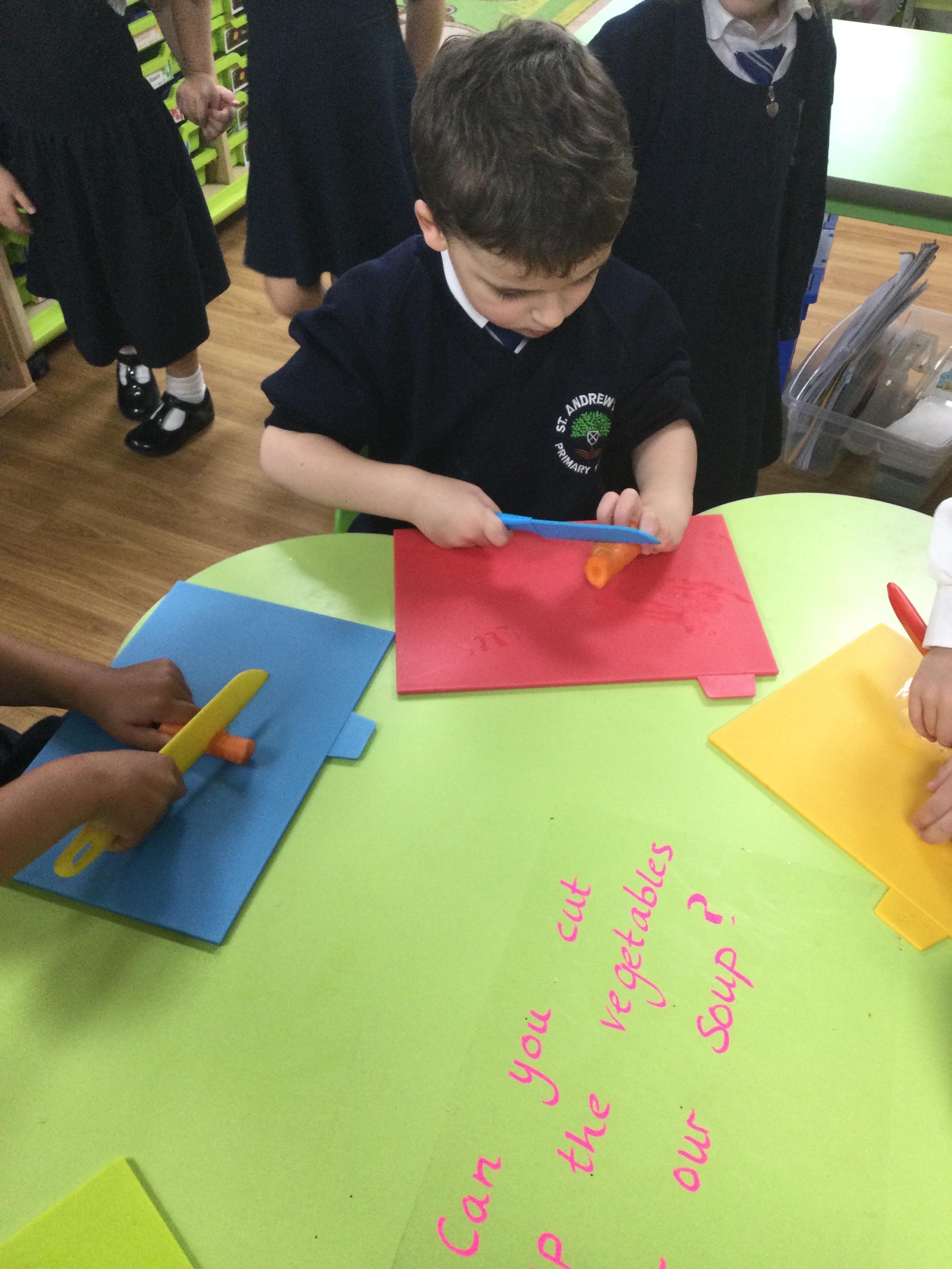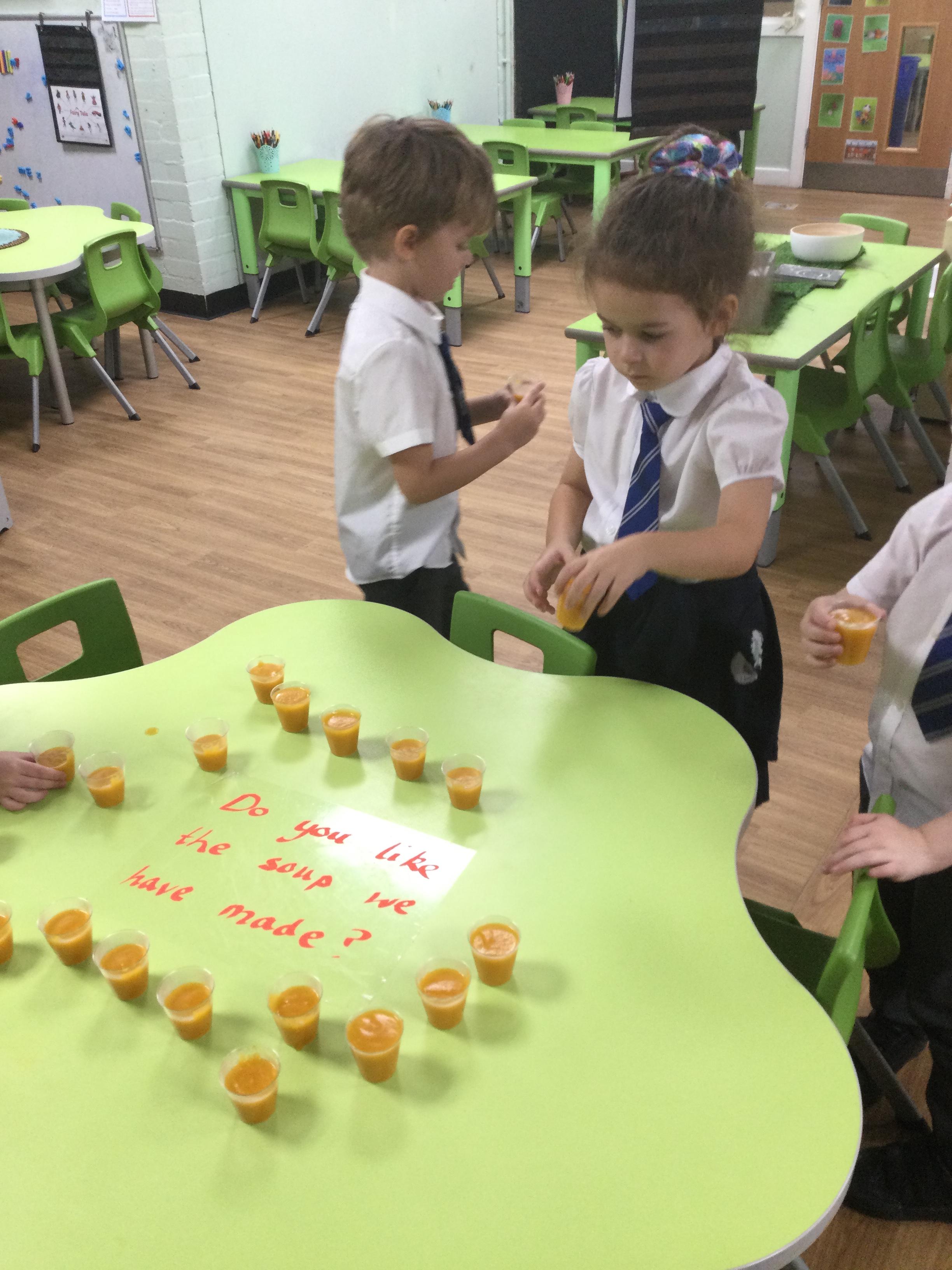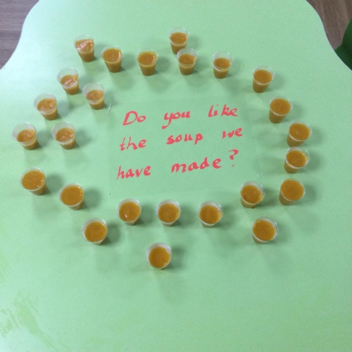 Then we talked about how we could make vegetable soup and decided to make some. We knew it was important to wash our hands before we started and then we began cutting the vegetables, very carefully, and placing them in the soup maker. Miss Bailey then put the soup maker on in the staff room and waited for our soup to cool down before we tried it.