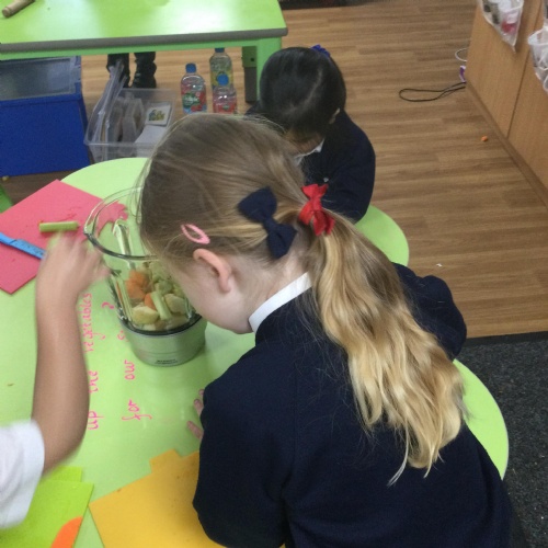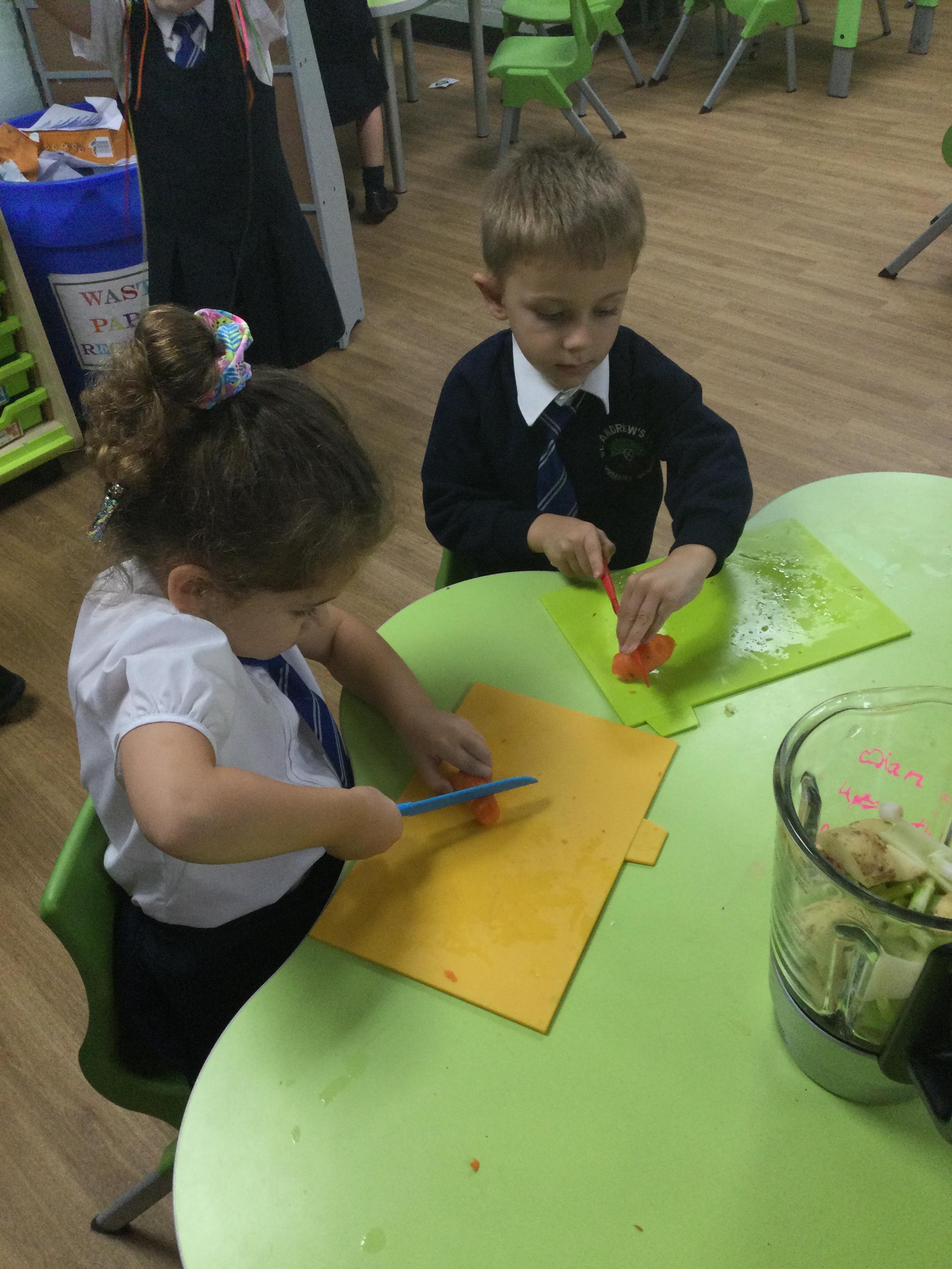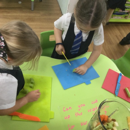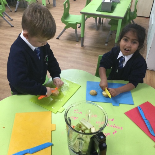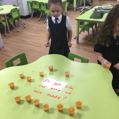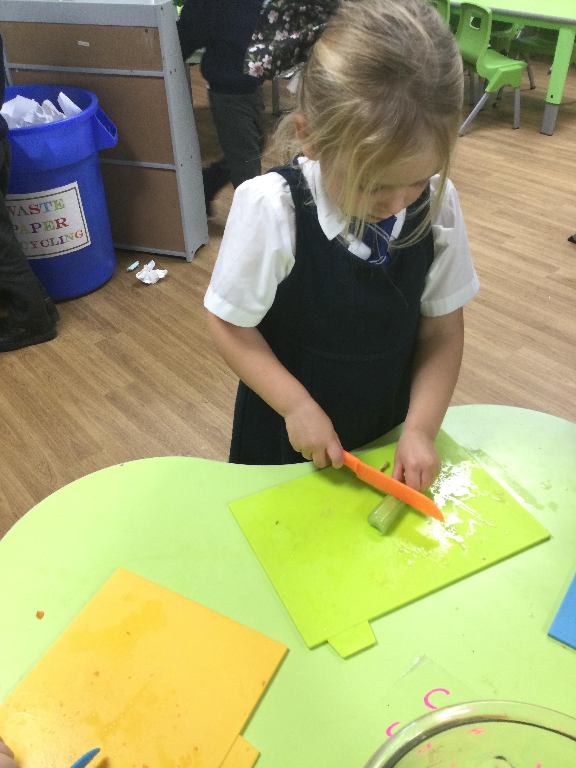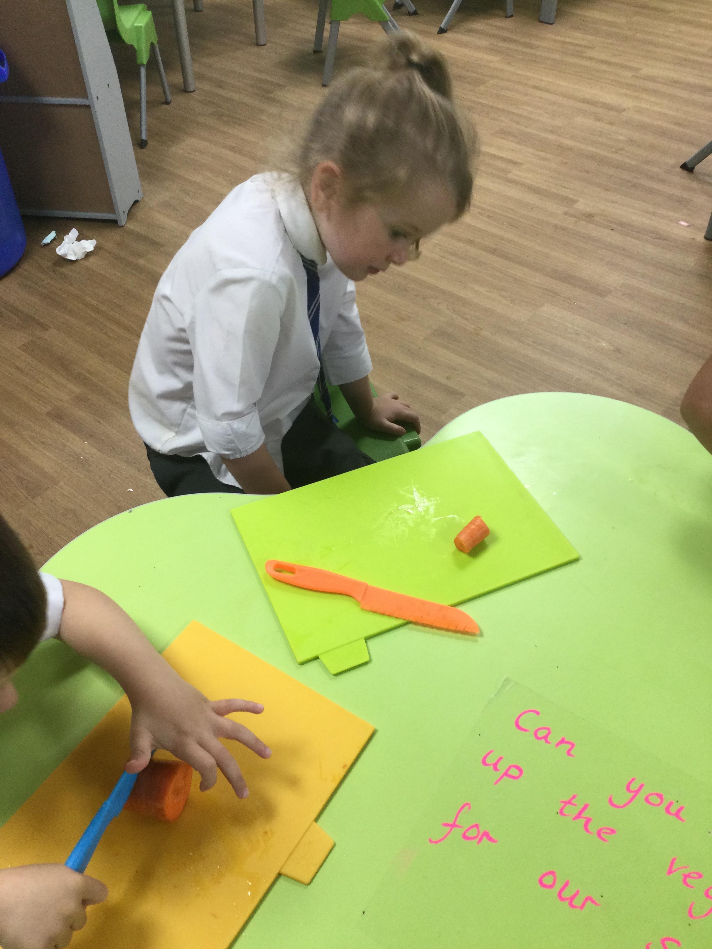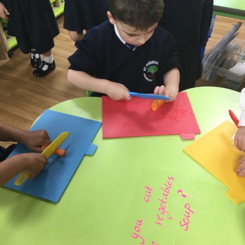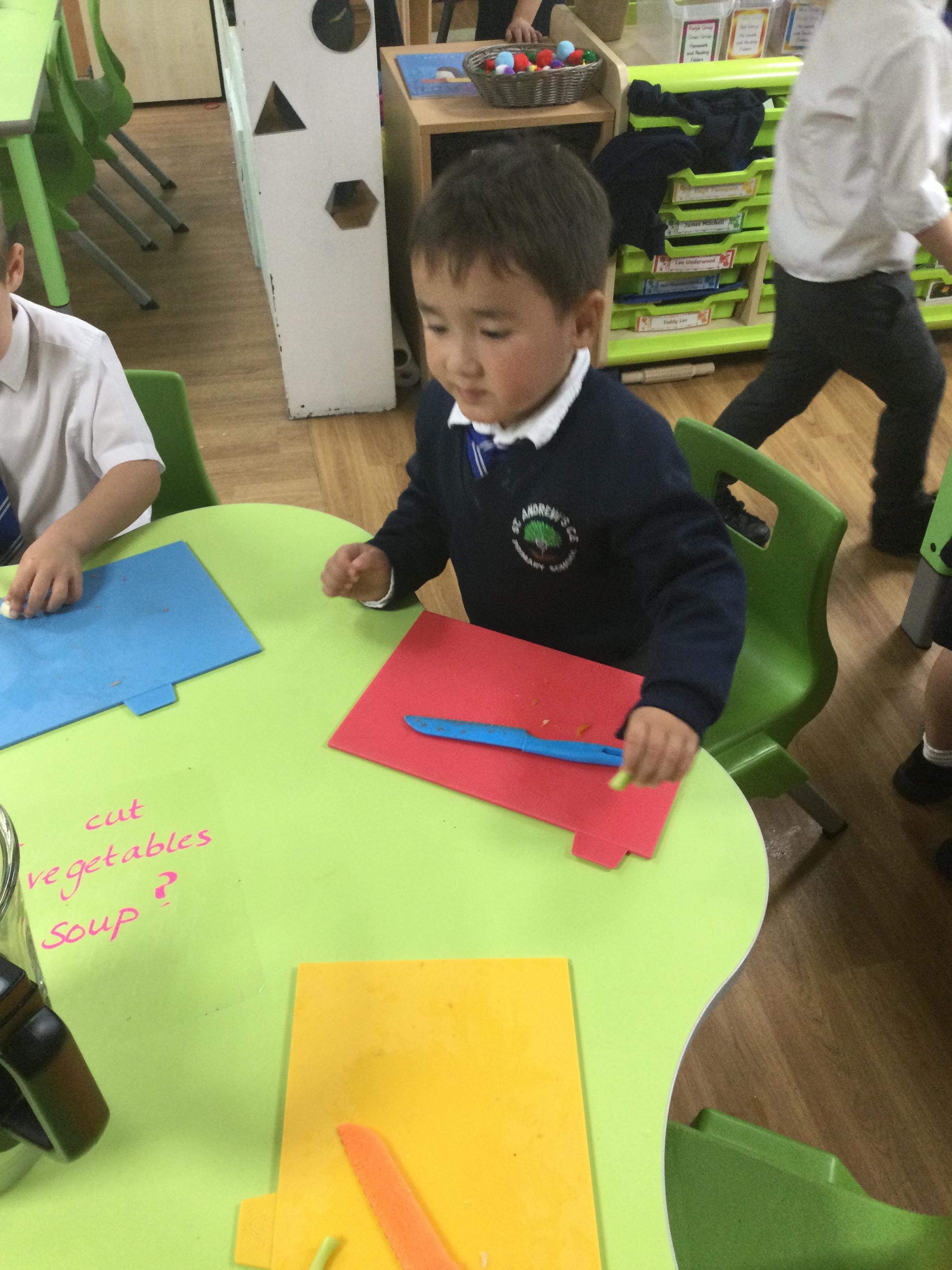 Then we talked about how we could make vegetable soup and decided to make some. We knew it was important to wash our hands before we started and then we began cutting the vegetables, very carefully, and placing them in the soup maker. Miss Bailey then put the soup maker on in the staff room and waited for our soup to cool down before we tried it.