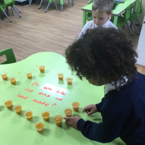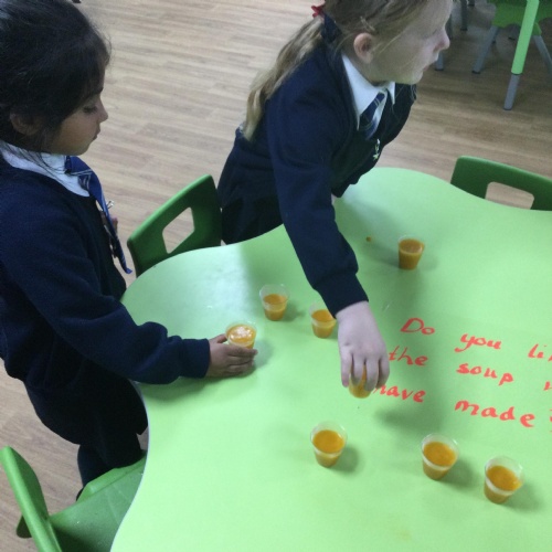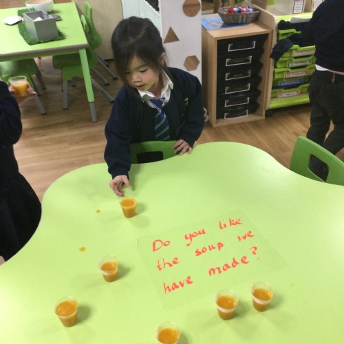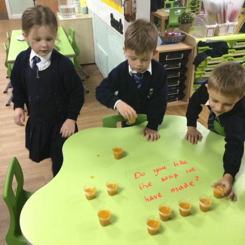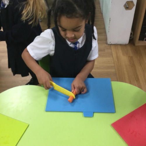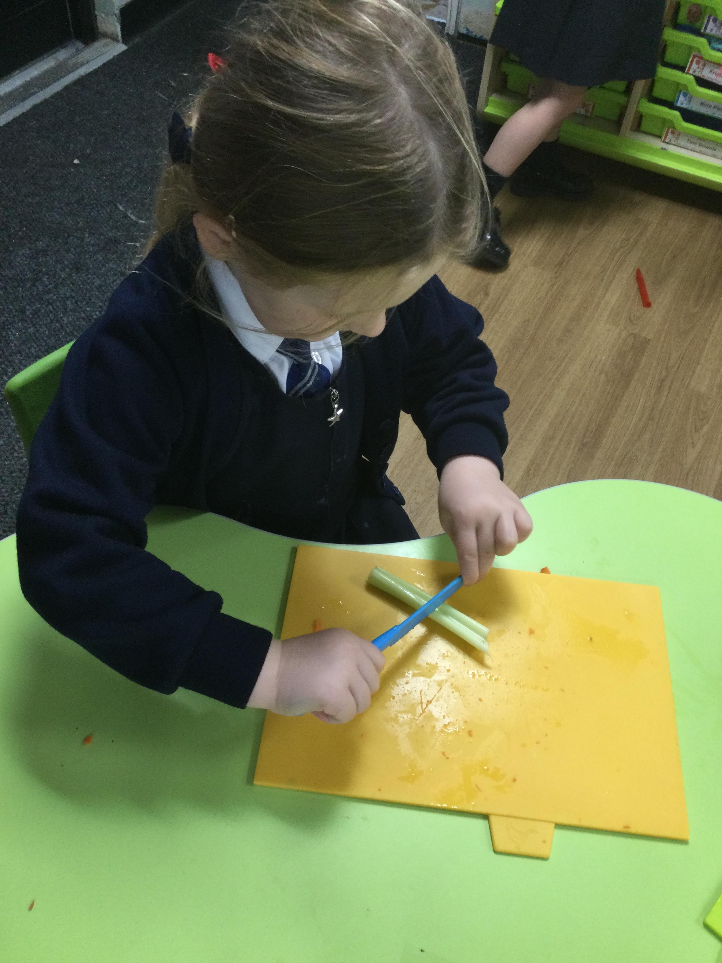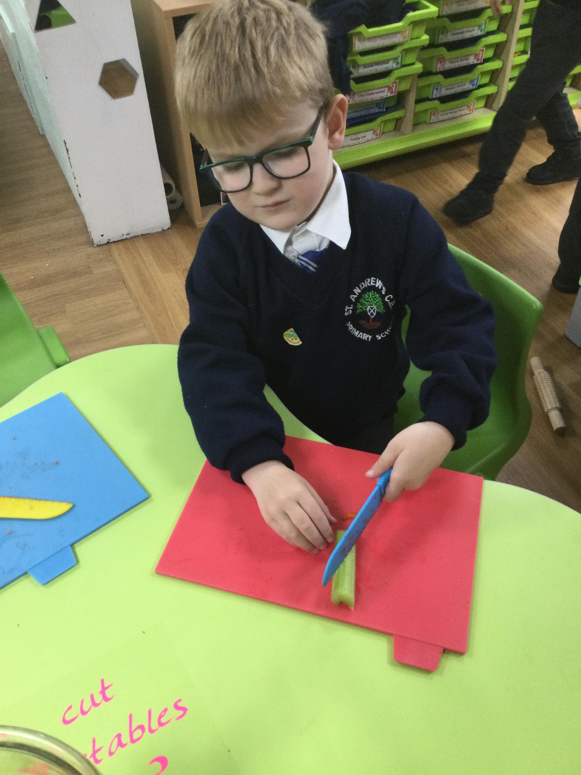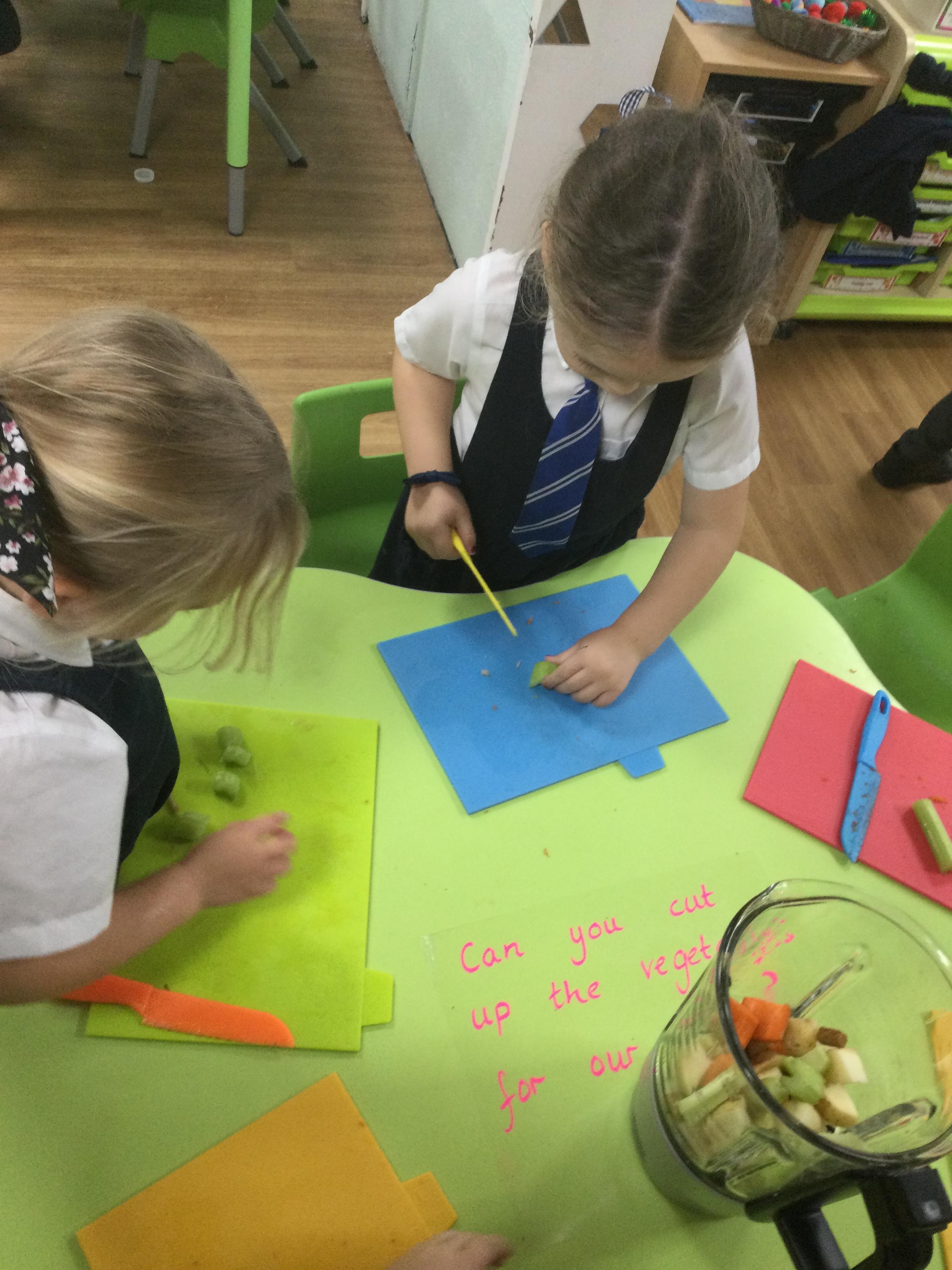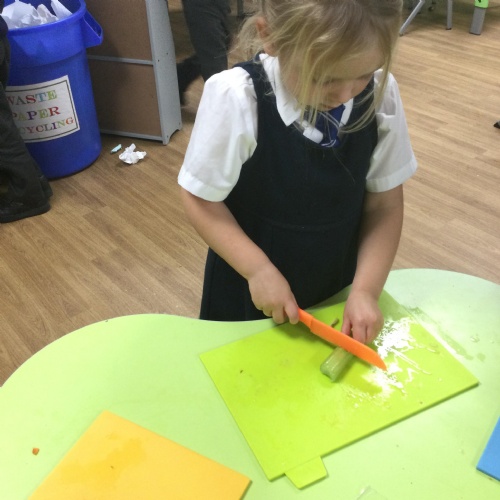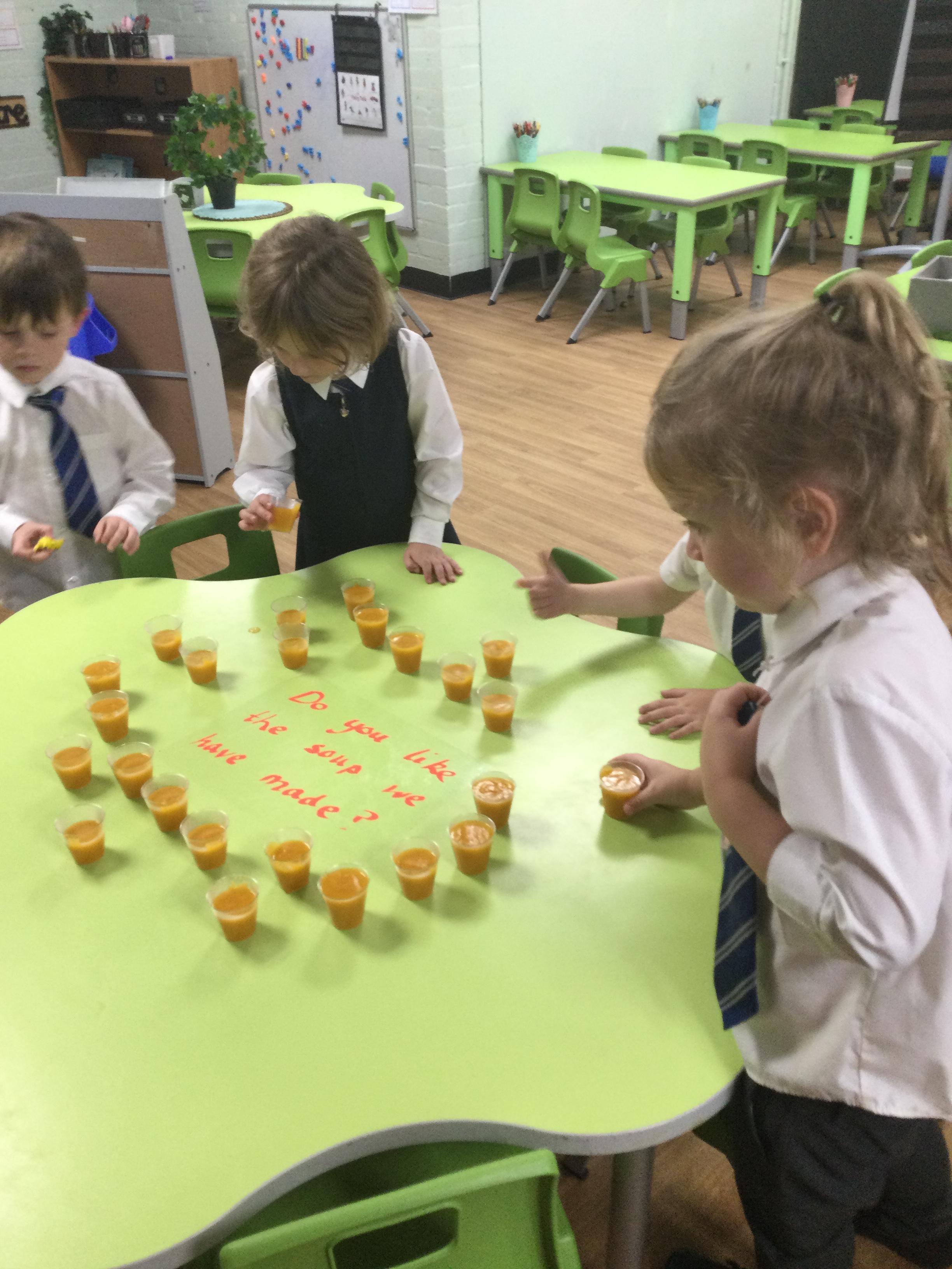 Then we talked about how we could make vegetable soup and decided to make some. We knew it was important to wash our hands before we started and then we began cutting the vegetables, very carefully, and placing them in the soup maker. Miss Bailey then put the soup maker on in the staff room and waited for our soup to cool down before we tried it.