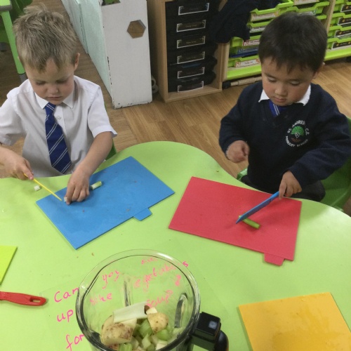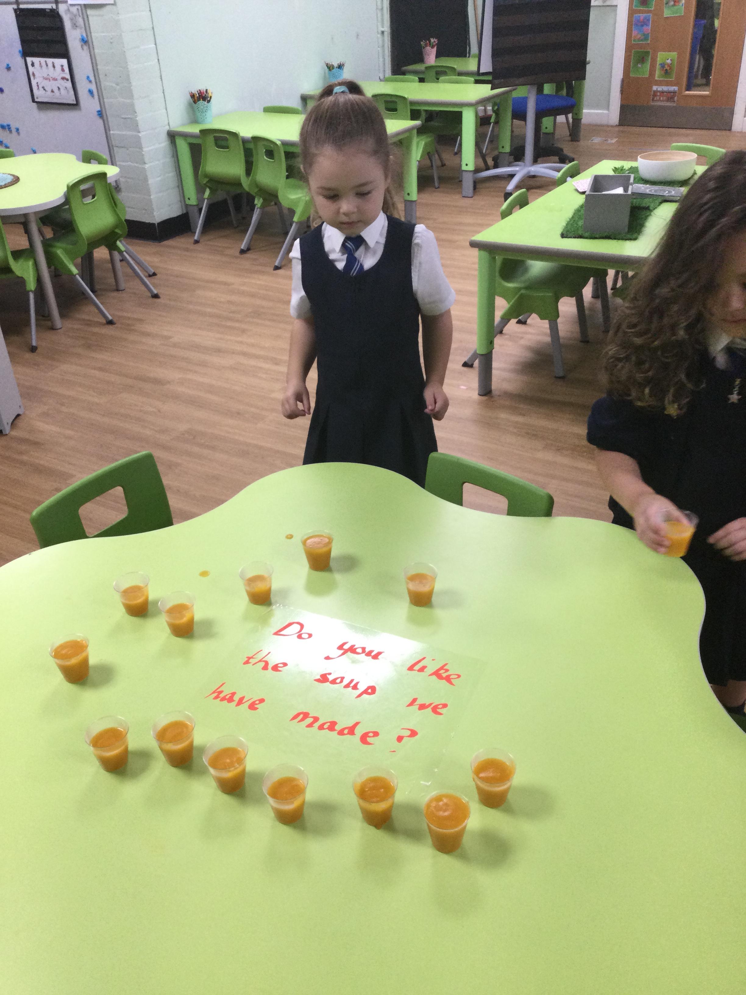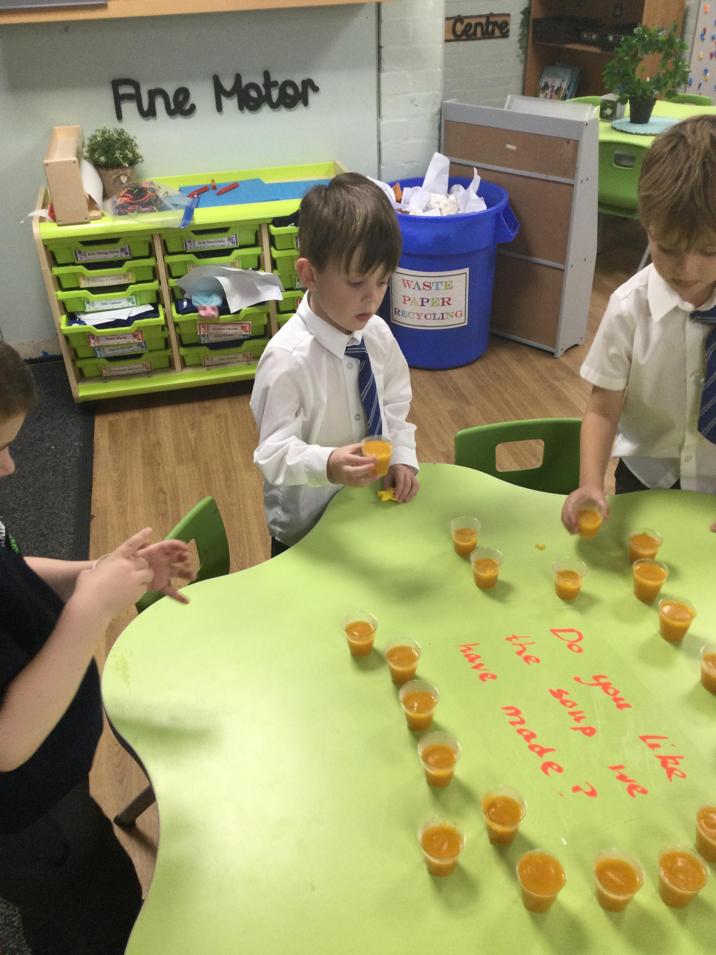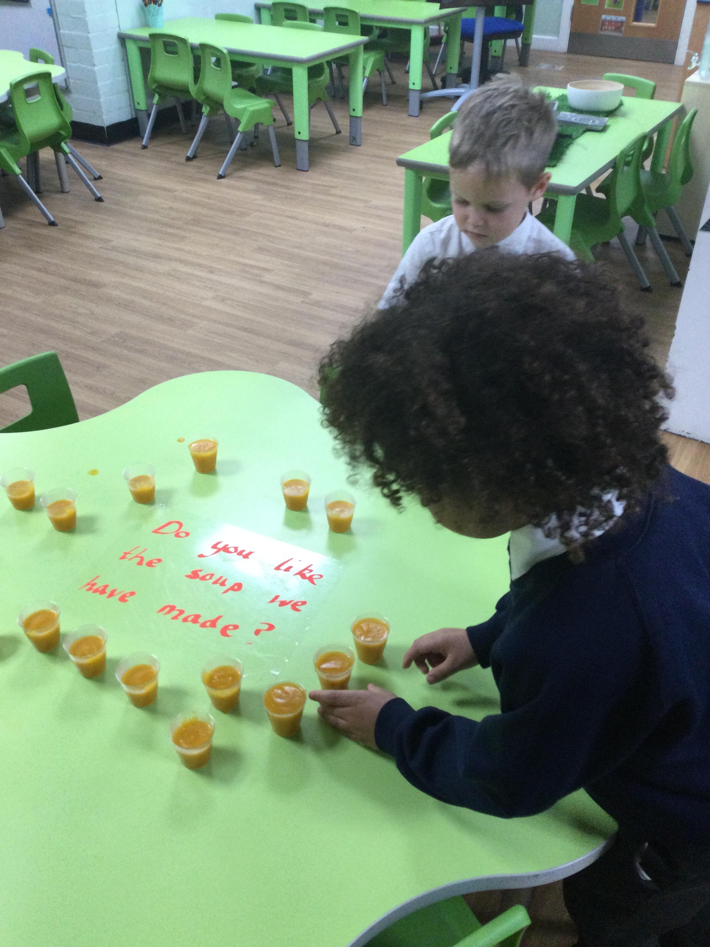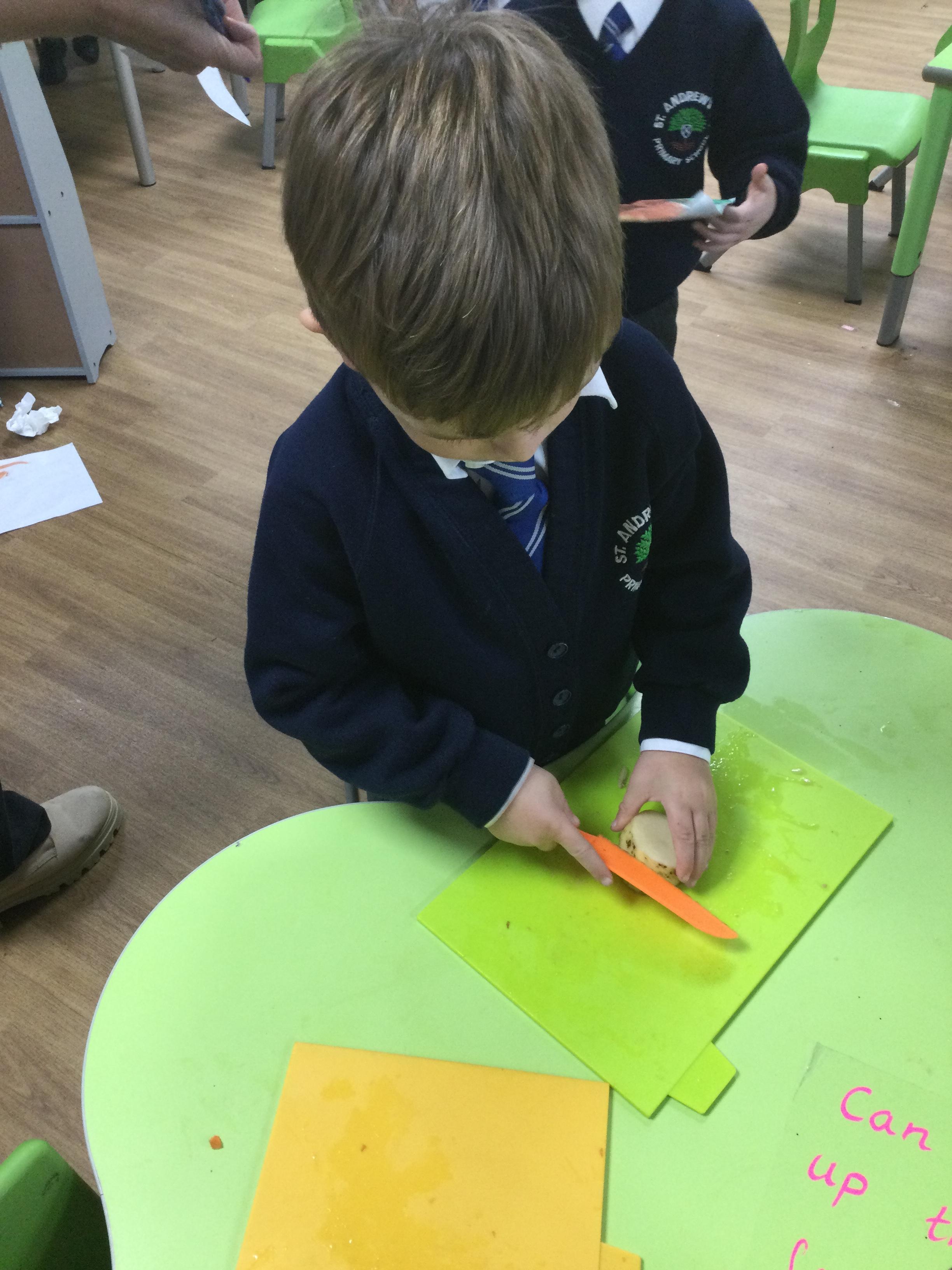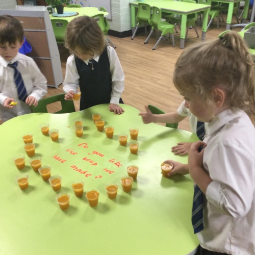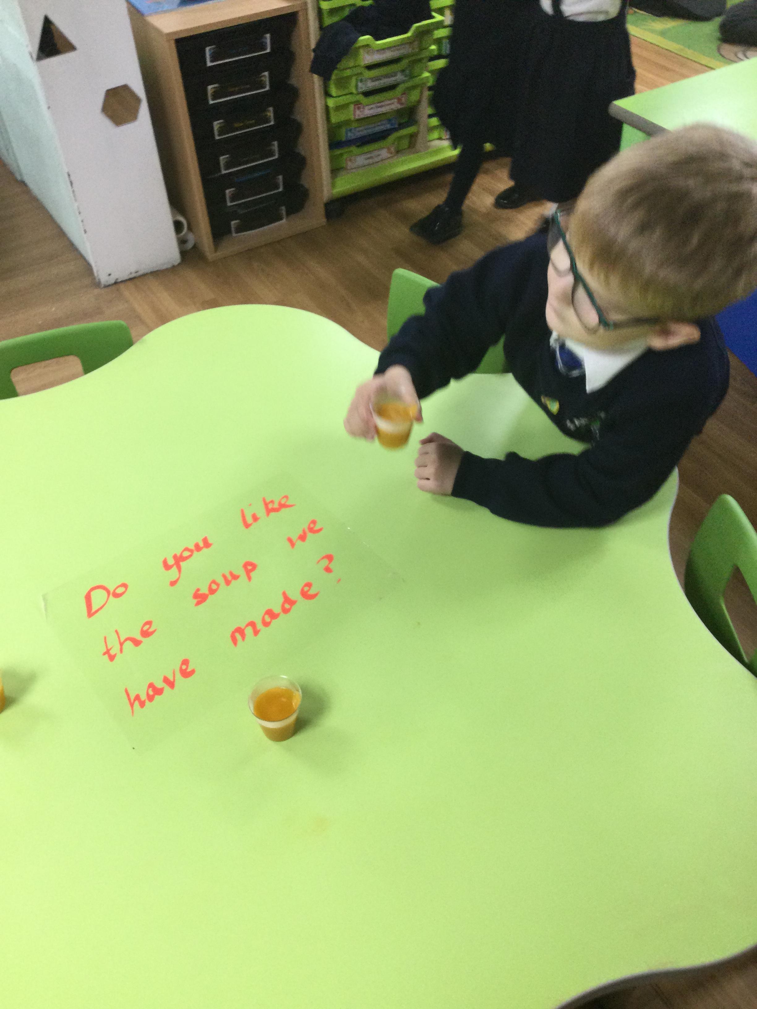 Then we talked about how we could make vegetable soup and decided to make some. We knew it was important to wash our hands before we started and then we began cutting the vegetables, very carefully, and placing them in the soup maker. Miss Bailey then put the soup maker on in the staff room and waited for our soup to cool down before we tried it.