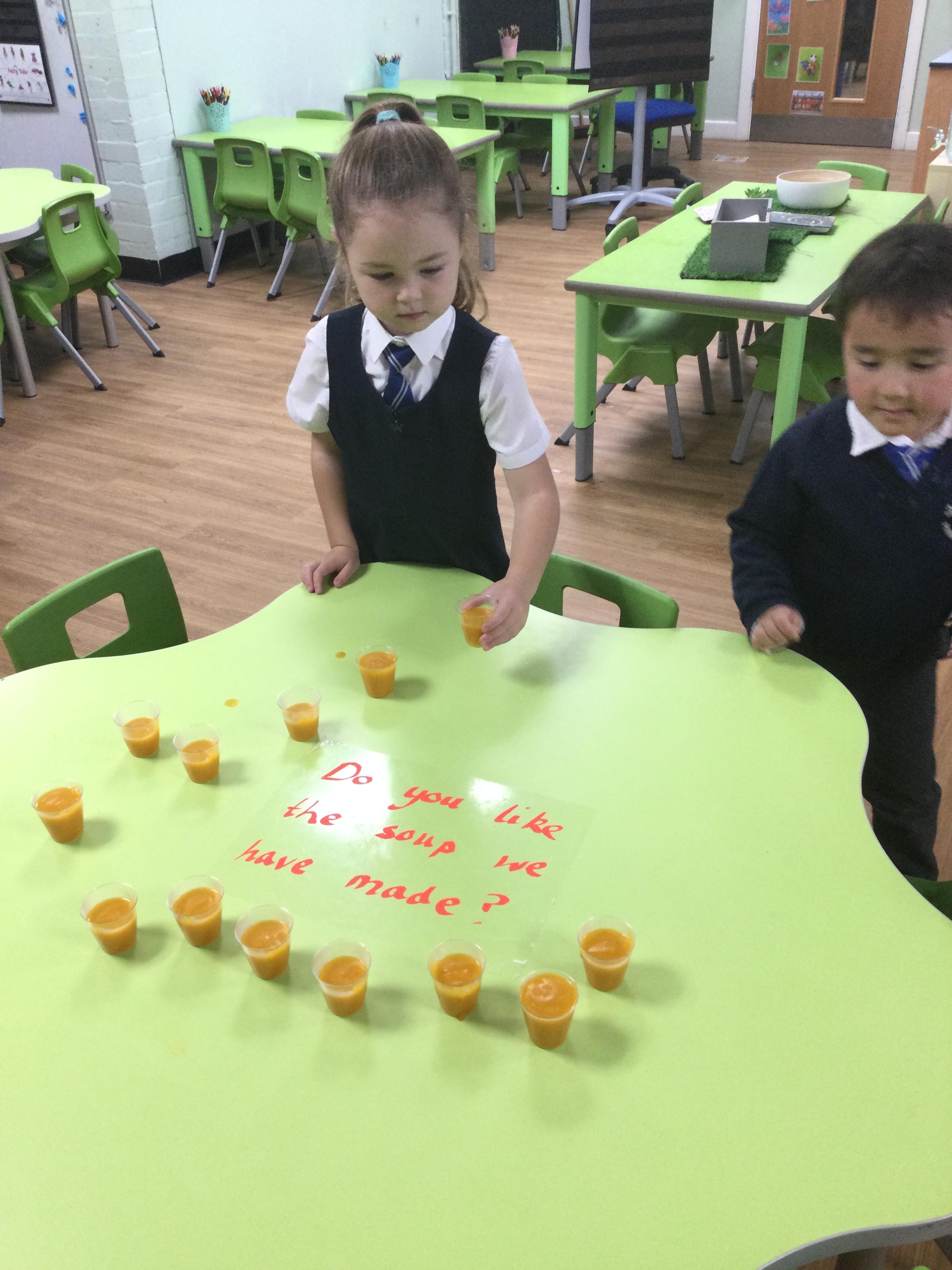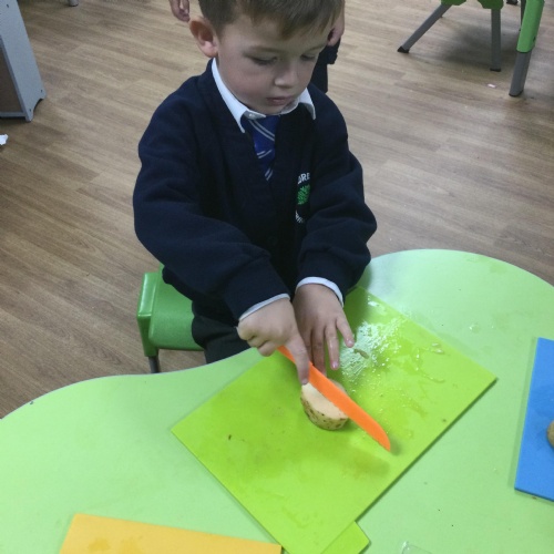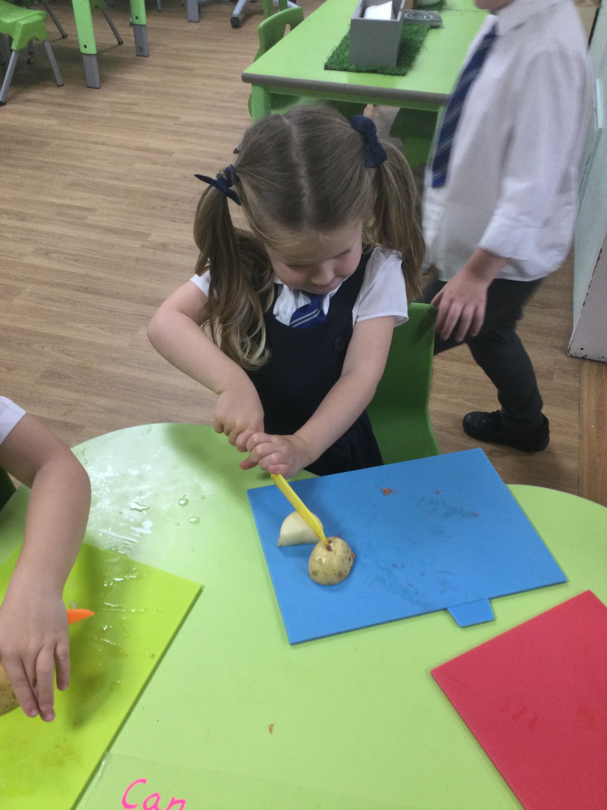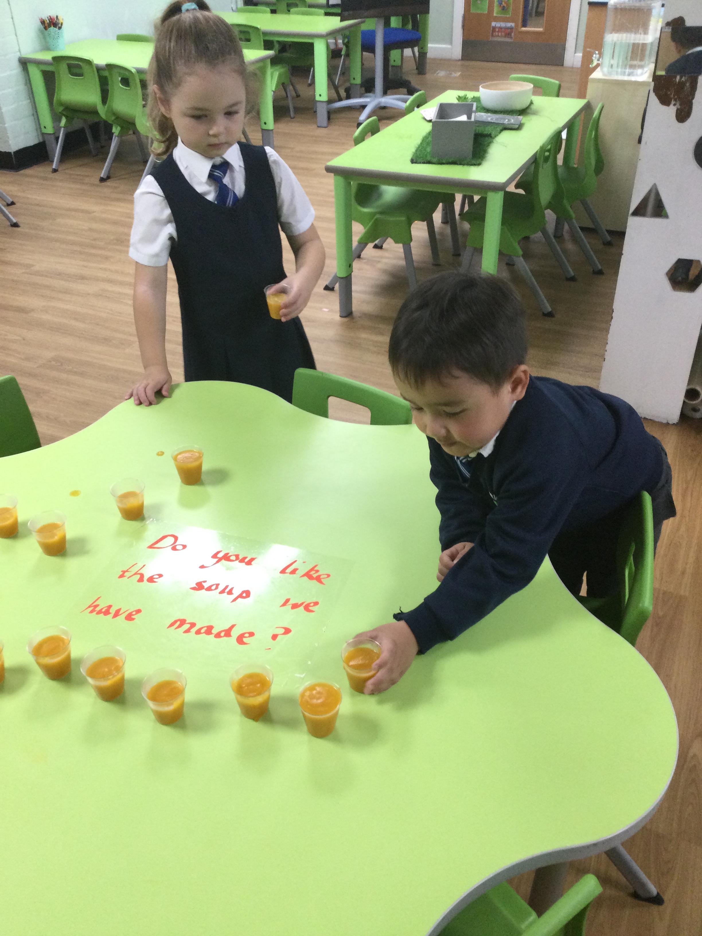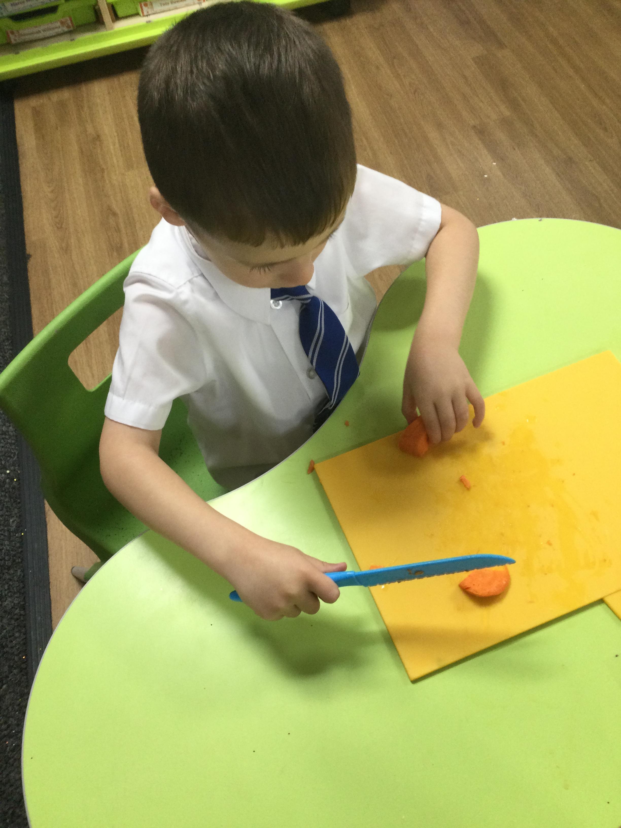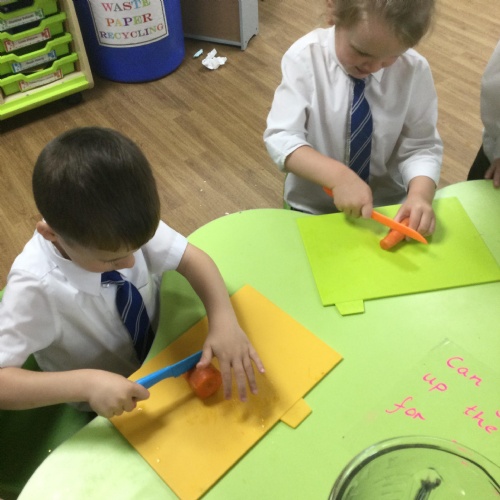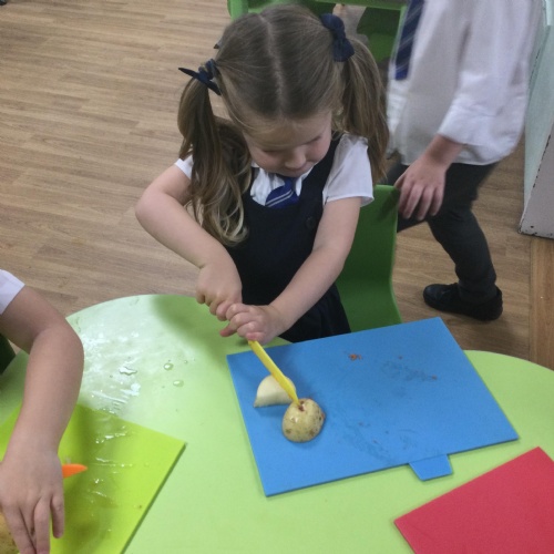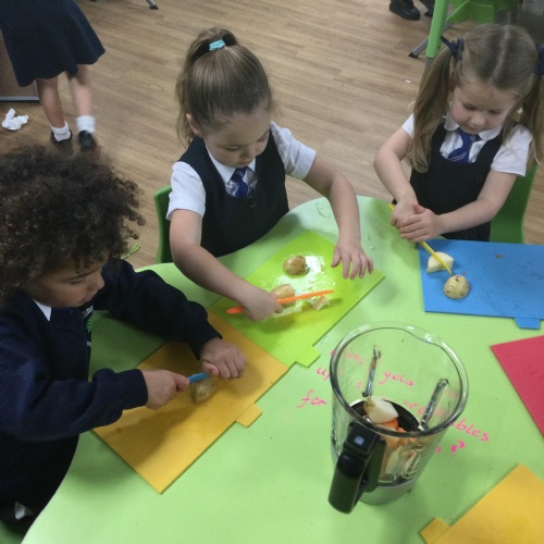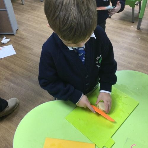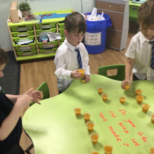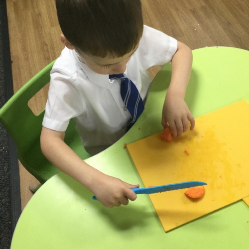Then we talked about how we could make vegetable soup and decided to make some. We knew it was important to wash our hands before we started and then we began cutting the vegetables, very carefully, and placing them in the soup maker. Miss Bailey then put the soup maker on in the staff room and waited for our soup to cool down before we tried it.