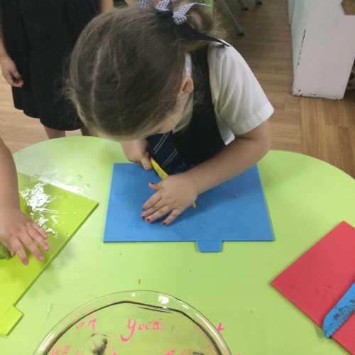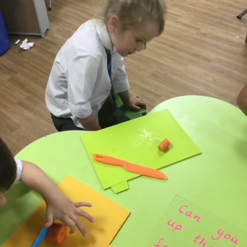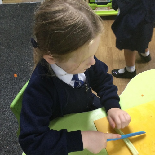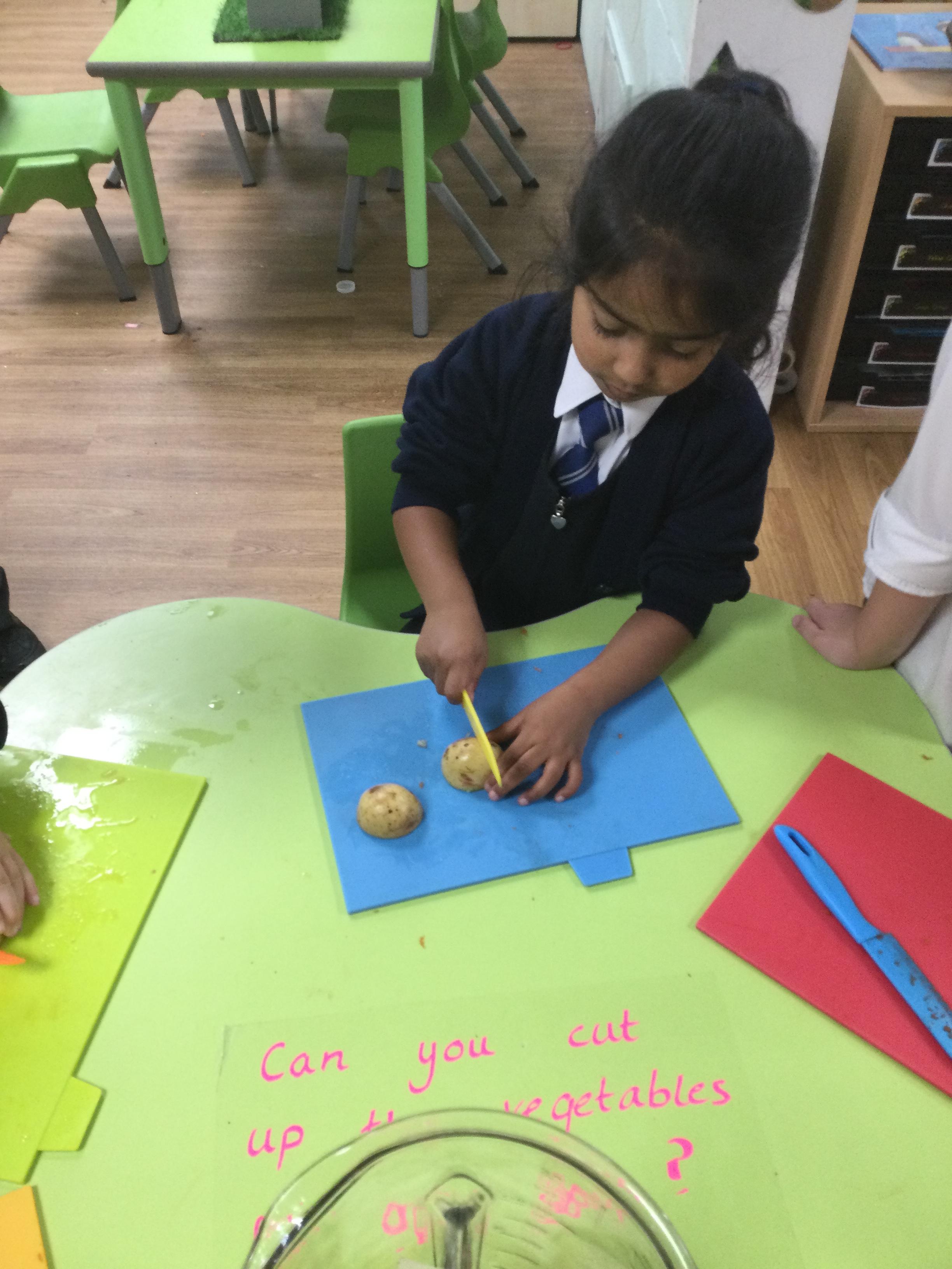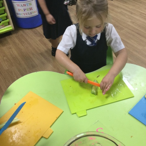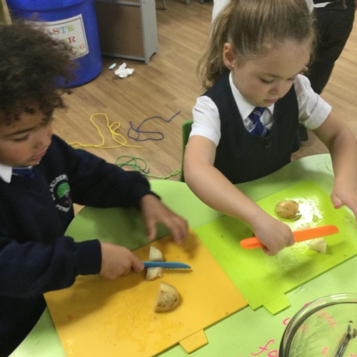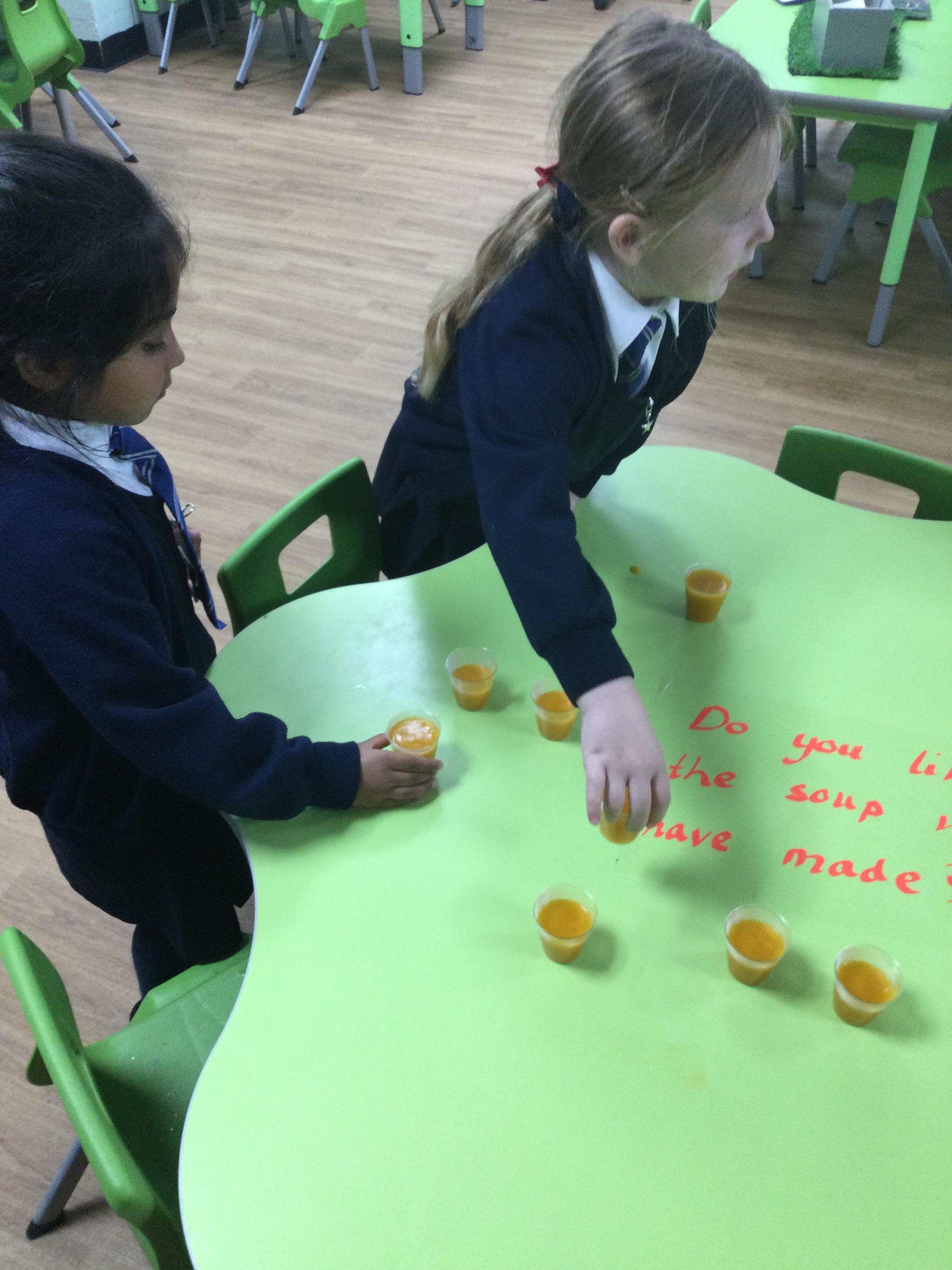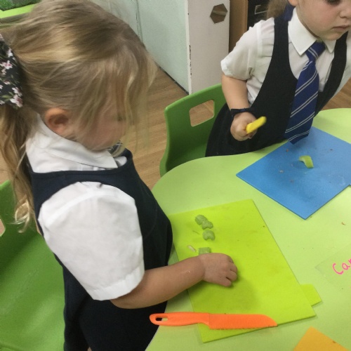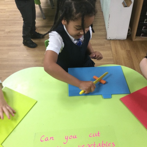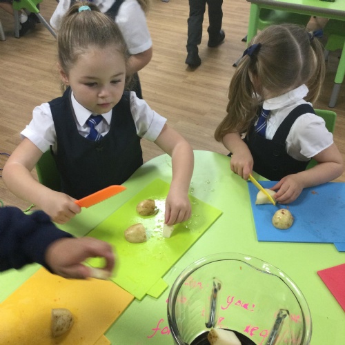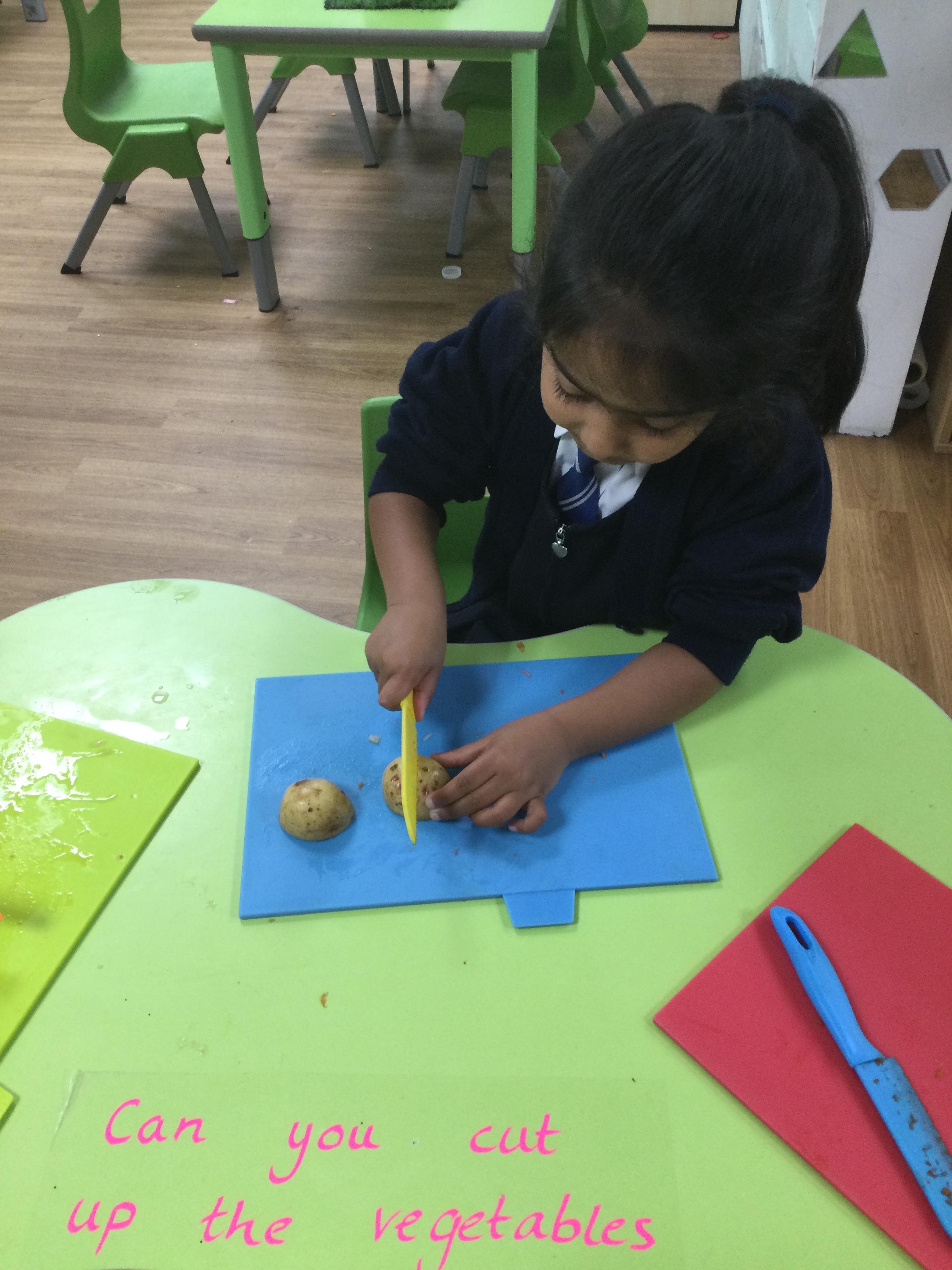 Then we talked about how we could make vegetable soup and decided to make some. We knew it was important to wash our hands before we started and then we began cutting the vegetables, very carefully, and placing them in the soup maker. Miss Bailey then put the soup maker on in the staff room and waited for our soup to cool down before we tried it.