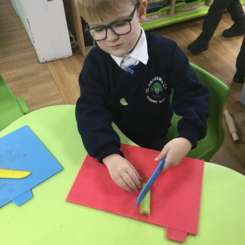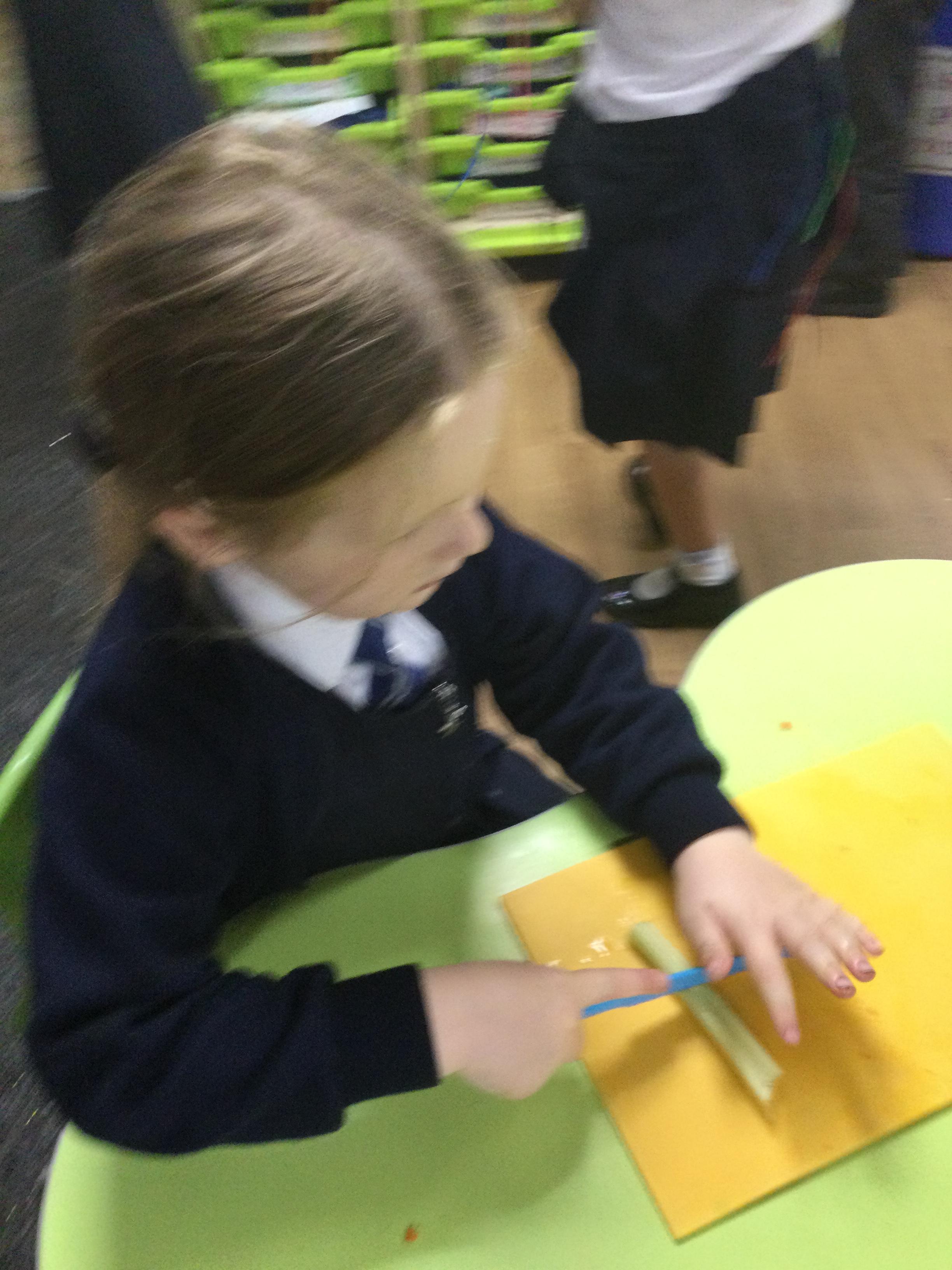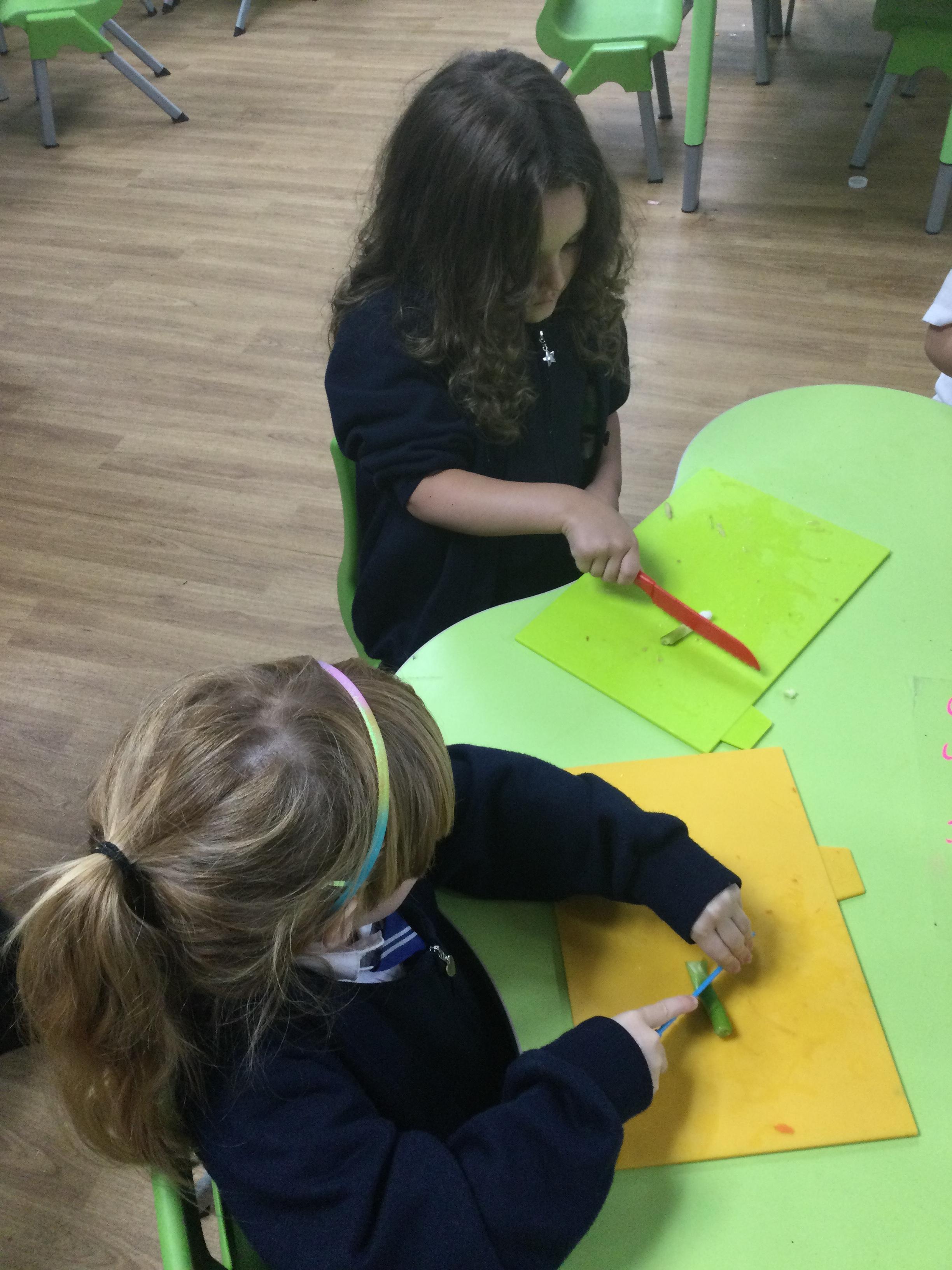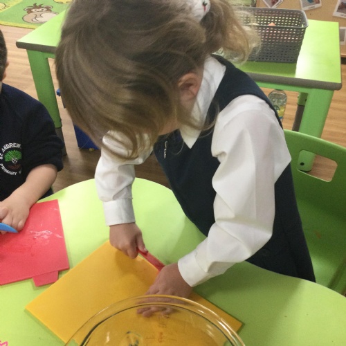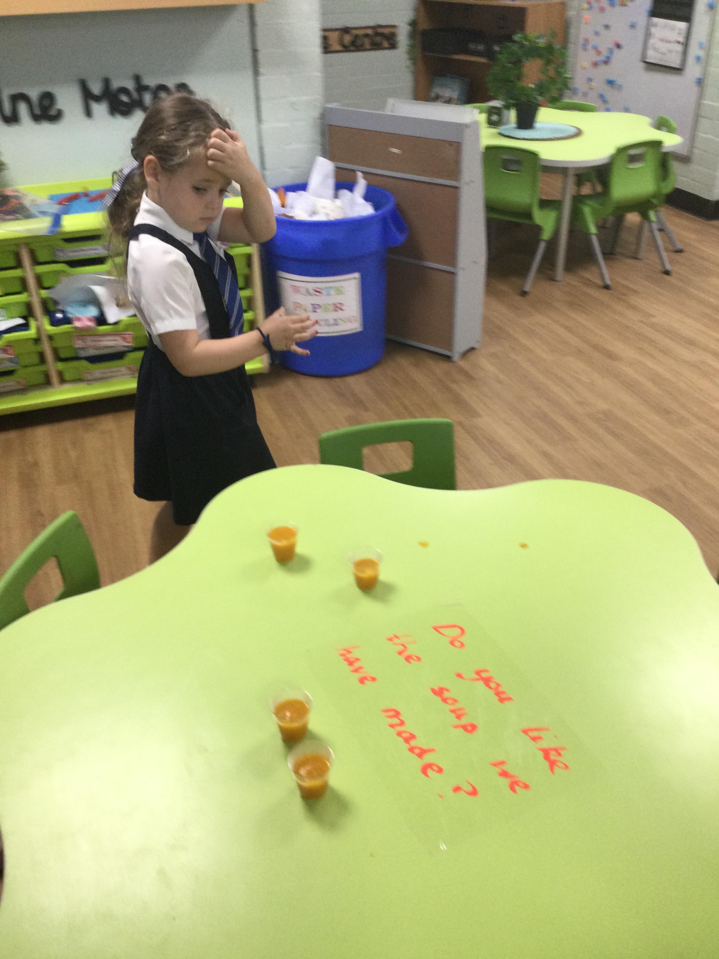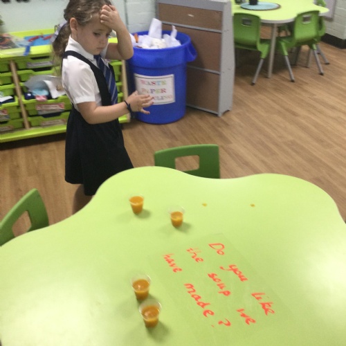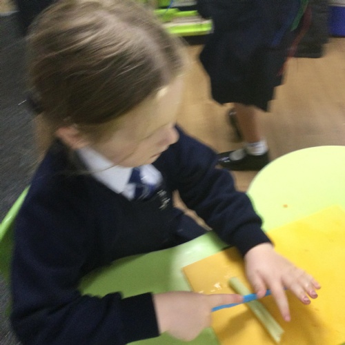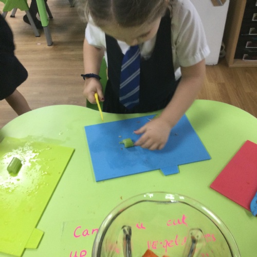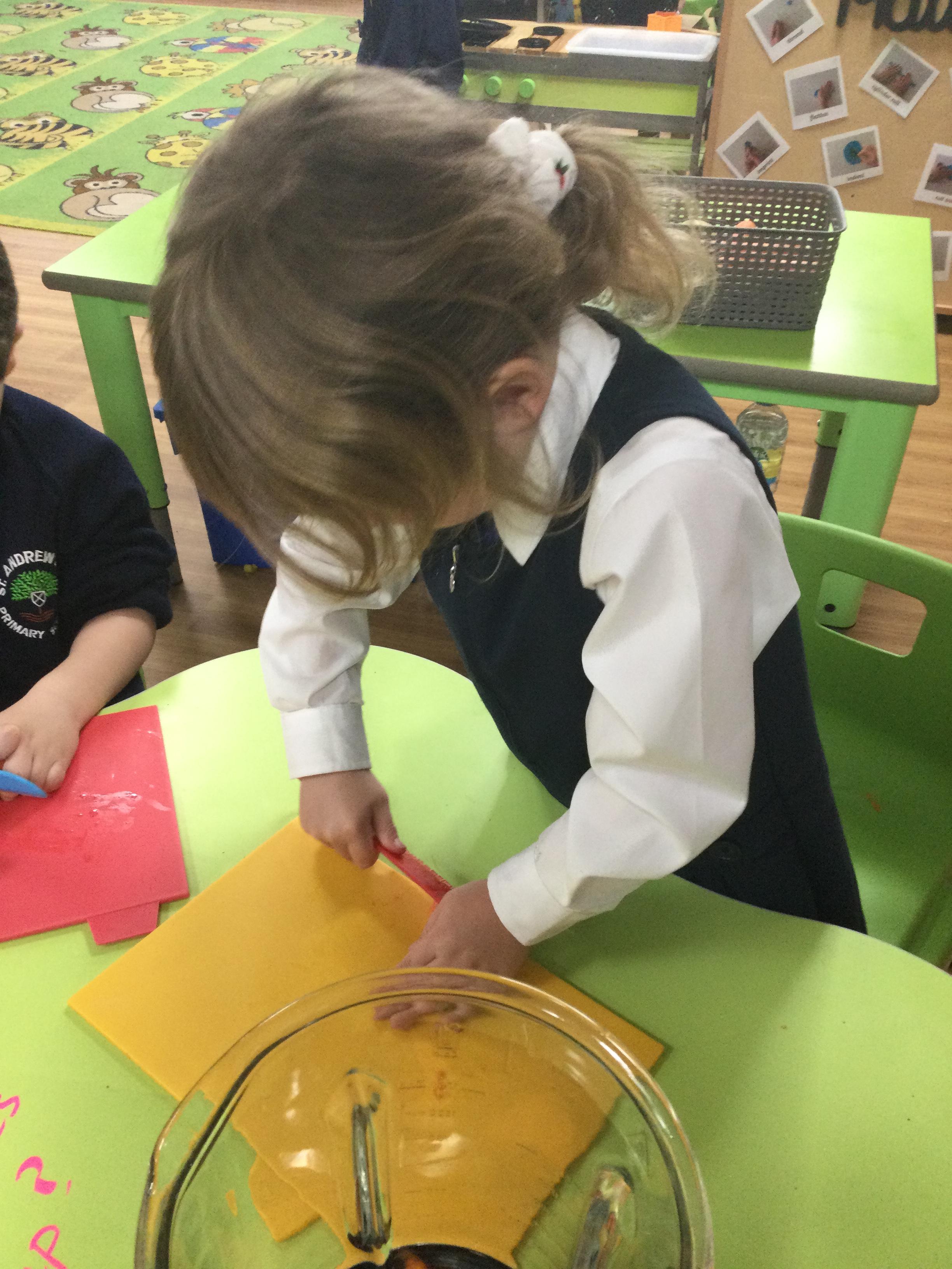 Then we talked about how we could make vegetable soup and decided to make some. We knew it was important to wash our hands before we started and then we began cutting the vegetables, very carefully, and placing them in the soup maker. Miss Bailey then put the soup maker on in the staff room and waited for our soup to cool down before we tried it.