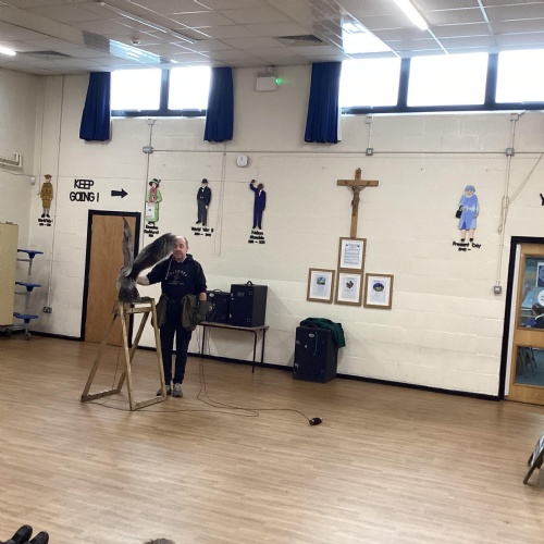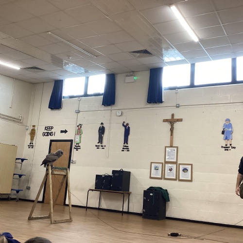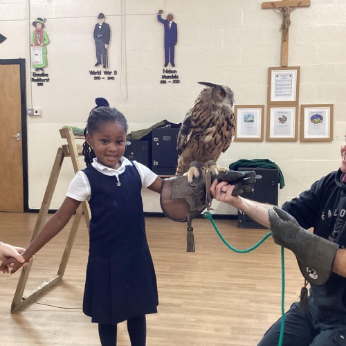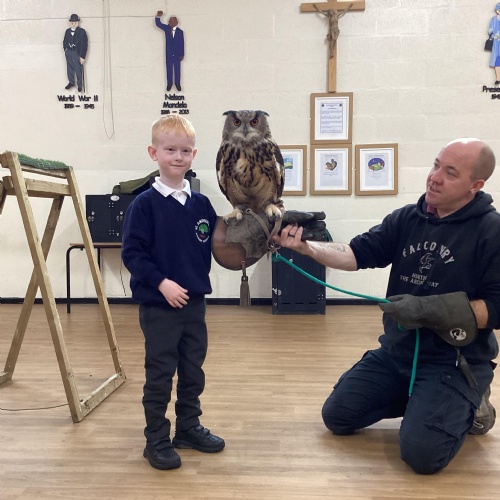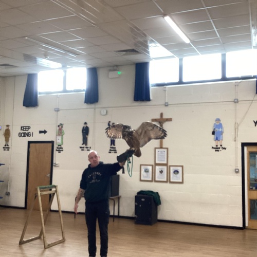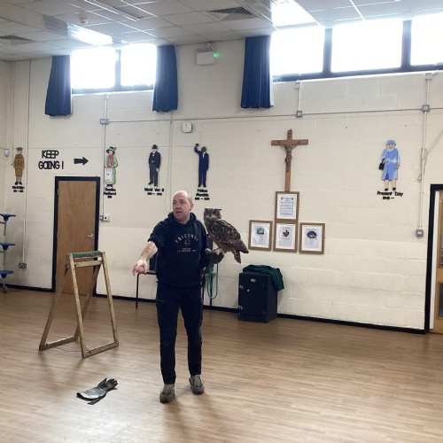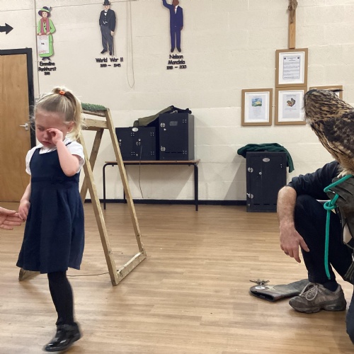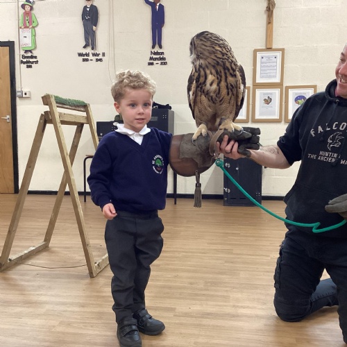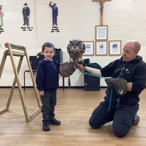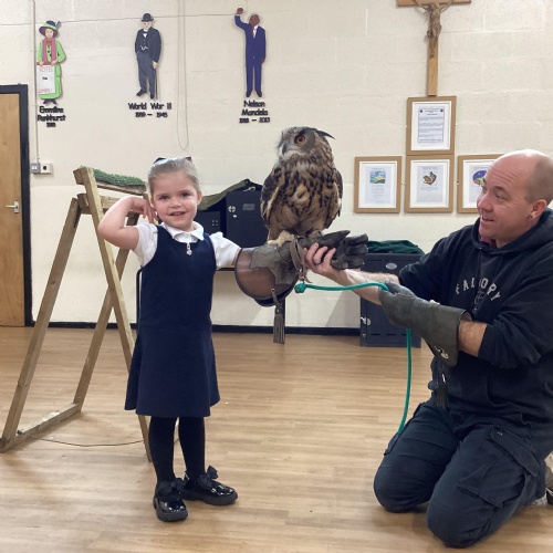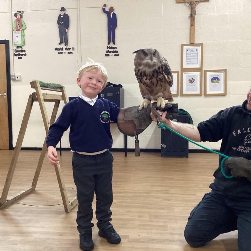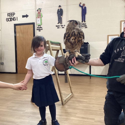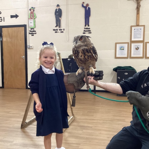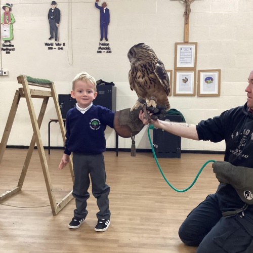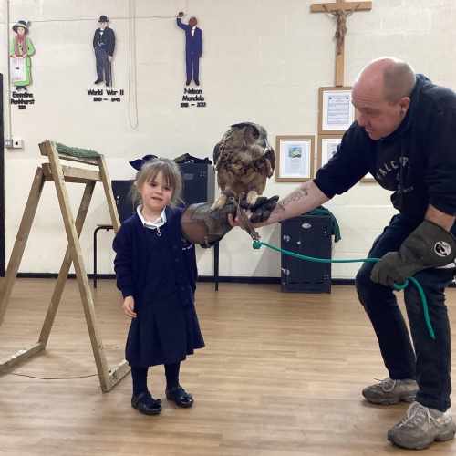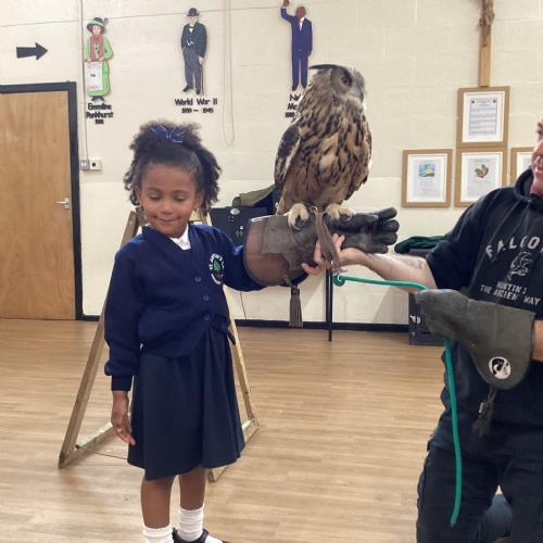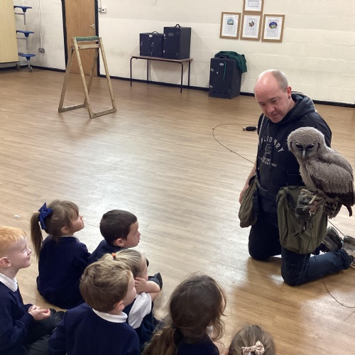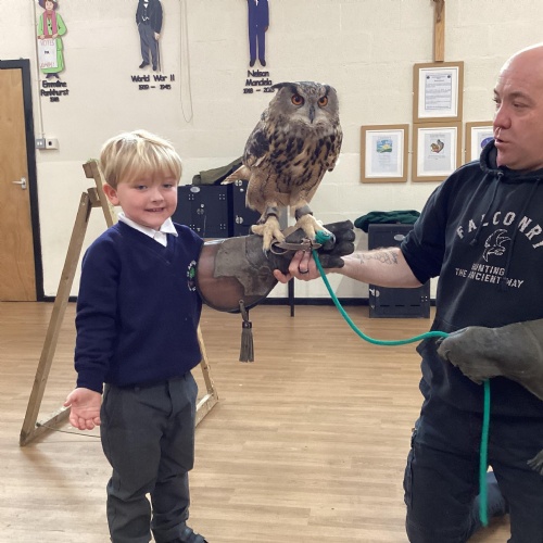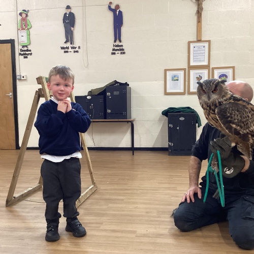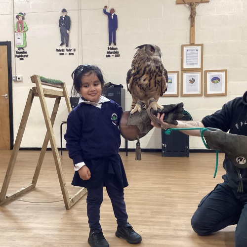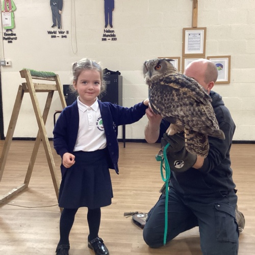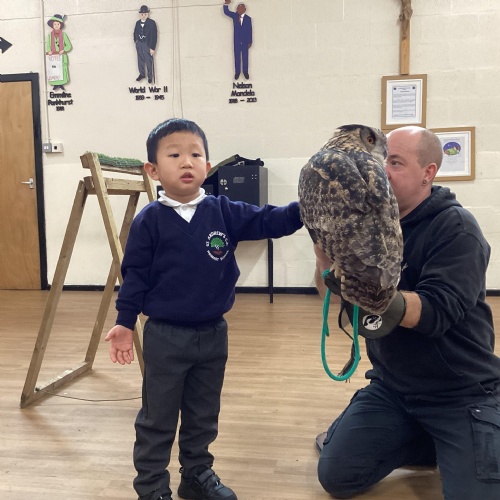 We then put our new knowledge learnt into action as we had a visit from the 'Cheshire Falconry Centre' where they showed us lots of different owls including: a Barn owl called Sam, an African owl called Nico and a baby owl called Podrick that was very cute! The owls had the chance to fly around the room and show us their huge wings. We were all very excited to see them fly!