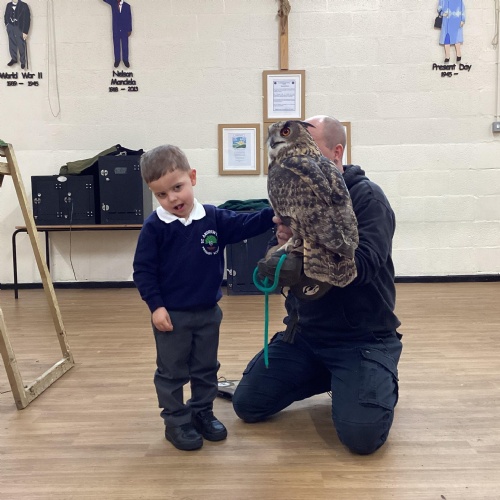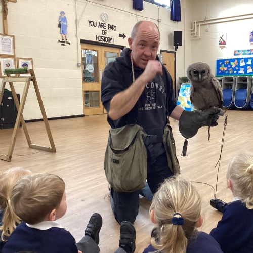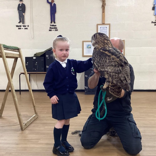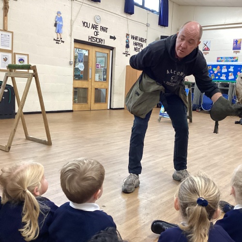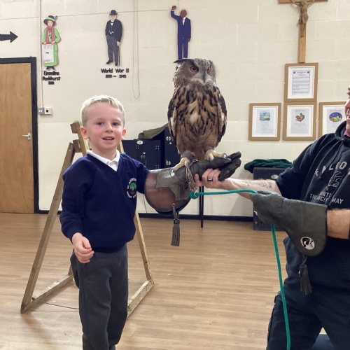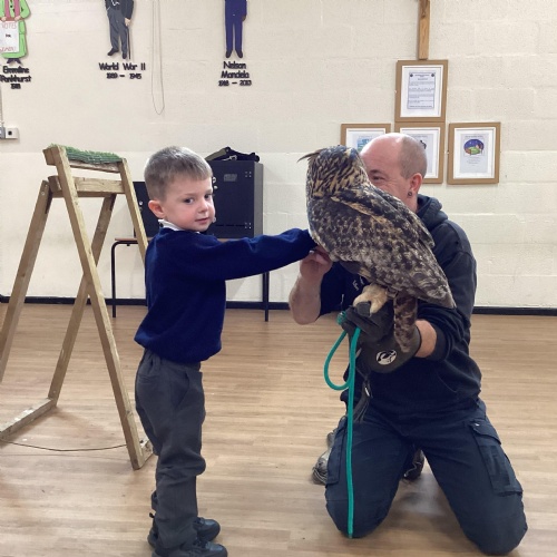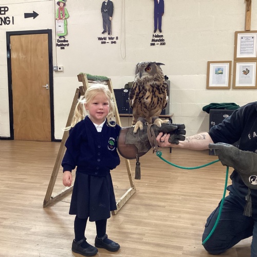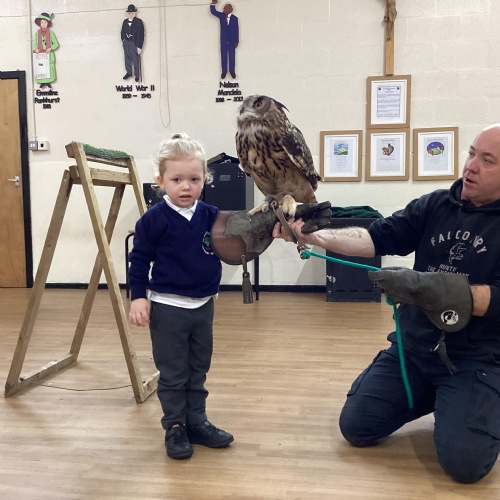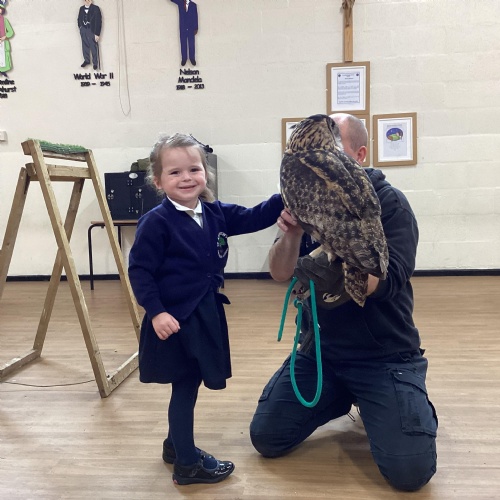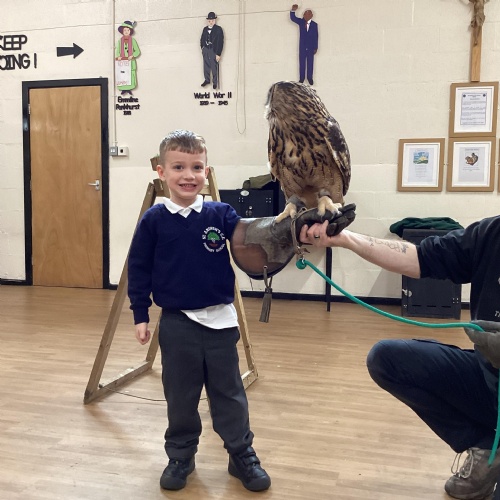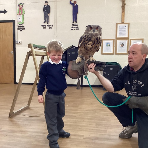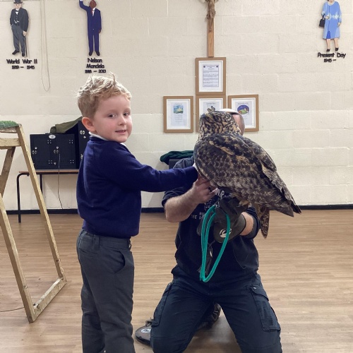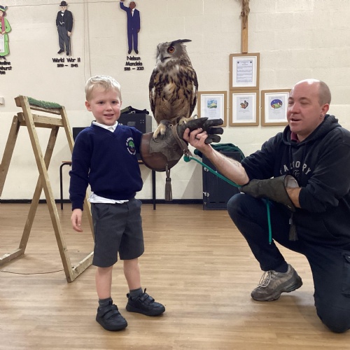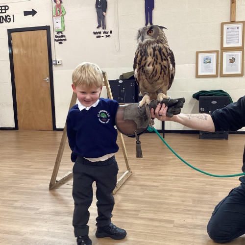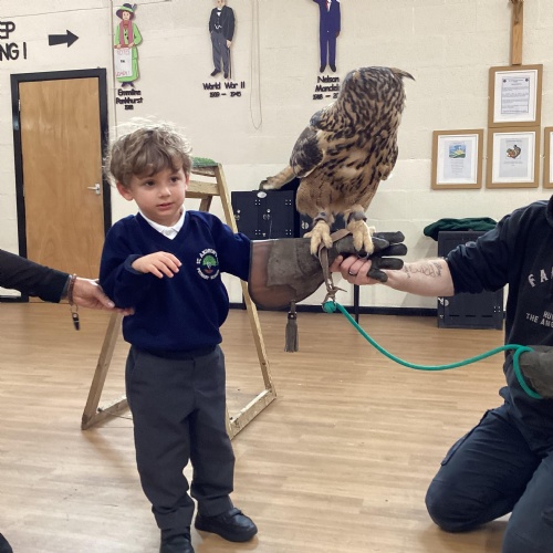 After reading Owl Babies this week, Simon visited us from Cheshire Falconry with four different owls; Podrick the little owl, Sam the barn owl, Nico the African owl and Walter. Simon taught us so many facts about what owls eat, about their ears and their different breeds and the sounds that they make. We loved watching them fly around the room. We could then stroke, or hold Walter who is a very big owl.