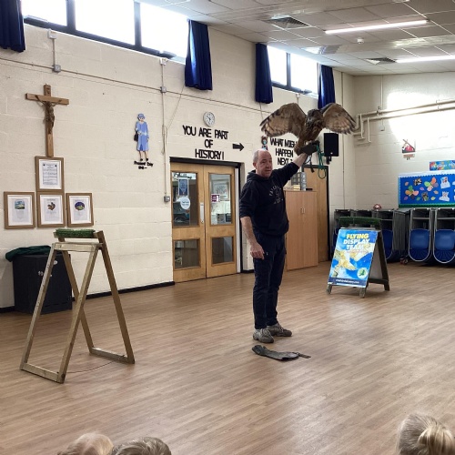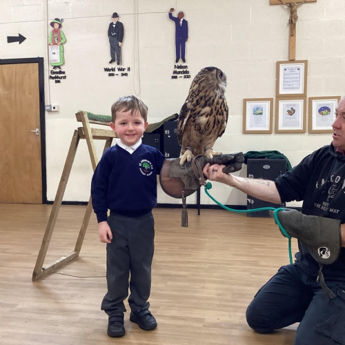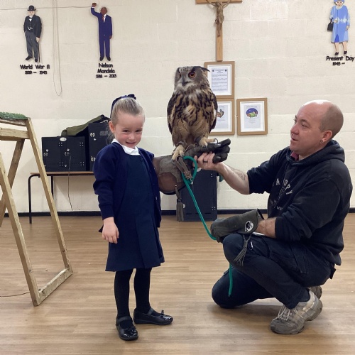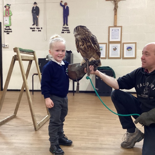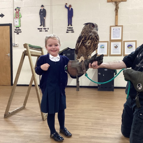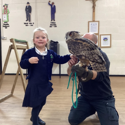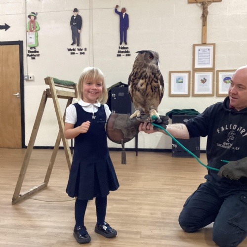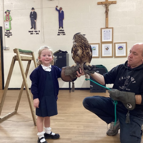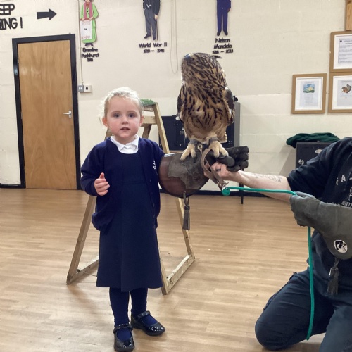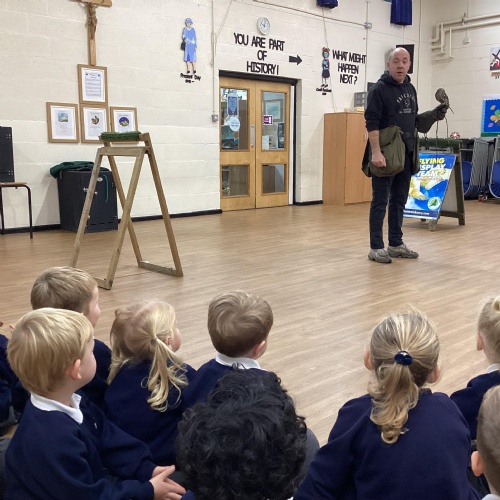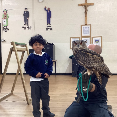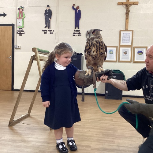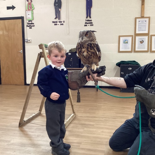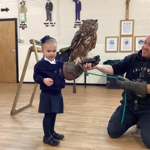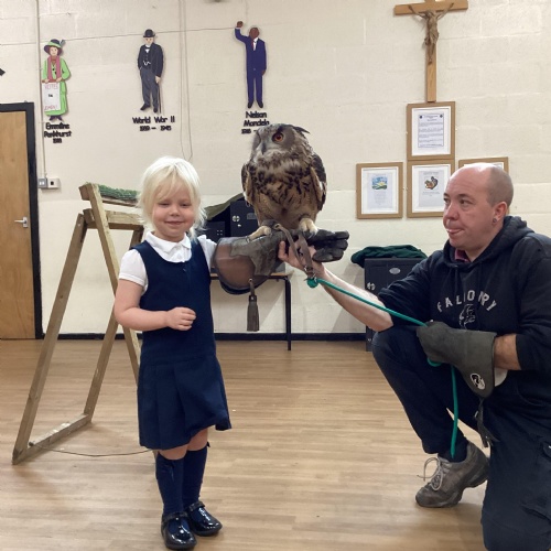 After reading Owl Babies this week, Simon visited us from Cheshire Falconry with four different owls; Podrick the little owl, Sam the barn owl, Nico the African owl and Walter. Simon taught us so many facts about what owls eat, about their ears and their different breeds and the sounds that they make. We loved watching them fly around the room. We could then stroke, or hold Walter who is a very big owl.