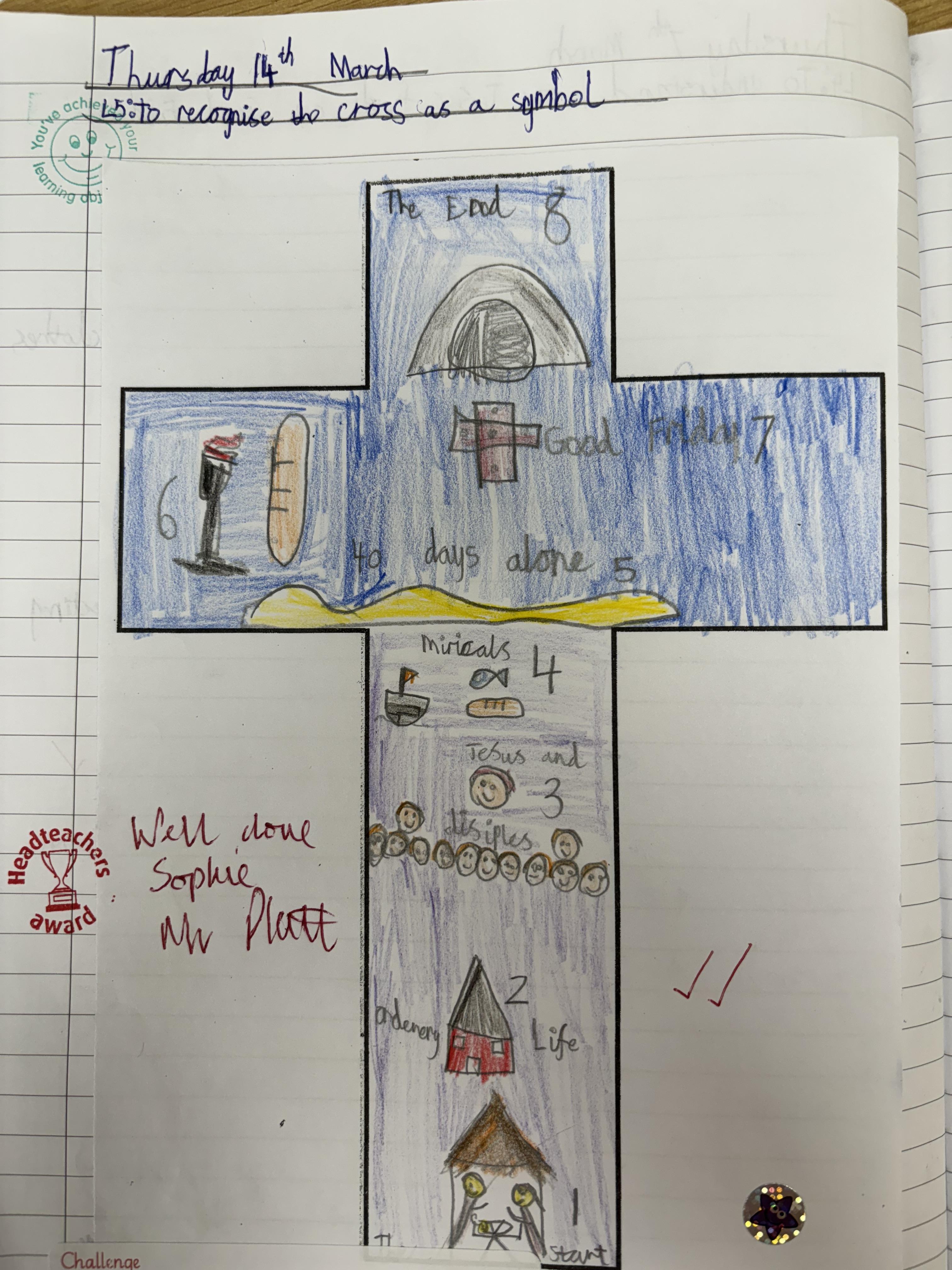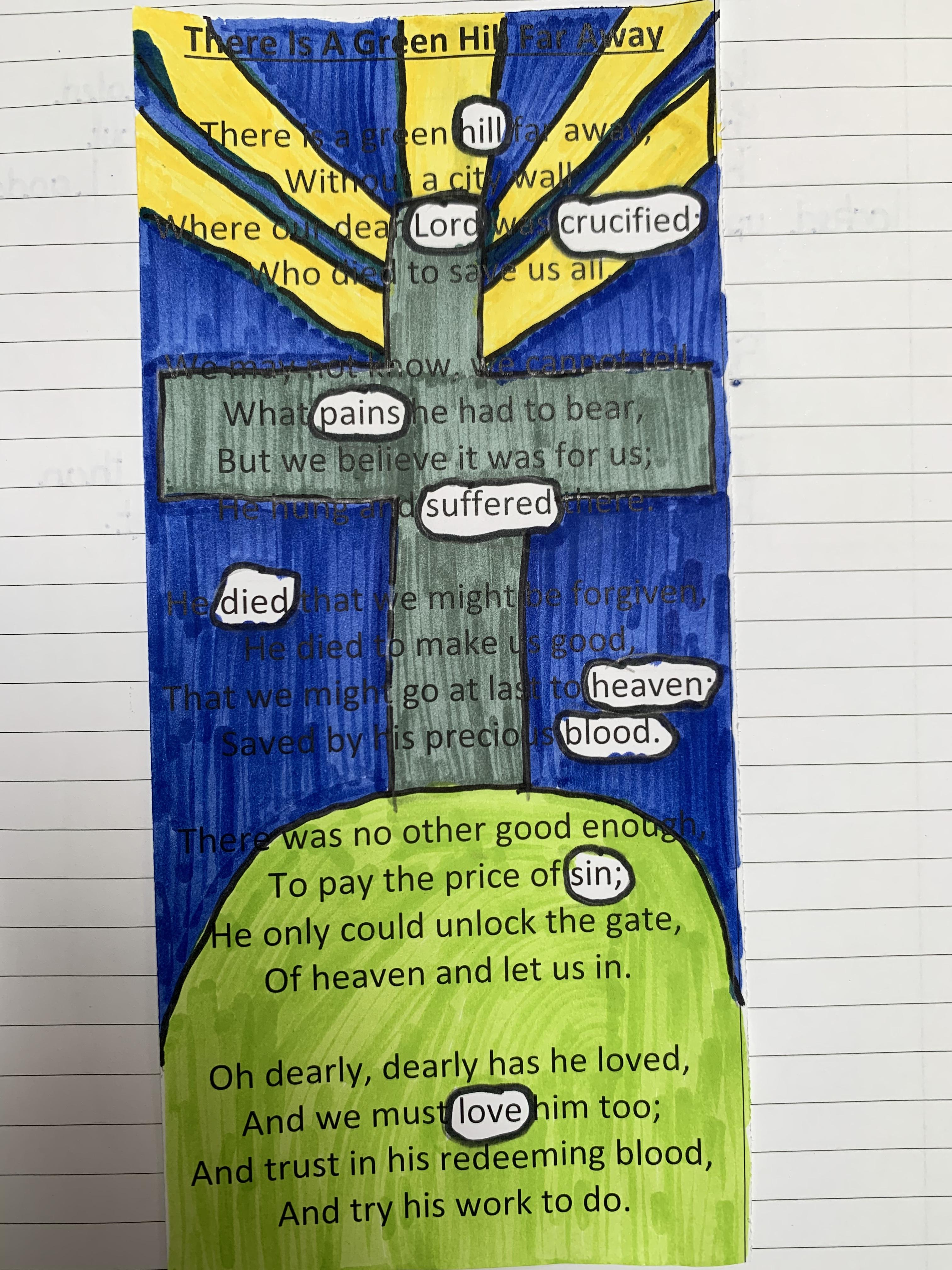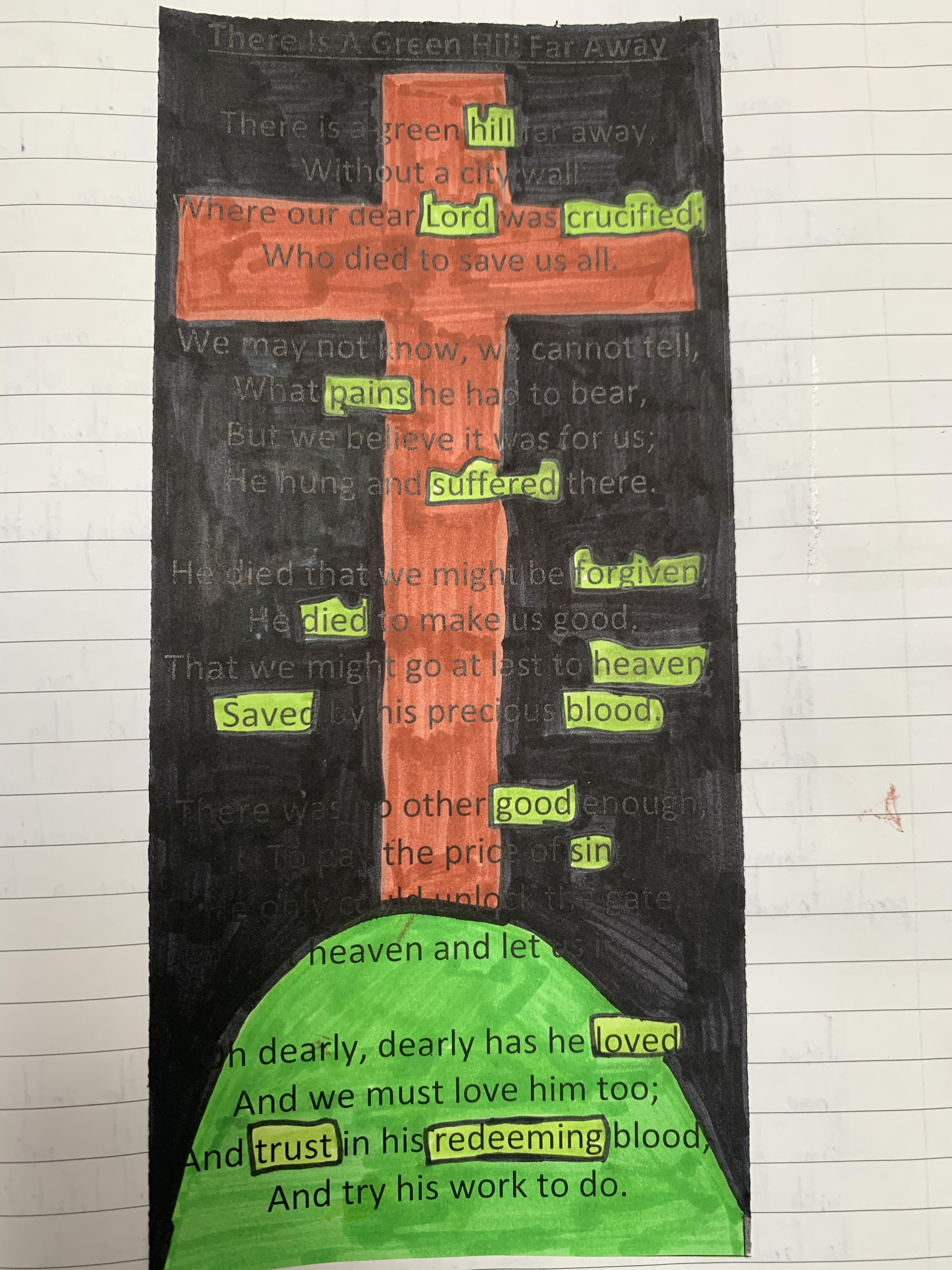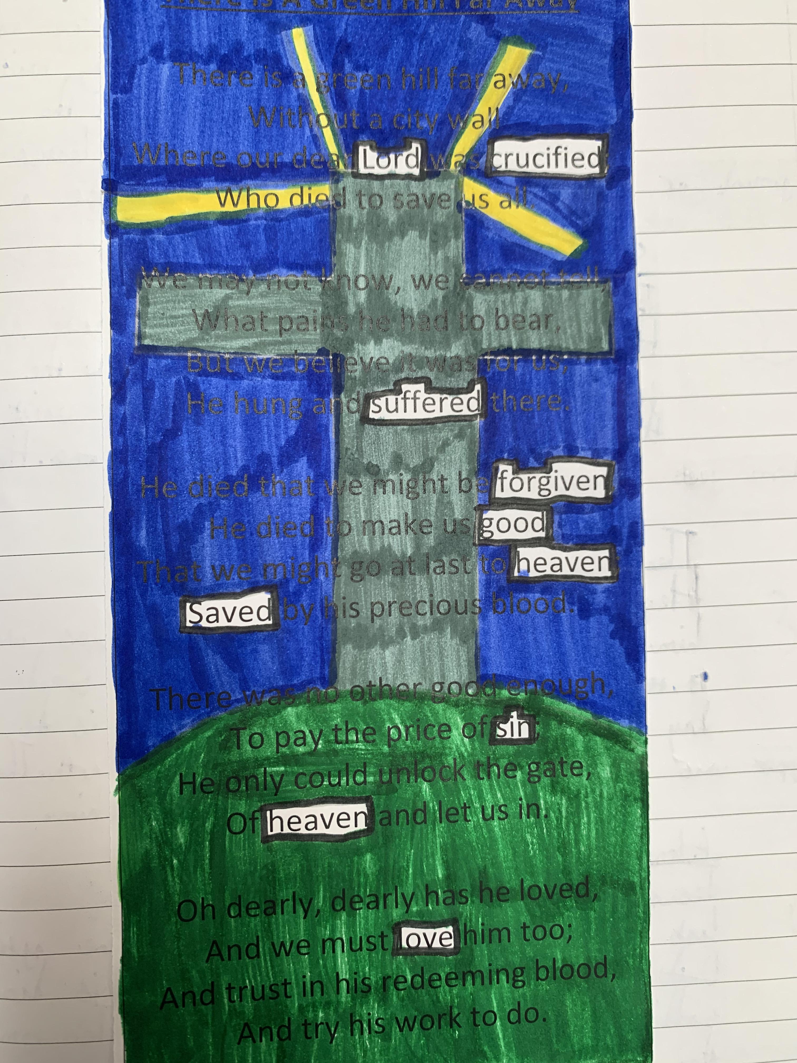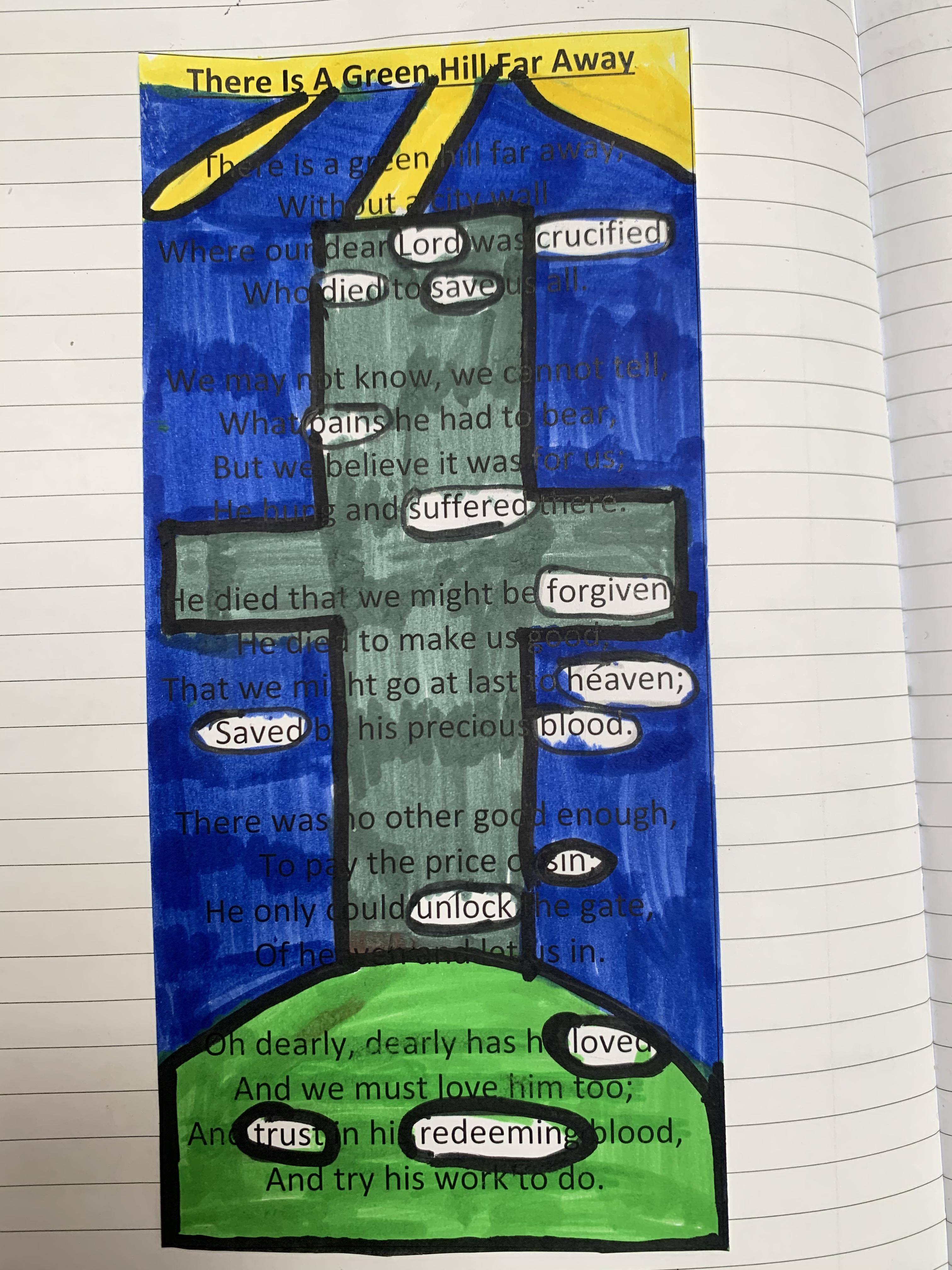 We have been thinking about the meaning of Easter and used the words from the hymn 'There is a Green Hill Far Away' to show what Easter is about.