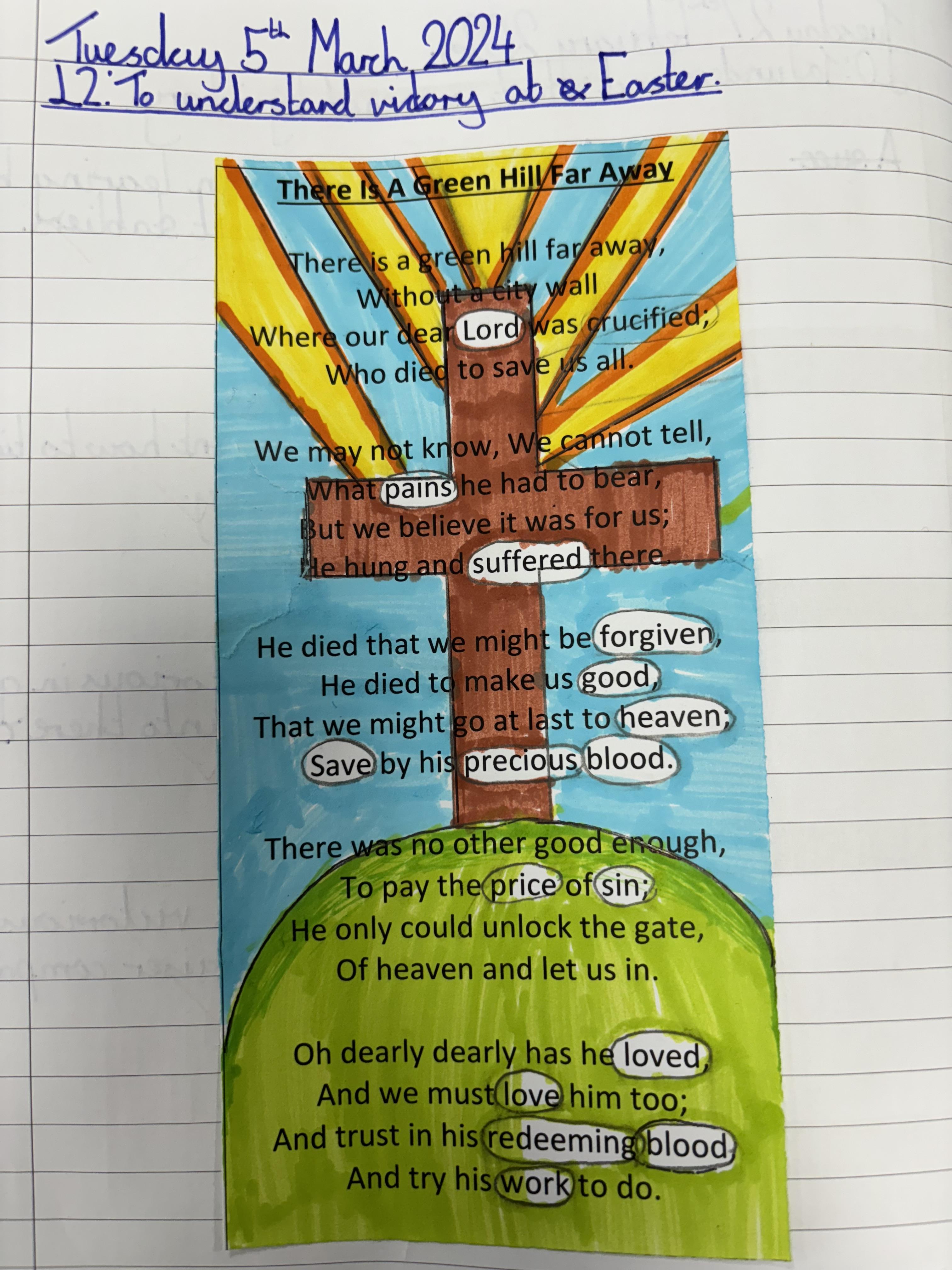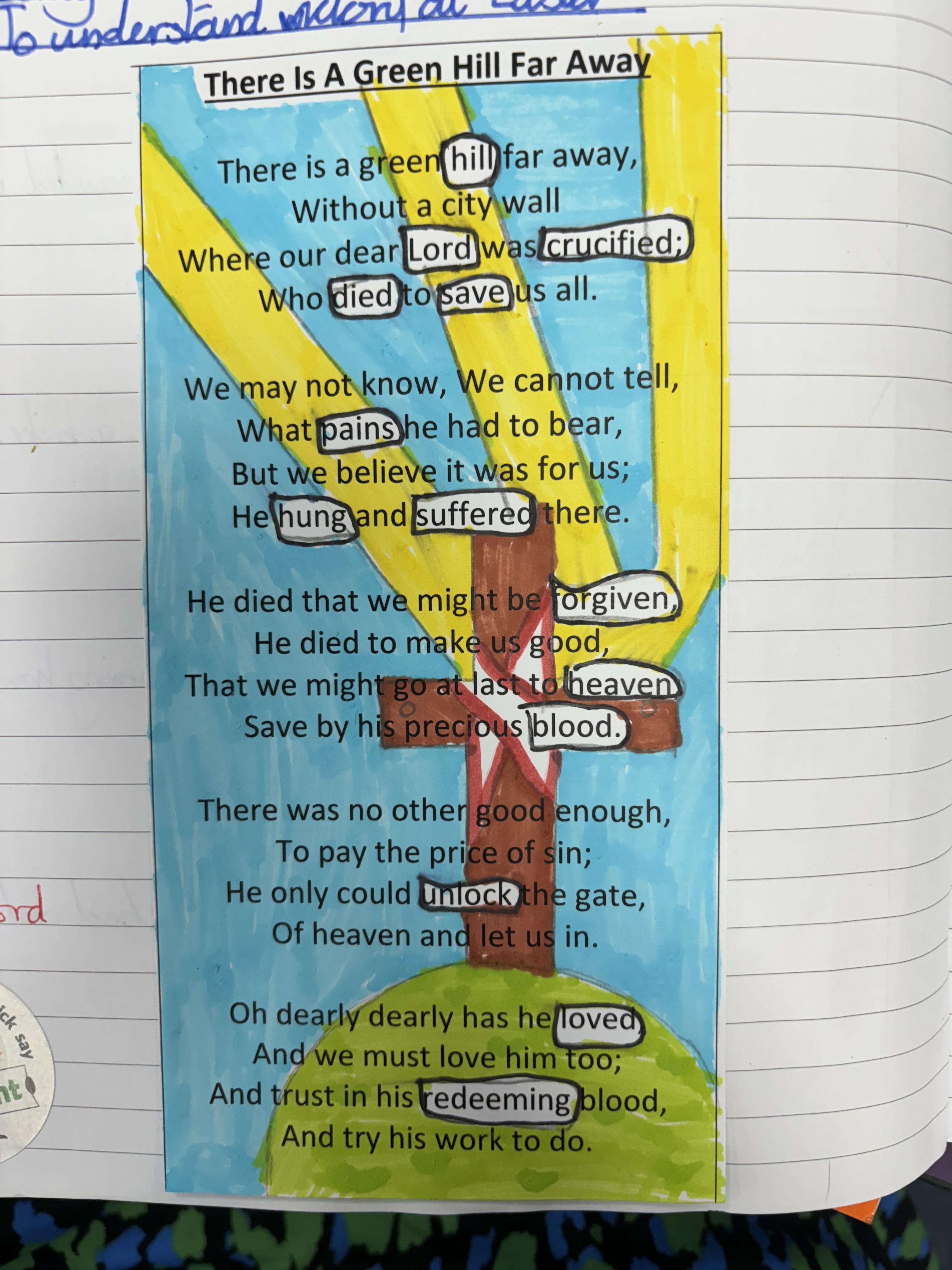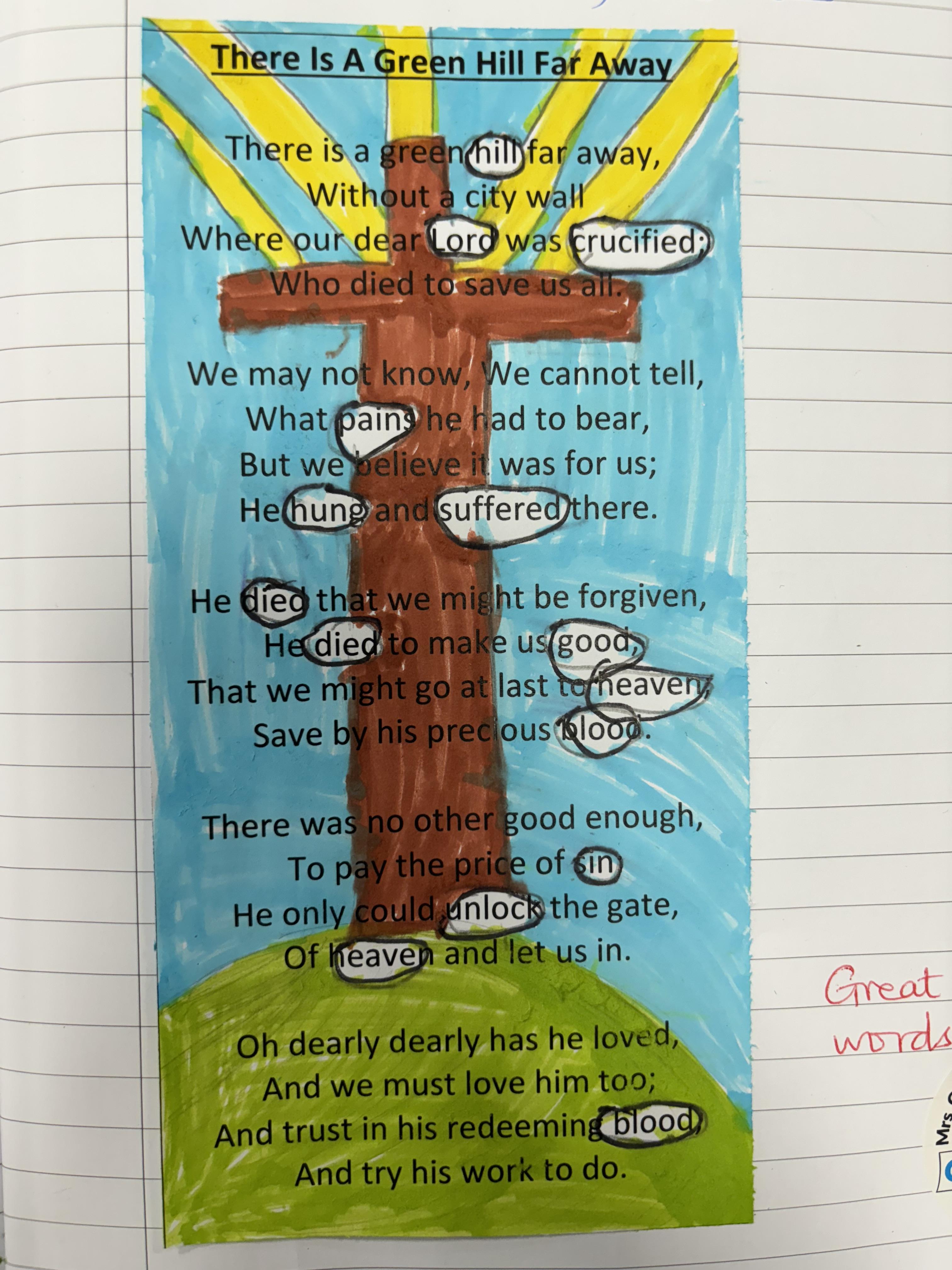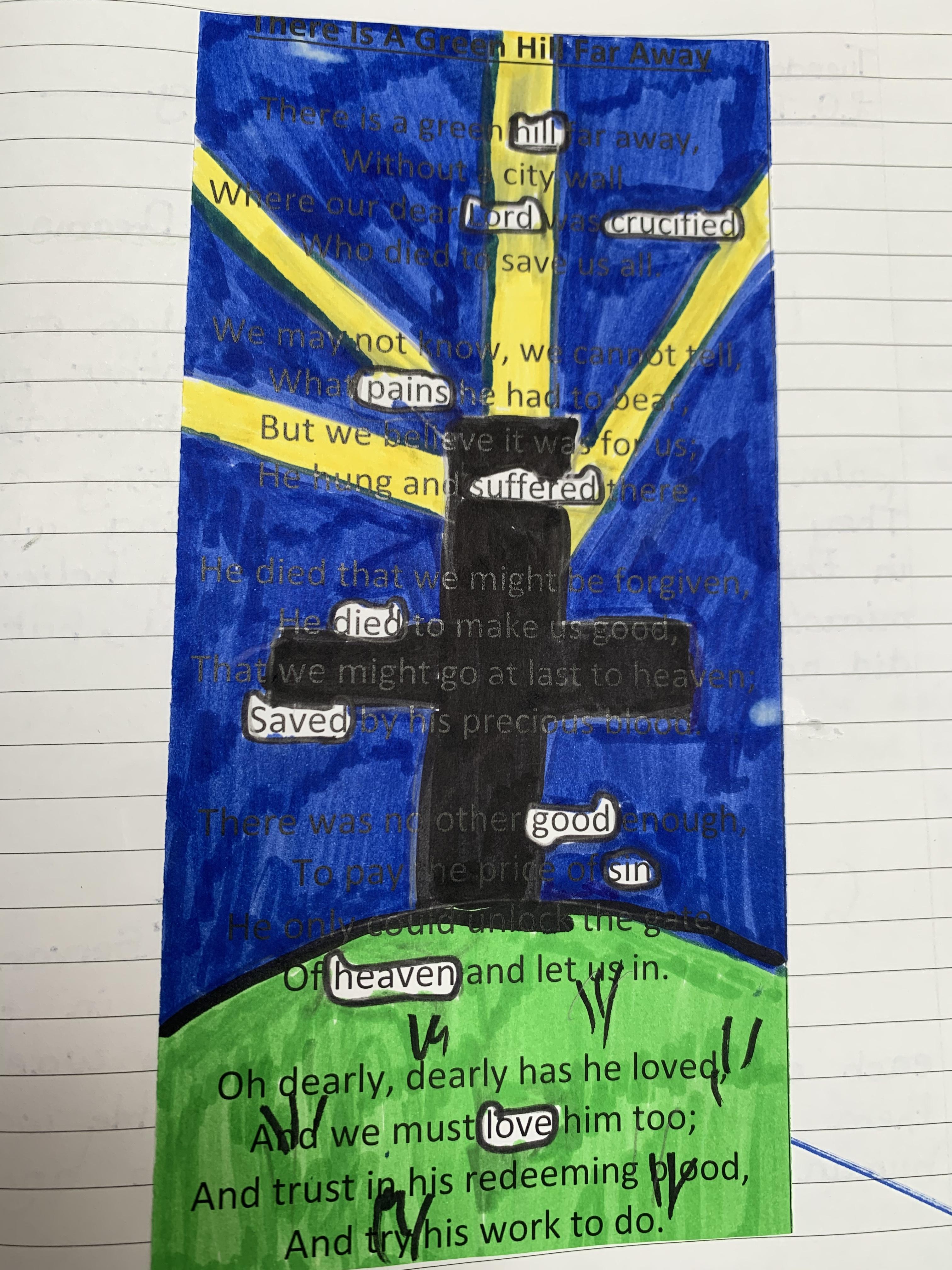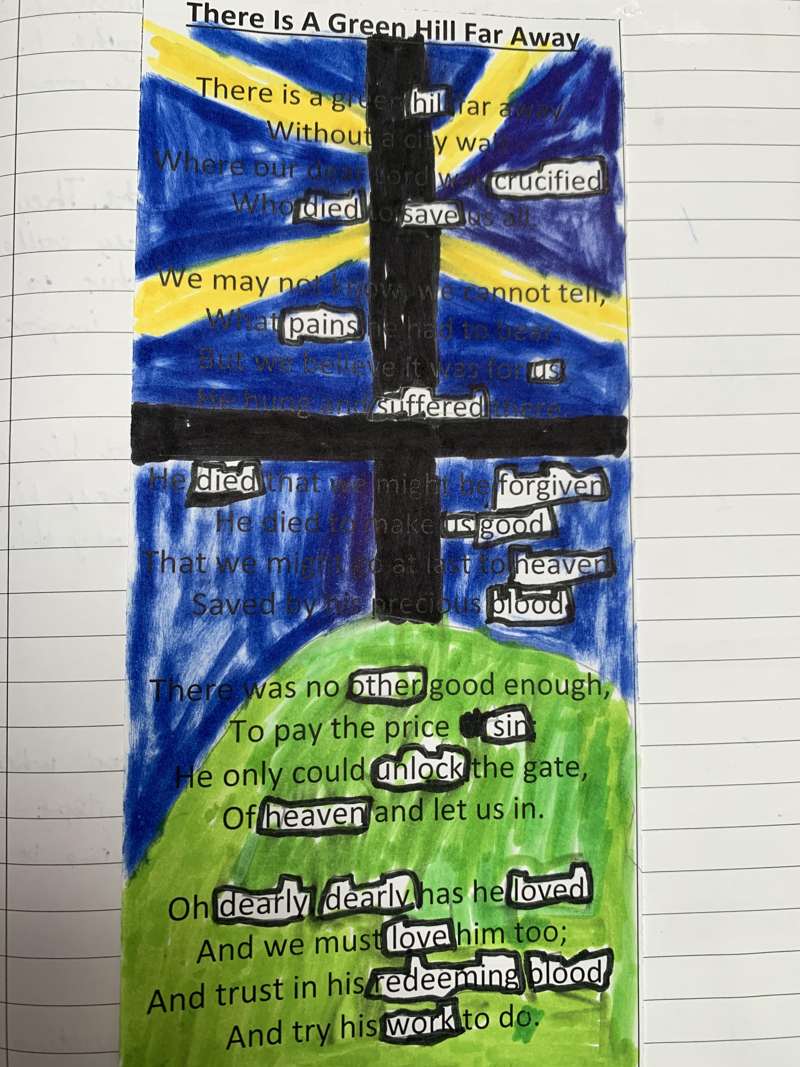 We looked at the traditional Easter hymn ‘There is a Green Hill Far Away’. The children then decided which words they thought showed the true meaning of the Easter story and the victory that Jesus had. They left those words in white and blacked out the rest. Have a look at their work, we think it’s fantastic.