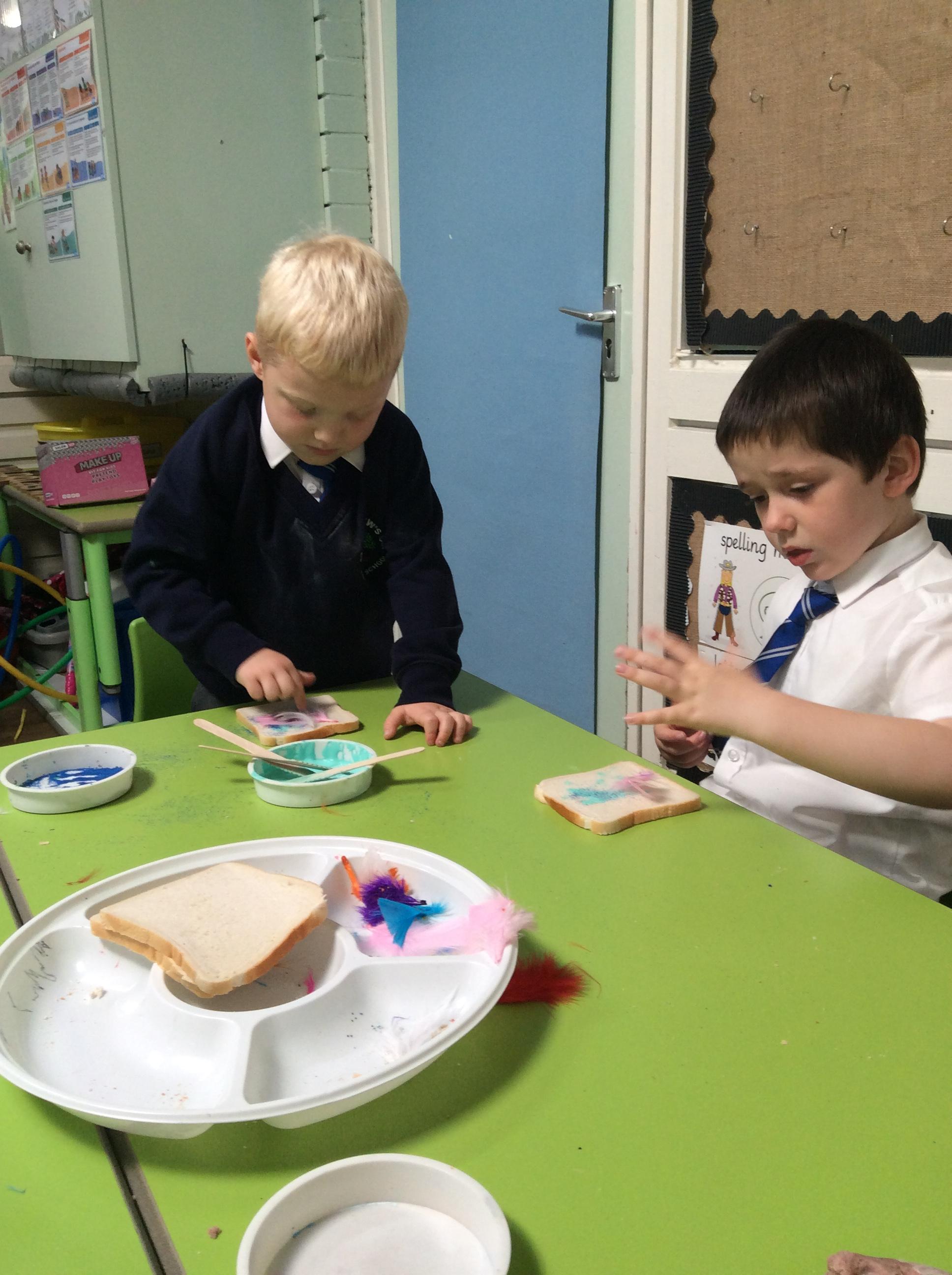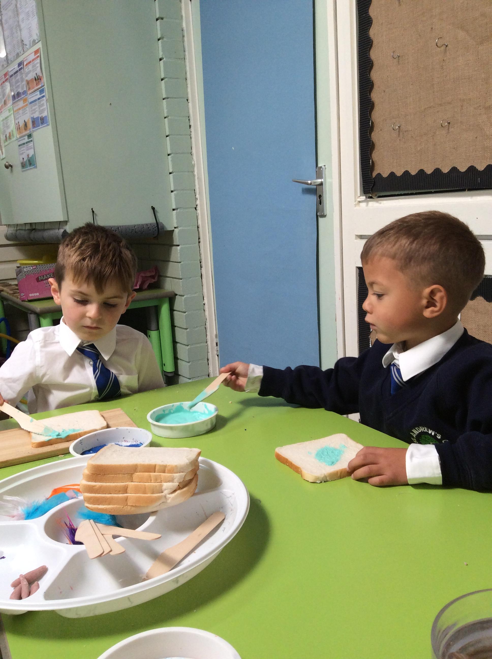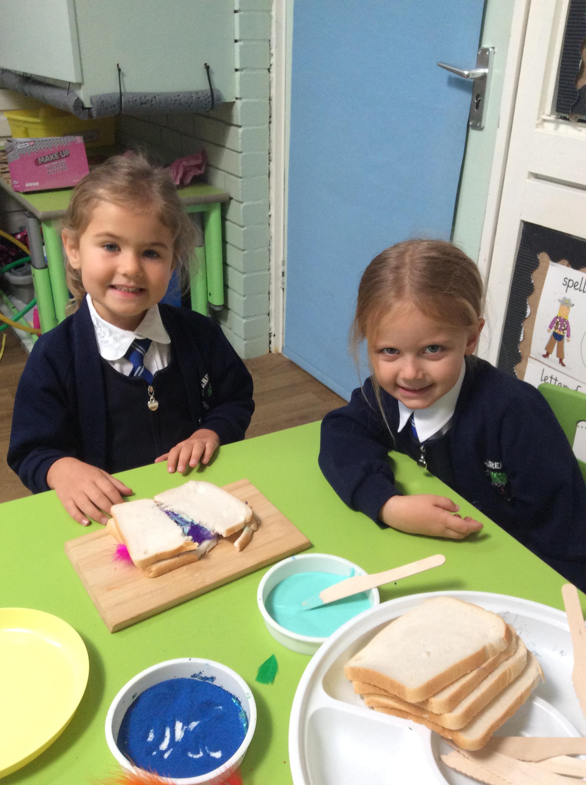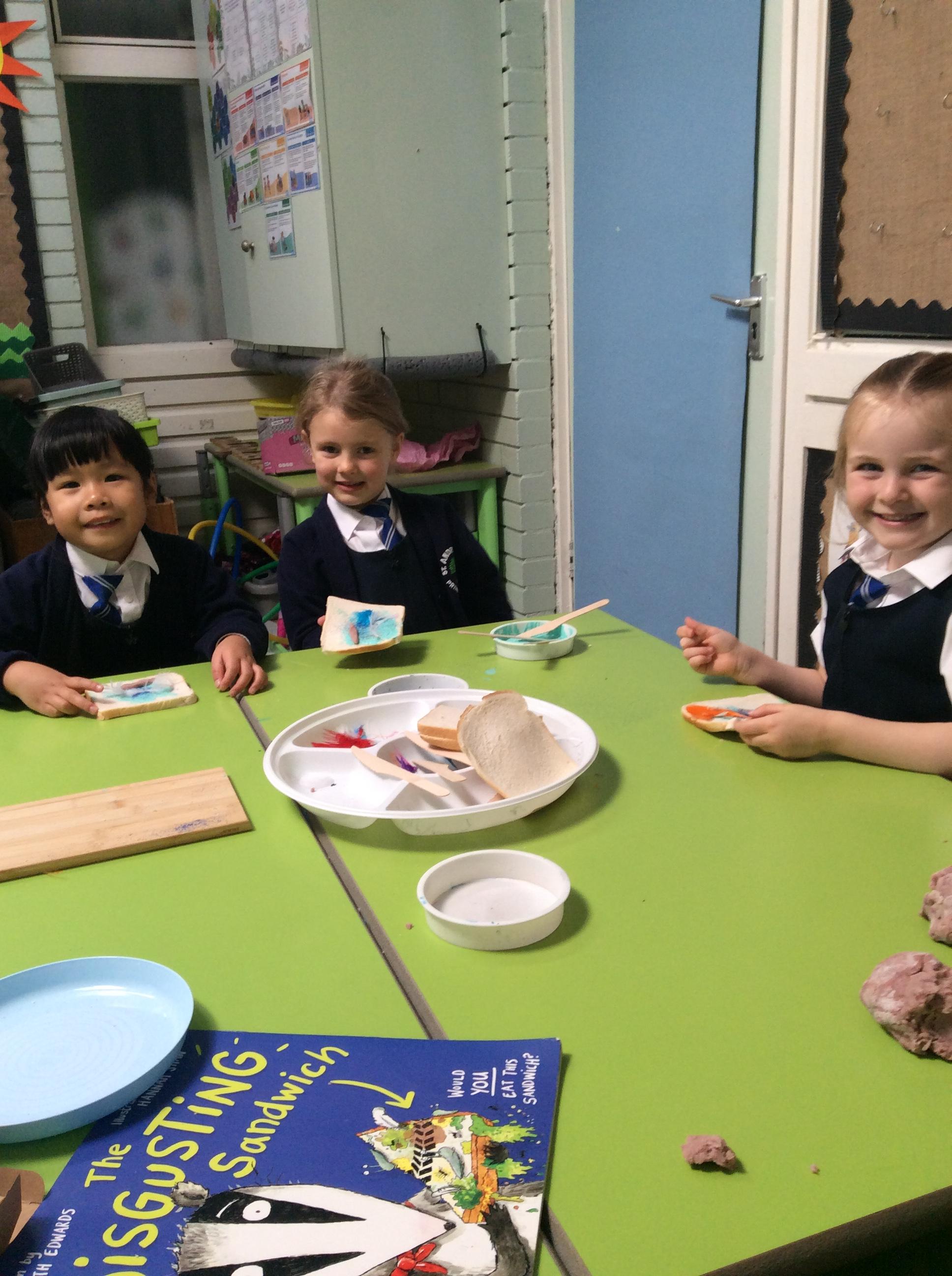 RS have loved making disgusting sandwiches this week! They had mouldy mayonnaise, sand, pigeon feathers and slimy slugs on! Disgusting!